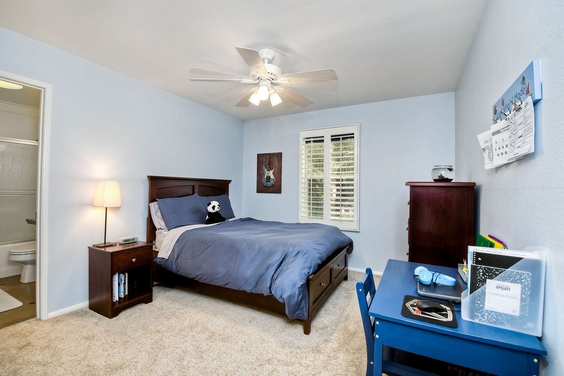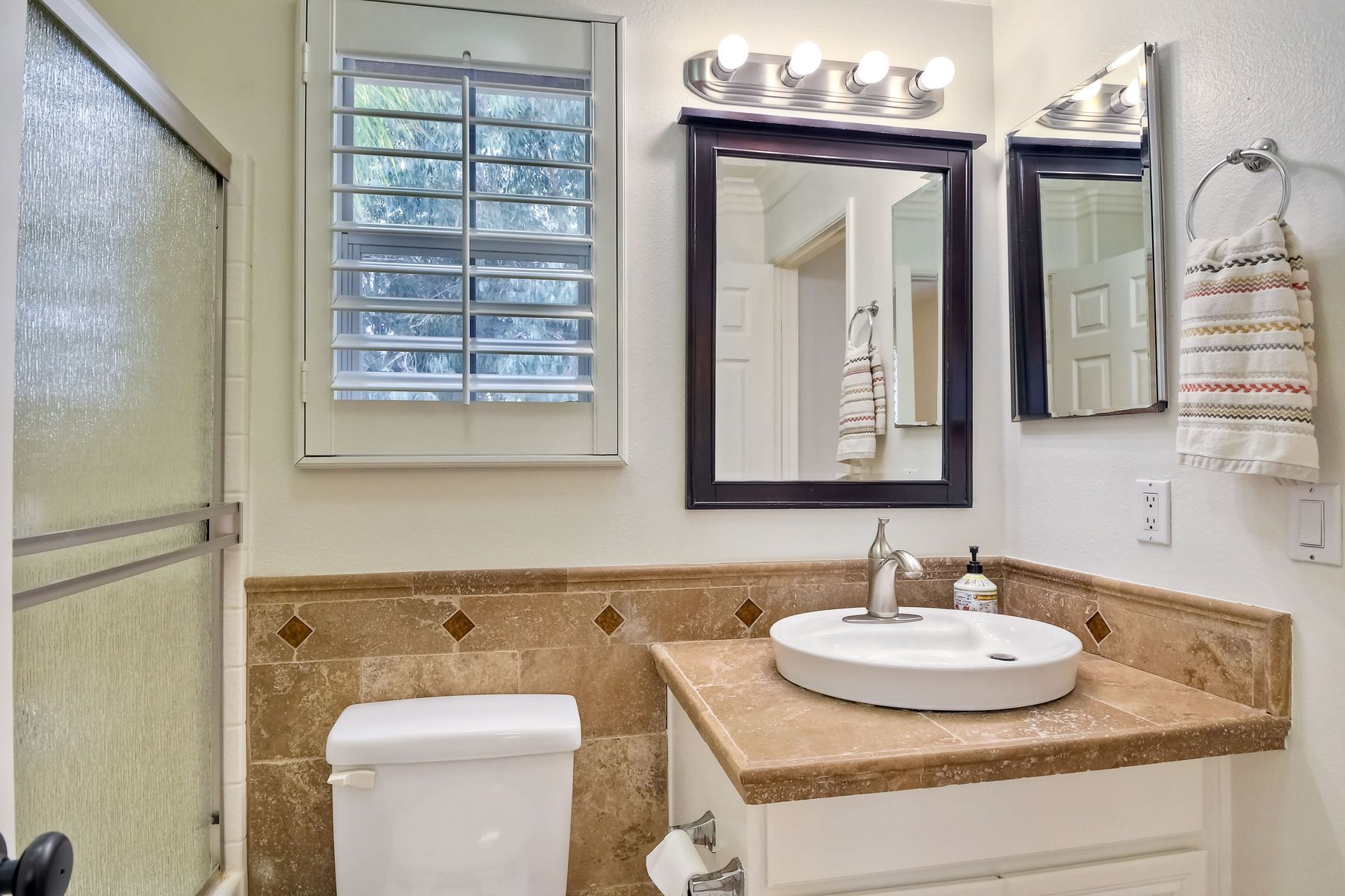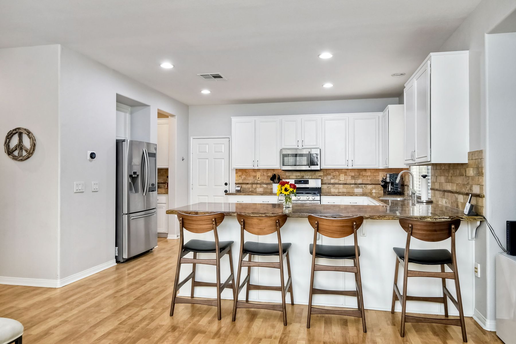 Spectacular home and high vaulted ceilings in living room w/lots of windows & separate dining room. The kitchen opens to family room and features stainless steel appl,Brazilian granite counters & a custom, tumbled marble back splash. Plantation shutters throughout. Huge walk in closet in master. A/C, rain gutters, extra storage in the garage and beautiful stained, acid etched patio and nice grassy area. Cute side yd. utility room w electricity. Super Area, parks and rec. area close by. Hurry. Won't last. [Supplement]: Santa Fe Hills is a sought after neighborhood in San Marcos. NO HOA! 4 bedrooms, 2.5 baths, 2,302 SF in popular Tesoro neighborhood. Great schools!