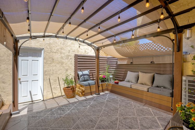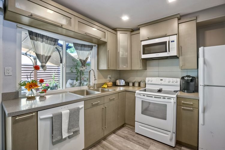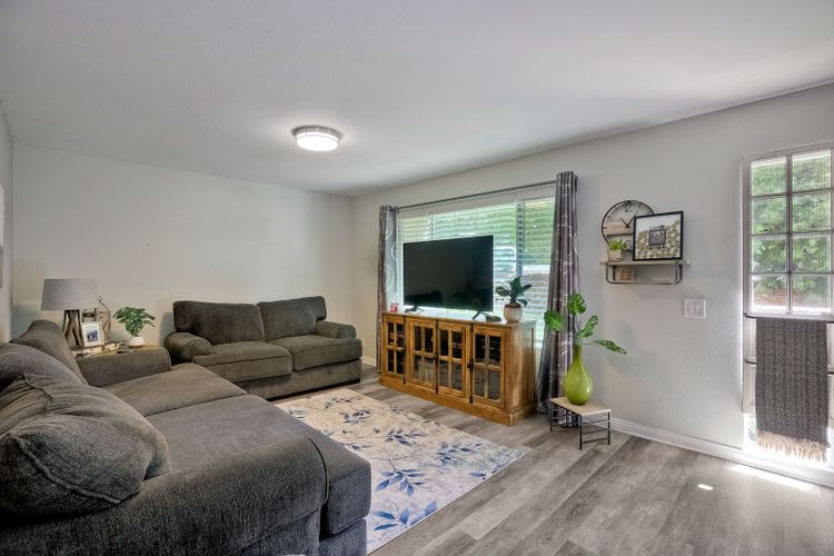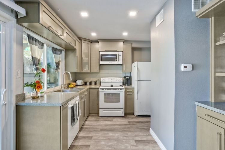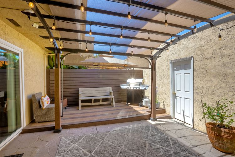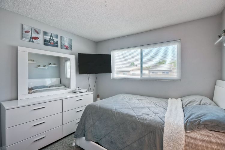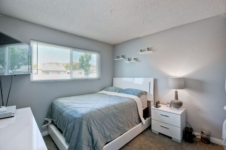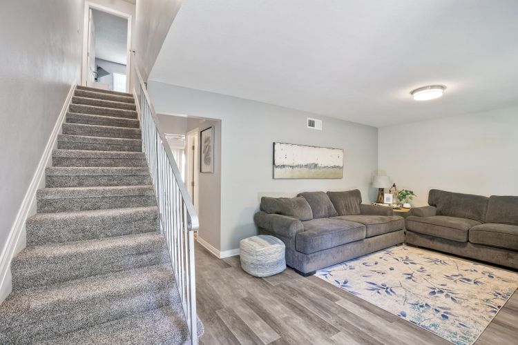 Inviting townhouse (PUD). VA & FHA approved. This townhouse is: 3 bedrooms (upstairs), 1-full bath with dual sinks (upstairs) and 1-half bath (downstairs). Features NEWER: electric stove, flooring, windows, garage door, a/c and water heater. All bedrooms upstairs. Master bedroom has a walk-in closet + 2 additional closets. Full size washer & dryer included as well as the refrigerator. Nicely sized covered patio is located between the 2 car garage & the townhouse. Covered patio has custom built-in-seated areas. Walk to nearby schools, parks, hiking trails & much more that Santee has to offer!