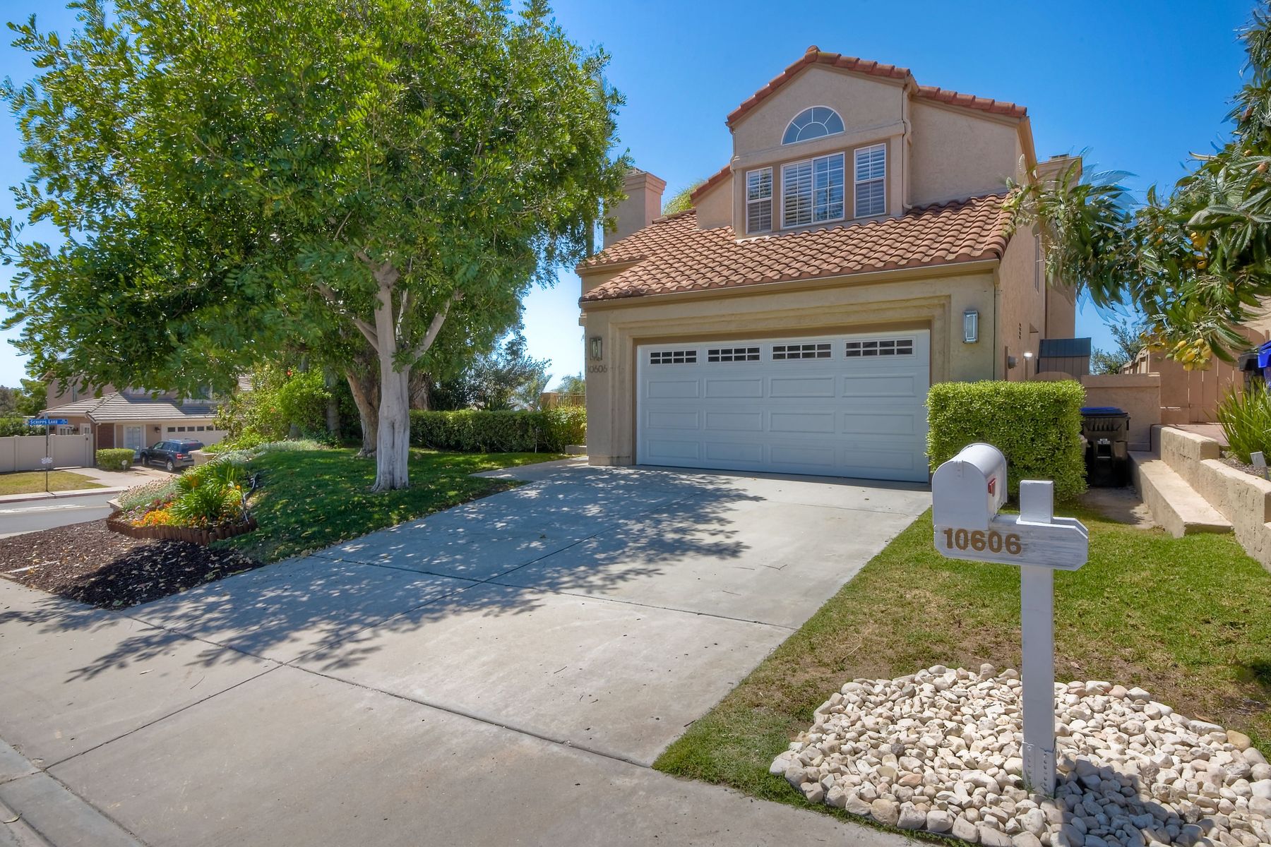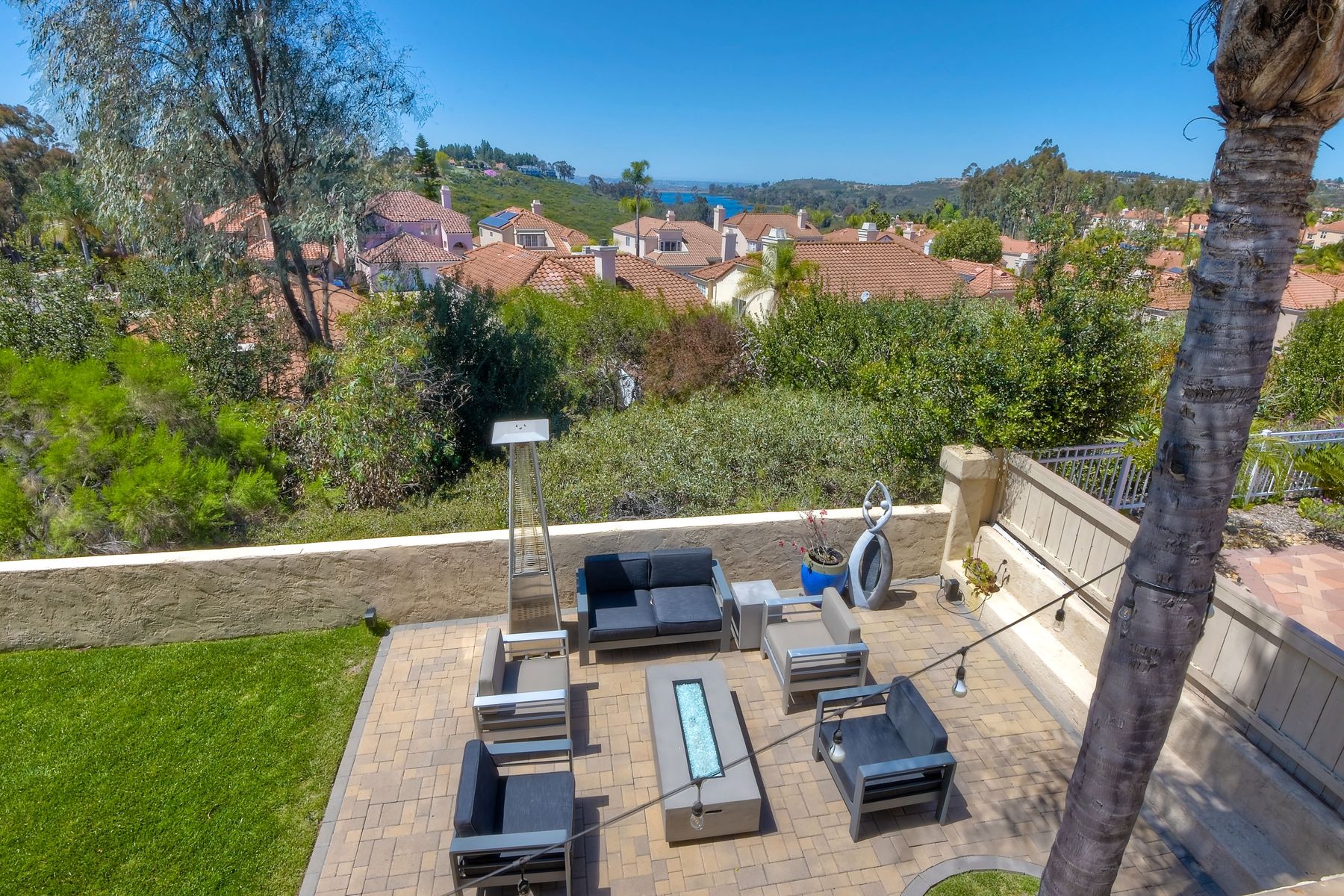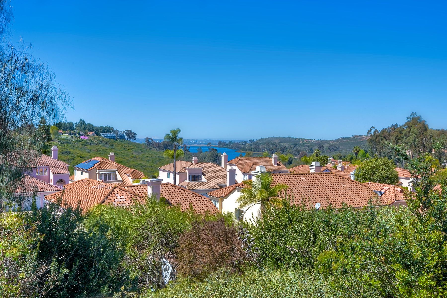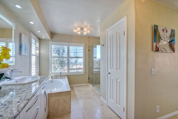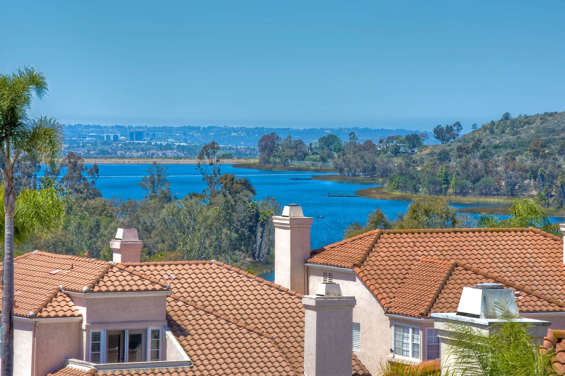 Highly sought after, rarely available elevated lake view! Soak up the amazing Miramar Lake view, breathtaking sunsets & westerly breezes on this oversized corner lot beauty! So much natural light throughout this stunning property! Step into the open & light living & dining areas appointed with soaring high ceilings & travertine tile floors throughout first floor, including custom mosaic medallion at entry. Renovated kitchen features contemporary cabinetry, large center island, solid counters, custom tiled backsplash, travertine tile floors, eat-in area with stainless steel sink & appliances. Awesome built-in storage! Open & bright family room features contemporary light fixture & French doors looking out to beautiful resort-style backyard with view of Miramar Lake. Fireplaces in living & family rooms feature custom tiled surround. Bedroom & full bath on first floor includes Murphy Bed. All bathrooms have been completely renovated with replaced cabinetry, travertine tiled showers, modern glass closures, natural stone countertops, toilets, fixtures & lighting. The ethereal, light & inviting owner’s suite features breathtaking rooftop, city & lake views with coastal breezes from open French doors to balcony. Sparkling owner’s bath beams with natural light offering an updated luxury bathroom equipped with tub, double sinks, updated cabinet with quartz countertop, travertine tiled custom shower & glass surround, with extra-large double walk-in closet & plantation shutters. 2 additional bedrooms upstairs, one with large window seat & plantation shutters. Manicured front yard with private front window garden & walk way surrounds property with mature trees that offer lots of shade & privacy. Beautiful backyard offers pavered patios & lawn area, elevated above the trees with stunning wisteria for added privacy; manicured side yard to gated front. 2-car garage upgraded with epoxy floors & overhead storage. Great location! Close to lake, schools, parks, shopping and dining. Short walk to Lakeview Park with trail to lake. Easy freeway access. If you are looking for an open, light & bright property with unique lake views, this is the property for you! So much to offer! Exceptional!