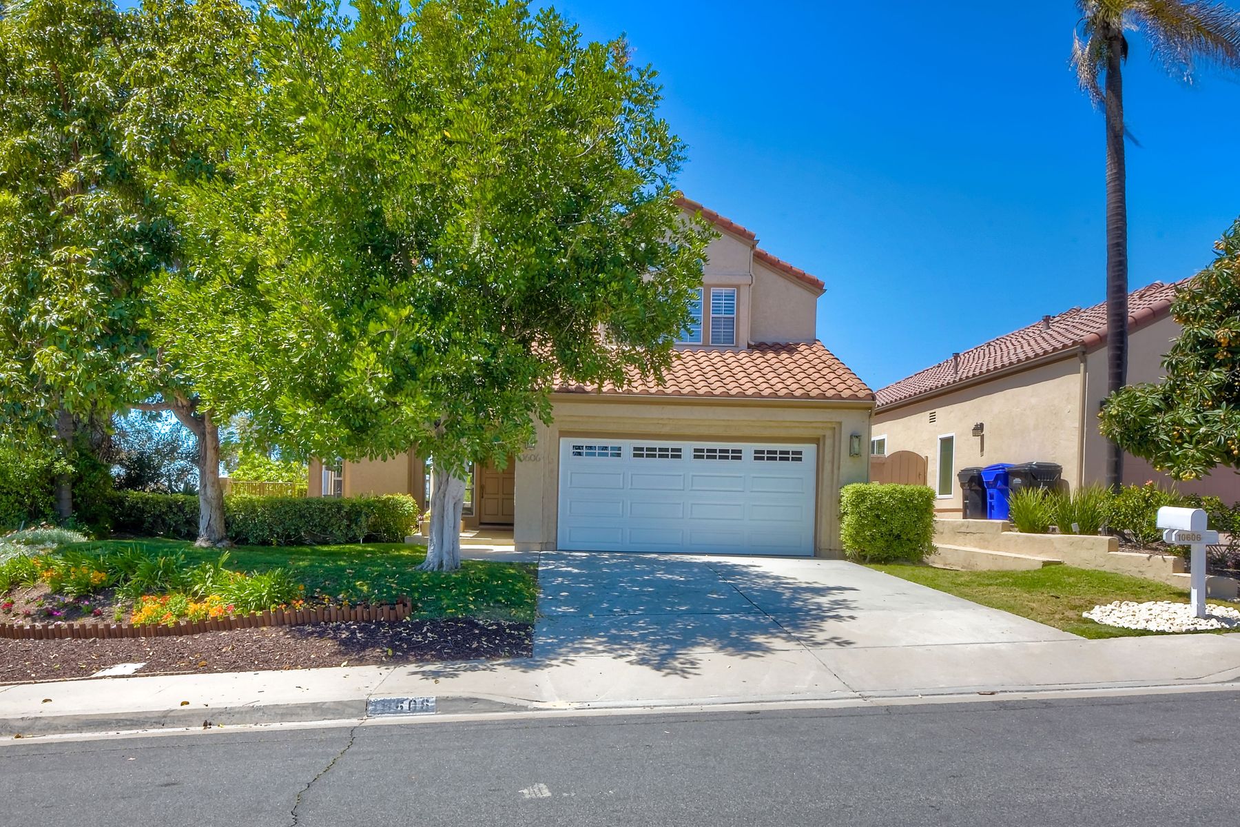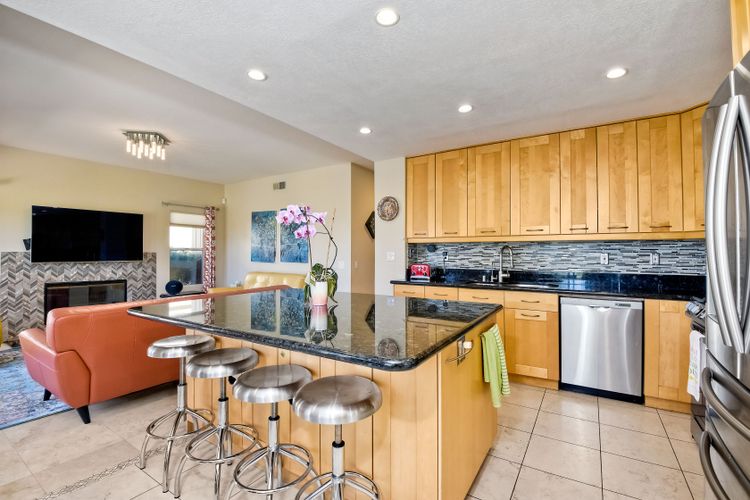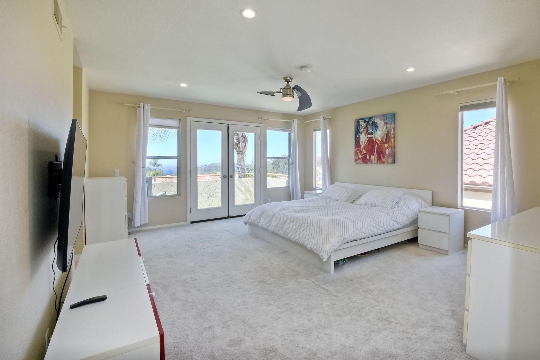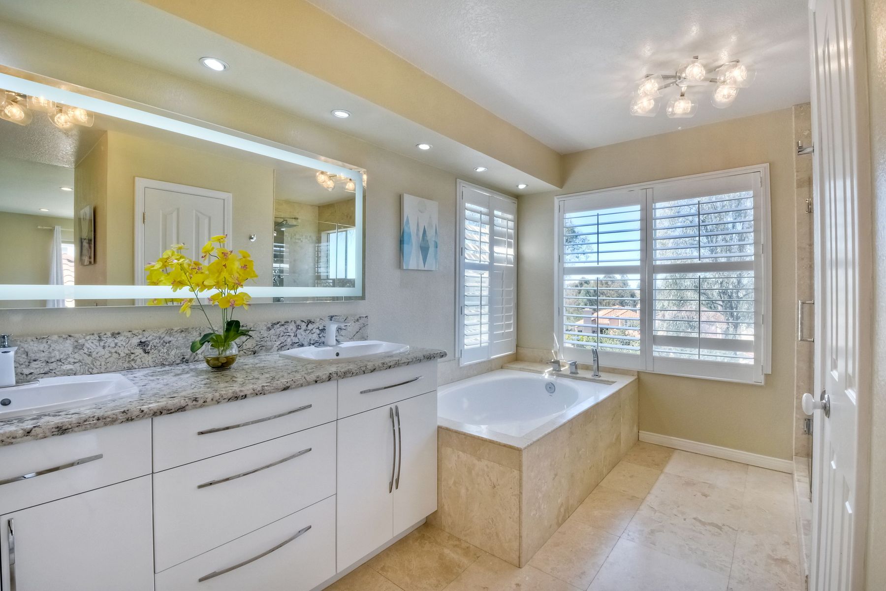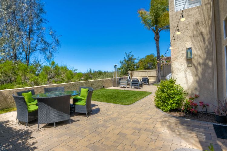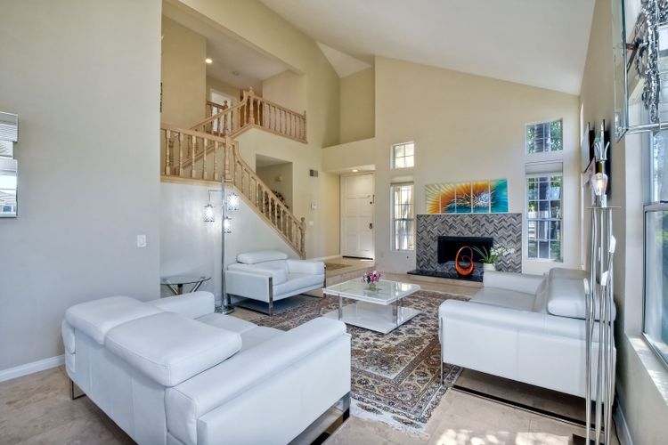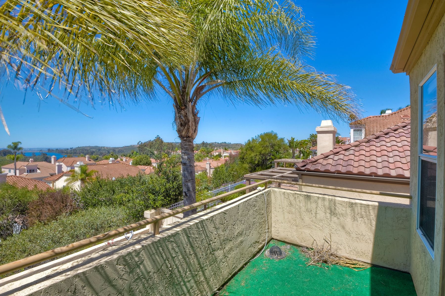 Highly sought after, rarely available elevated lake view! Soak up the amazing Miramar Lake view, breathtaking sunsets & westerly breezes on this oversized corner lot beauty! So much natural light throughout this stunning property! Step into the open & light living & dining areas appointed with soaring high ceilings & travertine tile floors throughout first floor, including custom mosaic medallion at entry. Renovated kitchen features contemporary cabinetry, large center island, solid counters, custom tiled backsplash, travertine tile floors, eat-in area with stainless steel sink & appliances. Awesome built-in storage! Open & bright family room features contemporary light fixture & French doors looking out to beautiful resort-style backyard with view of Miramar Lake. Fireplaces in living & family rooms feature custom tiled surround. Bedroom & full bath on first floor includes Murphy Bed. All bathrooms have been completely renovated with replaced cabinetry, travertine tiled showers, modern glass closures, natural stone countertops, toilets, fixtures & lighting. The ethereal, light & inviting owner’s suite features breathtaking rooftop, city & lake views with coastal breezes from open French doors to balcony. Sparkling owner’s bath beams with natural light offering an updated luxury bathroom equipped with tub, double sinks, updated cabinet with quartz countertop, travertine tiled custom shower & glass surround, with extra-large double walk-in closet & plantation shutters. 2 additional bedrooms upstairs, one with large window seat & plantation shutters. Manicured front yard with private front window garden & walk way surrounds property with mature trees that offer lots of shade & privacy. Beautiful backyard offers pavered patios & lawn area, elevated above the trees with stunning wisteria for added privacy; manicured side yard to gated front. 2-car garage upgraded with epoxy floors & overhead storage. Great location! Close to lake, schools, parks, shopping and dining. Short walk to Lakeview Park with trail to lake. Easy freeway access. If you are looking for an open, light & bright property with unique lake views, this is the property for you! So much to offer! Exceptional!