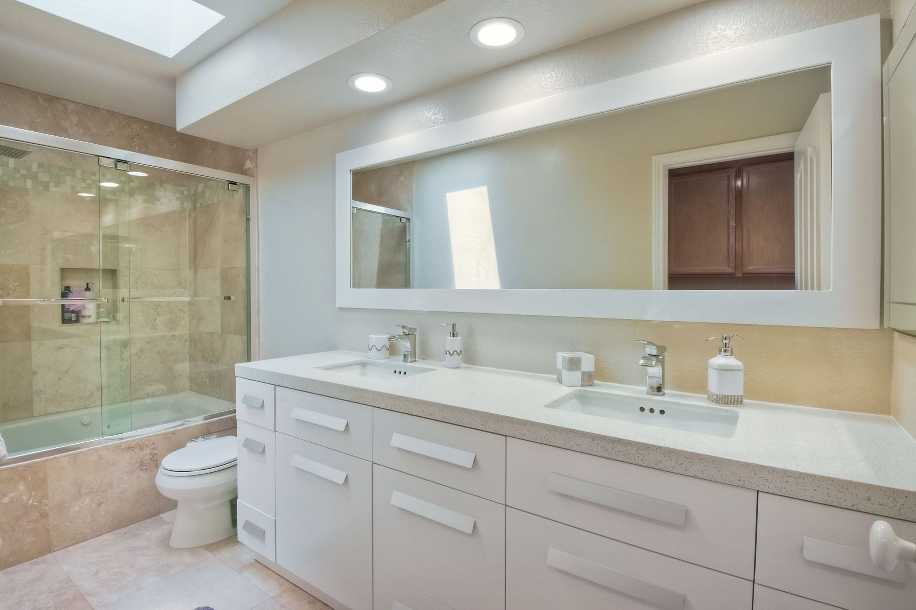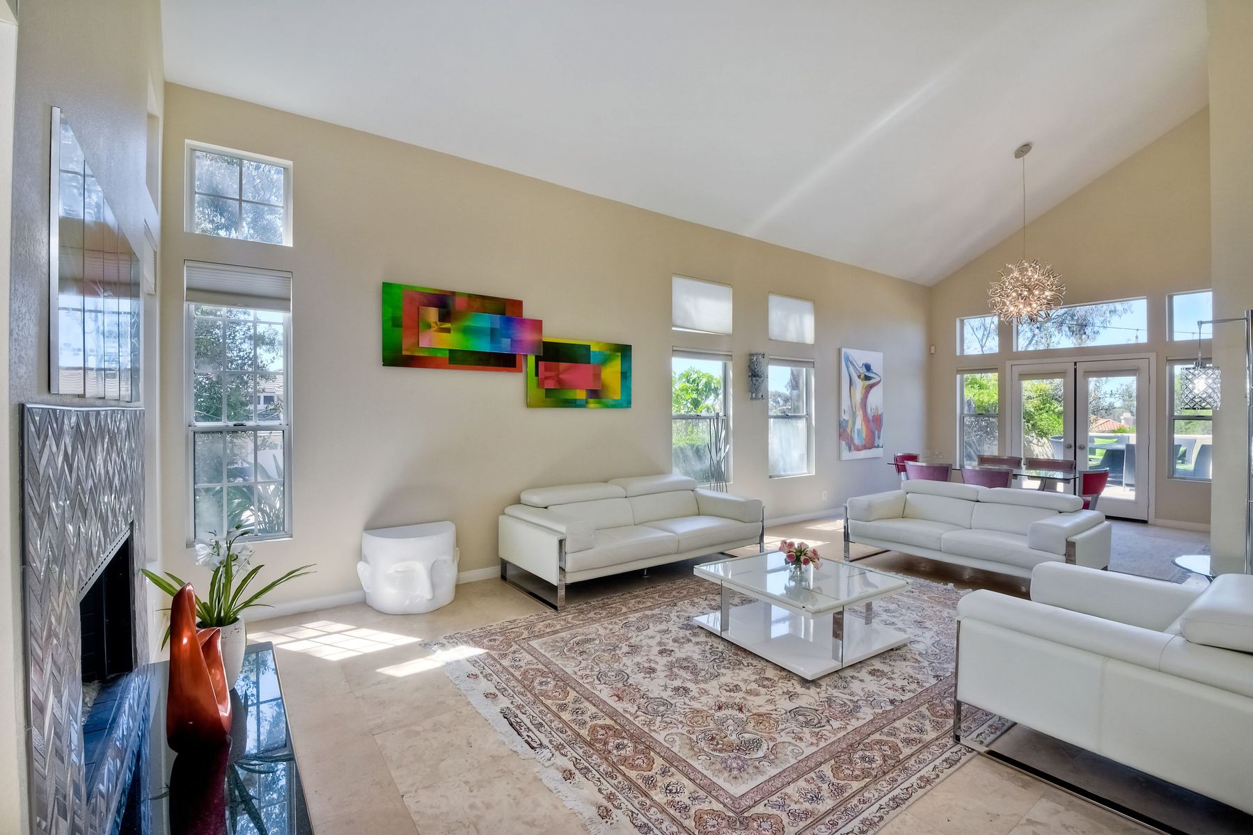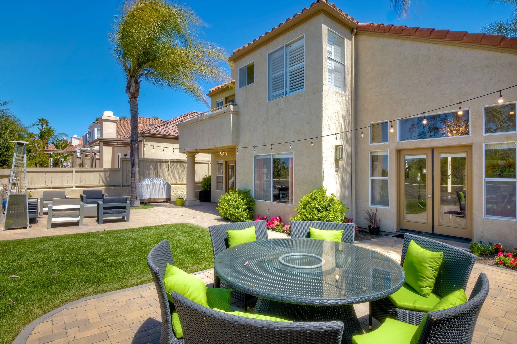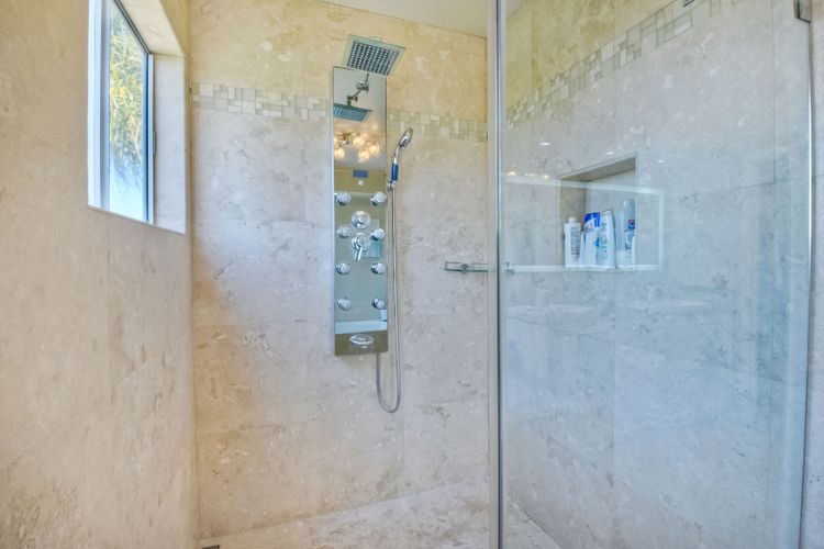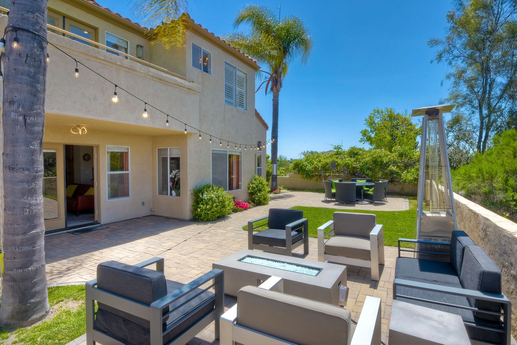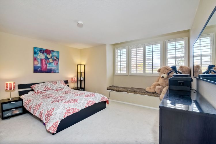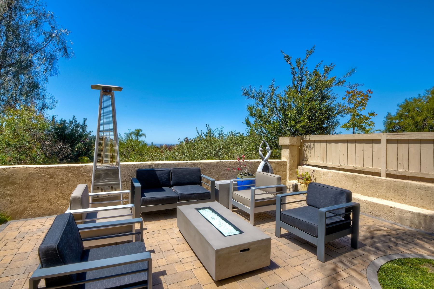Highly sought after, rarely available elevated lake view! Soak up the amazing Miramar Lake view, breathtaking sunsets & westerly breezes on this oversized corner lot beauty! So much natural light throughout this stunning property! Step into the open & light living & dining areas appointed with soaring high ceilings & travertine tile floors throughout first floor, including custom mosaic medallion at entry. Renovated kitchen features contemporary cabinetry, large center island, solid counters, custom tiled backsplash, travertine tile floors, eat-in area with stainless steel sink & appliances. Awesome built-in storage! Open & bright family room features contemporary light fixture & French doors looking out to beautiful resort-style backyard with view of Miramar Lake. Fireplaces in living & family rooms feature custom tiled surround. Bedroom & full bath on first floor includes Murphy Bed. All bathrooms have been completely renovated with replaced cabinetry, travertine tiled showers, modern glass closures, natural stone countertops, toilets, fixtures & lighting. The ethereal, light & inviting owner’s suite features breathtaking rooftop, city & lake views with coastal breezes from open French doors to balcony. Sparkling owner’s bath beams with natural light offering an updated luxury bathroom equipped with tub, double sinks, updated cabinet with quartz countertop, travertine tiled custom shower & glass surround, with extra-large double walk-in closet & plantation shutters. 2 additional bedrooms upstairs, one with large window seat & plantation shutters. Manicured front yard with private front window garden & walk way surrounds property with mature trees that offer lots of shade & privacy. Beautiful backyard offers pavered patios & lawn area, elevated above the trees with stunning wisteria for added privacy; manicured side yard to gated front. 2-car garage upgraded with epoxy floors & overhead storage. Great location! Close to lake, schools, parks, shopping and dining. Short walk to Lakeview Park with trail to lake. Easy freeway access. If you are looking for an open, light & bright property with unique lake views, this is the property for you! So much to offer! Exceptional!