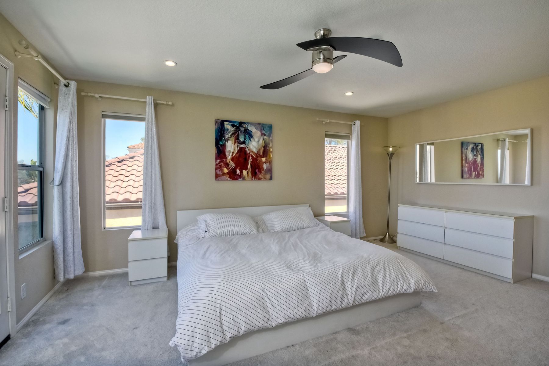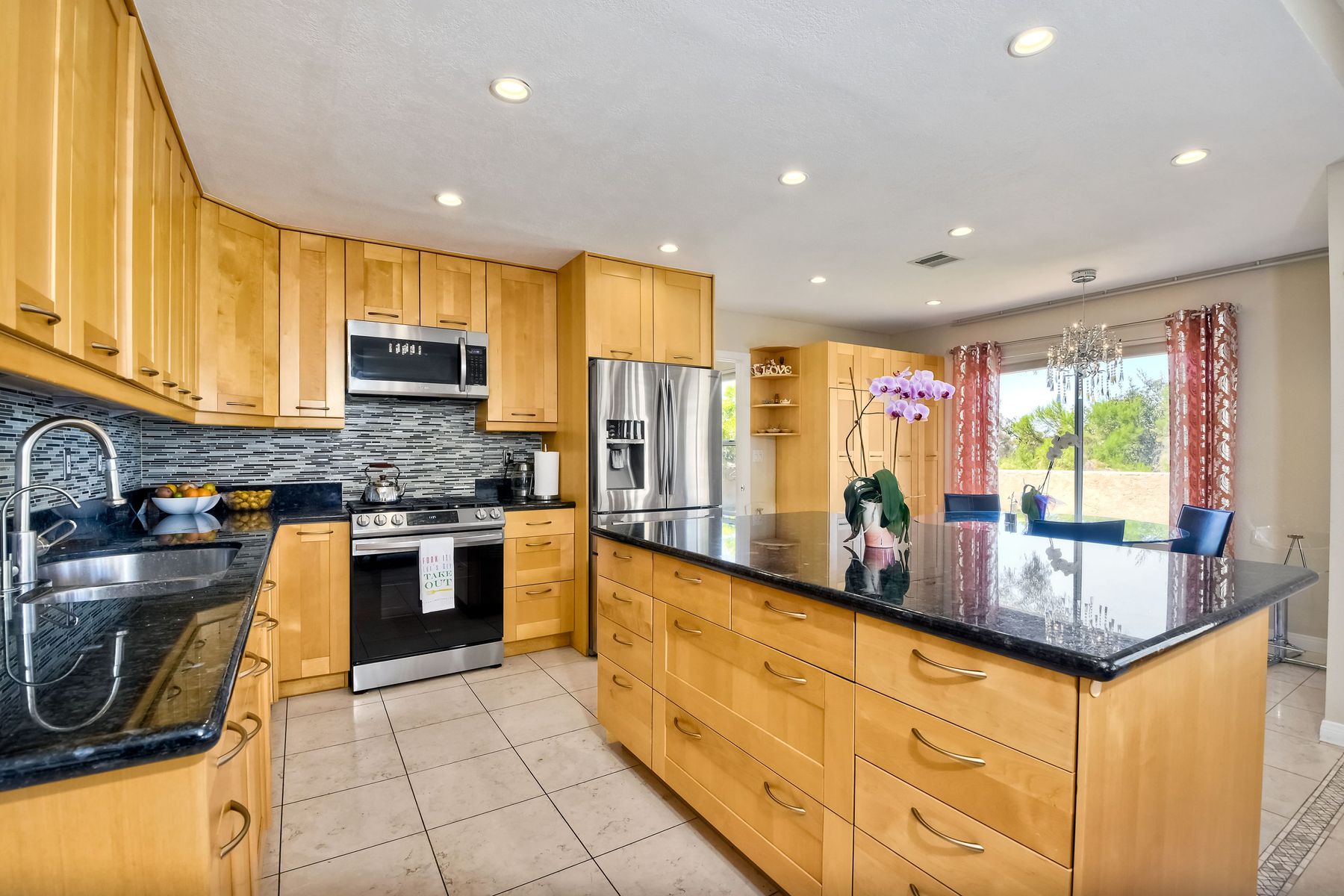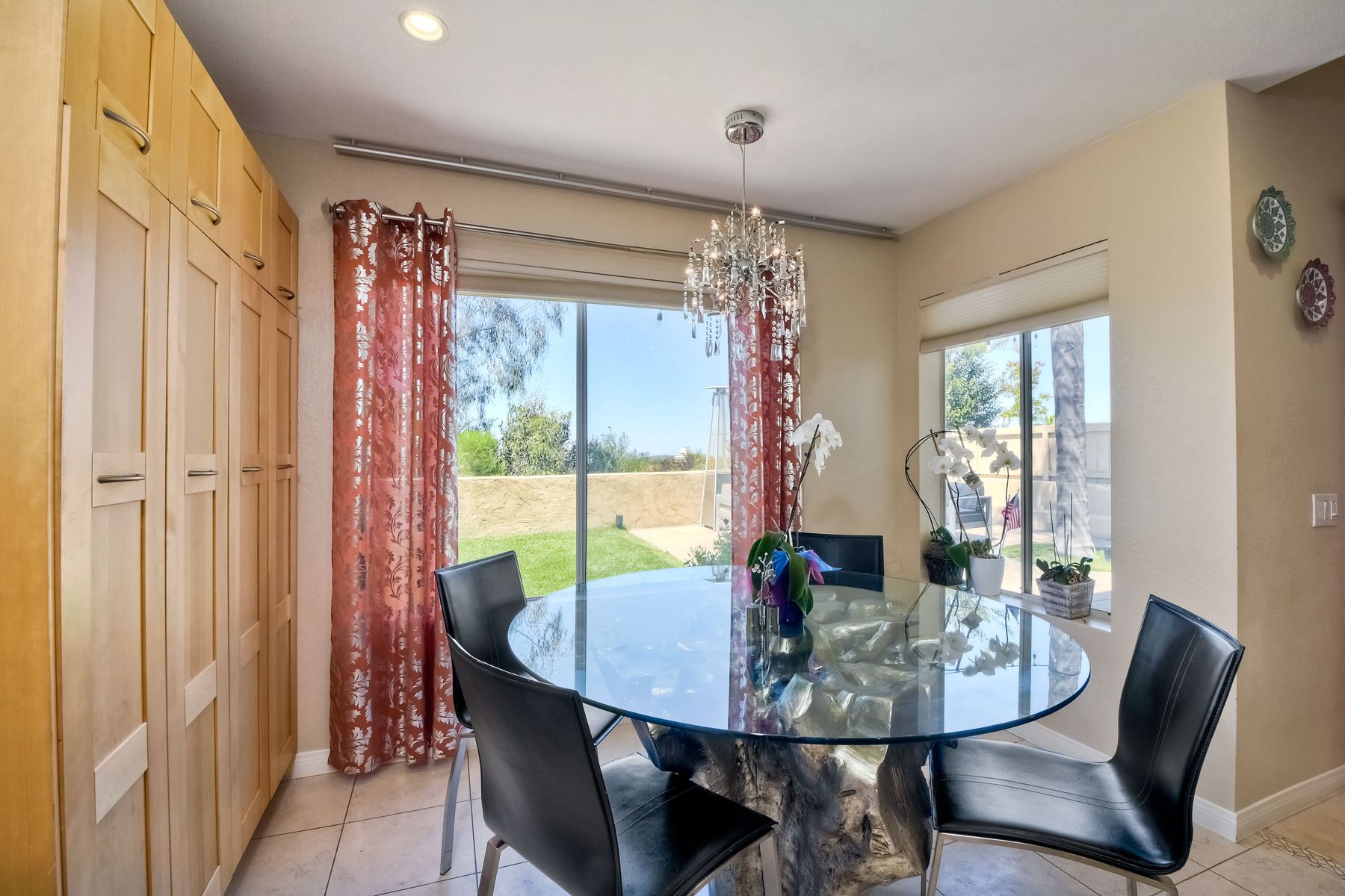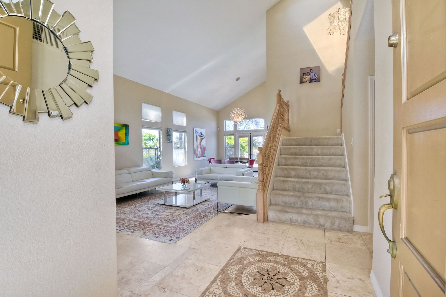 Highly sought after, rarely available elevated lake view! Soak up the amazing Miramar Lake view, breathtaking sunsets & westerly breezes on this oversized corner lot beauty! So much natural light throughout this stunning property! Step into the open & light living & dining areas appointed with soaring high ceilings & travertine tile floors throughout first floor, including custom mosaic medallion at entry. Renovated kitchen features contemporary cabinetry, large center island, solid counters, custom tiled backsplash, travertine tile floors, eat-in area with stainless steel sink & appliances. Awesome built-in storage! Open & bright family room features contemporary light fixture & French doors looking out to beautiful resort-style backyard with view of Miramar Lake. Fireplaces in living & family rooms feature custom tiled surround. Bedroom & full bath on first floor includes Murphy Bed. All bathrooms have been completely renovated with replaced cabinetry, travertine tiled showers, modern glass closures, natural stone countertops, toilets, fixtures & lighting. The ethereal, light & inviting owner’s suite features breathtaking rooftop, city & lake views with coastal breezes from open French doors to balcony. Sparkling owner’s bath beams with natural light offering an updated luxury bathroom equipped with tub, double sinks, updated cabinet with quartz countertop, travertine tiled custom shower & glass surround, with extra-large double walk-in closet & plantation shutters. 2 additional bedrooms upstairs, one with large window seat & plantation shutters. Manicured front yard with private front window garden & walk way surrounds property with mature trees that offer lots of shade & privacy. Beautiful backyard offers pavered patios & lawn area, elevated above the trees with stunning wisteria for added privacy; manicured side yard to gated front. 2-car garage upgraded with epoxy floors & overhead storage. Great location! Close to lake, schools, parks, shopping and dining. Short walk to Lakeview Park with trail to lake. Easy freeway access. If you are looking for an open, light & bright property with unique lake views, this is the property for you! So much to offer! Exceptional!