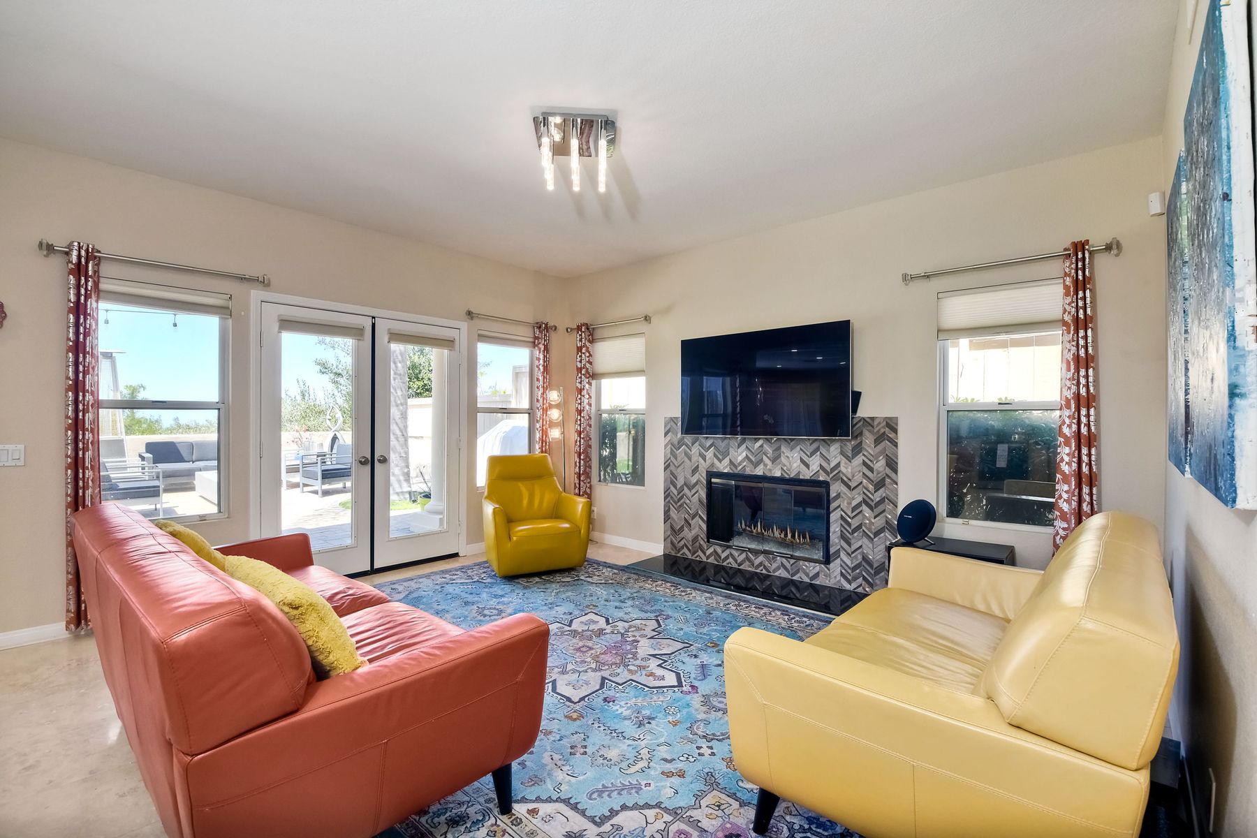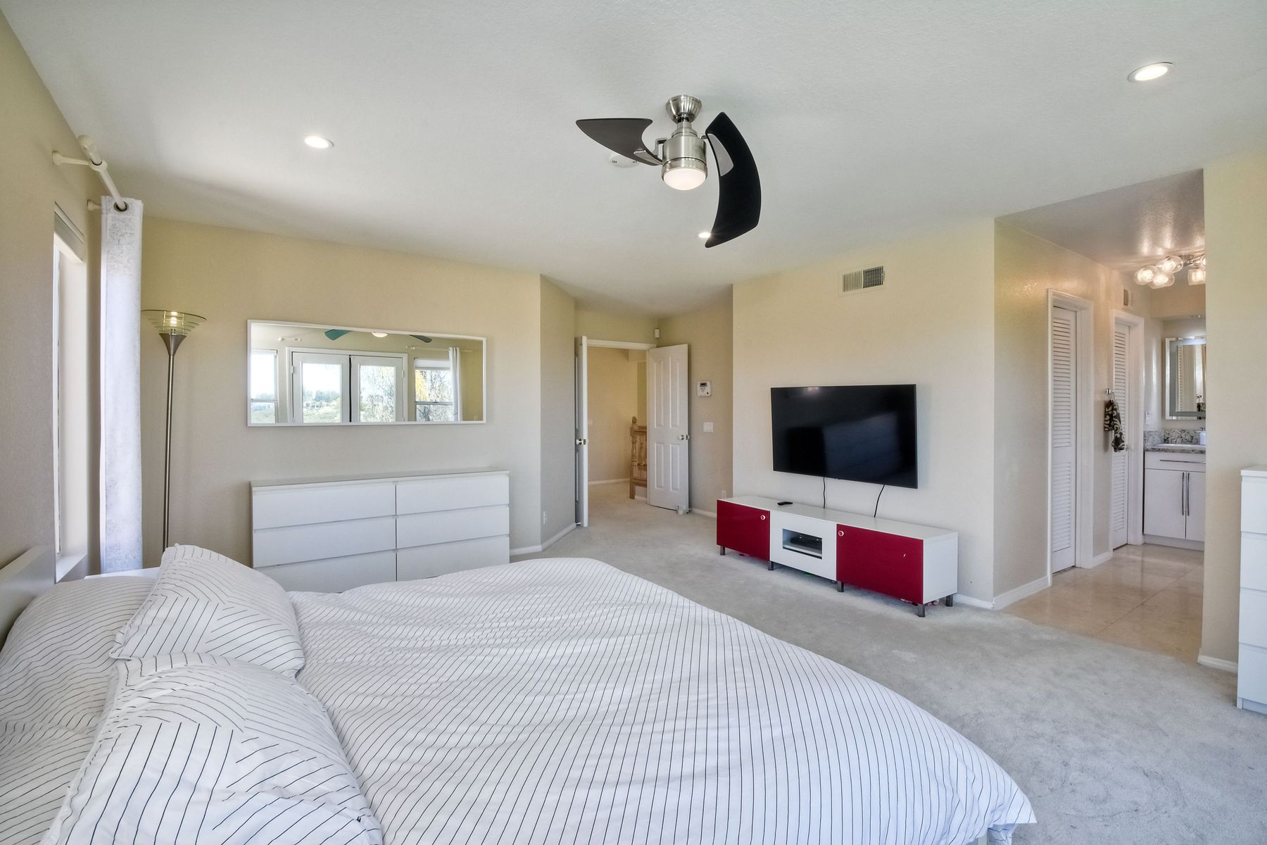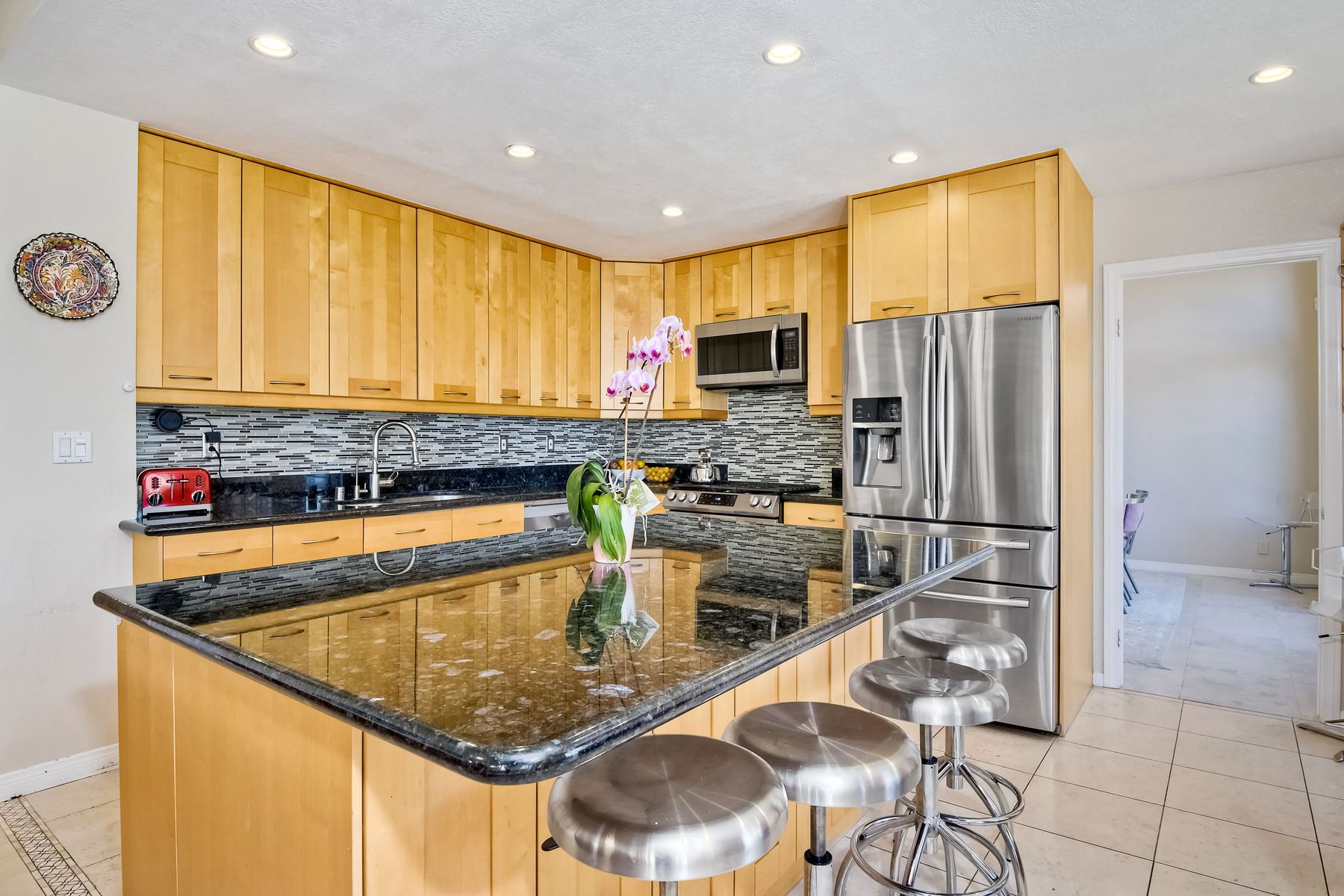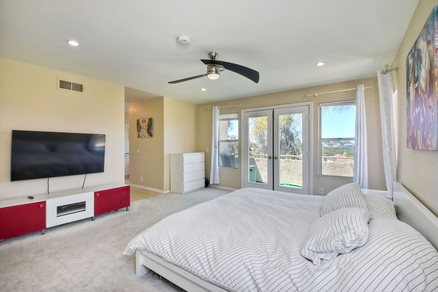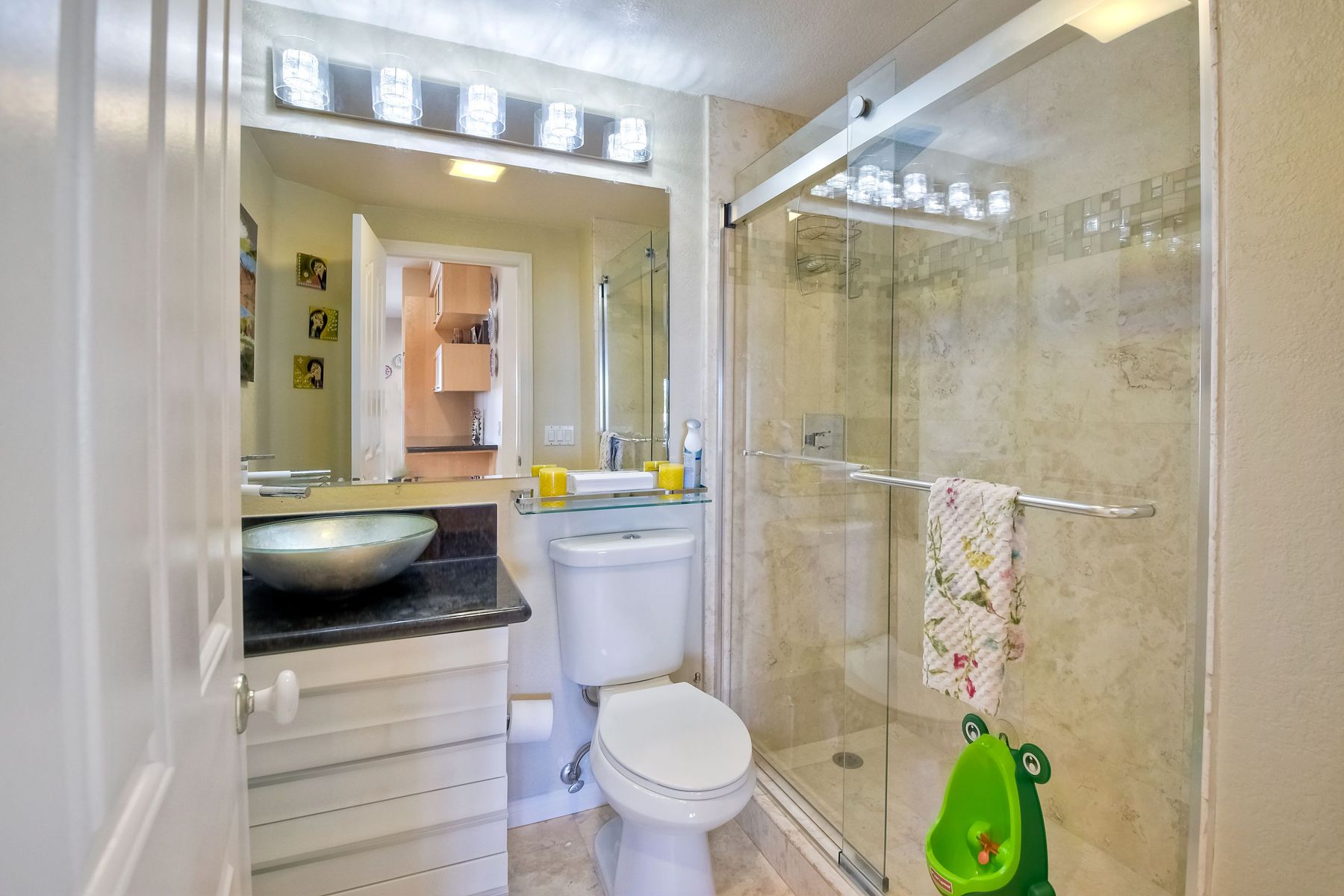 Highly sought after, rarely available elevated lake view! Soak up the amazing Miramar Lake view, breathtaking sunsets & westerly breezes on this oversized corner lot beauty! So much natural light throughout this stunning property! Step into the open & light living & dining areas appointed with soaring high ceilings & travertine tile floors throughout first floor, including custom mosaic medallion at entry. Renovated kitchen features contemporary cabinetry, large center island, solid counters, custom tiled backsplash, travertine tile floors, eat-in area with stainless steel sink & appliances. Awesome built-in storage! Open & bright family room features contemporary light fixture & French doors looking out to beautiful resort-style backyard with view of Miramar Lake. Fireplaces in living & family rooms feature custom tiled surround. Bedroom & full bath on first floor includes Murphy Bed. All bathrooms have been completely renovated with replaced cabinetry, travertine tiled showers, modern glass closures, natural stone countertops, toilets, fixtures & lighting. The ethereal, light & inviting owner’s suite features breathtaking rooftop, city & lake views with coastal breezes from open French doors to balcony. Sparkling owner’s bath beams with natural light offering an updated luxury bathroom equipped with tub, double sinks, updated cabinet with quartz countertop, travertine tiled custom shower & glass surround, with extra-large double walk-in closet & plantation shutters. 2 additional bedrooms upstairs, one with large window seat & plantation shutters. Manicured front yard with private front window garden & walk way surrounds property with mature trees that offer lots of shade & privacy. Beautiful backyard offers pavered patios & lawn area, elevated above the trees with stunning wisteria for added privacy; manicured side yard to gated front. 2-car garage upgraded with epoxy floors & overhead storage. Great location! Close to lake, schools, parks, shopping and dining. Short walk to Lakeview Park with trail to lake. Easy freeway access. If you are looking for an open, light & bright property with unique lake views, this is the property for you! So much to offer! Exceptional!