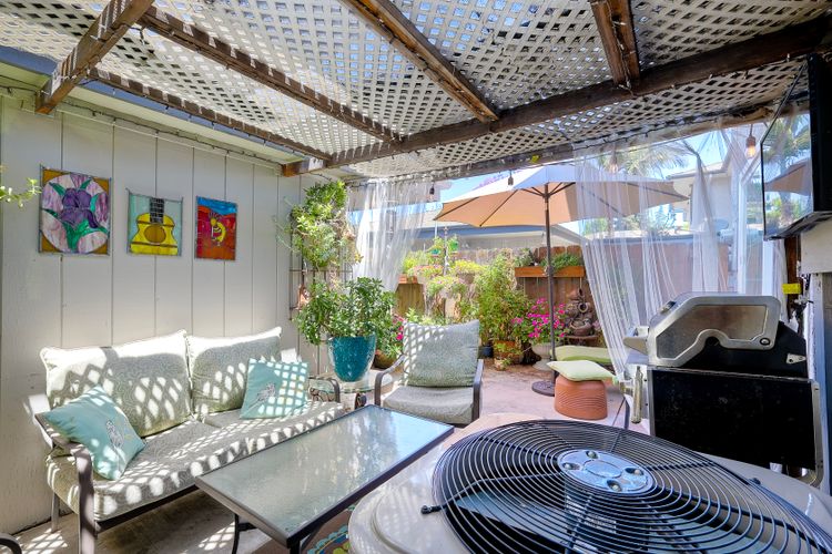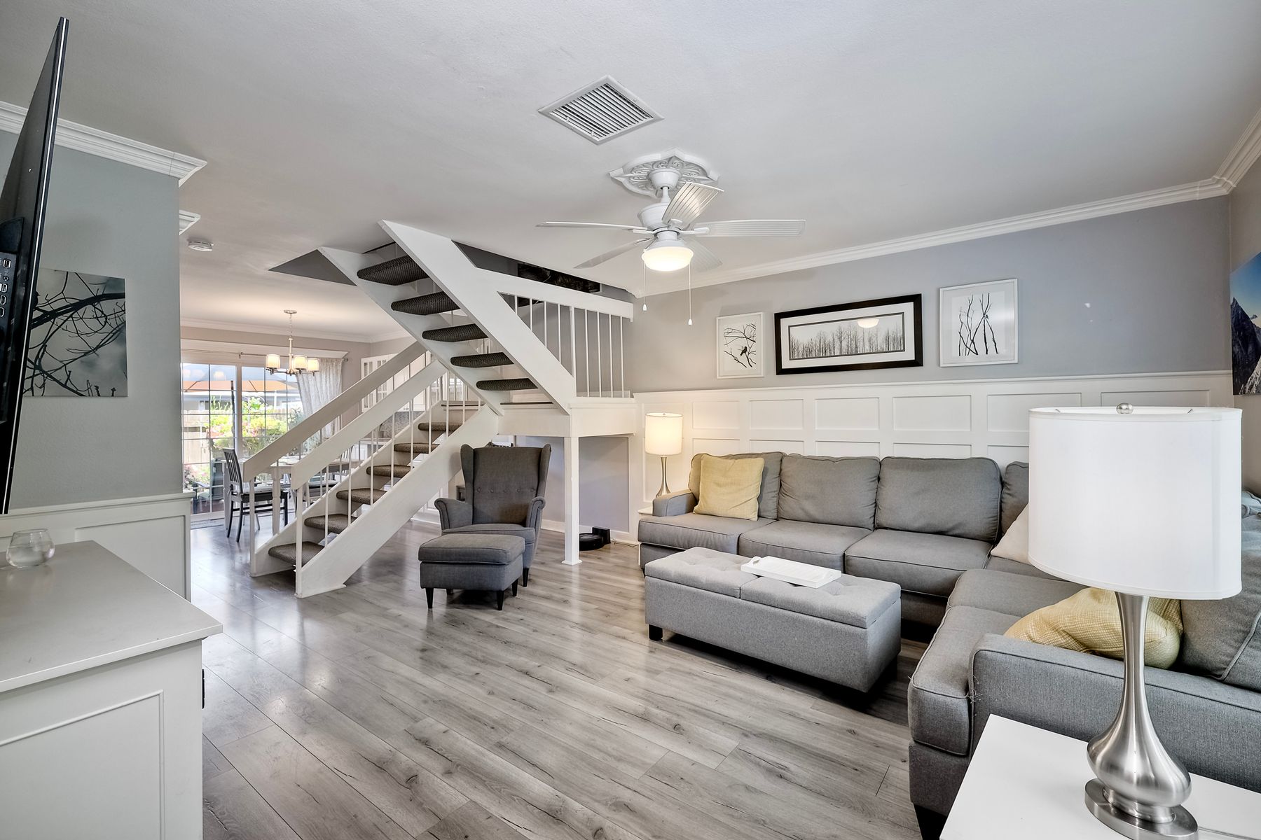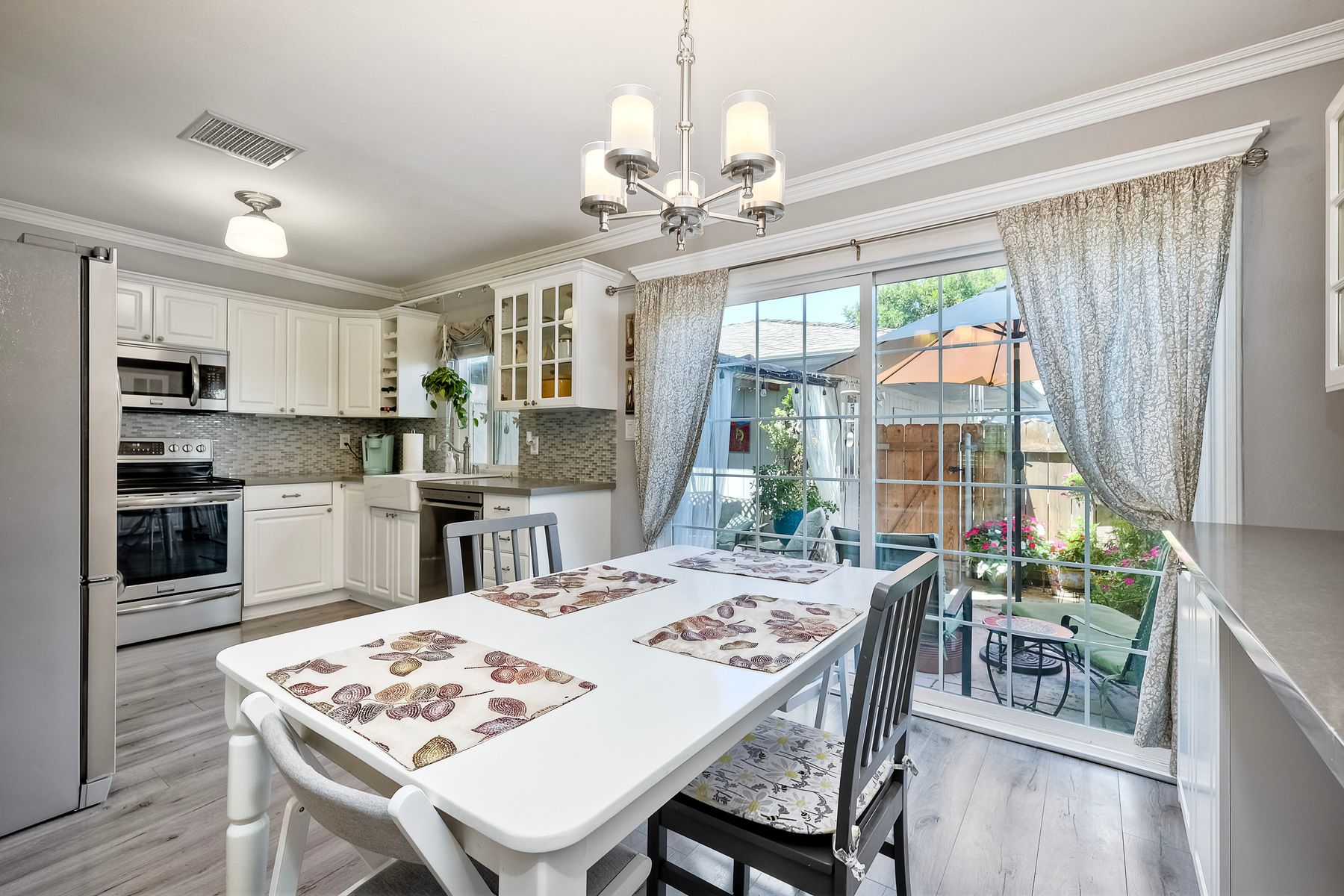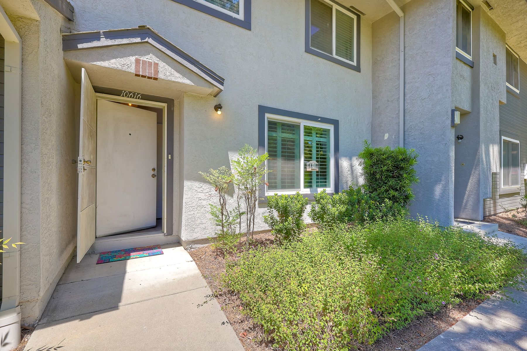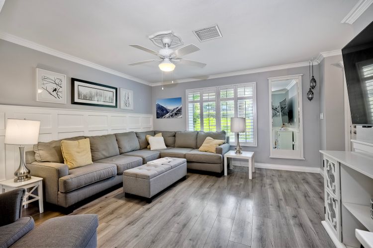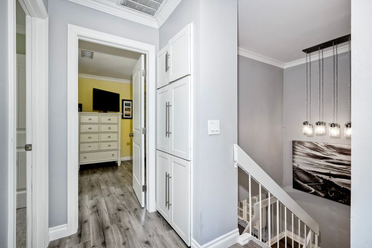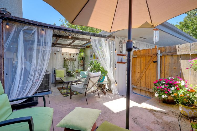 Beautifully updated - new wood floors, crown molding, paint, lights, counter tops, kitchen cabinets, stainless steel appliances, windows, paneling, ceiling fans, A/C, custom cabinets in dining room and glass backsplash, new vanities and lighting in bathrooms, Enjoy the beautiful patio and the detached one car garage. All bedrooms upstairs. Front door faces EAST. HOA amenities include pool, spa, and playground.