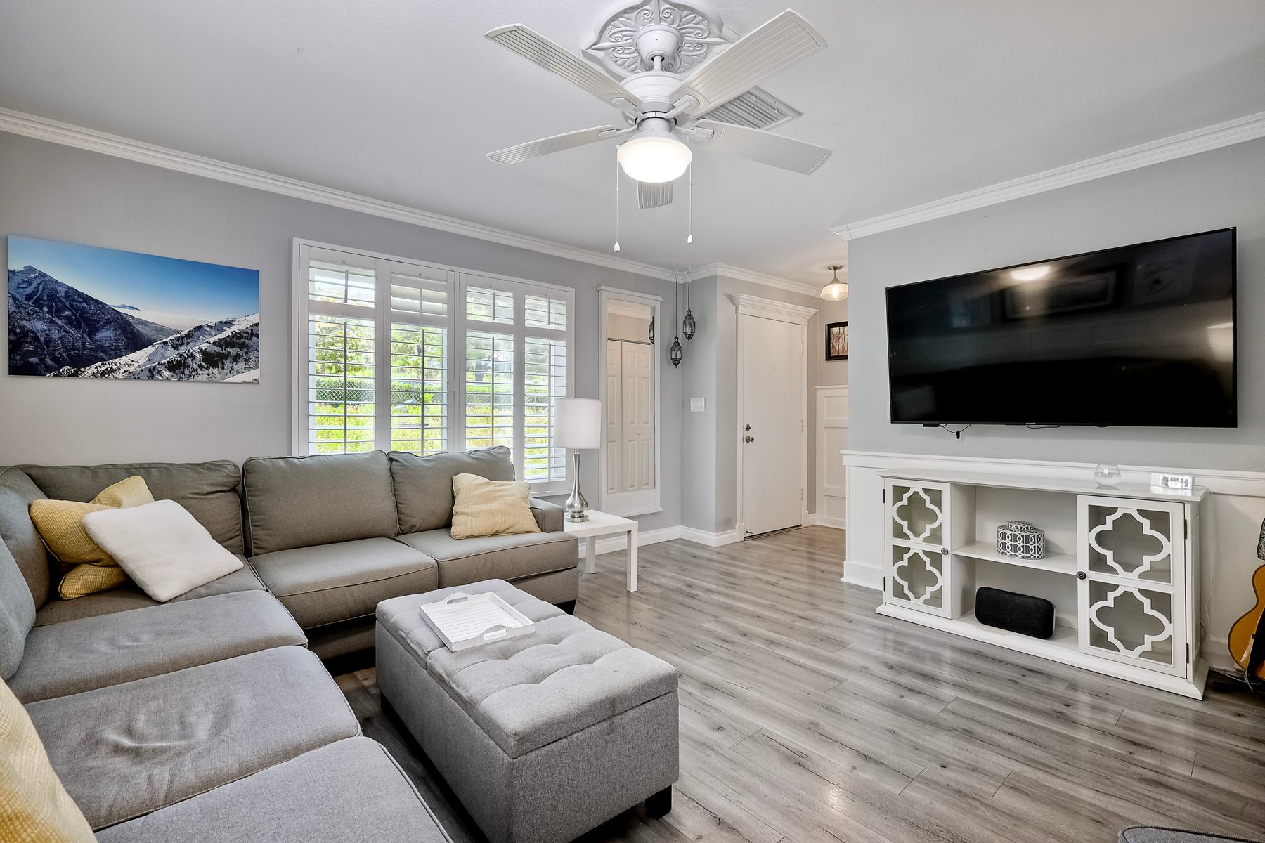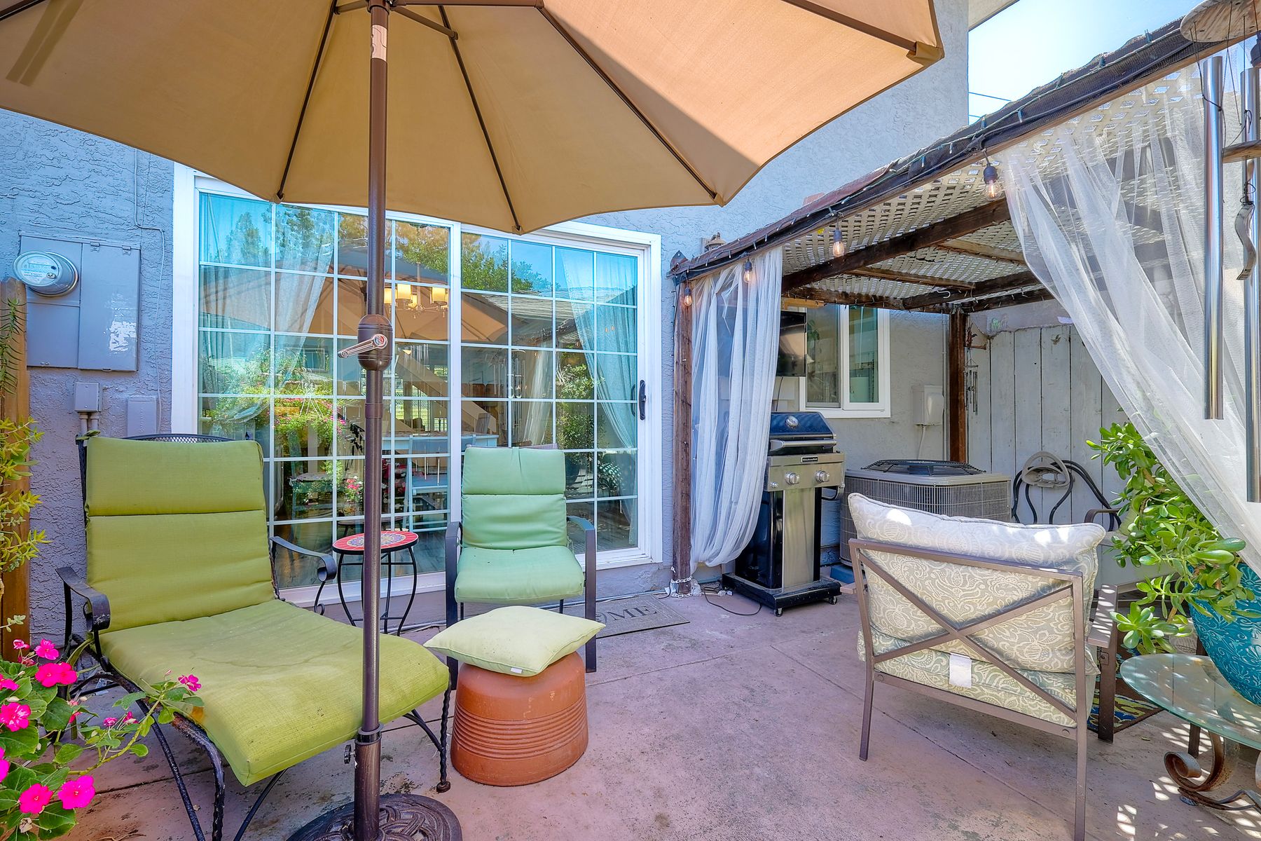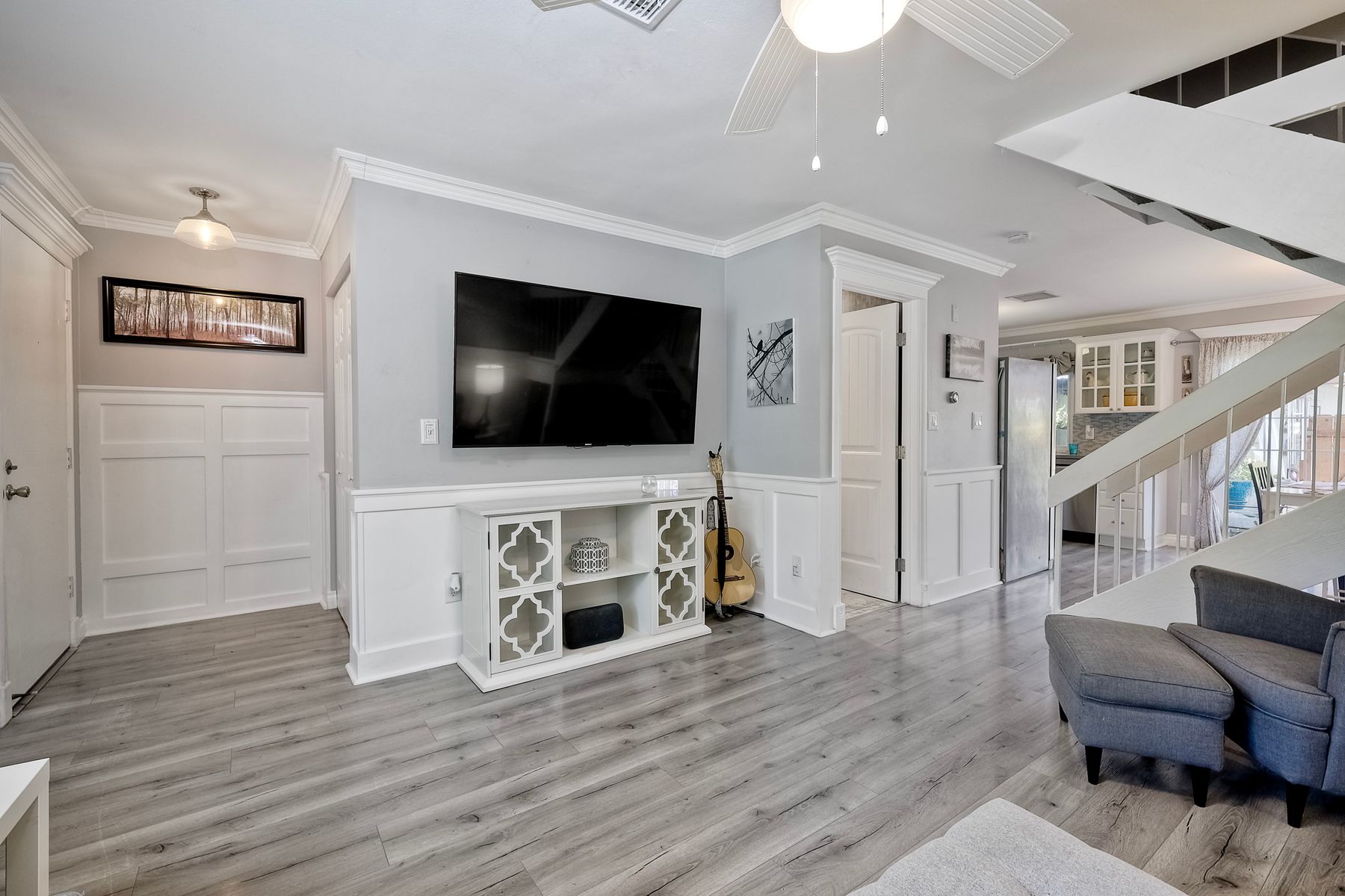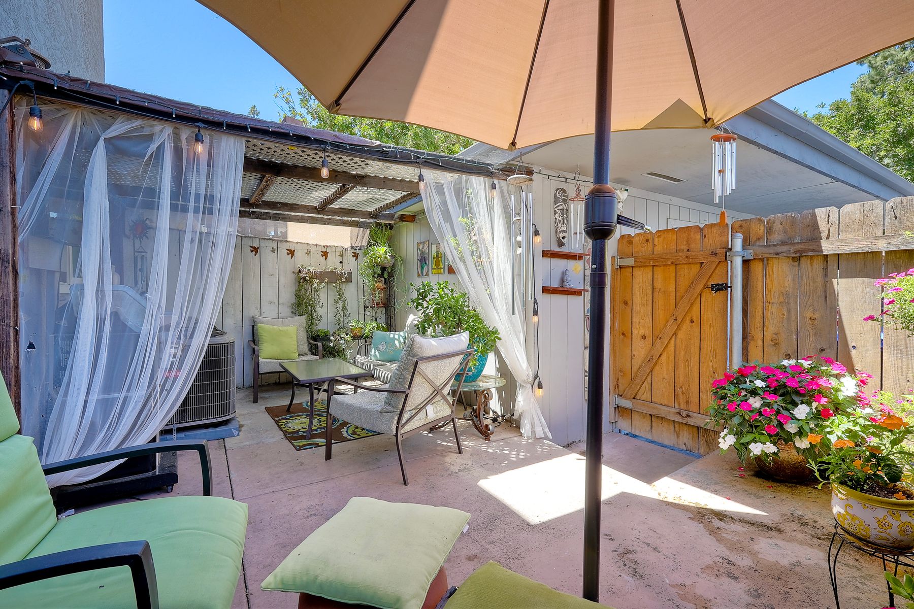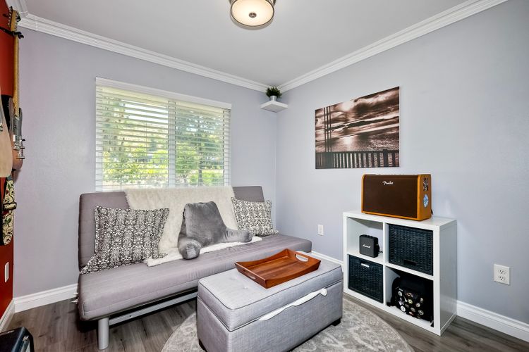 Beautifully updated - new wood floors, crown molding, paint, lights, counter tops, kitchen cabinets, stainless steel appliances, windows, paneling, ceiling fans, A/C, custom cabinets in dining room and glass backsplash, new vanities and lighting in bathrooms, Enjoy the beautiful patio and the detached one car garage. All bedrooms upstairs. Front door faces EAST. HOA amenities include pool, spa, and playground.