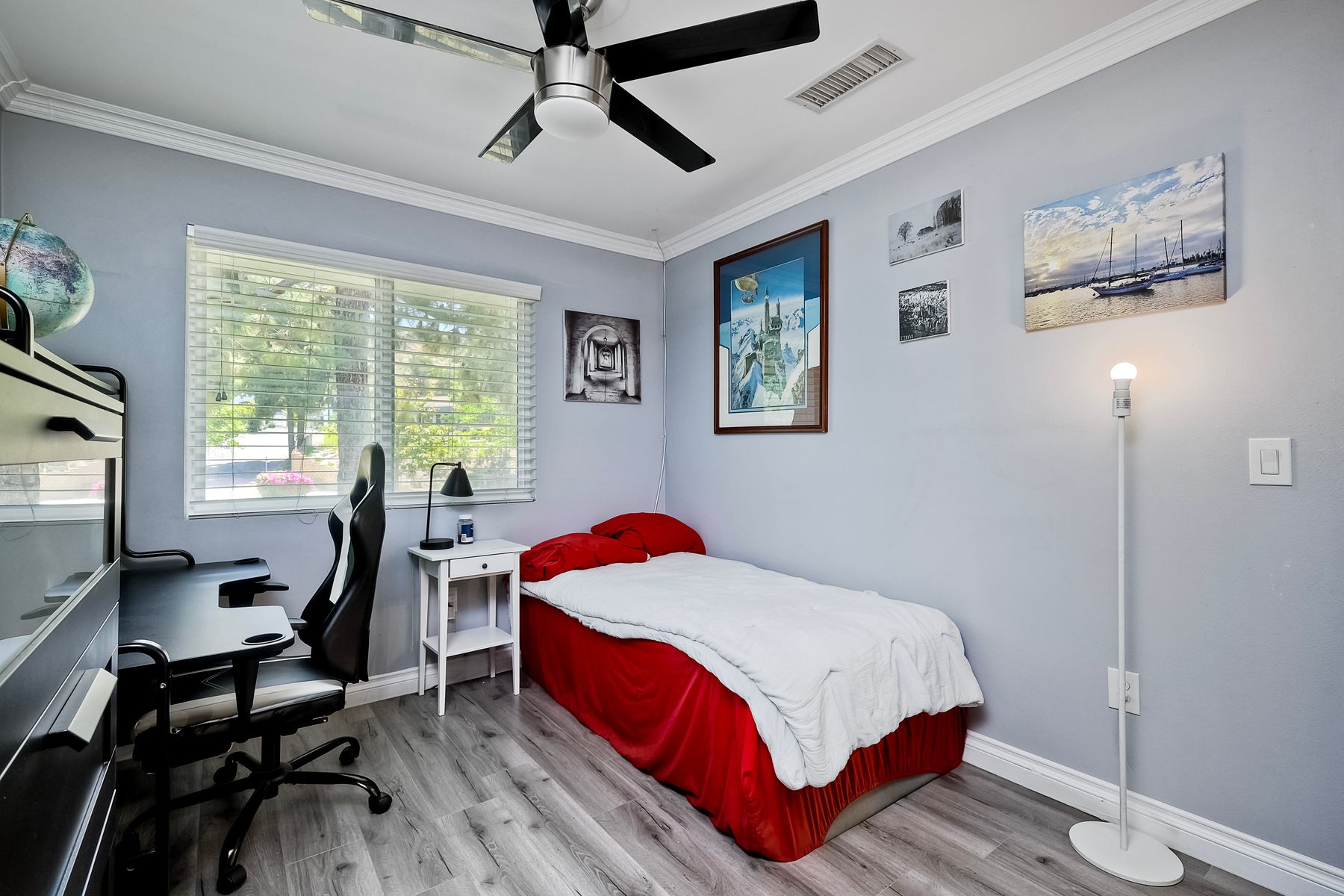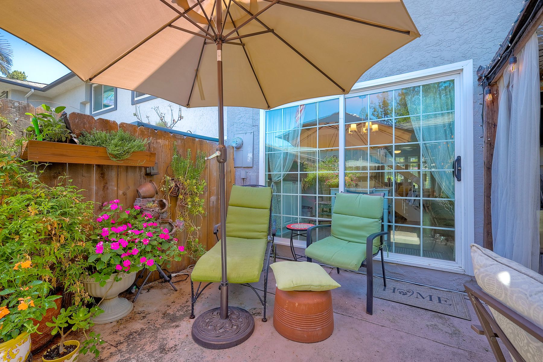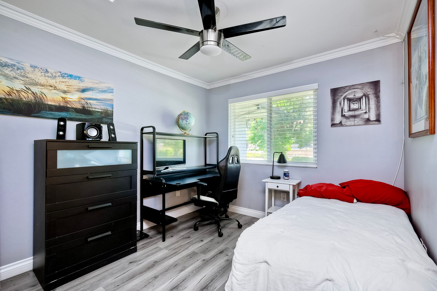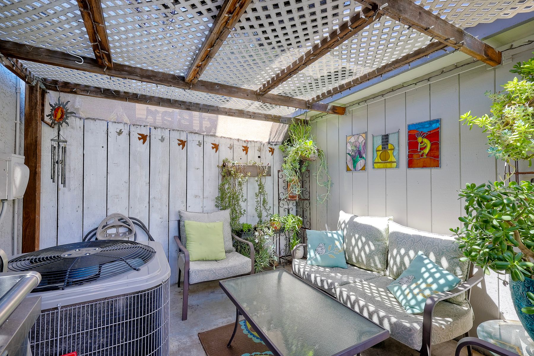 Beautifully updated - new wood floors, crown molding, paint, lights, counter tops, kitchen cabinets, stainless steel appliances, windows, paneling, ceiling fans, A/C, custom cabinets in dining room and glass backsplash, new vanities and lighting in bathrooms, Enjoy the beautiful patio and the detached one car garage. All bedrooms upstairs. Front door faces EAST. HOA amenities include pool, spa, and playground.