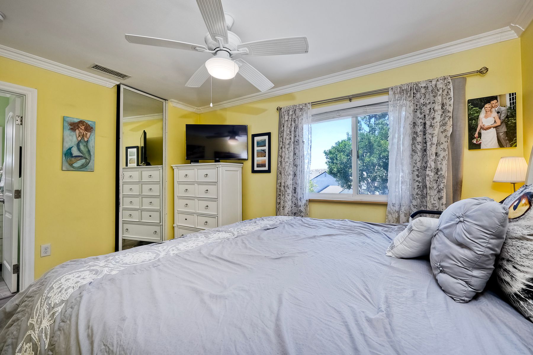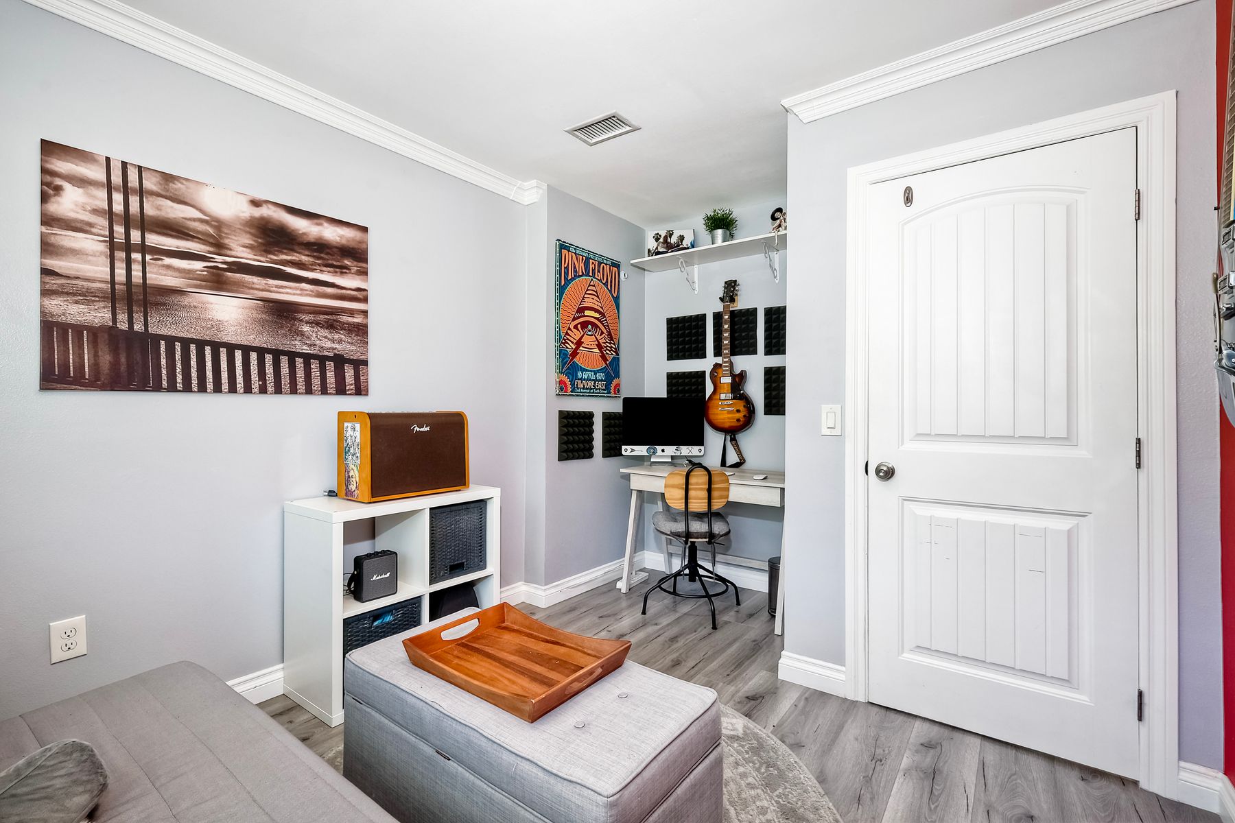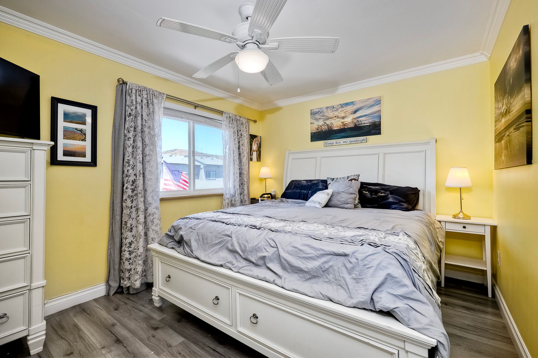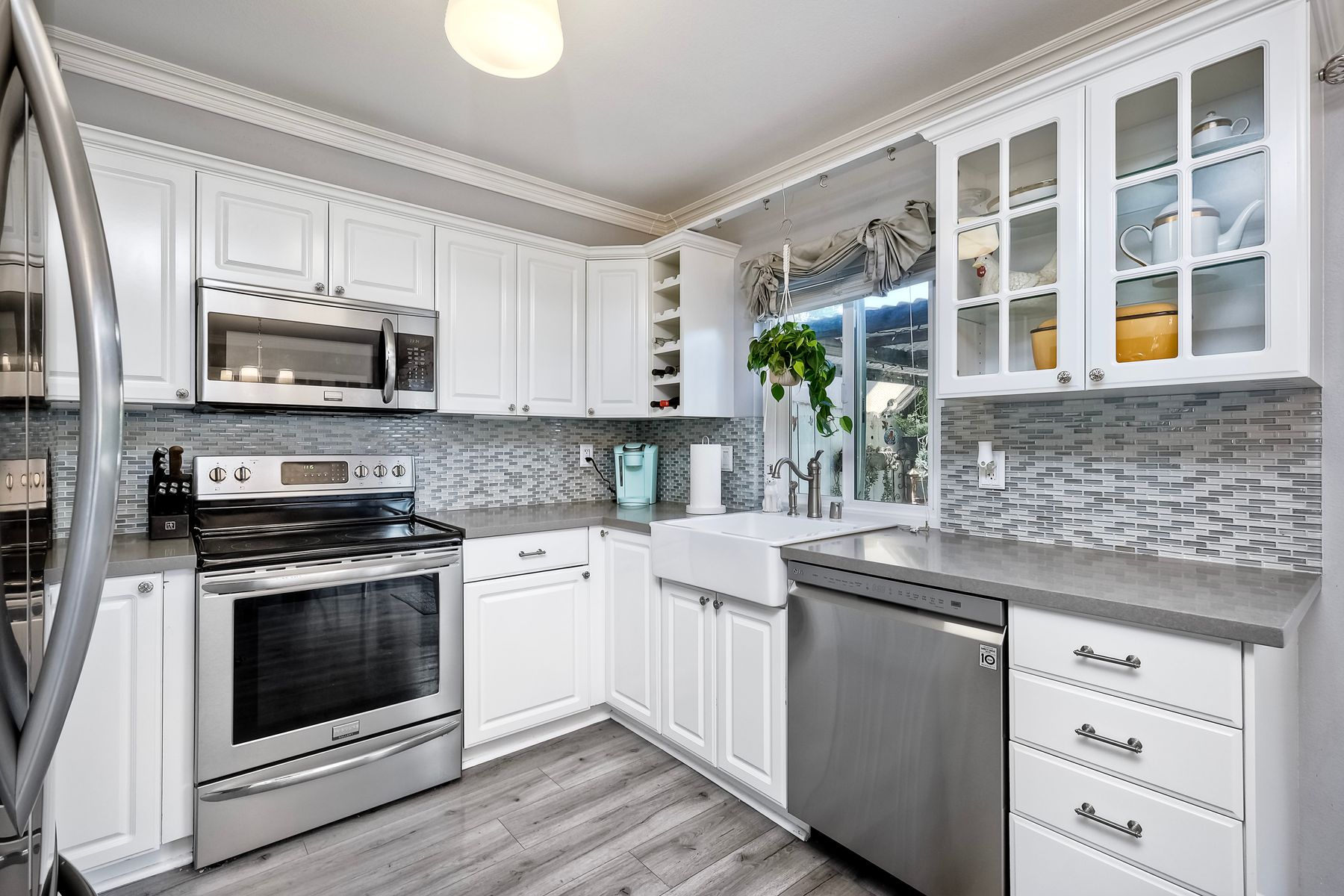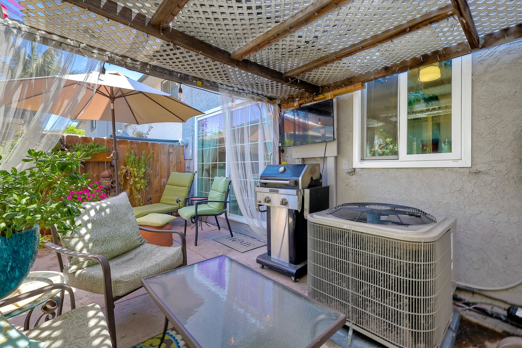 Beautifully updated - new wood floors, crown molding, paint, lights, counter tops, kitchen cabinets, stainless steel appliances, windows, paneling, ceiling fans, A/C, custom cabinets in dining room and glass backsplash, new vanities and lighting in bathrooms, Enjoy the beautiful patio and the detached one car garage. All bedrooms upstairs. Front door faces EAST. HOA amenities include pool, spa, and playground.