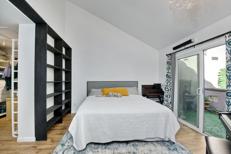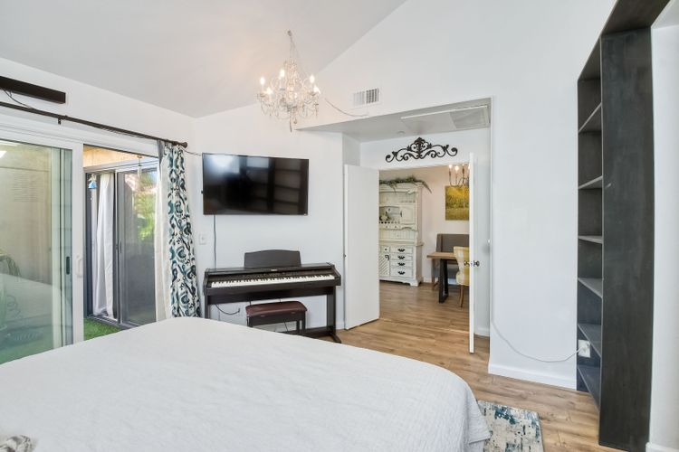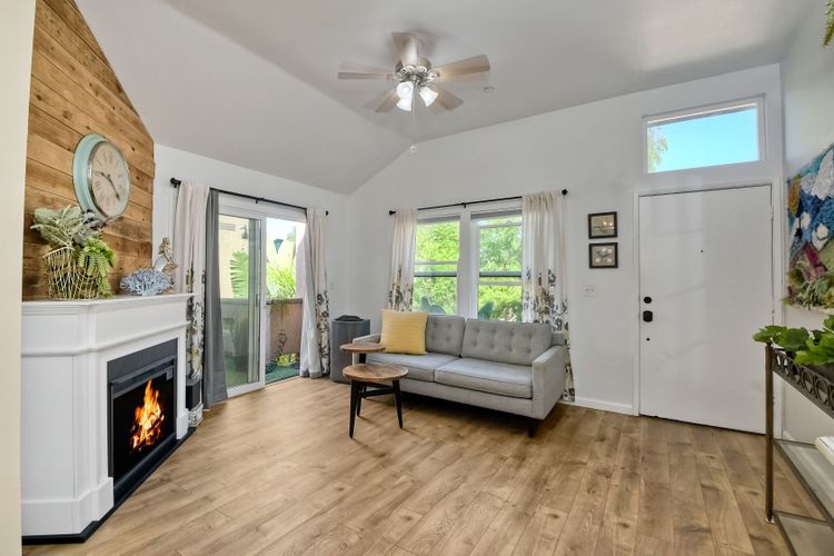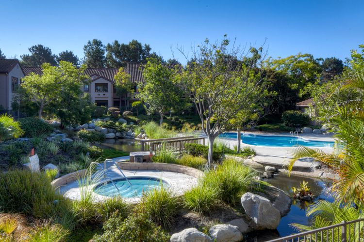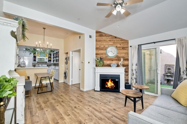 Model Perfect! This is the turn key condo you've been waiting for! Fantastic location close to 1-car garage & parking, relaxing waterfall stream in front of unit, upstairs unit w/ vaulted ceilings, private balcony, vinyl sliders & windows, laminate wood floors throughout create a spacious feel, remodeled bathroom, full-size inside front loading washer/dryer, & fridge included, & designer touches throughout! HOA has 2 pools & spas, pays for trash, & has RV pkg when available. VA approved!