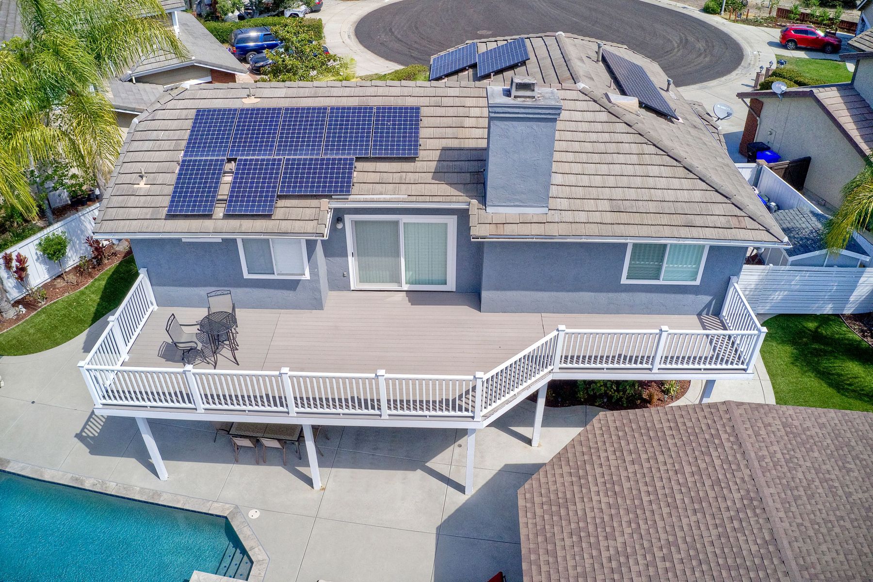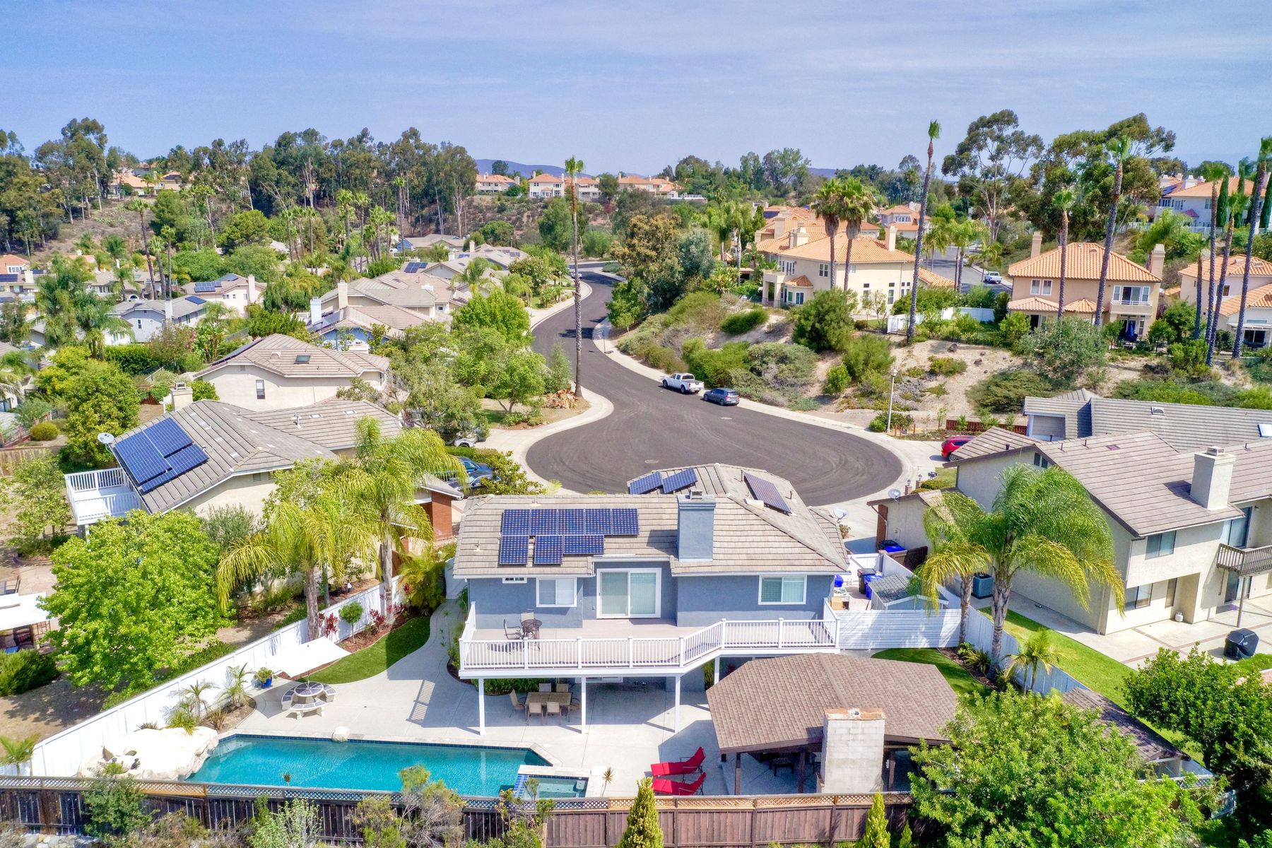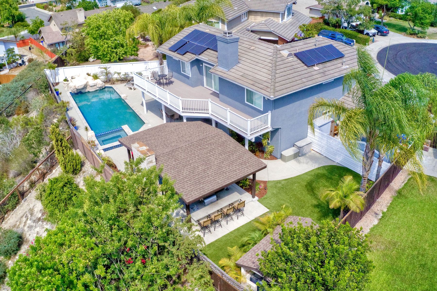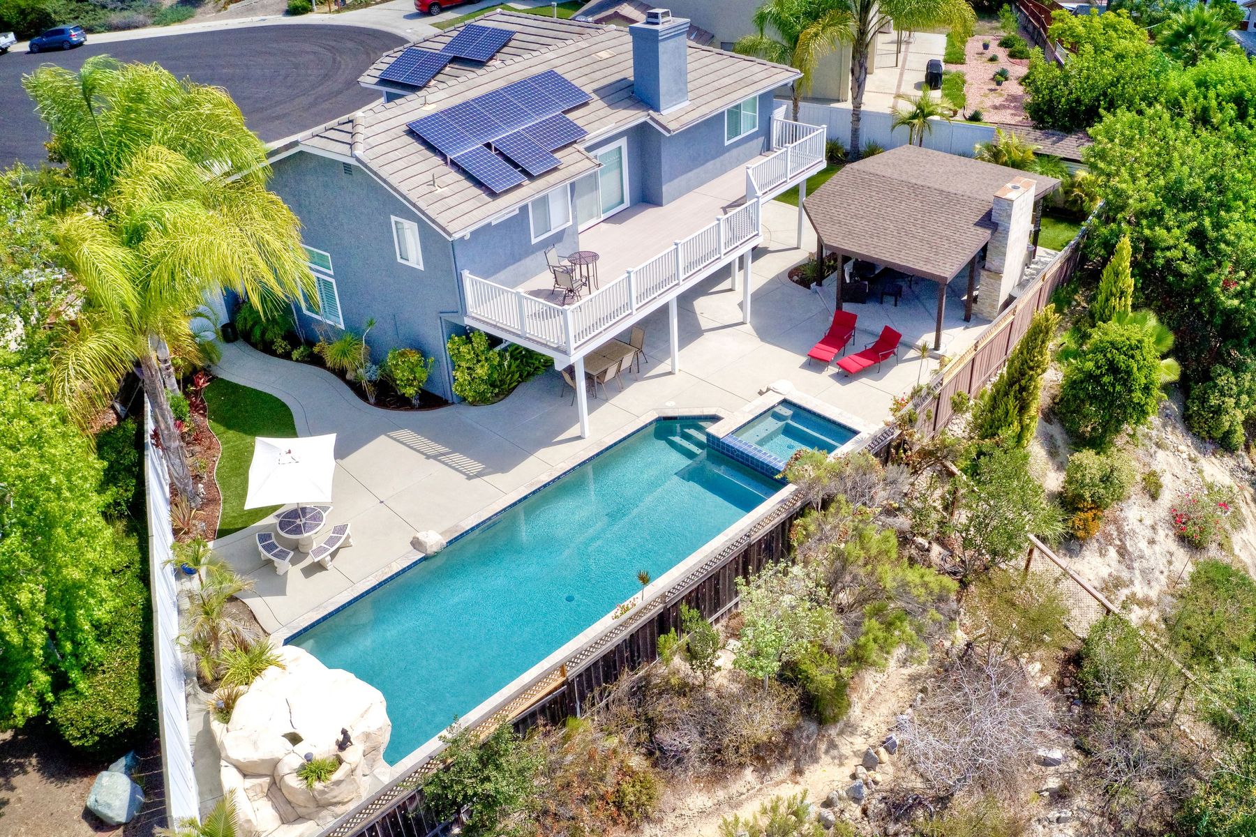 Scripps Ranch Resort Style Living! Prime location at the end of a desirable cul-de-sac within walking distance to Lake Miramar. This upgraded home features vaulted ceilings, large windows, wood grain tile floors & custom built-ins. Rich maple cabinets, granite & SS appliances in the kitchen. Fully owned SOLAR! An Entertainer's Dream with a sparkling, pebble tech pool & spa, waterfall, sprawling patio, turf and lush landscaping. Enjoy year round outdoor life in the very large post & beam gazebo with fireplace, TV, bar & built-in BBQ. Close to top rated Scripps Ranch schools. Welcome Home to this Special Scripps Ranch property! Drive down the quiet cul-de-sac street with 11 houses on one side and greenbelt on the other. Amazing curb appeal with an oversized, stamped concrete driveway, front walkway and sitting area for enjoying family and neighbors out front. Grand entry with vaulted ceilings, plantation shutters and windows galore. The family room opens to the most amazing outdoor living space. Large post and beam gazebo with fireplace and kitchen, pebble tech pool/spa, waterfall and enough patio space to host large gatherings. Turf for family/pet playtime. The master opens to an impressive view deck, en-suite includes a soaking tub and dual walk-in closets. 1/2 mile walk to Lakeview Park where neighbors meet to watch the fabulous sunsets over Lake Miramar. Award winning schools. Scripps Ranch at it's Best!