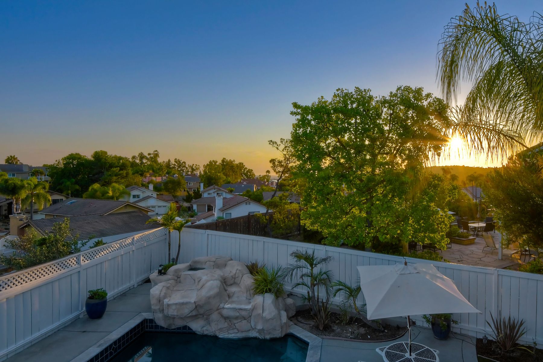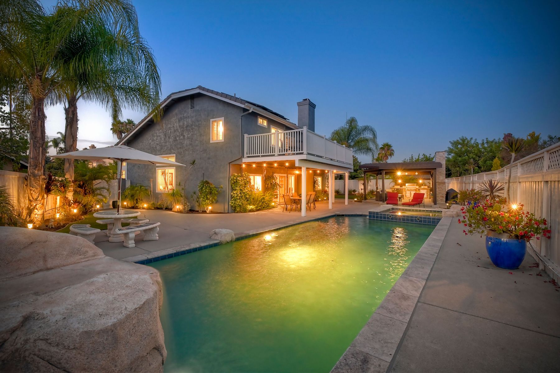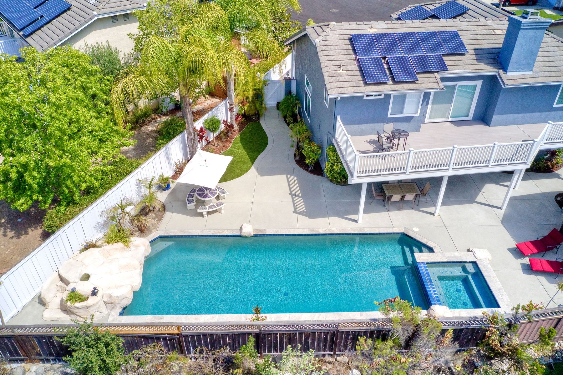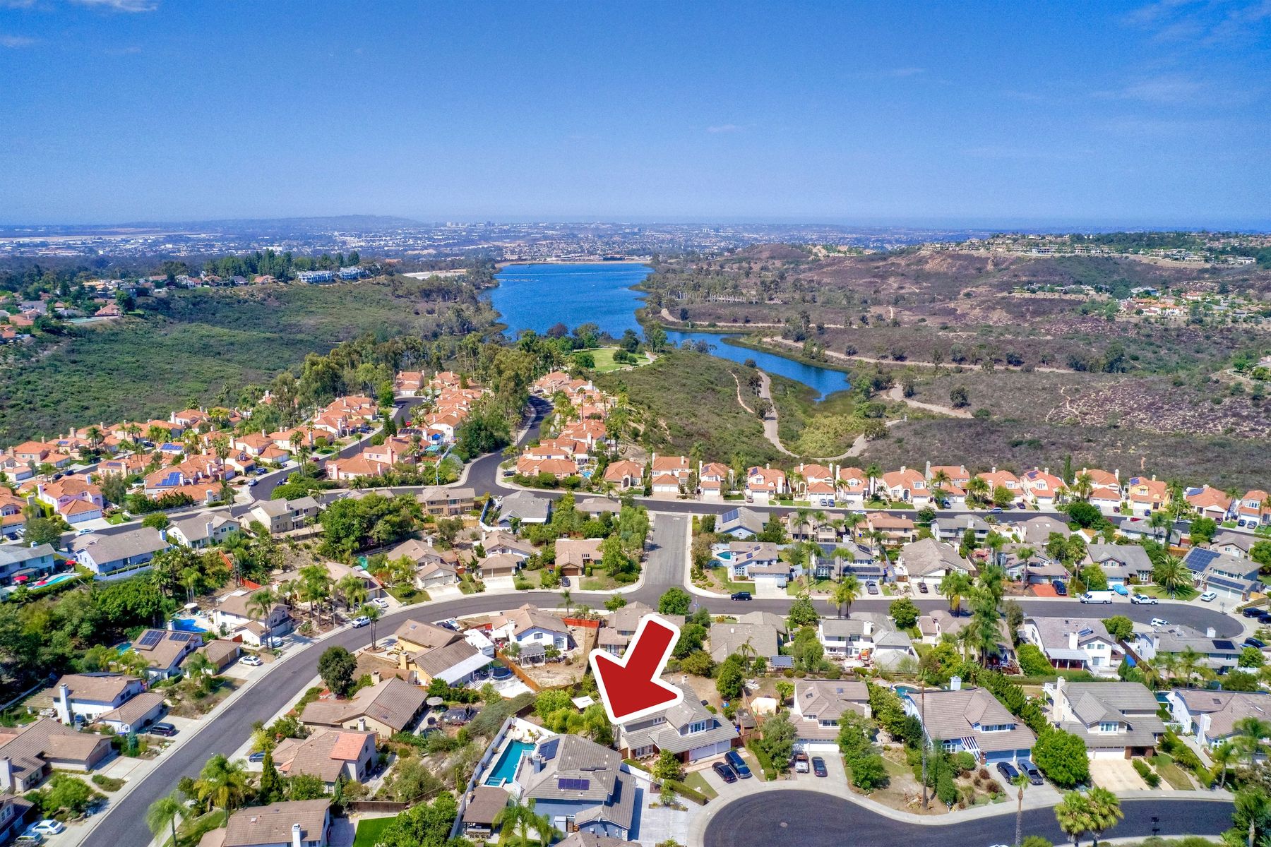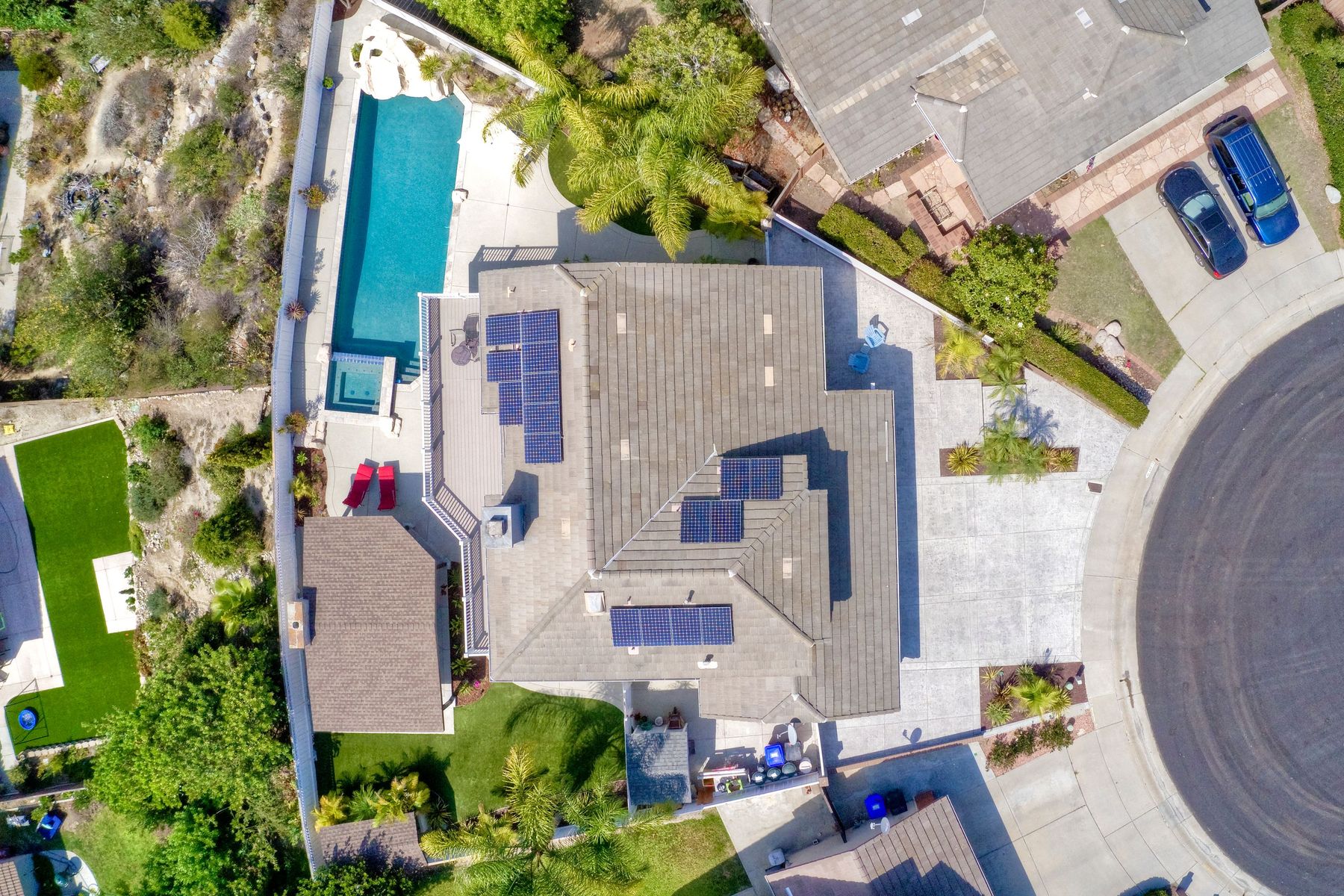 Scripps Ranch Resort Style Living! Prime location at the end of a desirable cul-de-sac within walking distance to Lake Miramar. This upgraded home features vaulted ceilings, large windows, wood grain tile floors & custom built-ins. Rich maple cabinets, granite & SS appliances in the kitchen. Fully owned SOLAR! An Entertainer's Dream with a sparkling, pebble tech pool & spa, waterfall, sprawling patio, turf and lush landscaping. Enjoy year round outdoor life in the very large post & beam gazebo with fireplace, TV, bar & built-in BBQ. Close to top rated Scripps Ranch schools. Welcome Home to this Special Scripps Ranch property! Drive down the quiet cul-de-sac street with 11 houses on one side and greenbelt on the other. Amazing curb appeal with an oversized, stamped concrete driveway, front walkway and sitting area for enjoying family and neighbors out front. Grand entry with vaulted ceilings, plantation shutters and windows galore. The family room opens to the most amazing outdoor living space. Large post and beam gazebo with fireplace and kitchen, pebble tech pool/spa, waterfall and enough patio space to host large gatherings. Turf for family/pet playtime. The master opens to an impressive view deck, en-suite includes a soaking tub and dual walk-in closets. 1/2 mile walk to Lakeview Park where neighbors meet to watch the fabulous sunsets over Lake Miramar. Award winning schools. Scripps Ranch at it's Best!