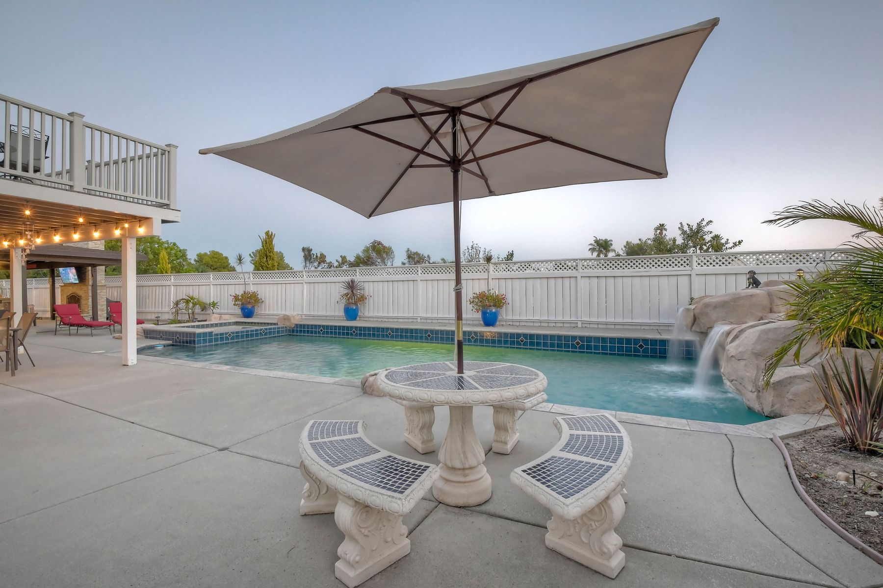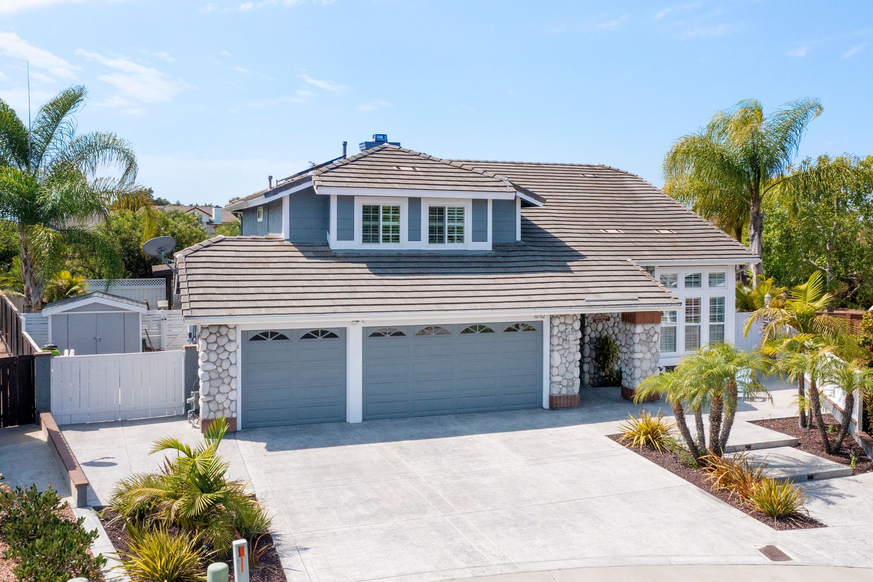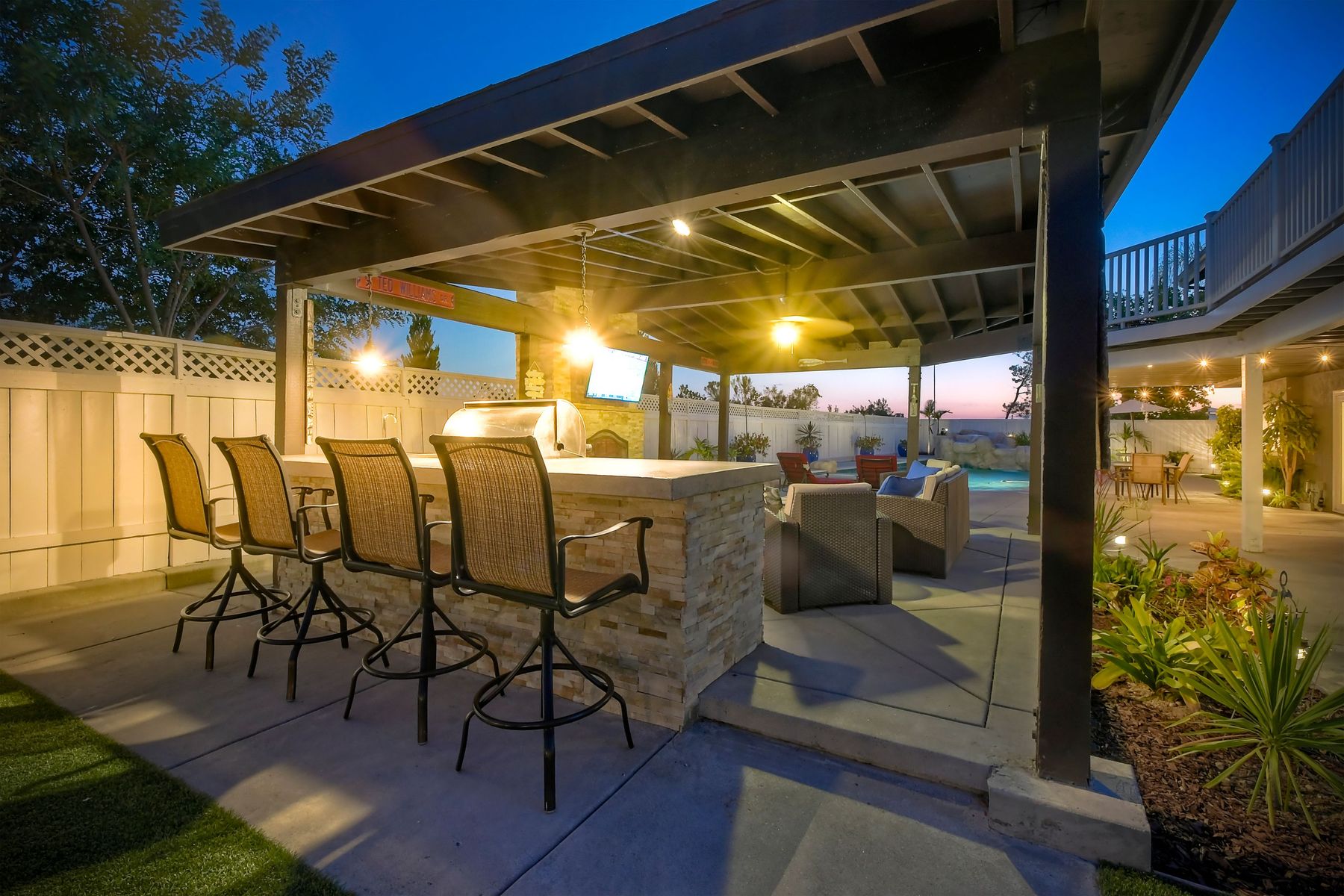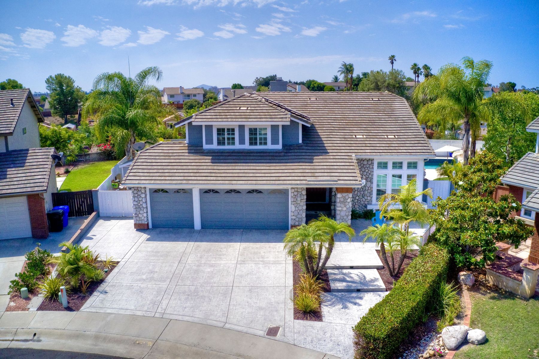 Scripps Ranch Resort Style Living! Prime location at the end of a desirable cul-de-sac within walking distance to Lake Miramar. This upgraded home features vaulted ceilings, large windows, wood grain tile floors & custom built-ins. Rich maple cabinets, granite & SS appliances in the kitchen. Fully owned SOLAR! An Entertainer's Dream with a sparkling, pebble tech pool & spa, waterfall, sprawling patio, turf and lush landscaping. Enjoy year round outdoor life in the very large post & beam gazebo with fireplace, TV, bar & built-in BBQ. Close to top rated Scripps Ranch schools. Welcome Home to this Special Scripps Ranch property! Drive down the quiet cul-de-sac street with 11 houses on one side and greenbelt on the other. Amazing curb appeal with an oversized, stamped concrete driveway, front walkway and sitting area for enjoying family and neighbors out front. Grand entry with vaulted ceilings, plantation shutters and windows galore. The family room opens to the most amazing outdoor living space. Large post and beam gazebo with fireplace and kitchen, pebble tech pool/spa, waterfall and enough patio space to host large gatherings. Turf for family/pet playtime. The master opens to an impressive view deck, en-suite includes a soaking tub and dual walk-in closets. 1/2 mile walk to Lakeview Park where neighbors meet to watch the fabulous sunsets over Lake Miramar. Award winning schools. Scripps Ranch at it's Best!