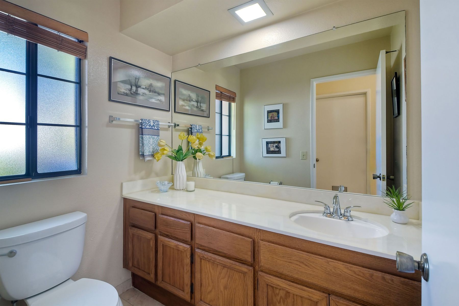 Wonderful 3 bedroom, 2.5 bath Twinhome in the Northfield community of Rancho Bernardo. The curb appeal welcomes you with mature landscaping, grass and a large shade tree. Entering the foyer of the split level design, your eyes are drawn to the open floorplan below with vaulted ceilings, multiple windows and the wonderful flow of the living, dining, kitchen and family room. The living room is a gathering place with high ceilings, sliding glass door access to the back patio and carpet extending into the dining room. See Supplement... The upgraded kitchen has granite countertops, stainless steel appliances, and a peninsula creating a workspace that is both functional and beautiful. The cozy family room shares tile flooring with the kitchen and has a warm brick fireplace surrounded by windows. A sliding glass door to the covered back patio makes indoor/outdoor living easy. Up the stairs, through double doors you enter the master suite. The spacious bedroom has vaulted ceilings, a substantial closet and expansive window. The bathroom has a large walk in shower and double vanity, completing this relaxing retreat. Two additional bedrooms have easy access to a hall bath with a shower/tub combination. The fully fenced backyard has a covered patio, large enough for both a dining and a conversation area. The yard is a wonderful place to entertain or just relax with a lovely lawn surrounded by mature landscaping and trees. The home backs up to a green space providing privacy and a wonderful walking trail. Located in the award winning Poway Unified School District and including access to the Westwood Club with it’s amazing amenities!