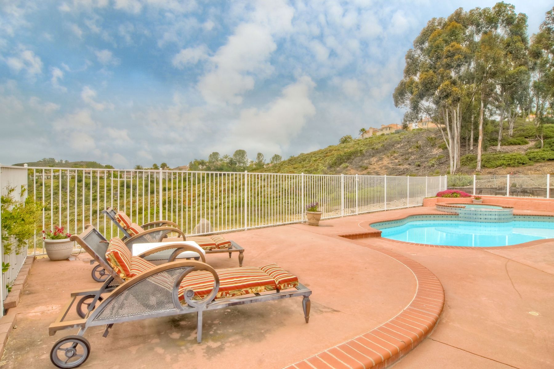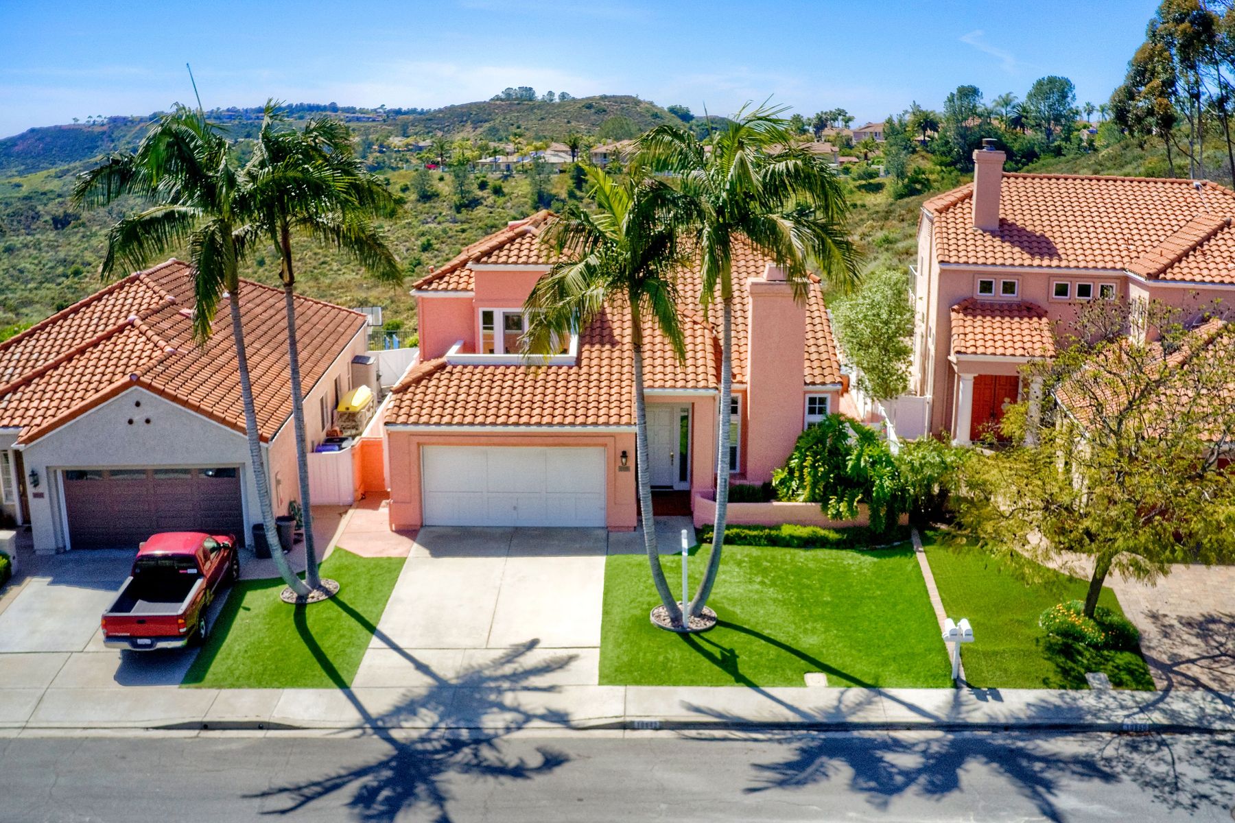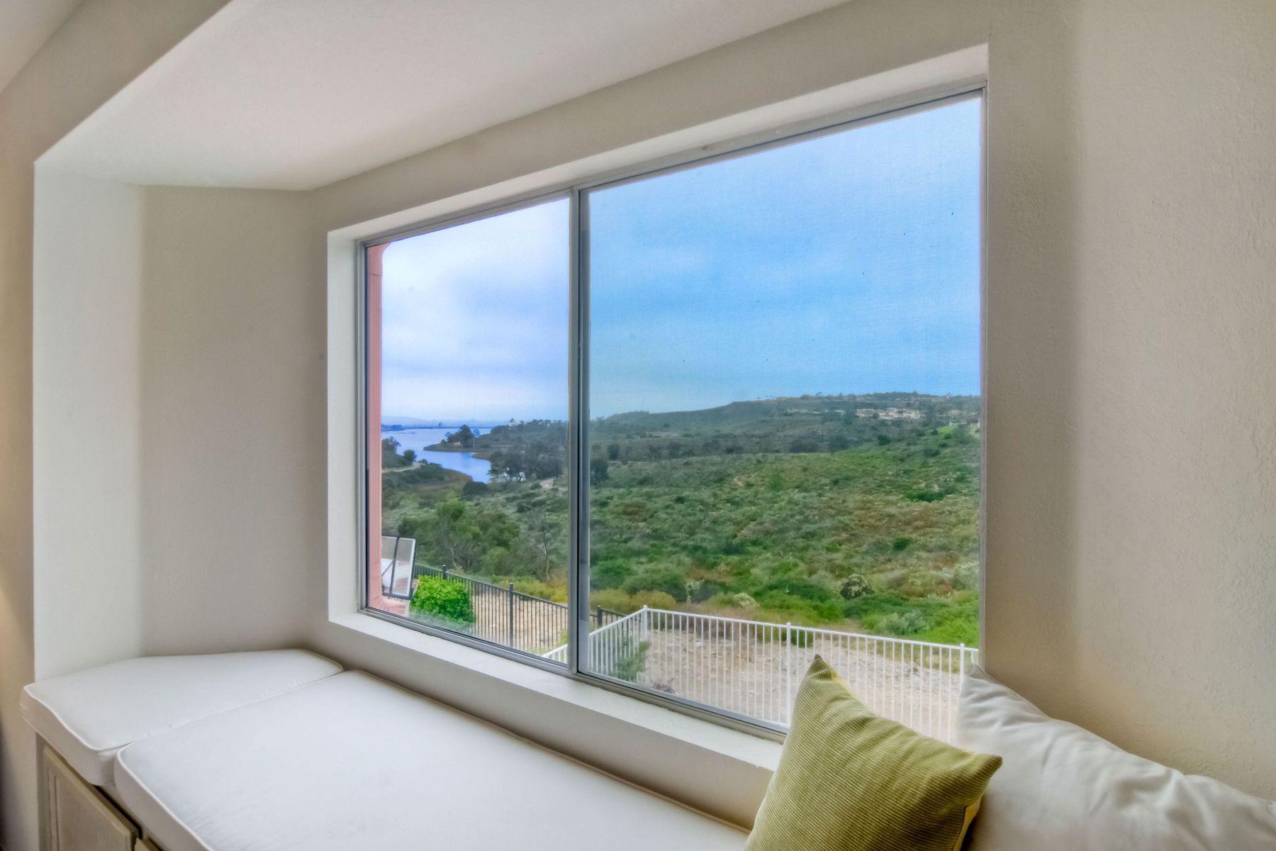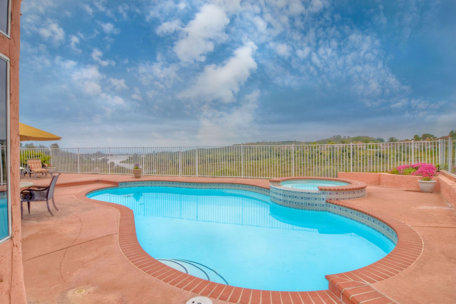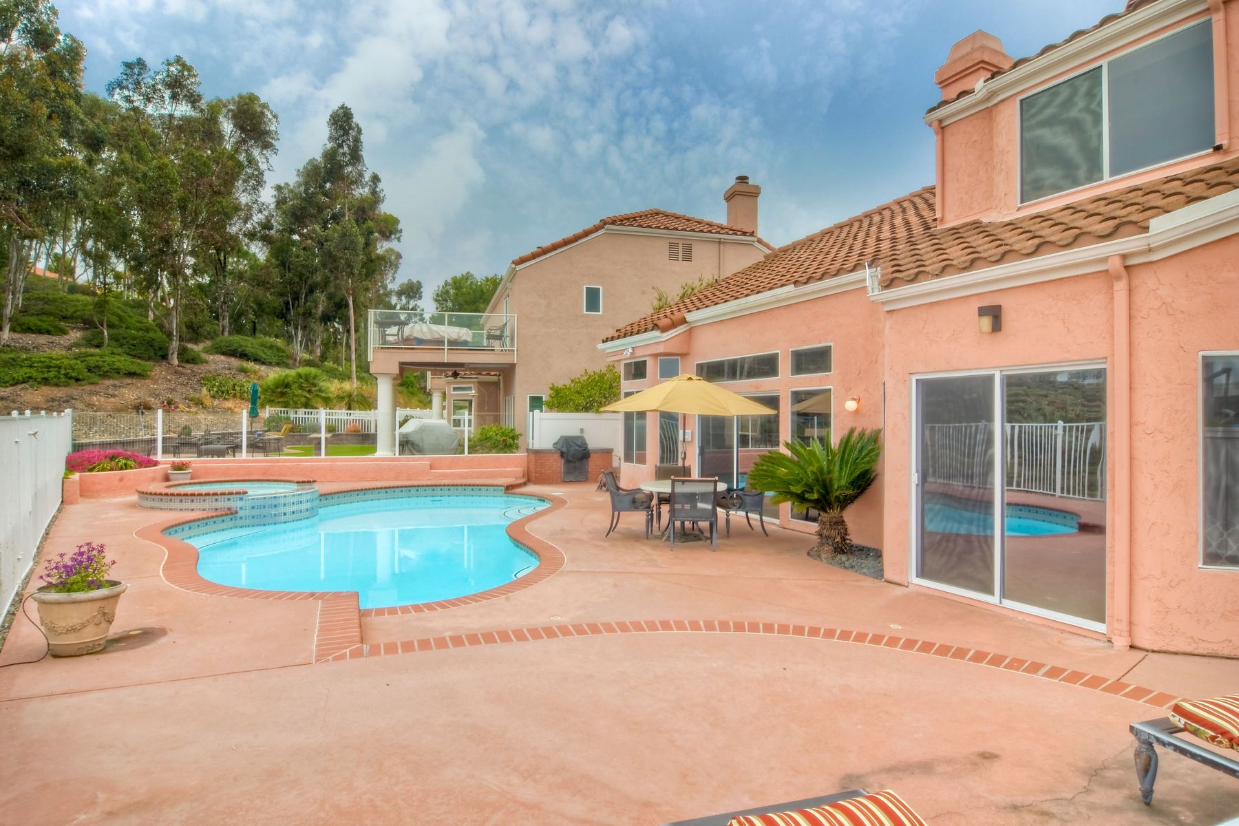 Forever views of Lake Miramar, sunsets, and city lights. First floor master bedroom allows single level living. Curved staircase leads to three additional generous size bedrooms upstairs. Front bedroom has french doors to the balcony. Kitchen features island and breakfast nook with window seat. Refreshed with new flooring, carpet, and paint. Sliding doors open from the family room and master bedroom to the patio with sparkling pool and unobstructed canyon and lake views. Great entertaining home! No HOA.