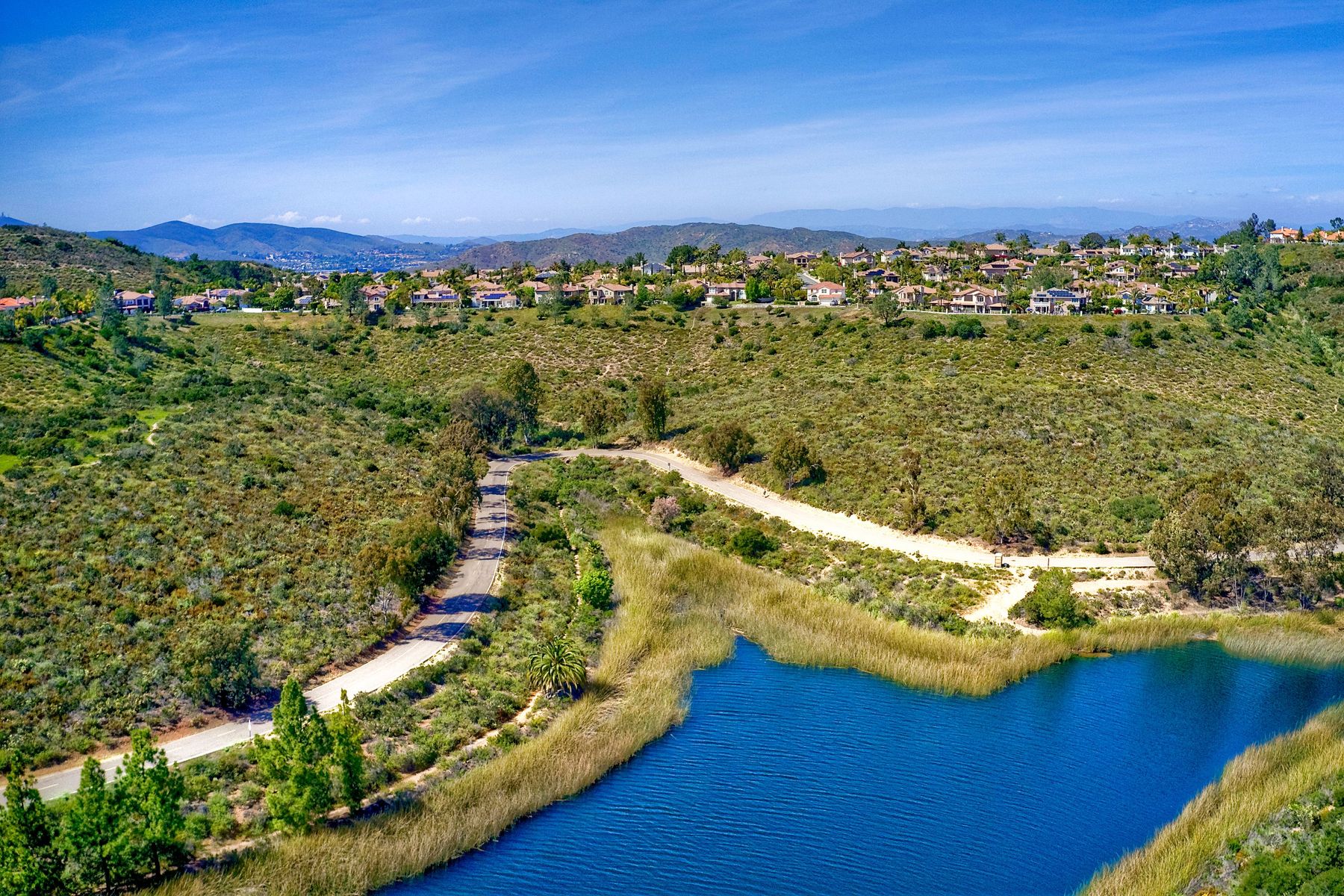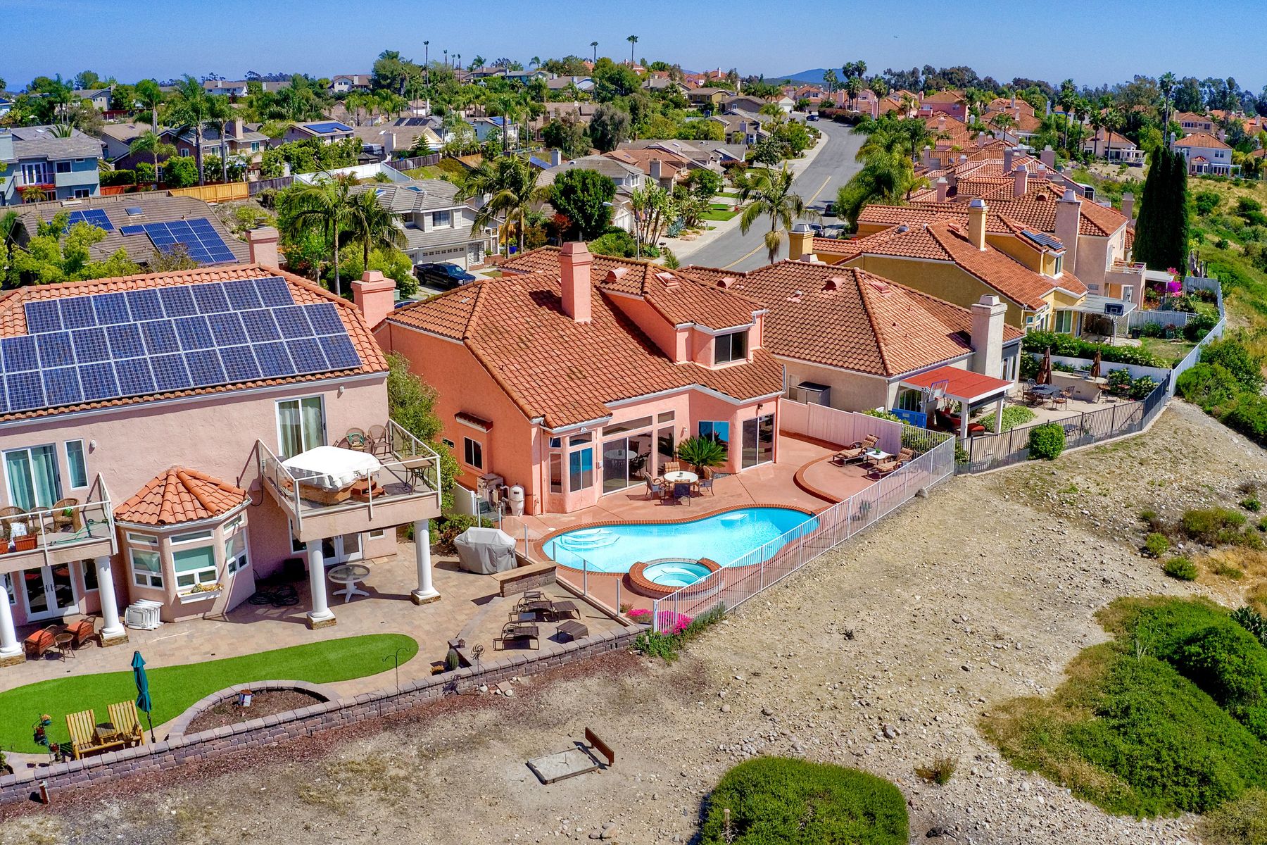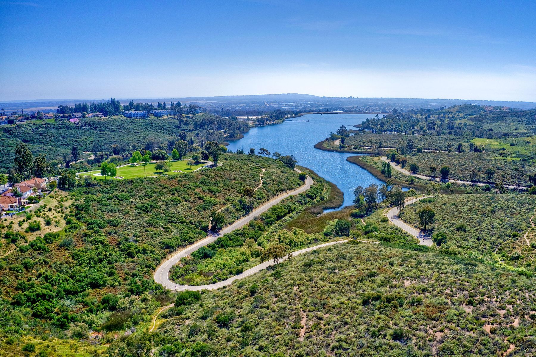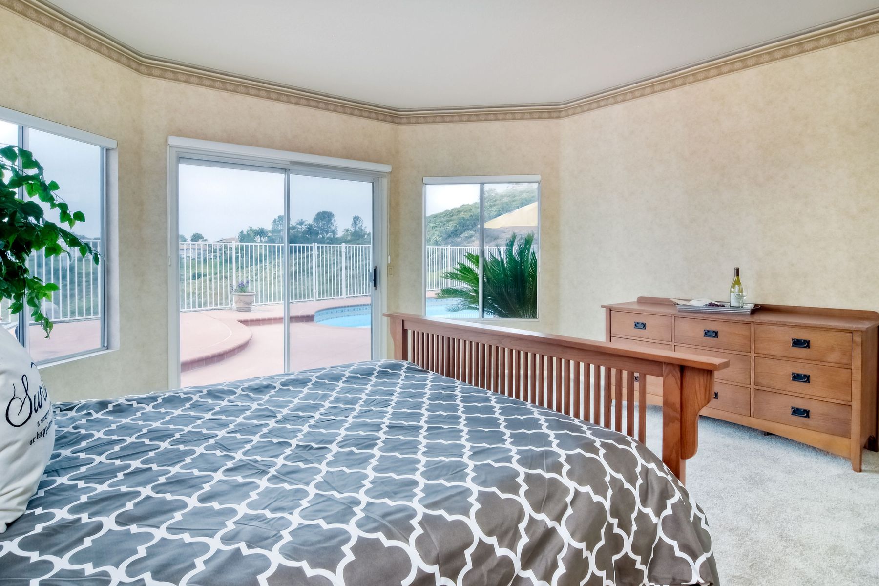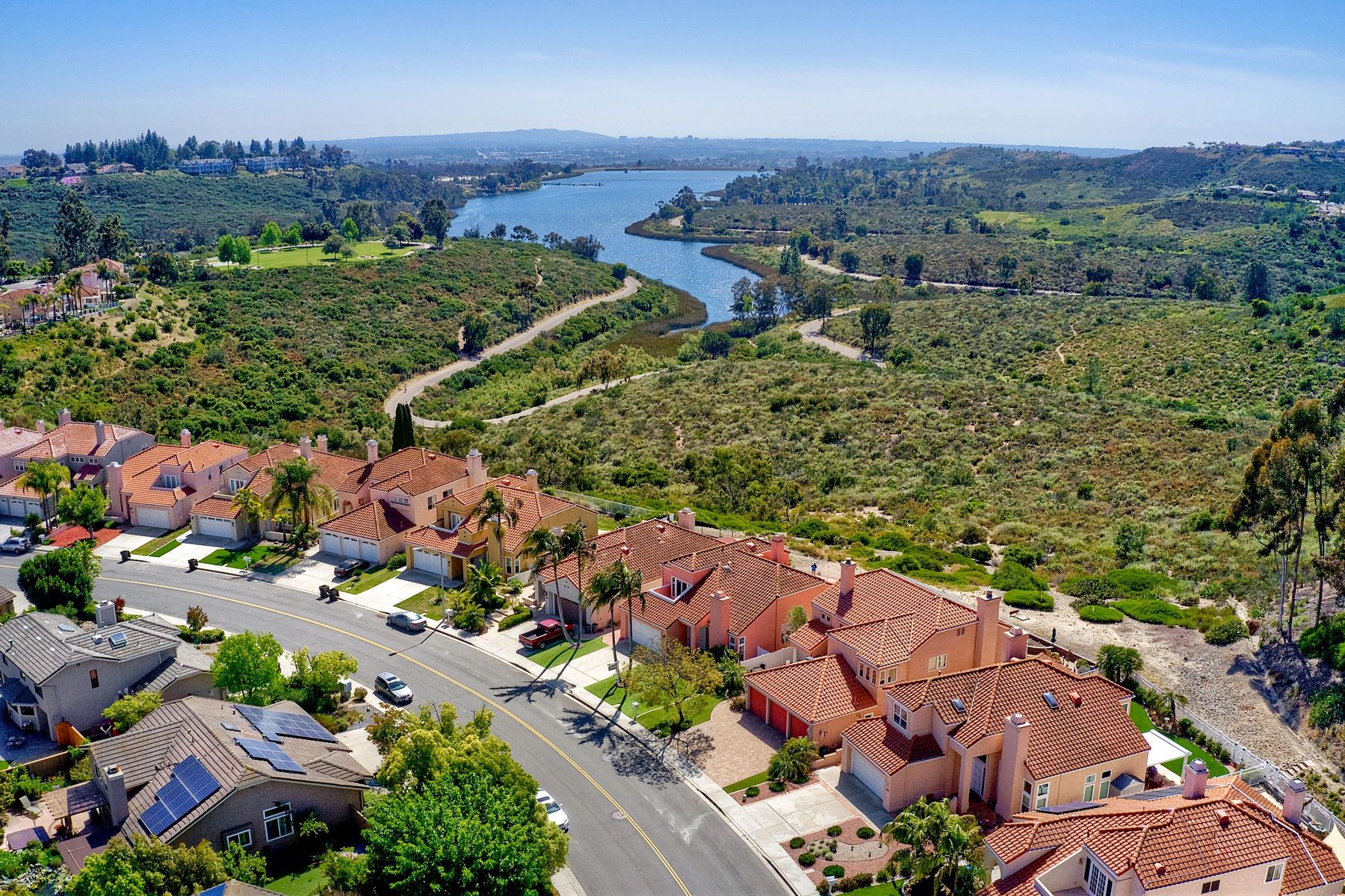Forever views of Lake Miramar, sunsets, and city lights. First floor master bedroom allows single level living. Curved staircase leads to three additional generous size bedrooms upstairs. Front bedroom has french doors to the balcony. Kitchen features island and breakfast nook with window seat. Refreshed with new flooring, carpet, and paint. Sliding doors open from the family room and master bedroom to the patio with sparkling pool and unobstructed canyon and lake views. Great entertaining home! No HOA.