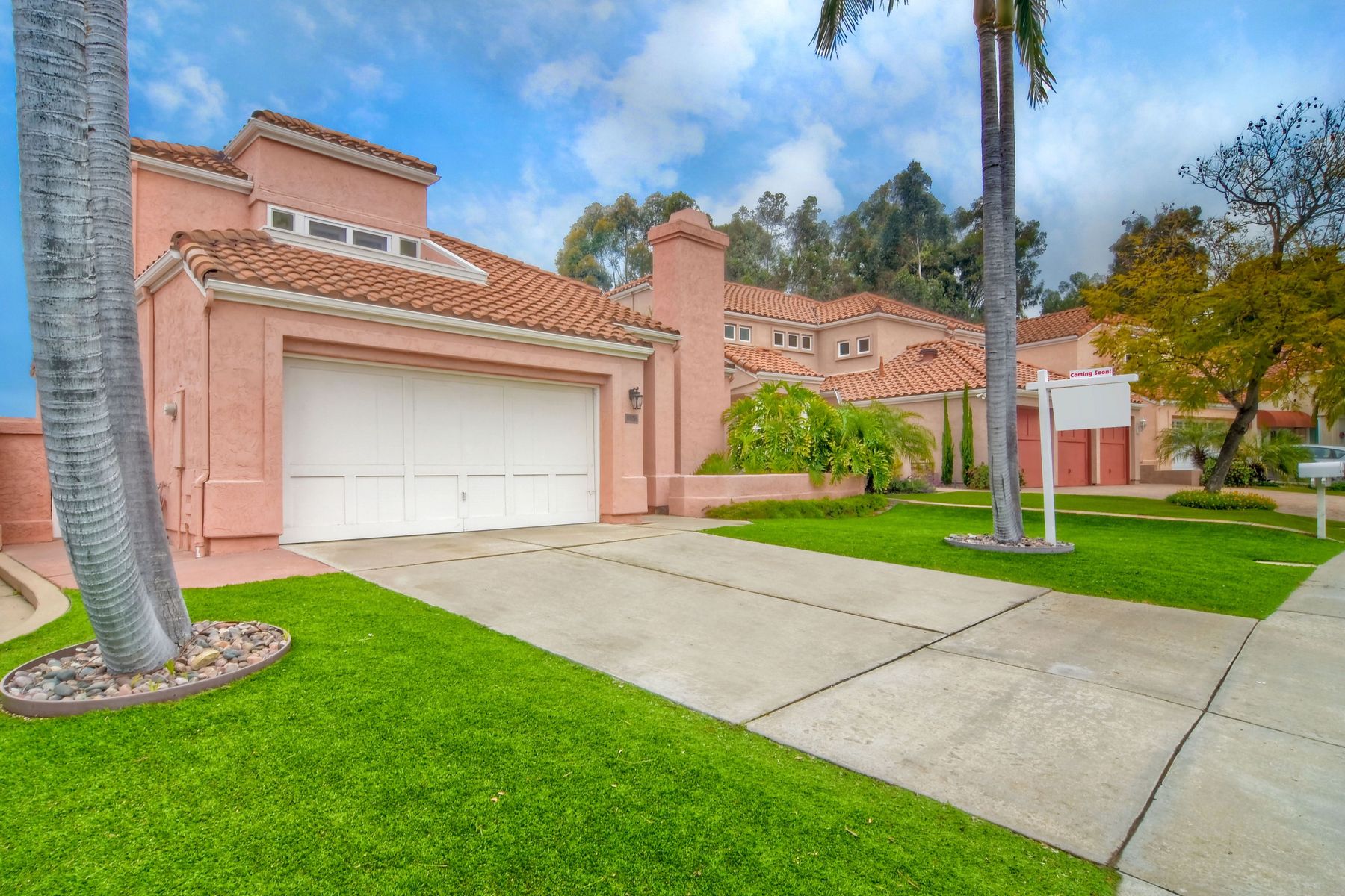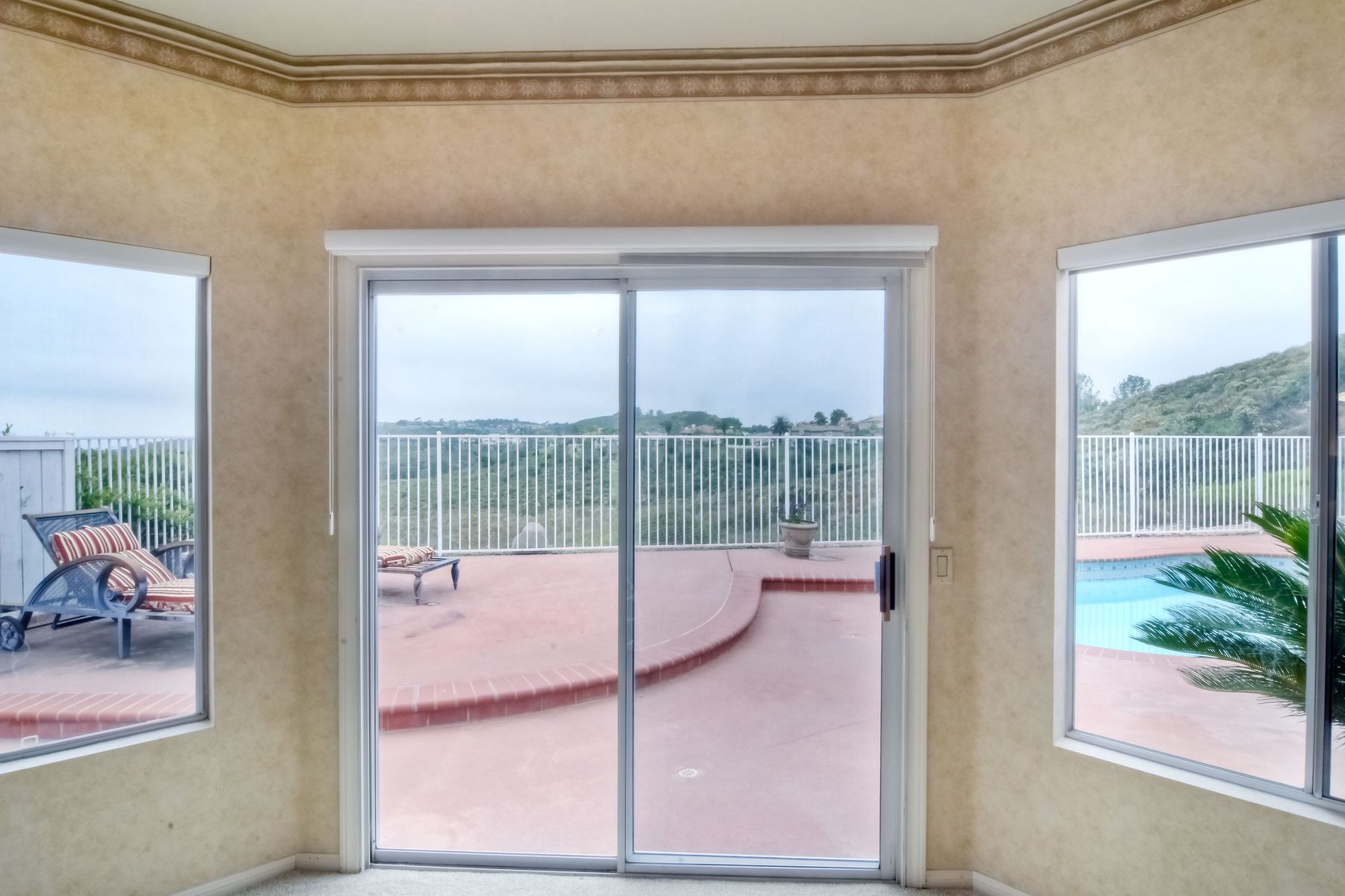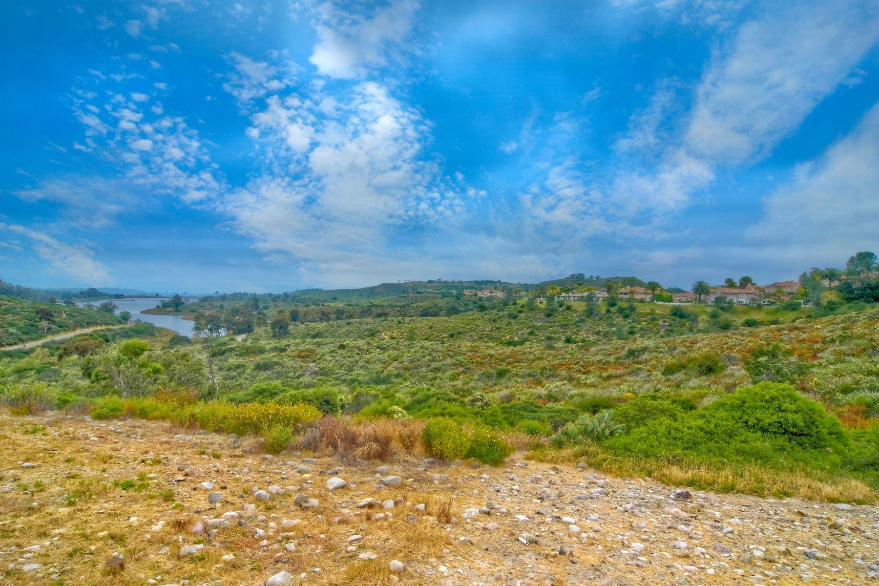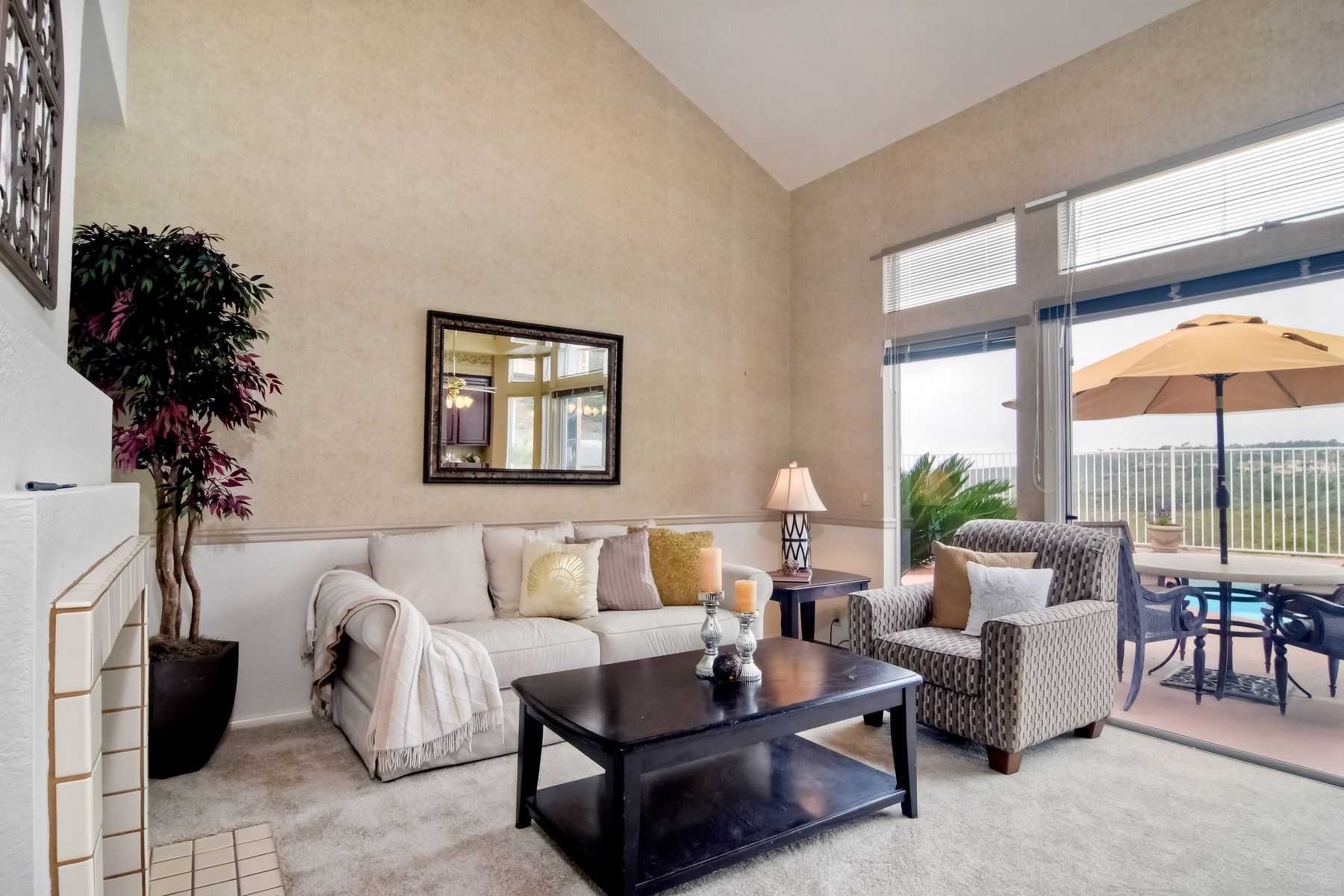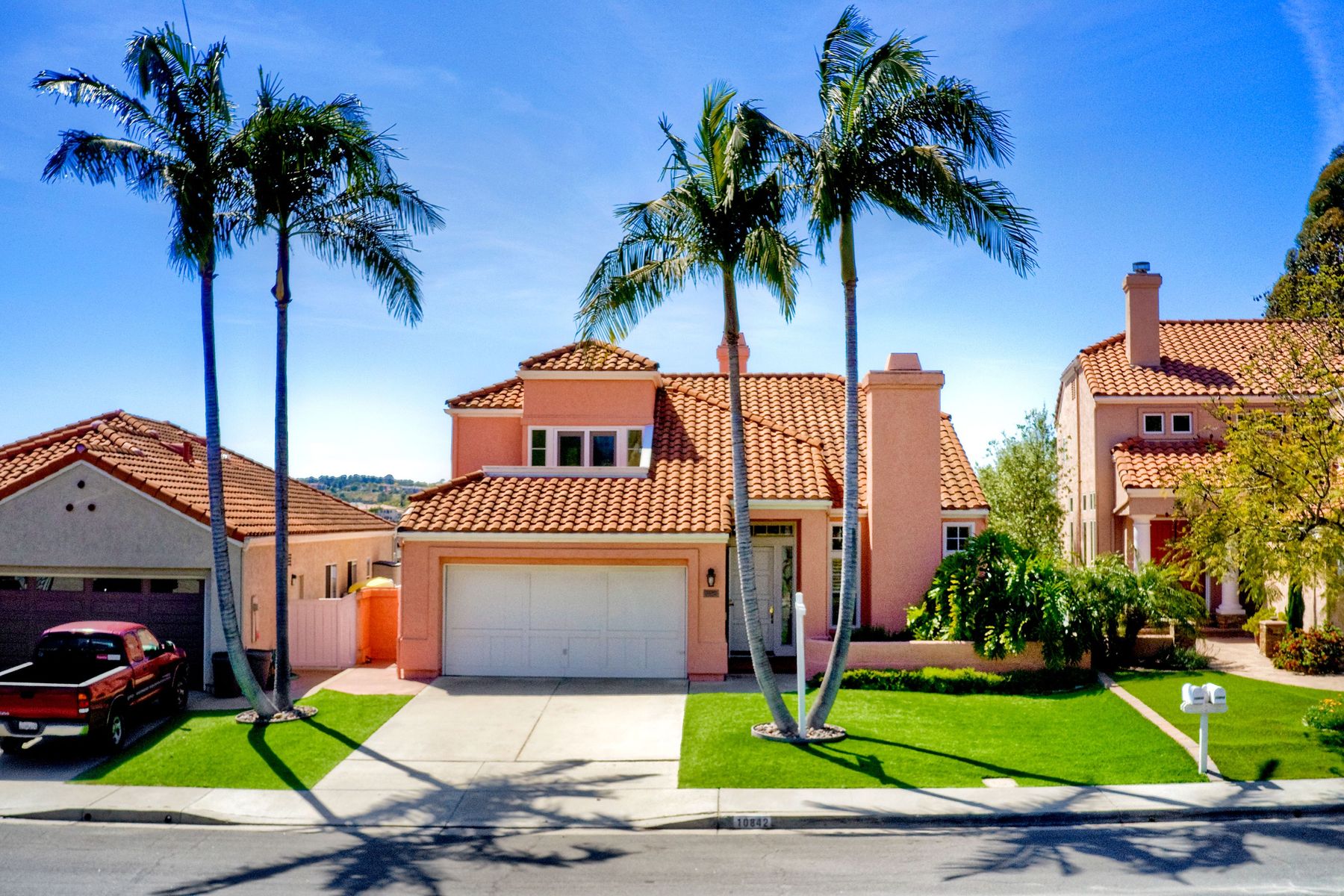 Forever views of Lake Miramar, sunsets, and city lights. First floor master bedroom allows single level living. Curved staircase leads to three additional generous size bedrooms upstairs. Front bedroom has french doors to the balcony. Kitchen features island and breakfast nook with window seat. Refreshed with new flooring, carpet, and paint. Sliding doors open from the family room and master bedroom to the patio with sparkling pool and unobstructed canyon and lake views. Great entertaining home! No HOA.