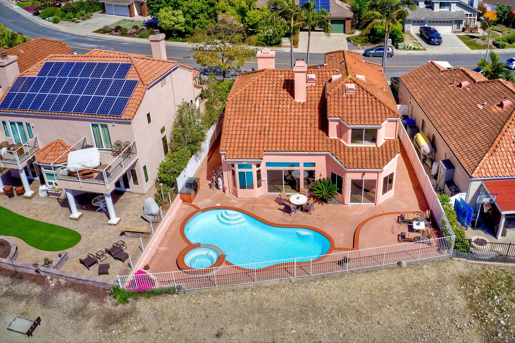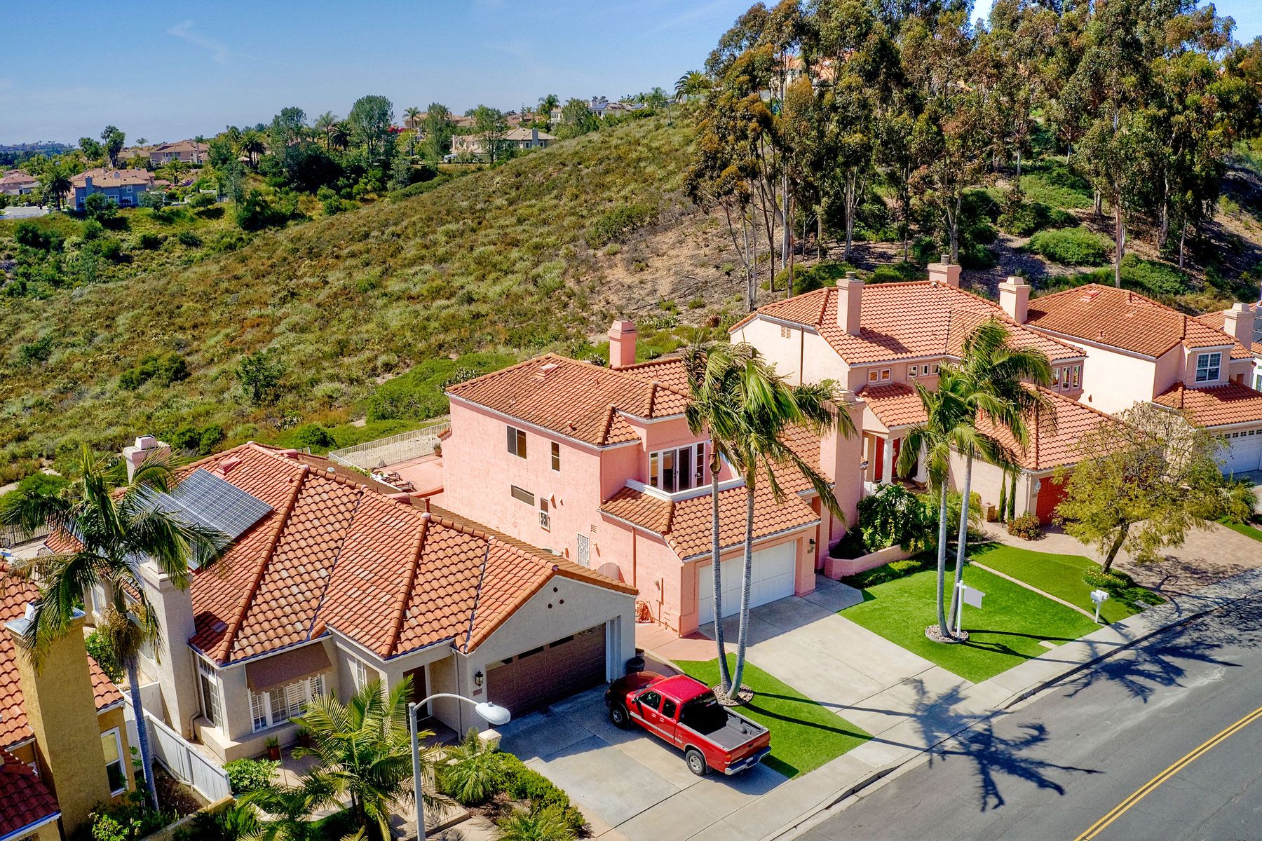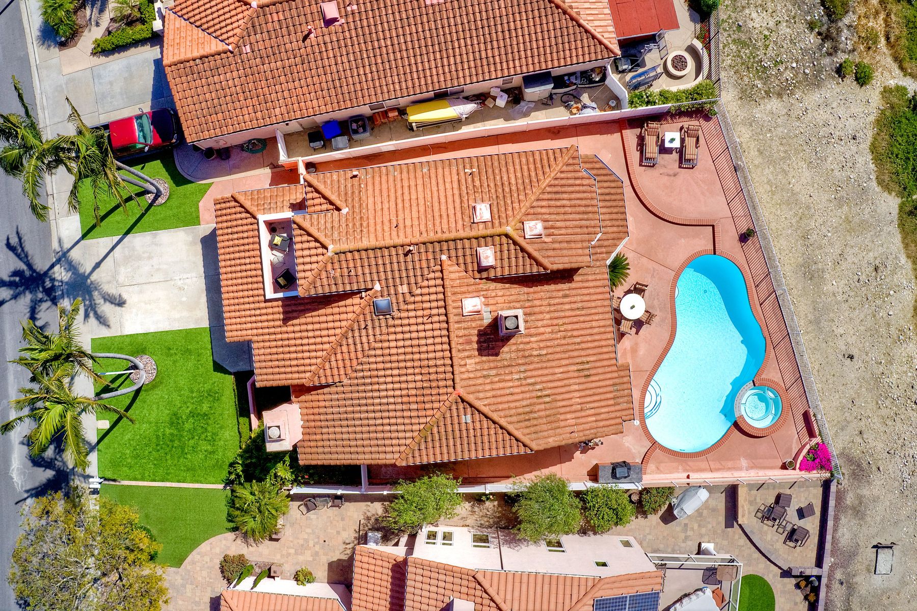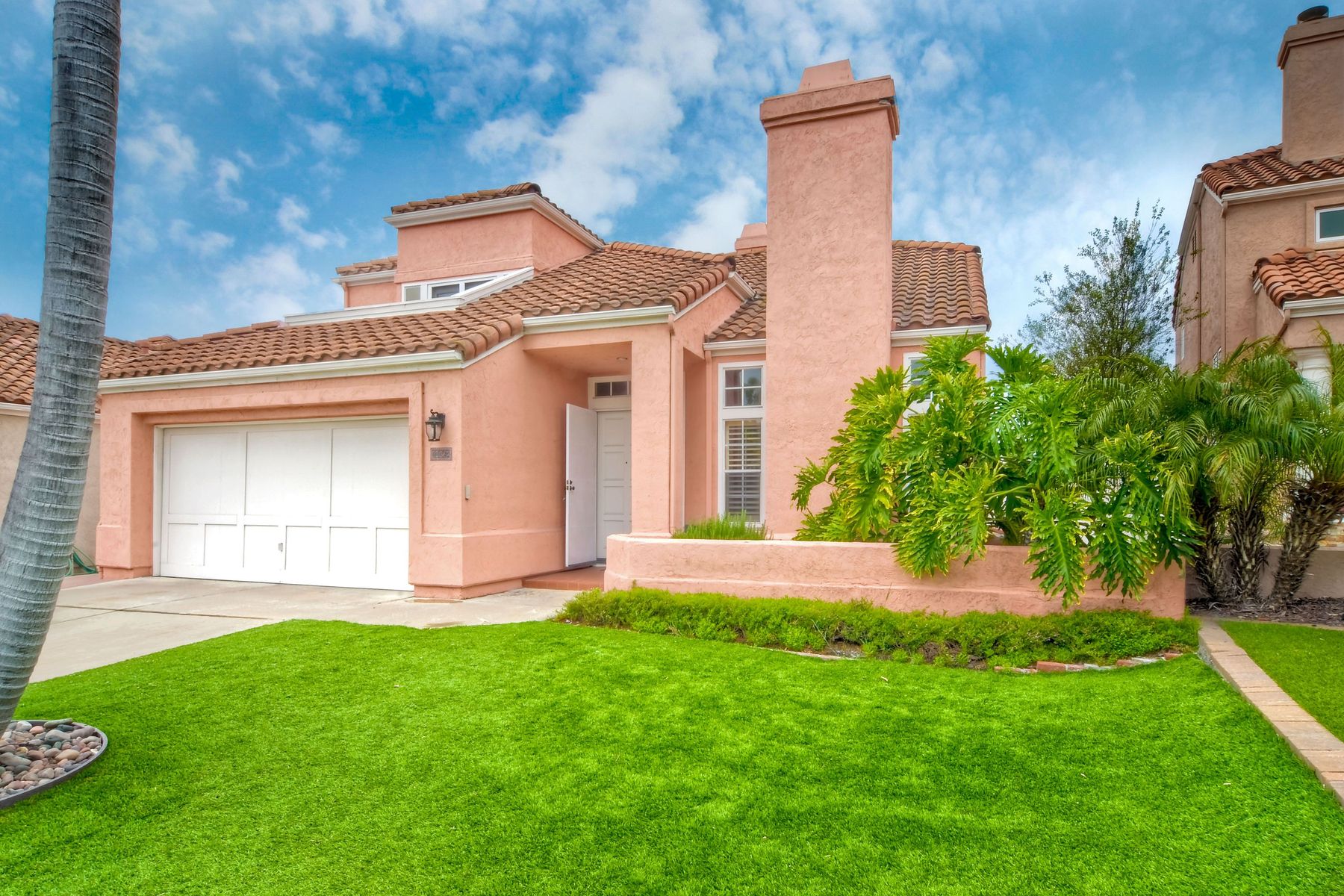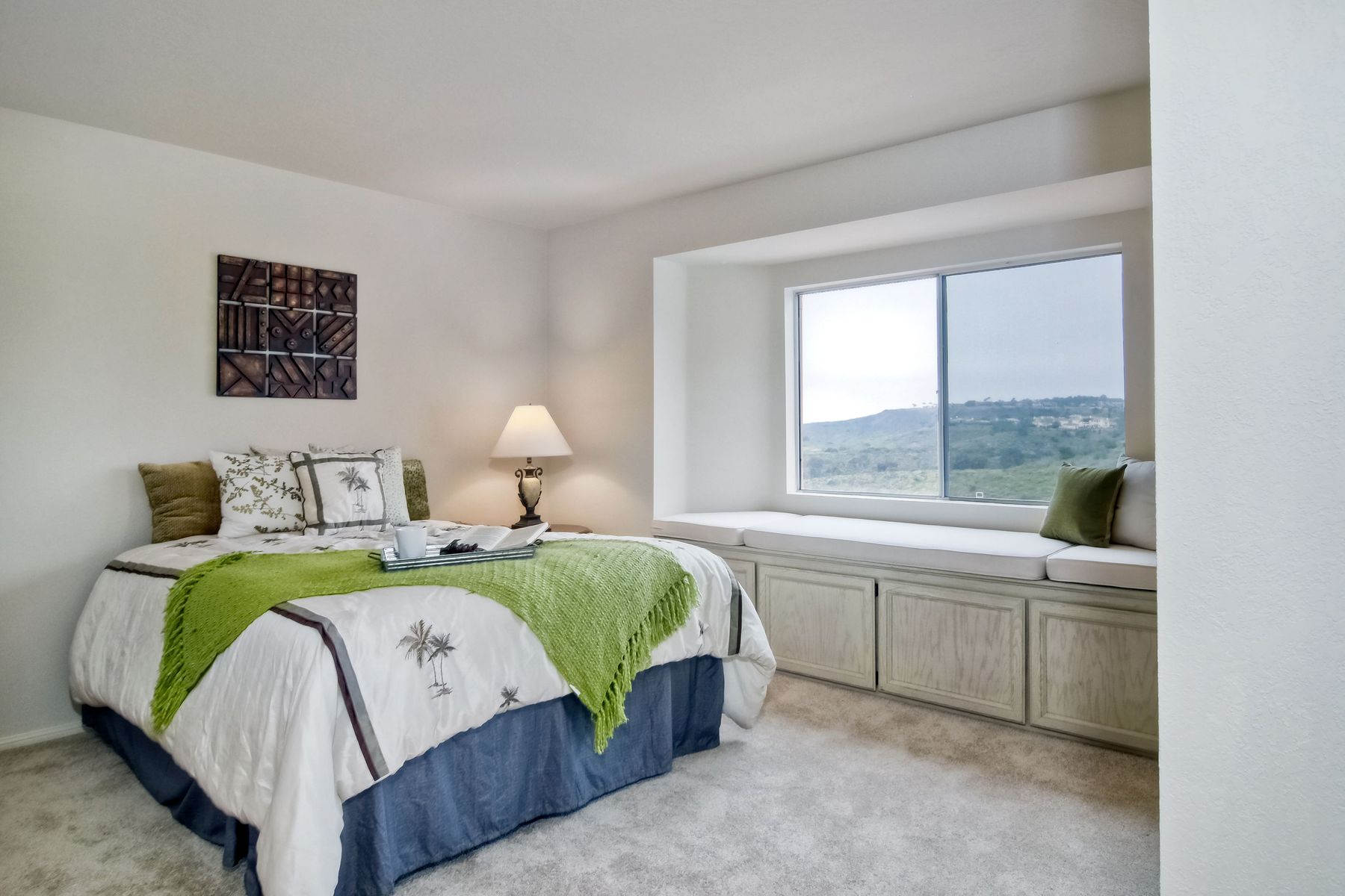 Forever views of Lake Miramar, sunsets, and city lights. First floor master bedroom allows single level living. Curved staircase leads to three additional generous size bedrooms upstairs. Front bedroom has french doors to the balcony. Kitchen features island and breakfast nook with window seat. Refreshed with new flooring, carpet, and paint. Sliding doors open from the family room and master bedroom to the patio with sparkling pool and unobstructed canyon and lake views. Great entertaining home! No HOA.