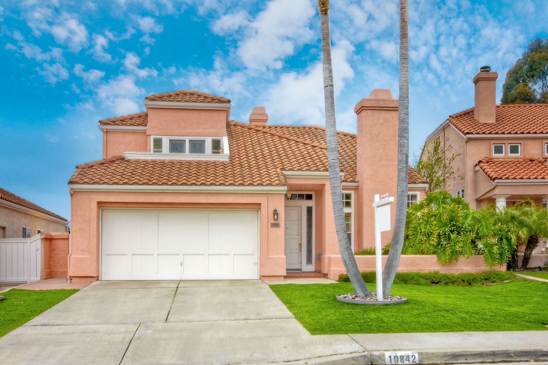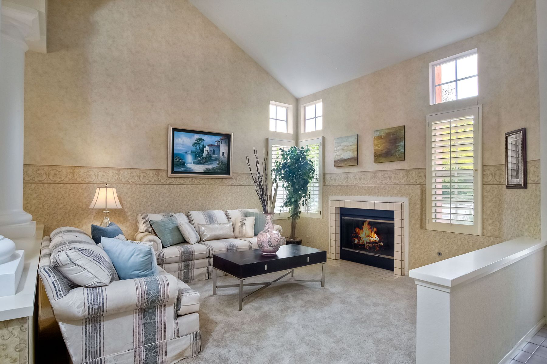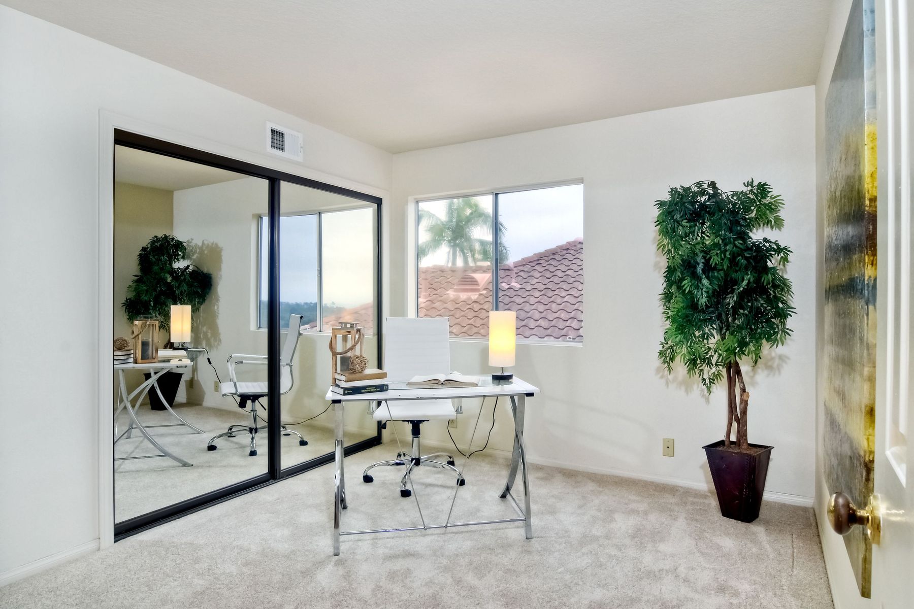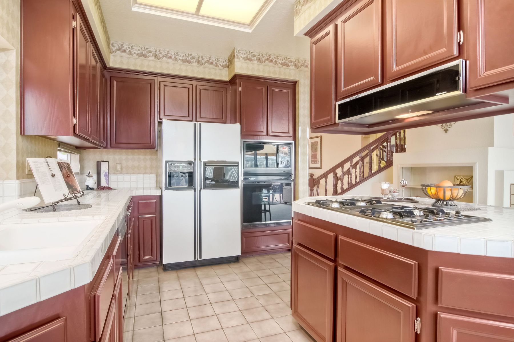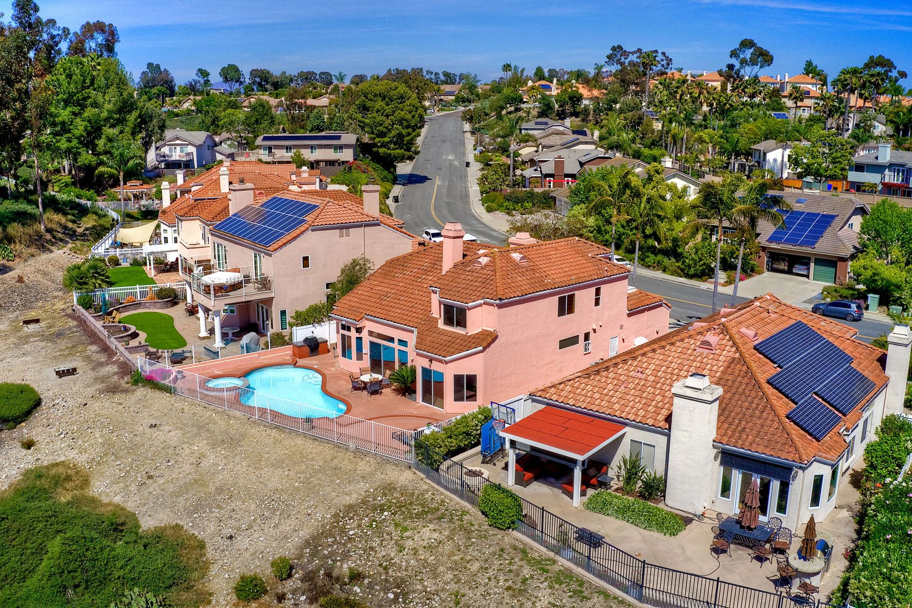 Forever views of Lake Miramar, sunsets, and city lights. First floor master bedroom allows single level living. Curved staircase leads to three additional generous size bedrooms upstairs. Front bedroom has french doors to the balcony. Kitchen features island and breakfast nook with window seat. Refreshed with new flooring, carpet, and paint. Sliding doors open from the family room and master bedroom to the patio with sparkling pool and unobstructed canyon and lake views. Great entertaining home! No HOA.