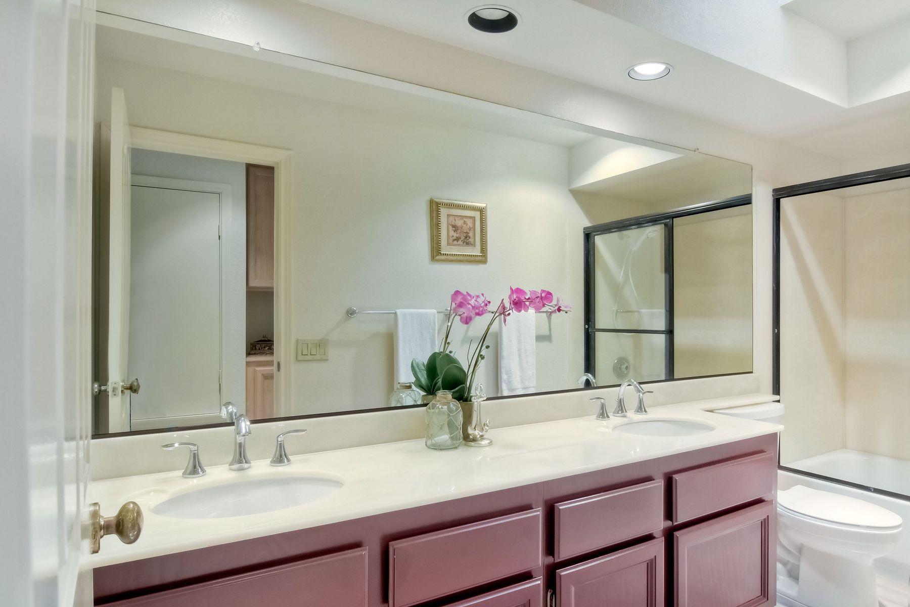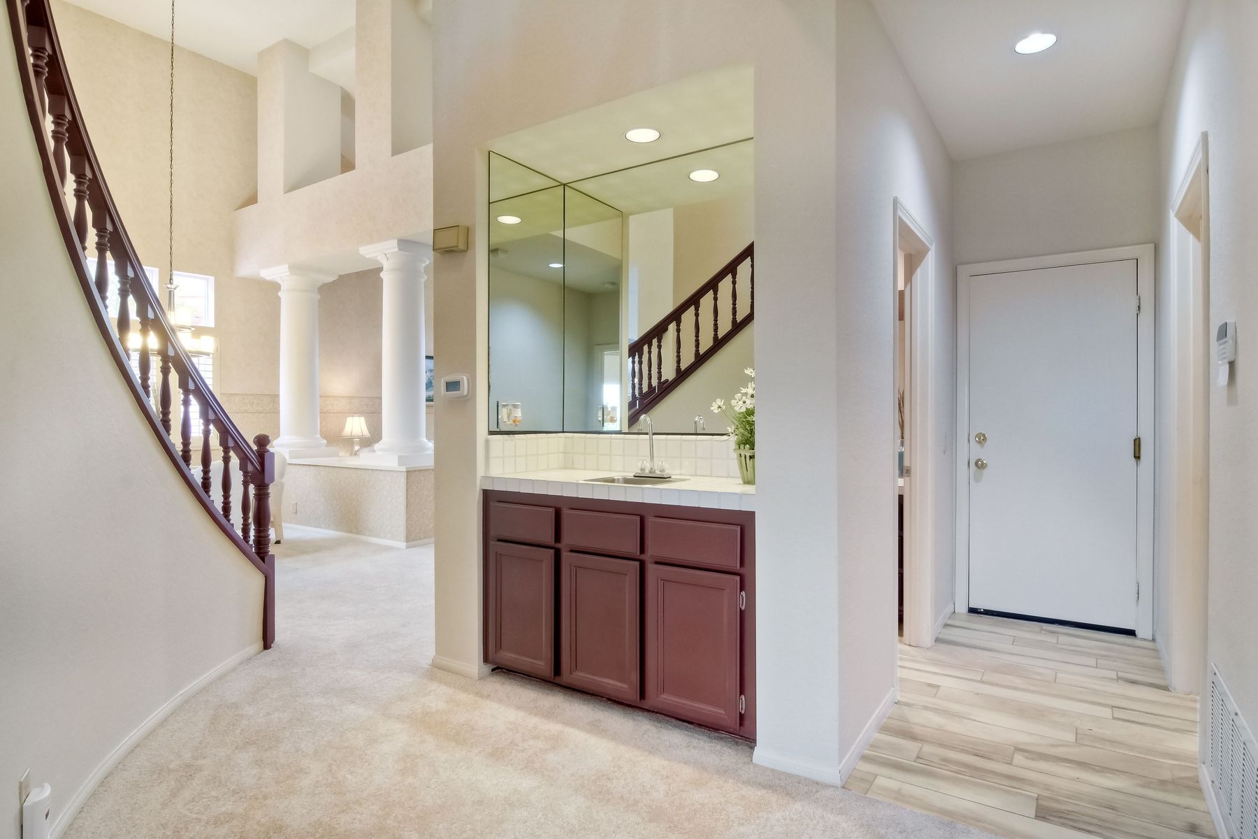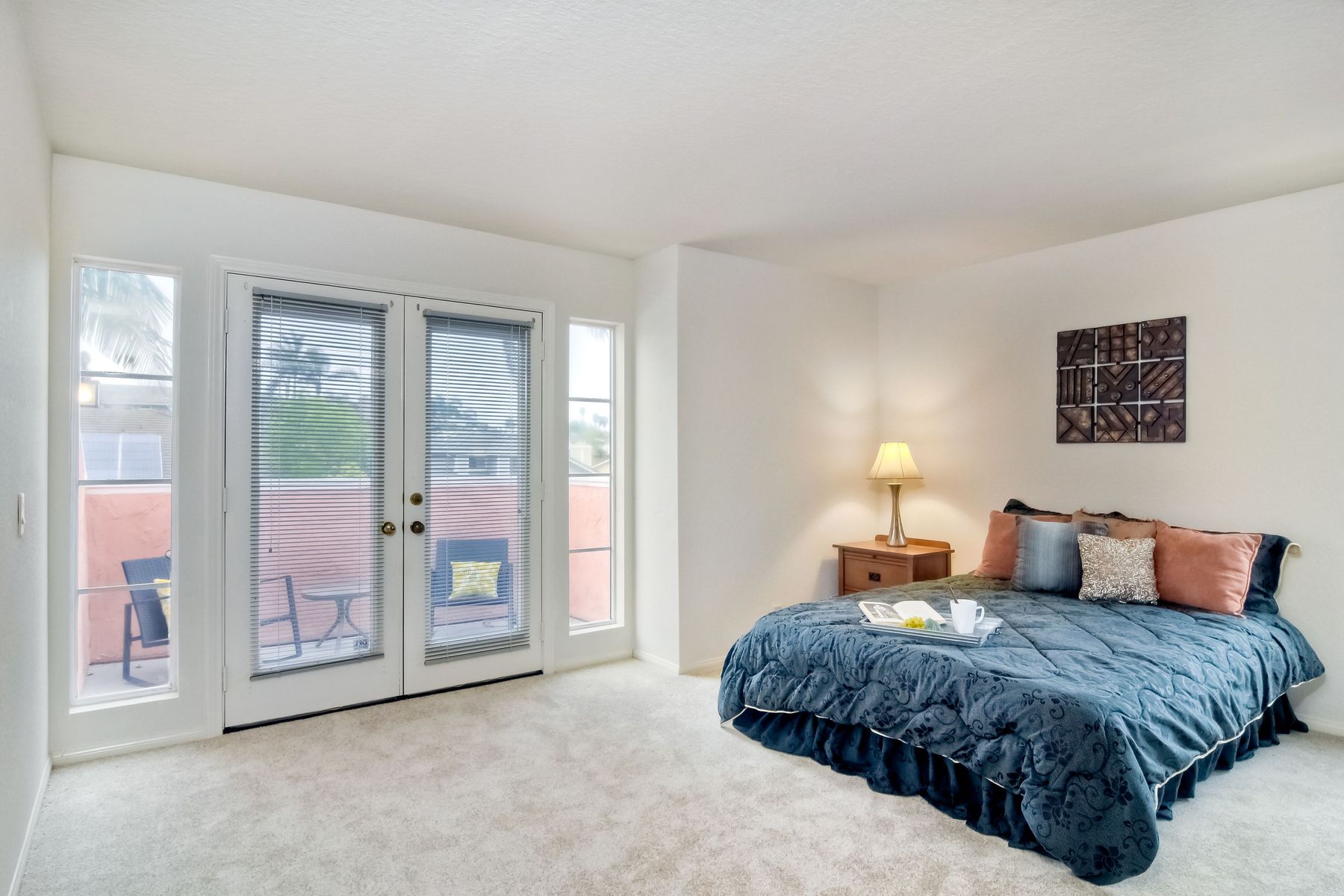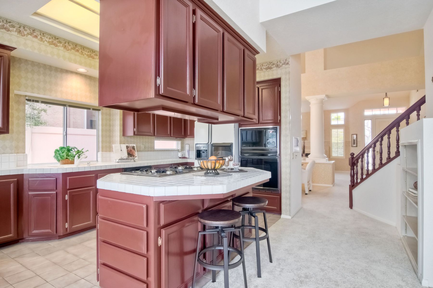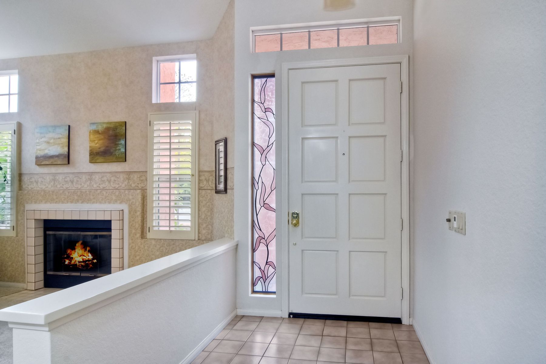 Forever views of Lake Miramar, sunsets, and city lights. First floor master bedroom allows single level living. Curved staircase leads to three additional generous size bedrooms upstairs. Front bedroom has french doors to the balcony. Kitchen features island and breakfast nook with window seat. Refreshed with new flooring, carpet, and paint. Sliding doors open from the family room and master bedroom to the patio with sparkling pool and unobstructed canyon and lake views. Great entertaining home! No HOA.