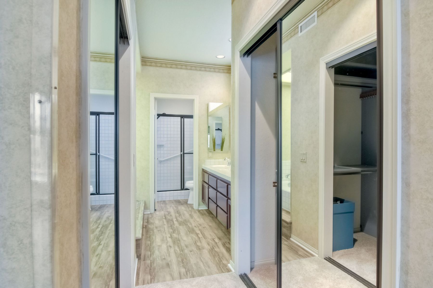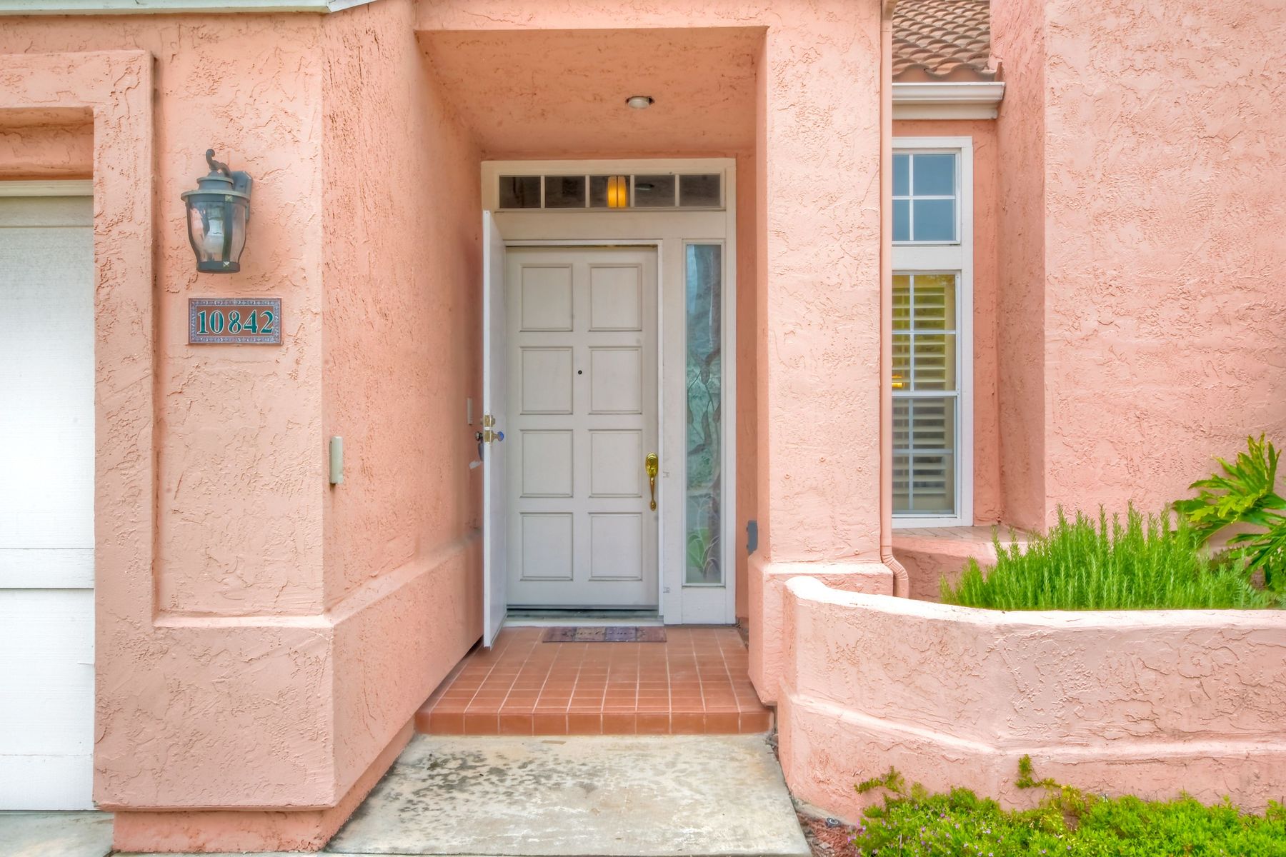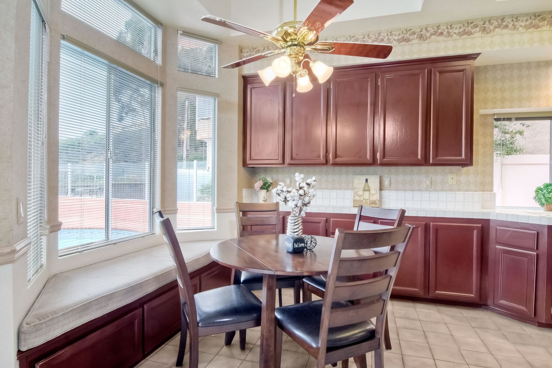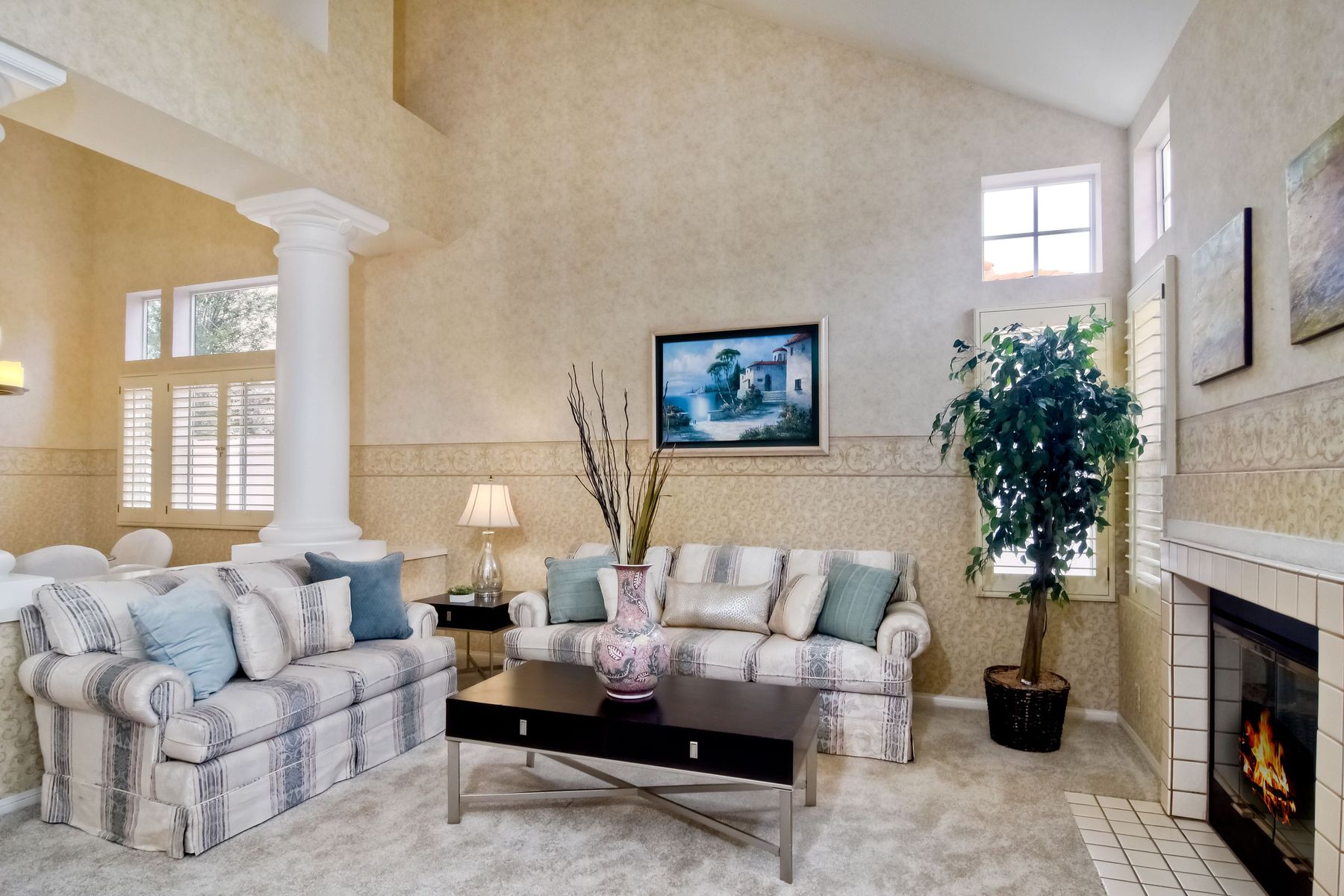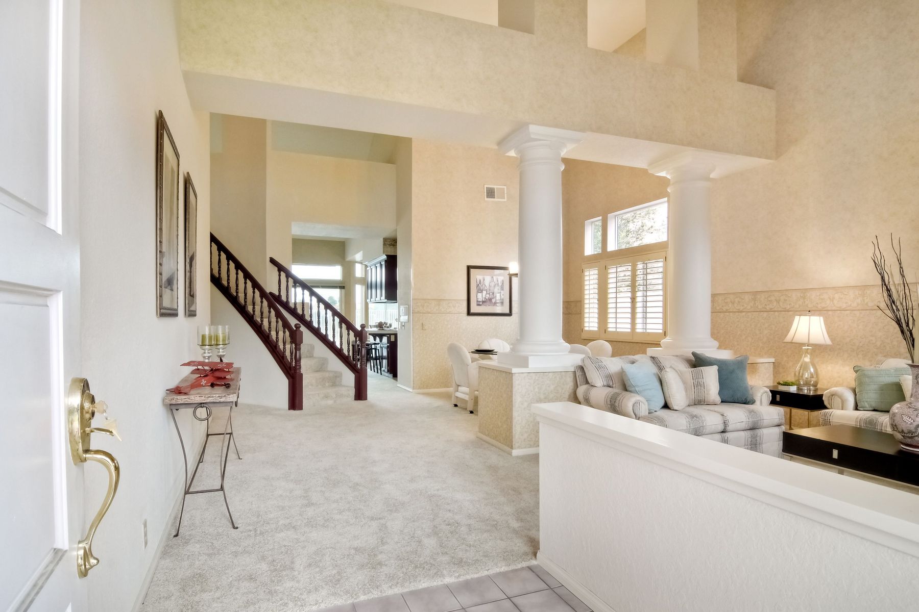 Forever views of Lake Miramar, sunsets, and city lights. First floor master bedroom allows single level living. Curved staircase leads to three additional generous size bedrooms upstairs. Front bedroom has french doors to the balcony. Kitchen features island and breakfast nook with window seat. Refreshed with new flooring, carpet, and paint. Sliding doors open from the family room and master bedroom to the patio with sparkling pool and unobstructed canyon and lake views. Great entertaining home! No HOA.