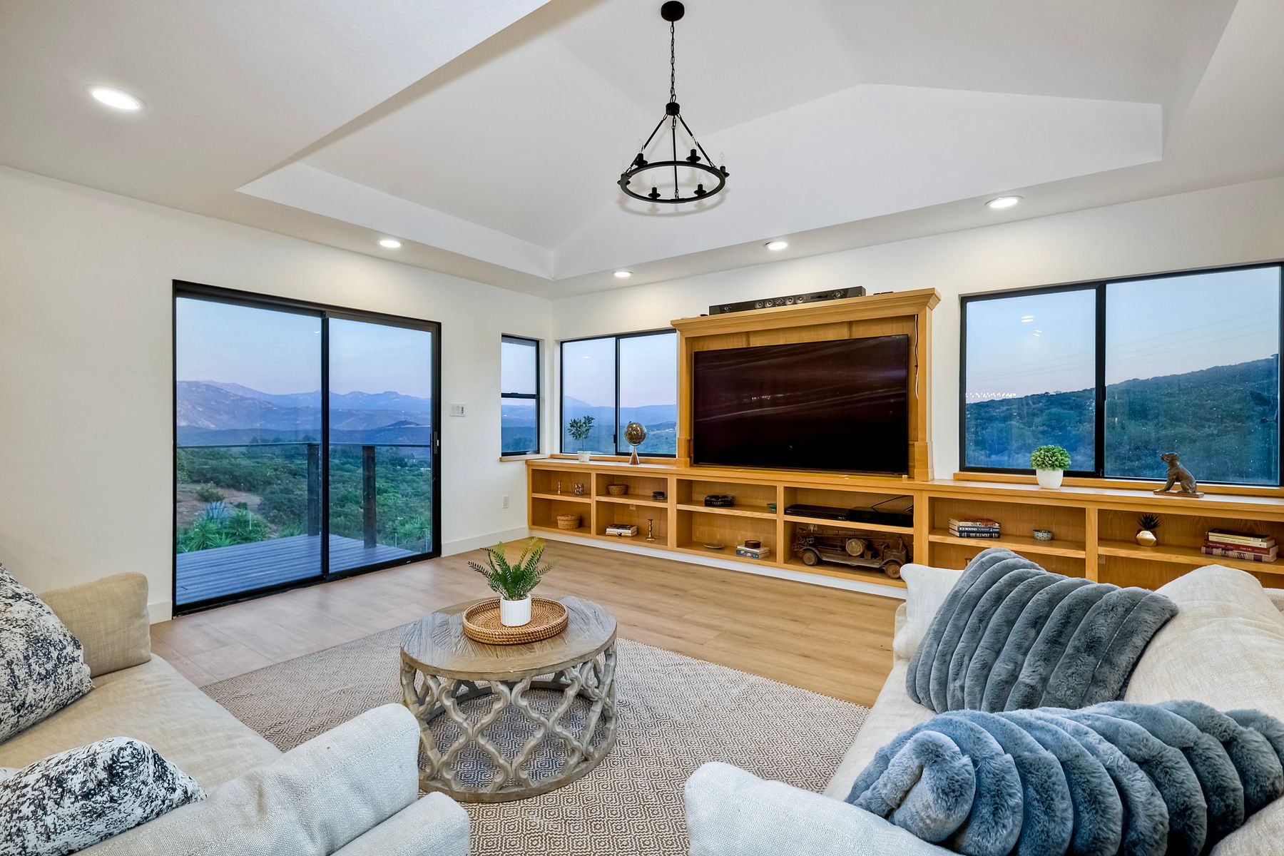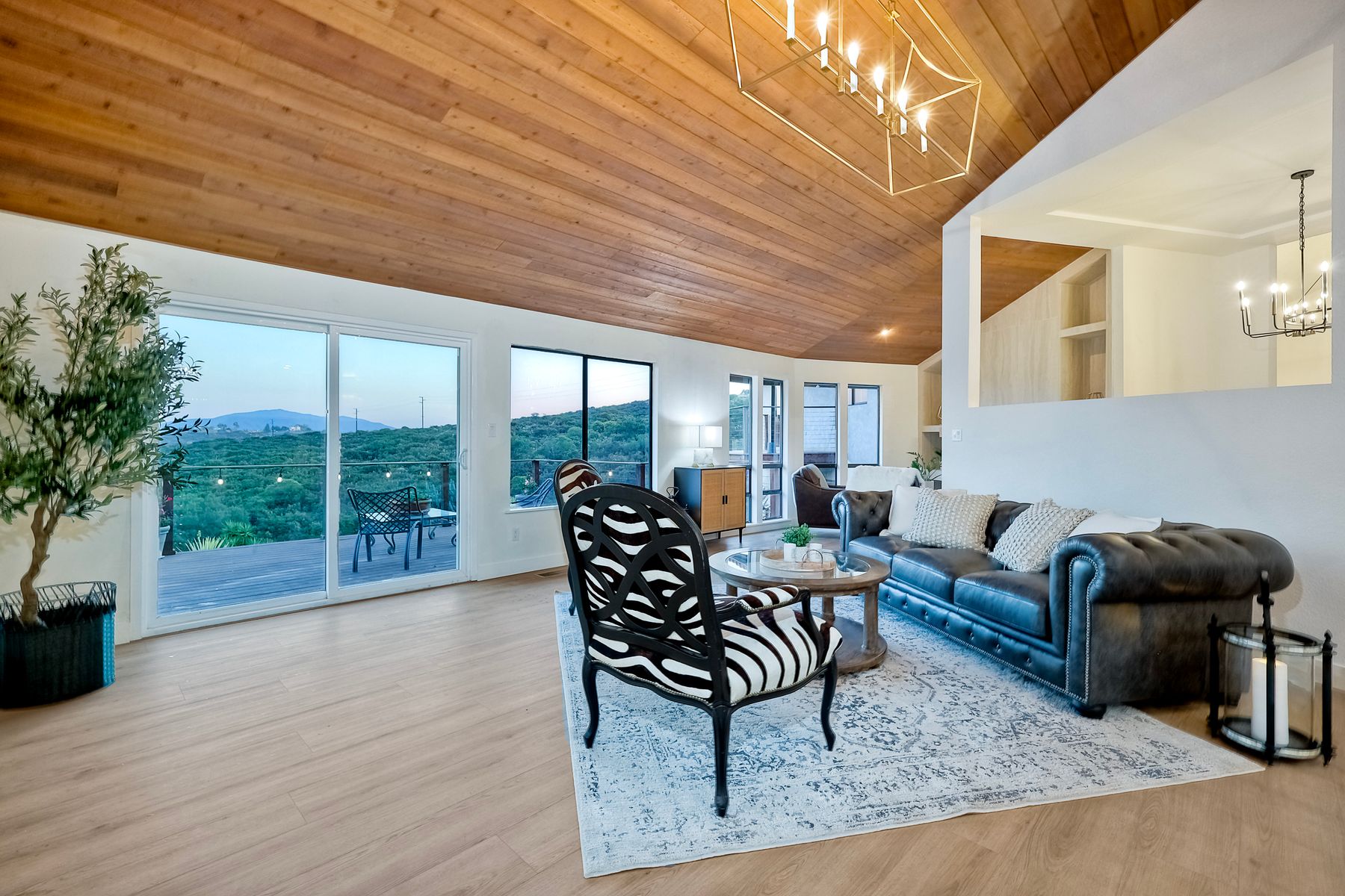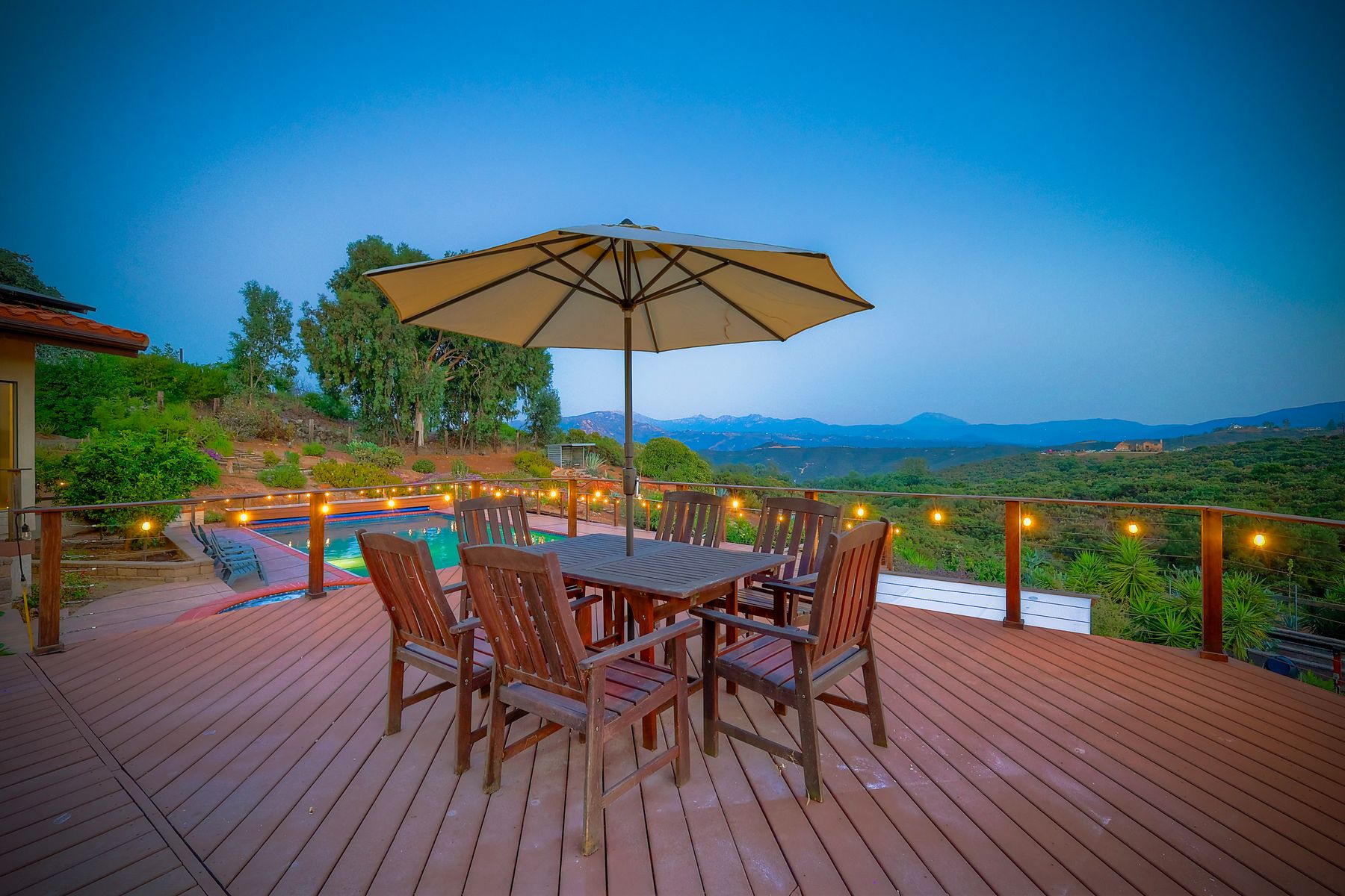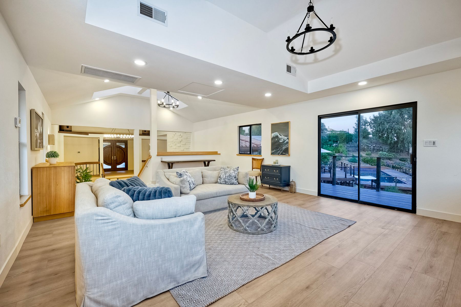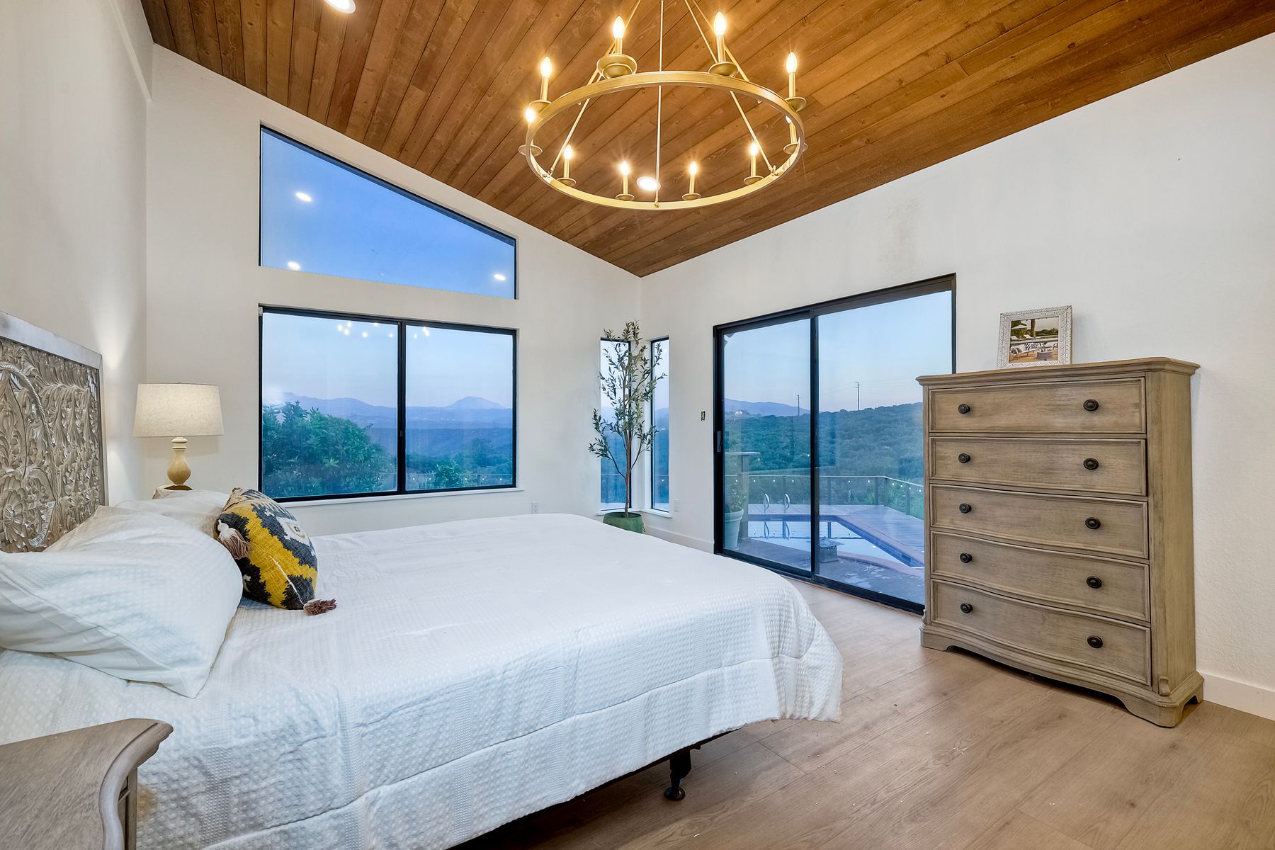 Welcome home to your own private paradise nestled in the hills of beautiful Alpine. Situated on over 2 sprawling acres with views abounding, this custom home has recently had a full makeover that will satisfy even the most critical buyer. As you walk in you'll be elated with the abundant space and all of the natural light that floods into the home. The entire home has brand new luxury vinyl plank flooring throughout, creating a warm and seamless space. As you walk down into the first living room, you'll notice the high ceilings with a brick feature wall that houses the fire place and gorgeous wood beamed vaulted ceilings, along with custom lighting. There are two large bonus rooms off of the living room to be used as you like. The upstairs one is currently used as a TV/media room and the downstairs space is an exercise room/dance studio complete with a mirrored wall and a ballet bar! Both come with gorgeous views of the outside landscape of mountains and valleys, as well as decks to enjoy the outdoors. The kitchen upgrades include new Quartzite countertops, custom backsplash and top of the line Gaggenau double ovens and Bosch cooktop. Off the kitchen, you'll find a large family room with a coffee/beverage bar to one side and a cozy fireplace seating/reading nook on the other. Perfect for those fall or winter nights! The generous master retreat is a space you may never want to leave! From the elevated sitting area with a tasteful paneled feature wall, to the stand alone soaker tub, to the enormous shower featuring four various shower heads--you can have a spa day without ever leaving your bedroom! Two other ample sized bedrooms are down the hall with their own Jack and Jill bathroom to share. That side of the house has it's own laundry room and there's also a Butlers pantry with it's own laundry located on the other side of the home. There is an attached ADU with TWO spacious bedrooms, both boasting wood beamed vaulted ceilings and custom lighting. Off the hallway is a brand new lovely full bathroom and finally there is a living area with it's own entrance. Great for multi-generational living or potential rental income?!? Once outside there is so much to see and enjoy! From the Trex decking that surrounds the back of the house to the salt water heated pool and spa to the fenced garden area that leads to the roughly quarter of a mile of trails surrounded by drought resistant landscaping--this is an entertainers DREAM! Stunning panoramic views all around this super private oasis! OWNED solar, including pool solar plus RV parking just sweetens this already gem of a house! Hurry and make this dream home yours today! **Potential for a rate buy down with the right price**