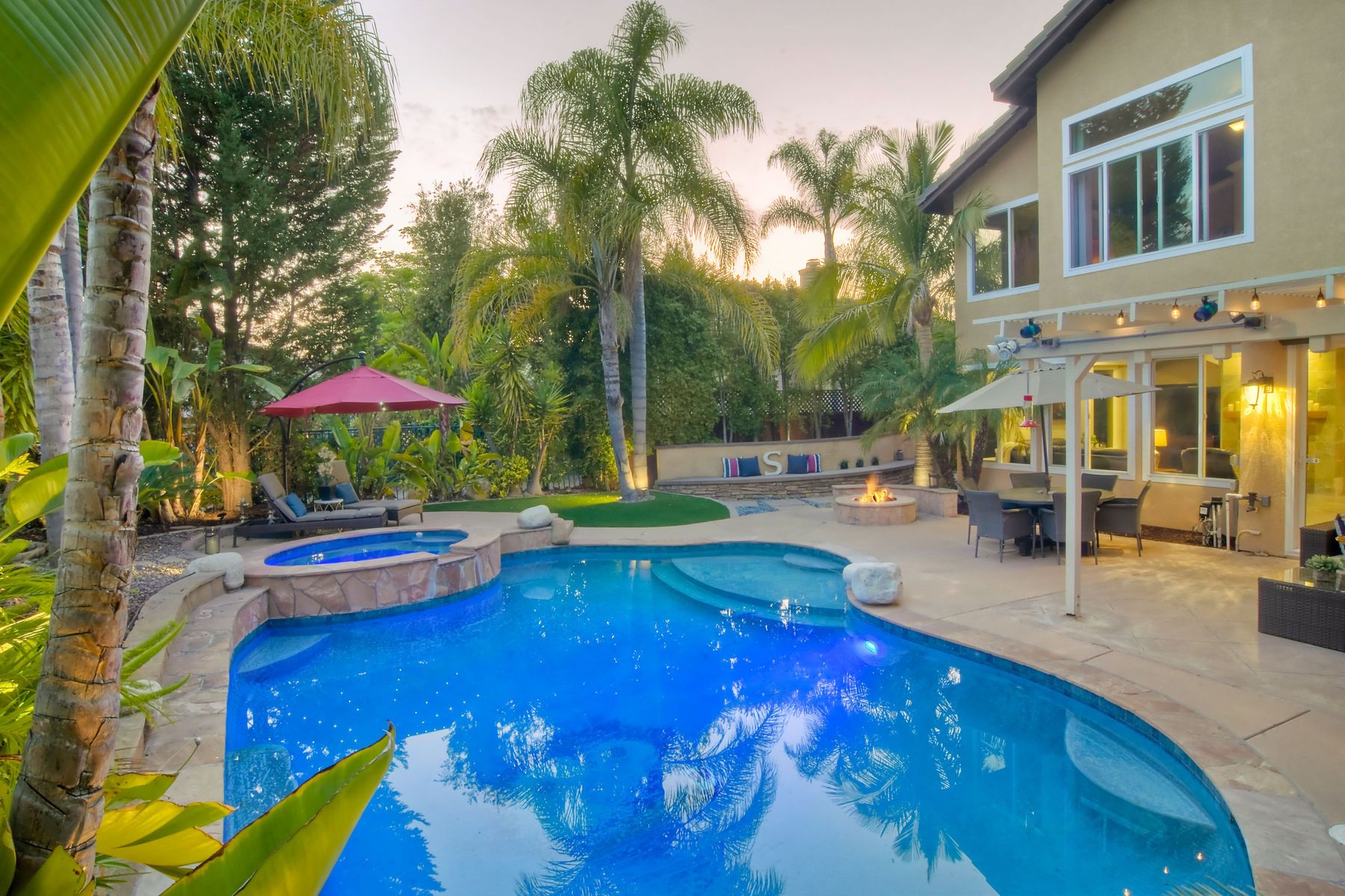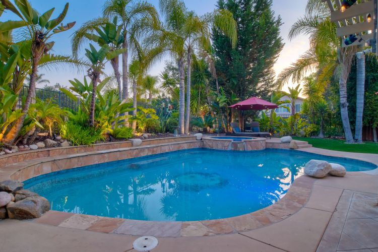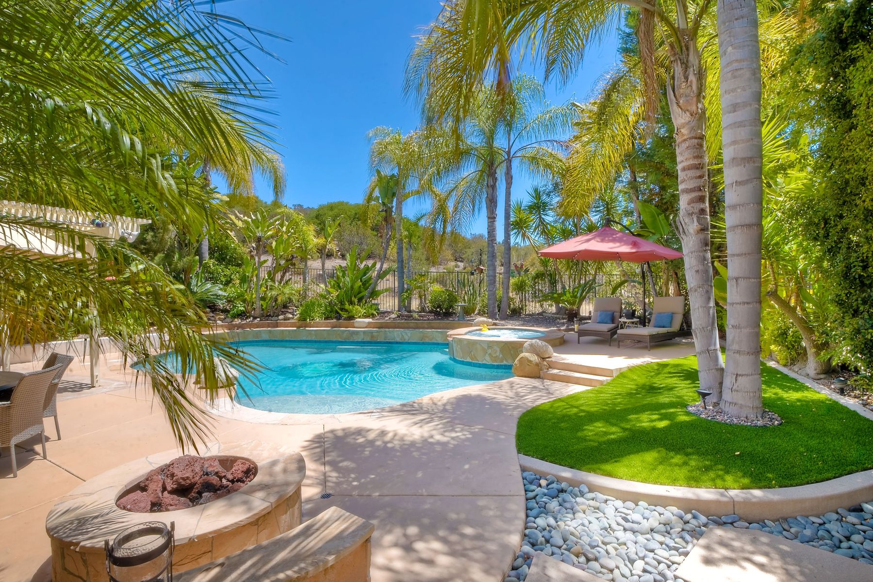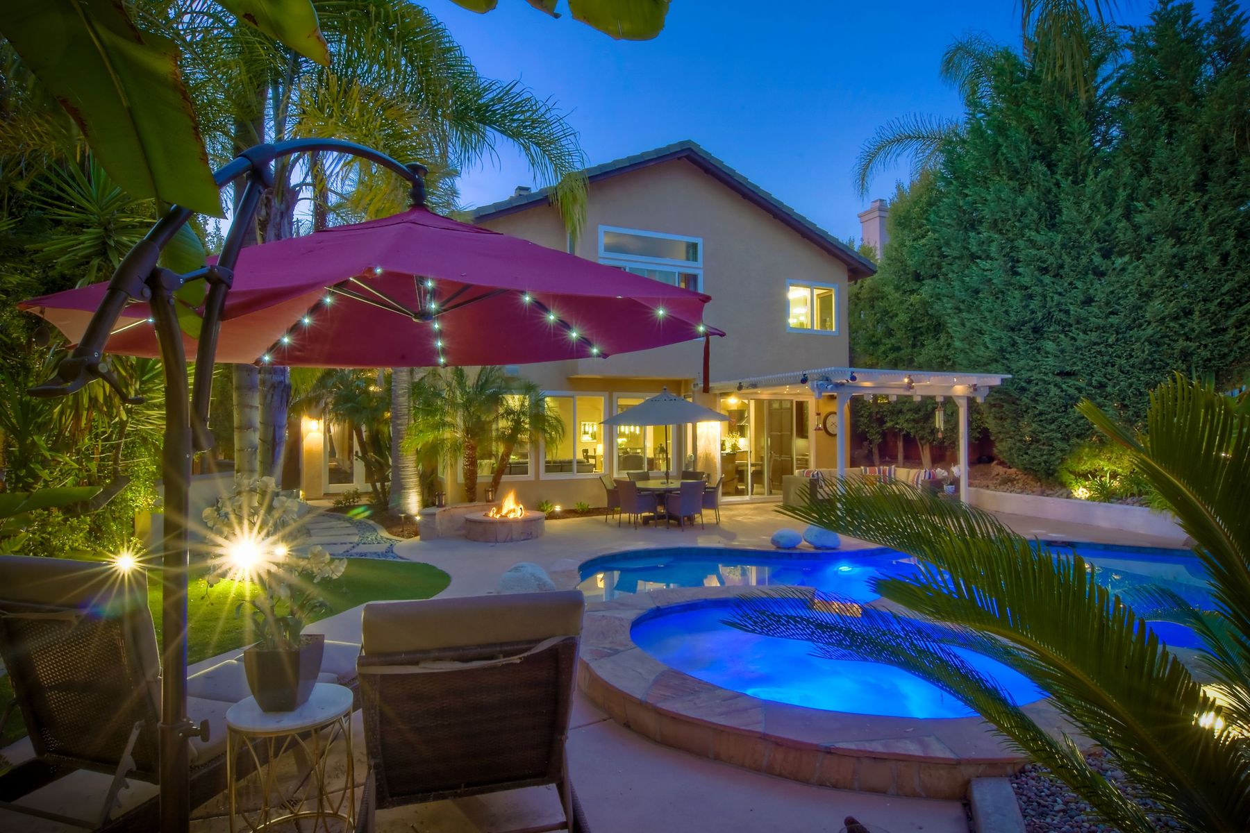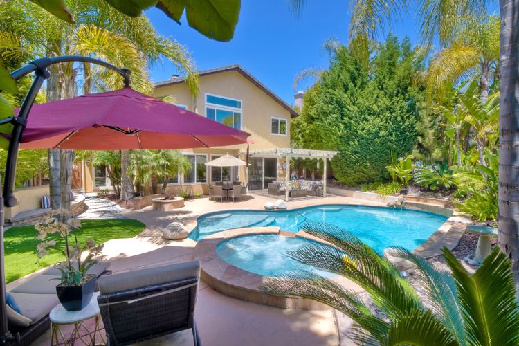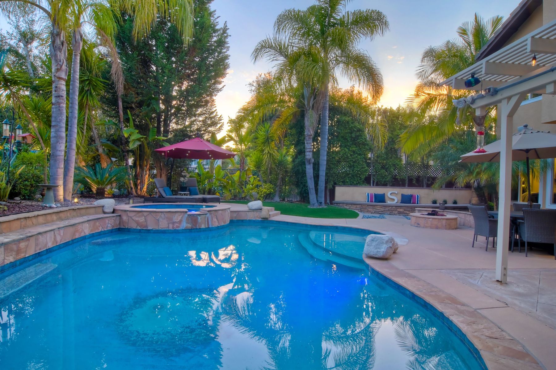 Outstanding location ... Wonderful Floor Plan ... Upgraded Throughout ... Smart home, meticulously maintained.  Located in a cul-de-sac, just the right distance from Dingeman Elem, and backing to open space, this home features a resort style back yard, a stunningly remodeled custom kitchen, an en-suite bedroom and full bathroom downstairs and quality upgrades everywhere.  Solar energy system is leased w/ favorable terms.  Close to parks, hiking trails, shopping, casual dining, and freeways.  Highly regarded Scripps Ranch Schools.  View photos w/ corresponding verbiage for details on all of the upgrades. If you have been waiting for THE home, then you want to come see this one. Let's start with the wonderful curb appeal w/ custom pavers at the driveway, custom garage doors and gorgeous landscaping w/ custom lighting, out front.  The custom wood door provides just a taste of what is to come.  Once inside, you will find custom slate flooring at the entryway which leads you to the porcelain plank tile flooring throughout downstairs.  Upgraded baseboards, crown molding, custom Lutron Smart lighting, leaded glass windows, custom paint, updated staircase, new dual pane windows, and custom window coverings, can all be appreciated immediately.  Yes .... CUSTOM is a term used often to describe the features found in this home.  The kitchen has been fully remodeled and customized to include a incredible slab granite counters, a huge main island space, a farmer's sink, custom cabinetry and stainless steel appliances.  The family room, complete w/custom floor to ceiling tile around the fireplace, custom lighting, and automated South Shade window coverings adjoins the breakfast nook and kitchen for GREAT MAIN LIVING SPACE.  Other features downstairs include an en-suite bedroom and upgraded bathroom, and a a customized laundry room.  The upgraded Nest thermostat can be controlled by an app allowing you to remotely control the temperature of the home.  Upstairs you will find gorgeous hardwood floors, custom paint, upgrades baseboards, crown molding, and custom lighting.  The large master bedroom features a walk-in closet, and remodeled master bathroom.  You will find 3 additional bedrooms PLUS an office upstairs.  The private back yard features a relaxing pool/spa and fire pit w/ multiple seating areas ... perfect for entertaining.  The main components of the pool equipment have all been recently updated.  The owner has installed multiple systems whereas you can use apps to remotely turn on lights, control the home temperature, raise or lower window coverings, turn on the spa, or open or close the garage door.  There are no neighbors directly behind you, and some open space (easement) to the west side of the home.  You will find easy access to walking trails at the end of the cul-de-sac, and you are withing walking distance to Dingeman Elementary School, Scripps Marketplace, and Scripps Ranch Community Center.  The owner has an SRSRC membership which may be transferred to the new owner.   Don't miss this one!