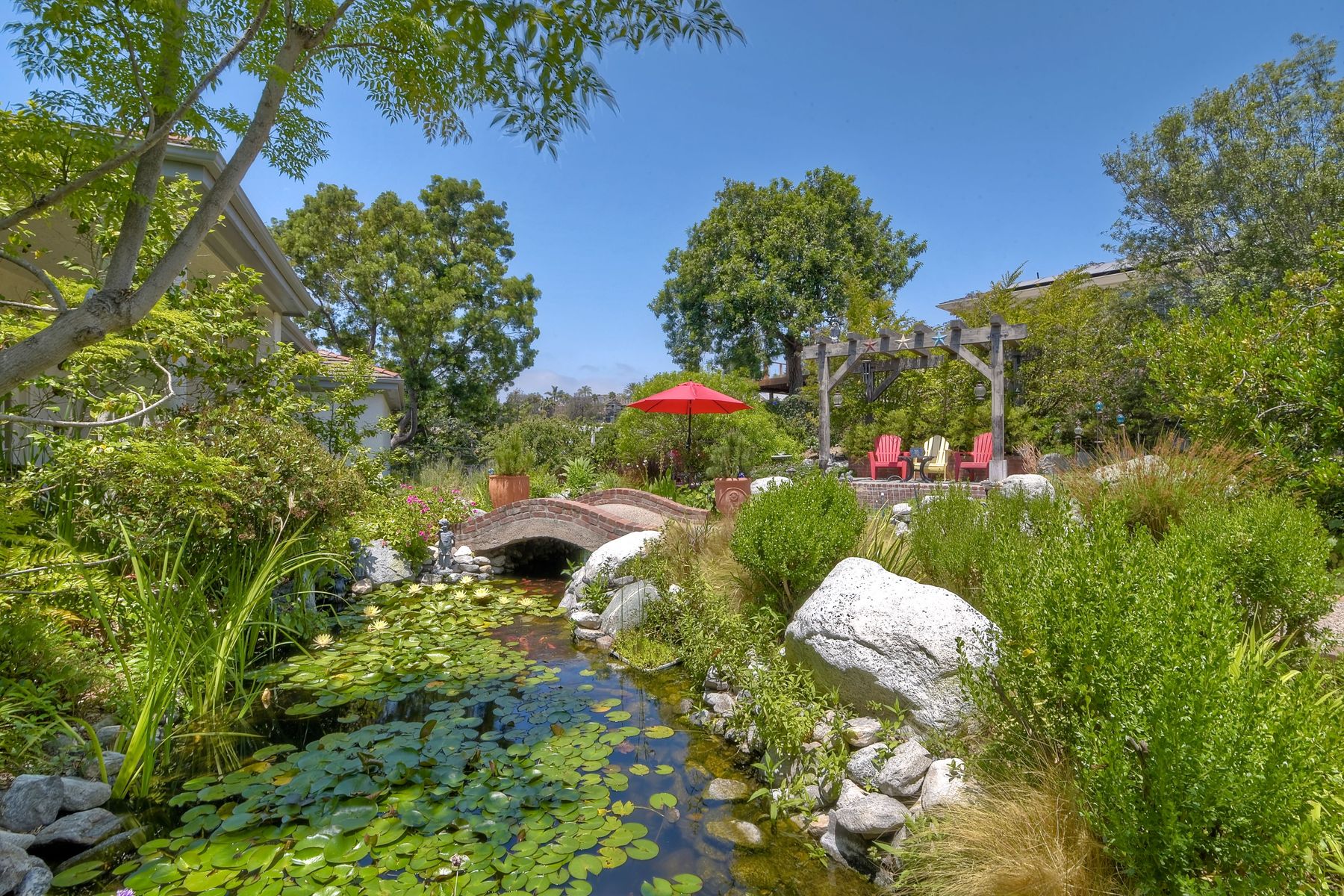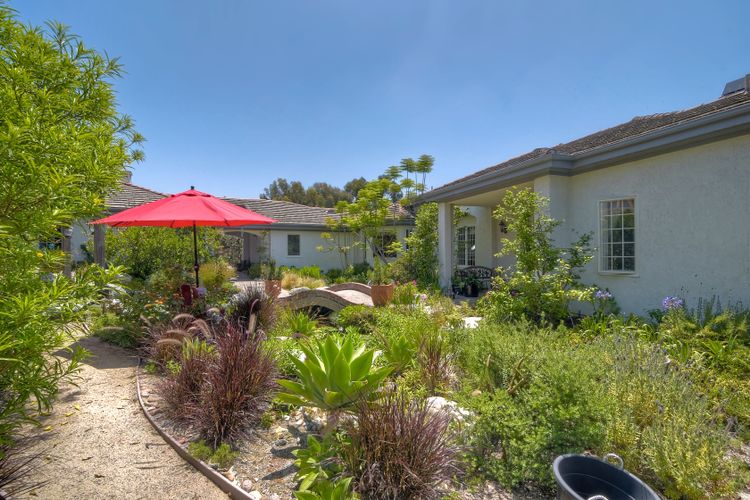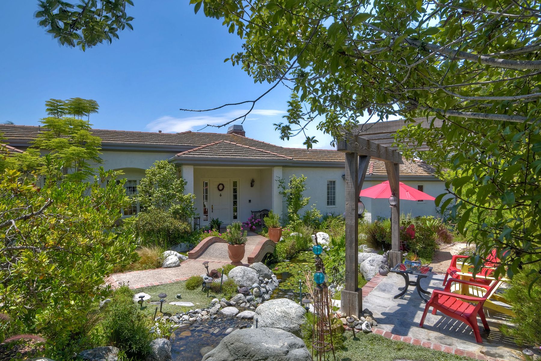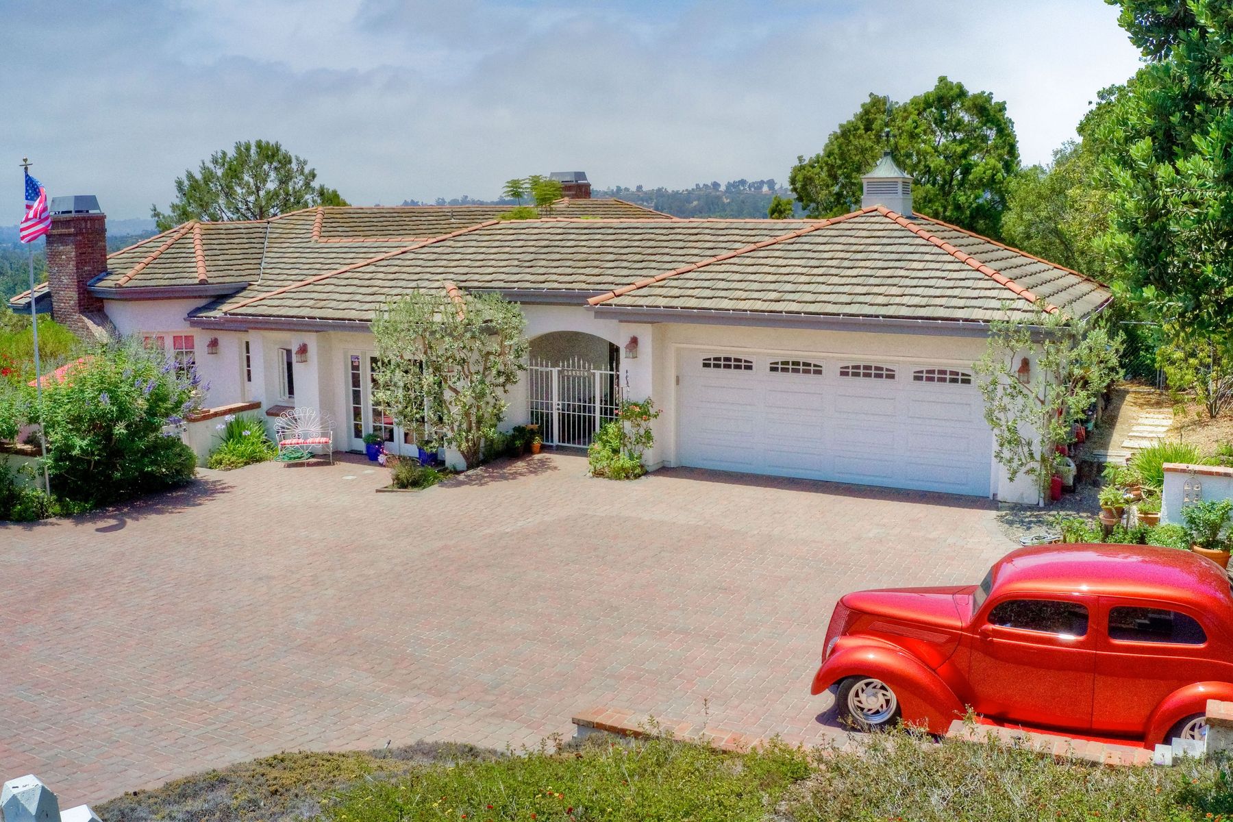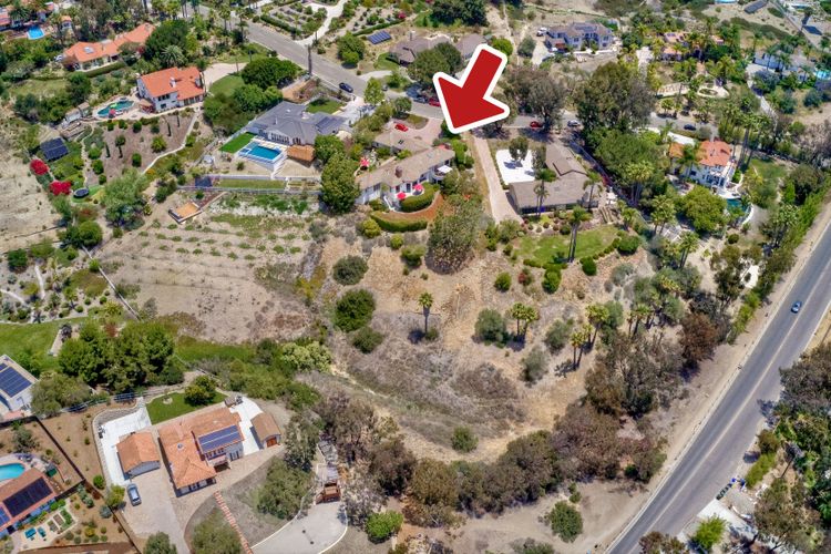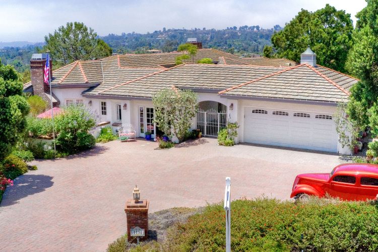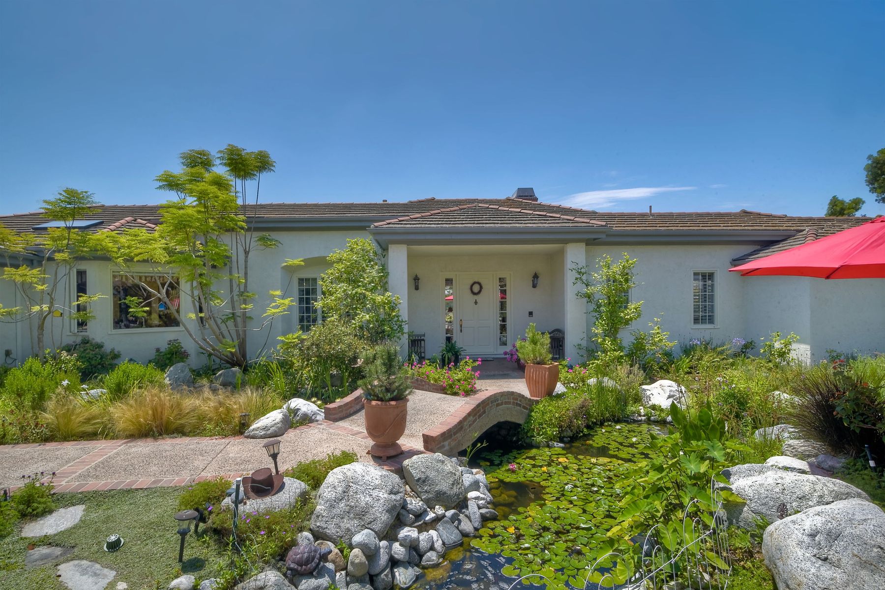 Cast your eyes on this beautiful home designed by Don Edson located in the highly coveted enclave of Rancho Encinitas, Olivenhain. The home features generous ceilings on both levels, light filled rooms, window dressings and auto shades plus tastefully placed crown molding and a combo of hardwoods and tile floors. You will not mind washing a dish or two in this open concept, updated kitchen as the massive sink window looks out upon the tranquil courtyard garden. The kitchen is open to a spacious family room with fireplace and its own patio. The home lives like a single story with each room flowing seamlessly into the next, with all the main rooms on entry level with a plethora of private patios throughout. The main level master suite features a ceiling fan, dual sinks and walk-in closets, a luxurious, updated spa like bathroom with an elegant free-standing claw footed tub and separate walk-in shower to unwind in. The downstairs has a second master with walk-in closet, full bathroom, private patio and an enormous bonus room with wet bar. The entire lower level can be completely self-contained for guests, relatives or income. The 3rd single car garage attached to main house has been converted to a beautiful home office complete with built ins. It features an entrance off the driveway with tons of off-street parking for uber easy access for you and clients without disturbance to main house. If it better suits your needs, you could change it to a home gym or back to a 3rd garage. The generously sized, 2 car garage next to it, is lined with convenient, built in storage cabinets. This astonishing home has jaw-dropping, panoramic nature and sunset views and 1.5 acres of mature landscaping with enough flat yard for a pool and property is zoned for horses. The walkway from front, to the main home entry is an experience that will be forever etched in your memory. As you meander your way from front gate through the courtyard, you'll be greeted and transformed as your cares are whisked away by the sight of your very own courtyard garden park, waterfalls and koi pond including a walk over bridge that leads you to your front door. This private slice of Eden can be viewed from many windows facing that side of the home or step outside and make your way to the elevated patio with pergola for Zen time, any time. This historic part of Olivenhain offers that country feel with spacious yet private lots. Short walking distance to numerous running, biking, hiking and horse trails and close proximity to several top equine facilities yet minutes to shopping and North County beaches. Schools, HOA and Mello Roos, you ask? Olivenhain Pioneer Elementary, Diegueno JHS and La Costa Canyon HS and NO HOA, Homeowners fees or MELLO ROOS! It doesn't get much better than this.