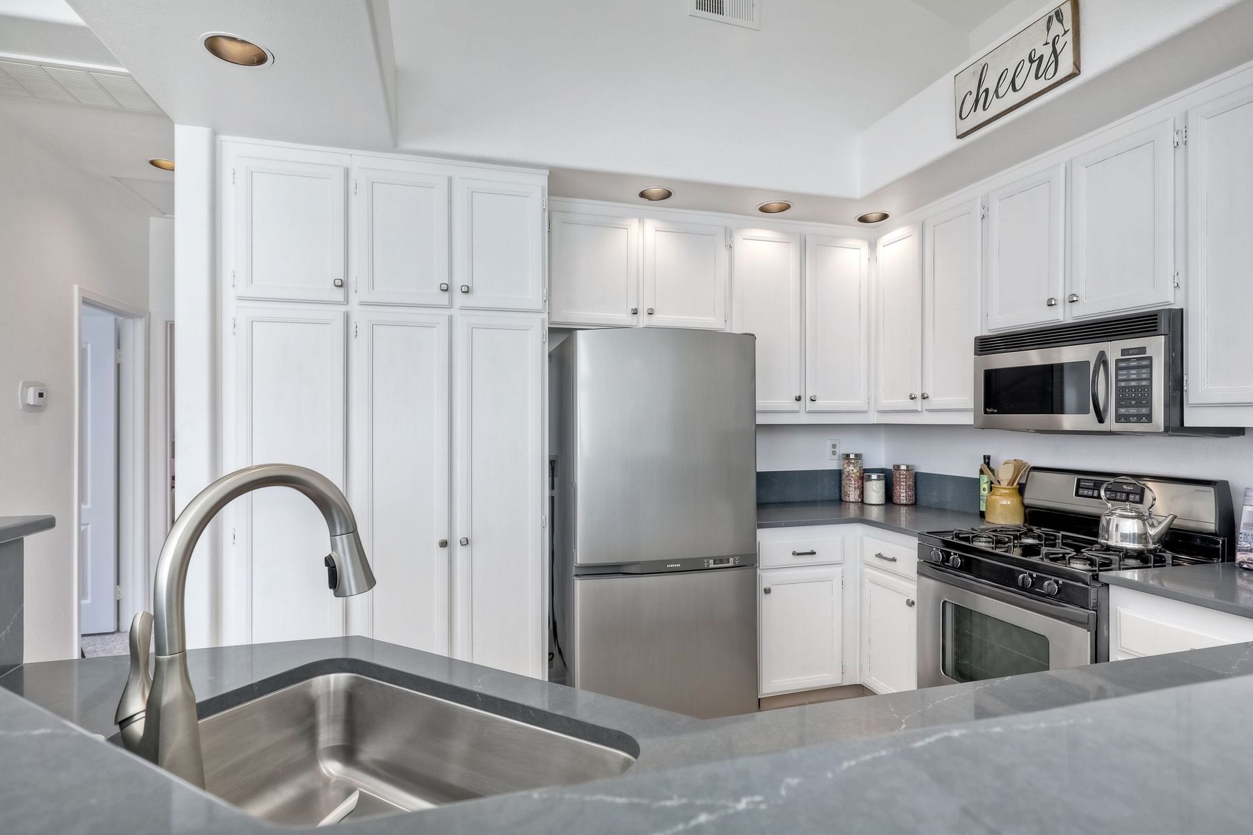 Here is a great opportunity to purchase a very well maintained condo in the heart of Carmel Mountain Ranch & the award winning Poway school district. This spacious 2 bed, 2 bath, 1002 sq ft condo has brand new paint, carpet, window coverings, and Quartz counters. Located in the back of the community this end unit is very quiet w/ a great patio. Unit has a 1 car garage w/ laundry + 1 addl covered parking spot steps from the front door. This gated community has great amenities incl a sparkling pool & spa. Neighborhoods: Carmel Mountain Ranch Equipment: Garage Door Opener Other Fees: 44 Sewer: Sewer Connected Topography: LL