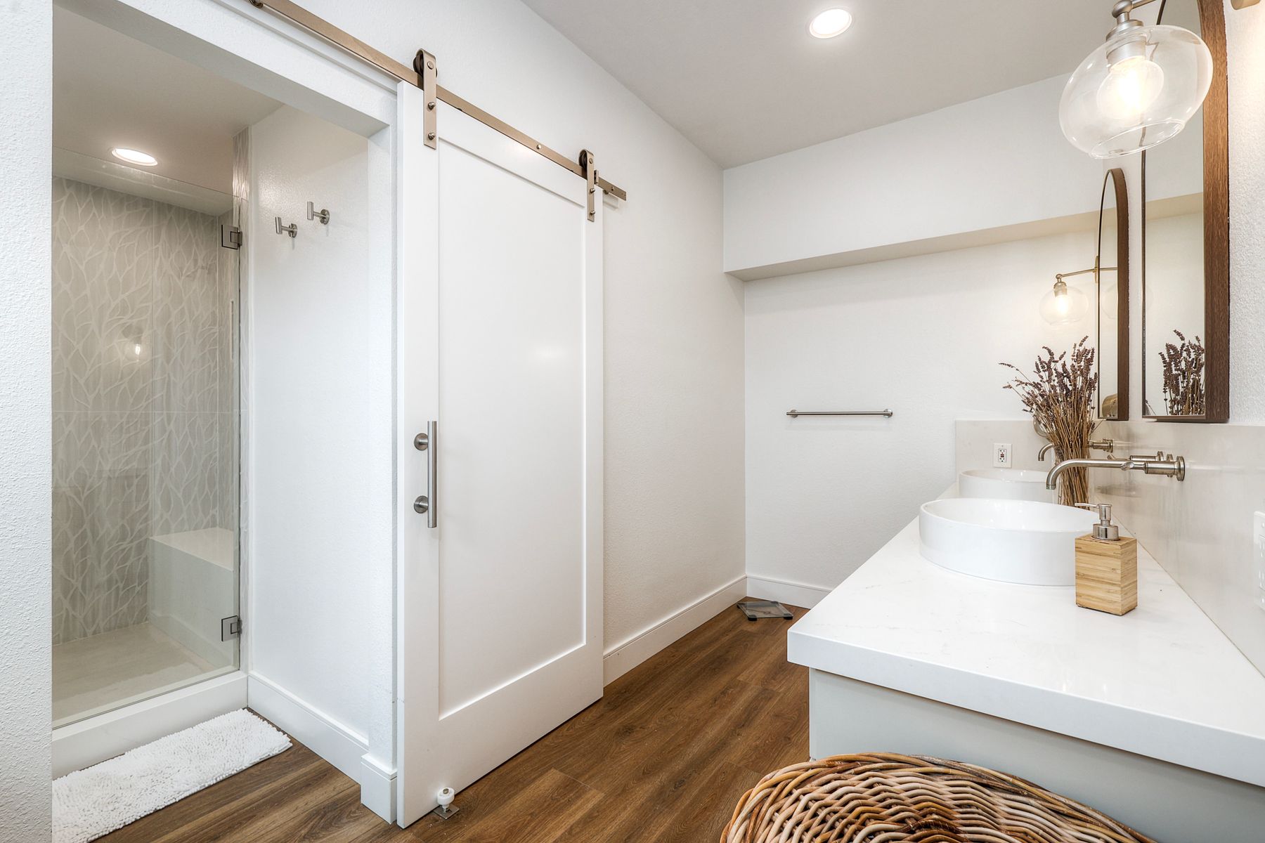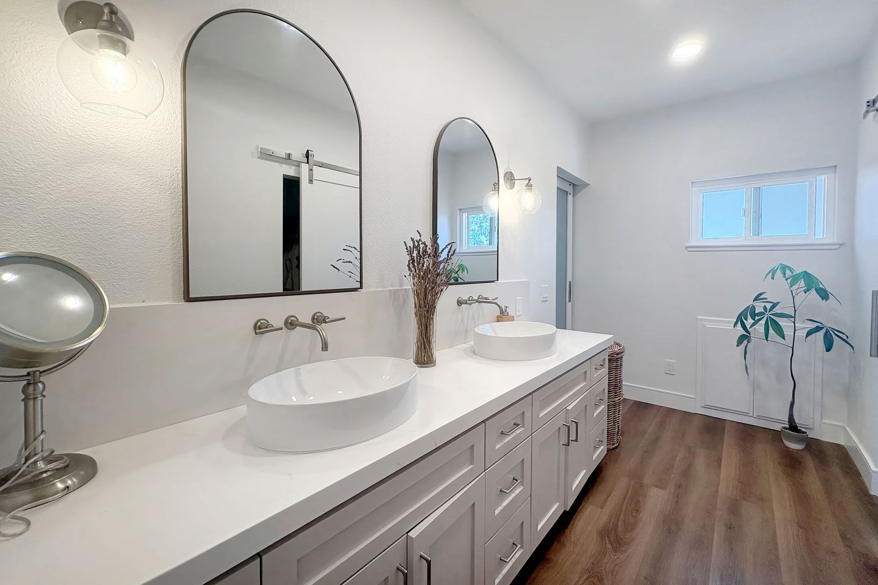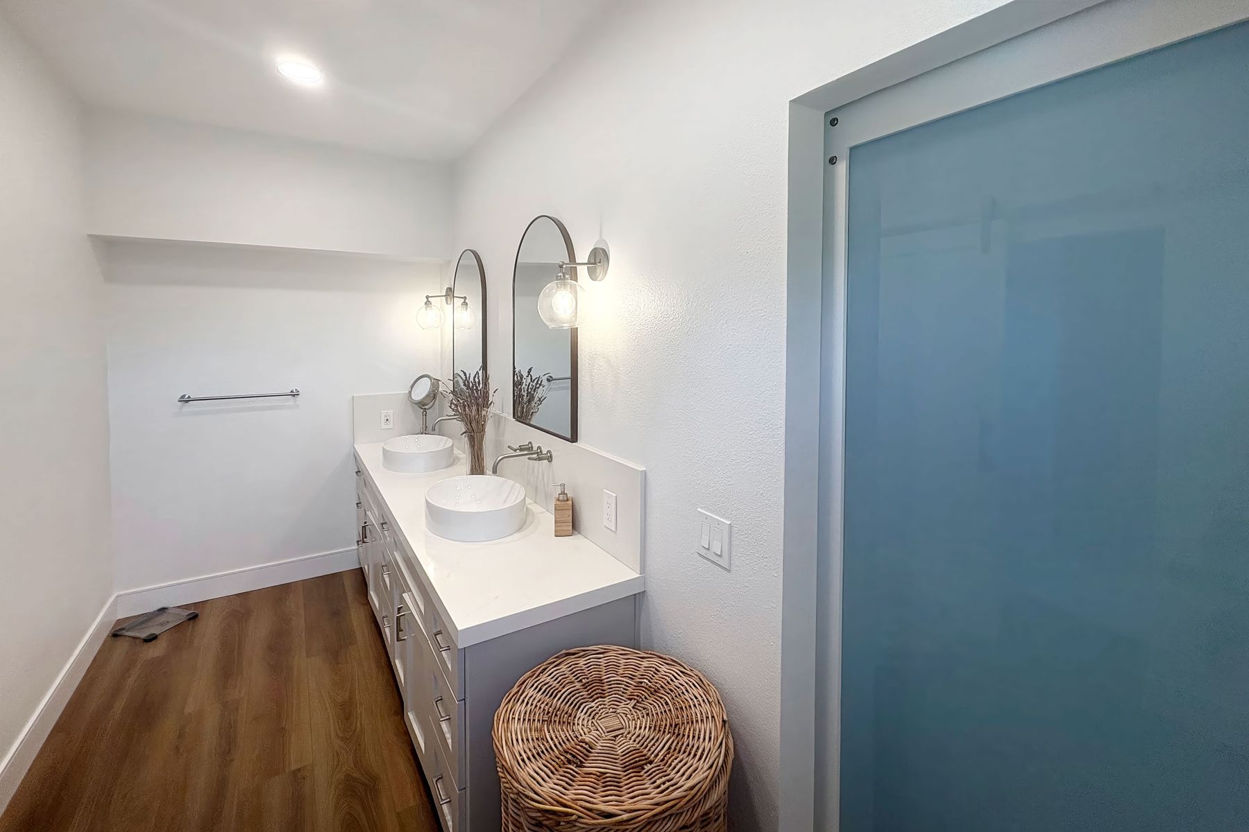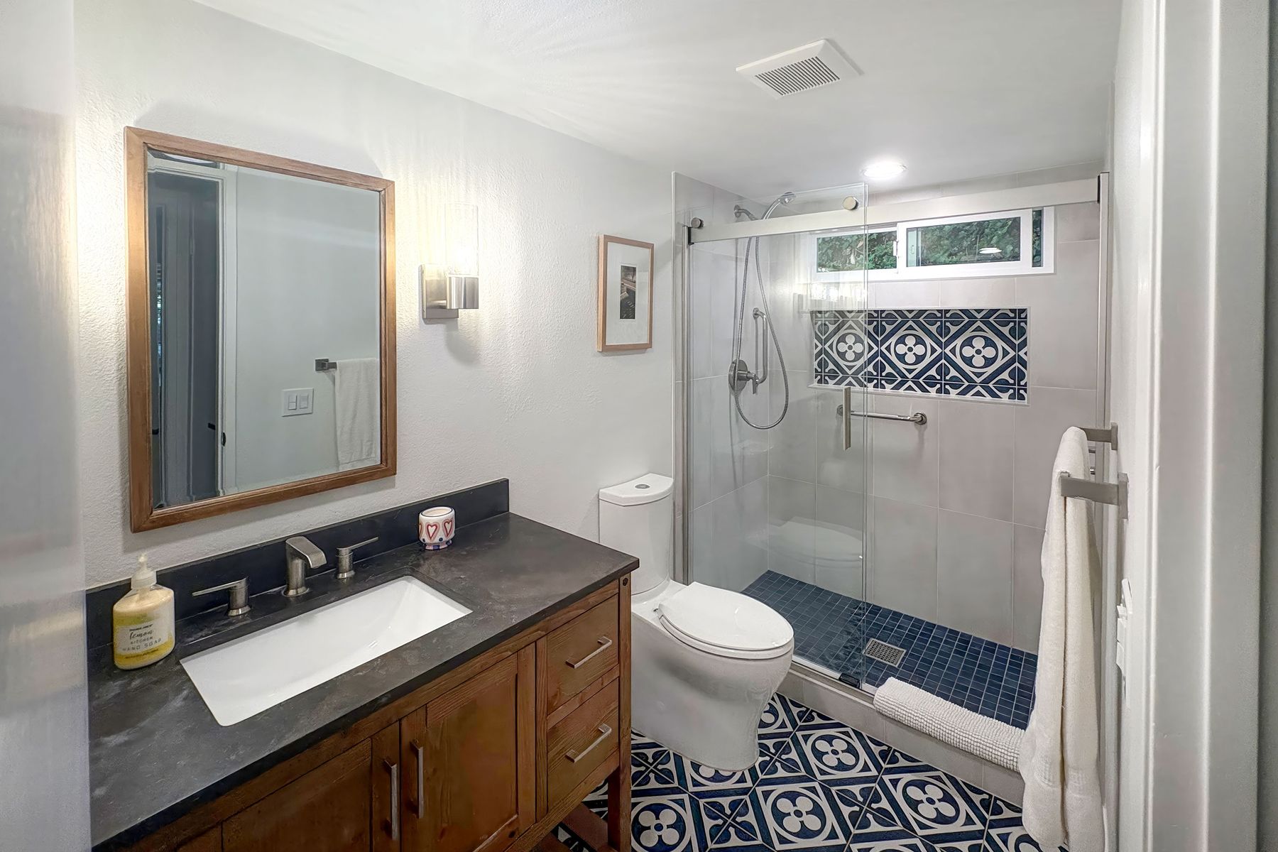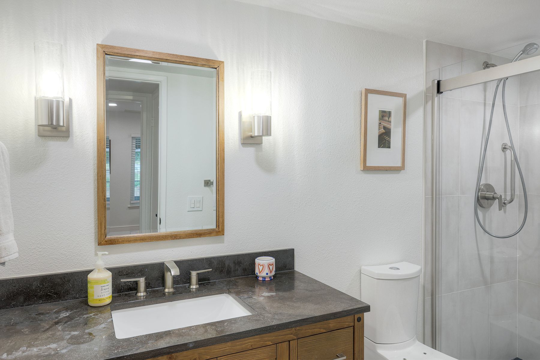 Double Sinks in Primary Bath, Exhaust fan(s), Linen Closet/Storage, Low Flow Toilet(s), Privacy toilet door, Remodeled, Upgraded, Vanity area, Walk-in shower, Shower, Shower in Tub, Bathtub, Closet in bathroom
