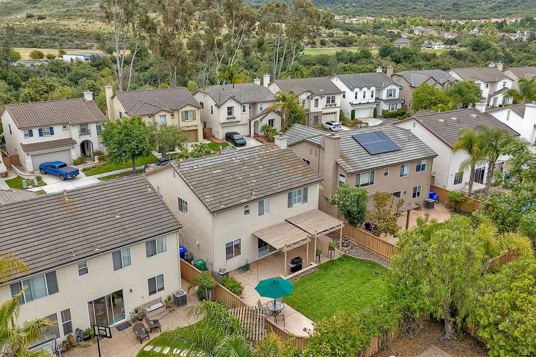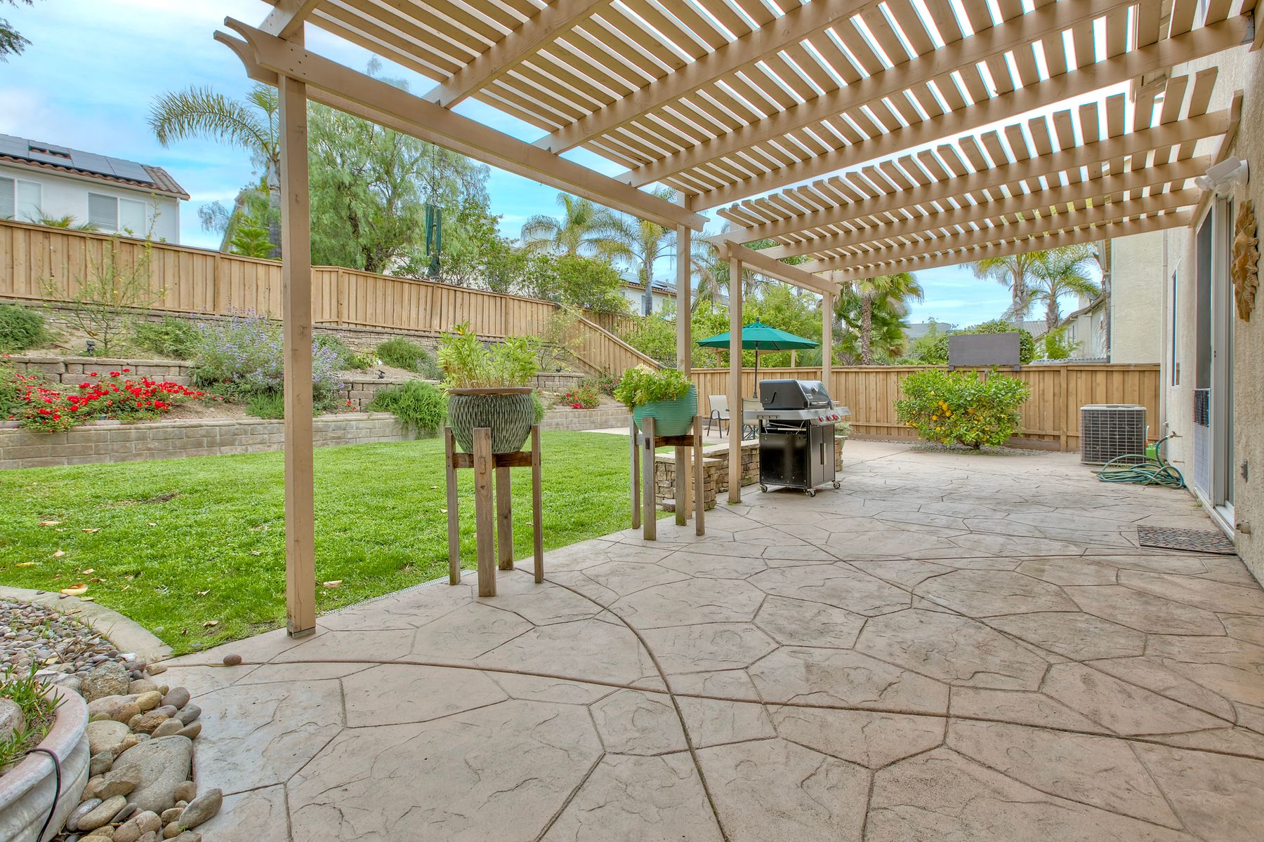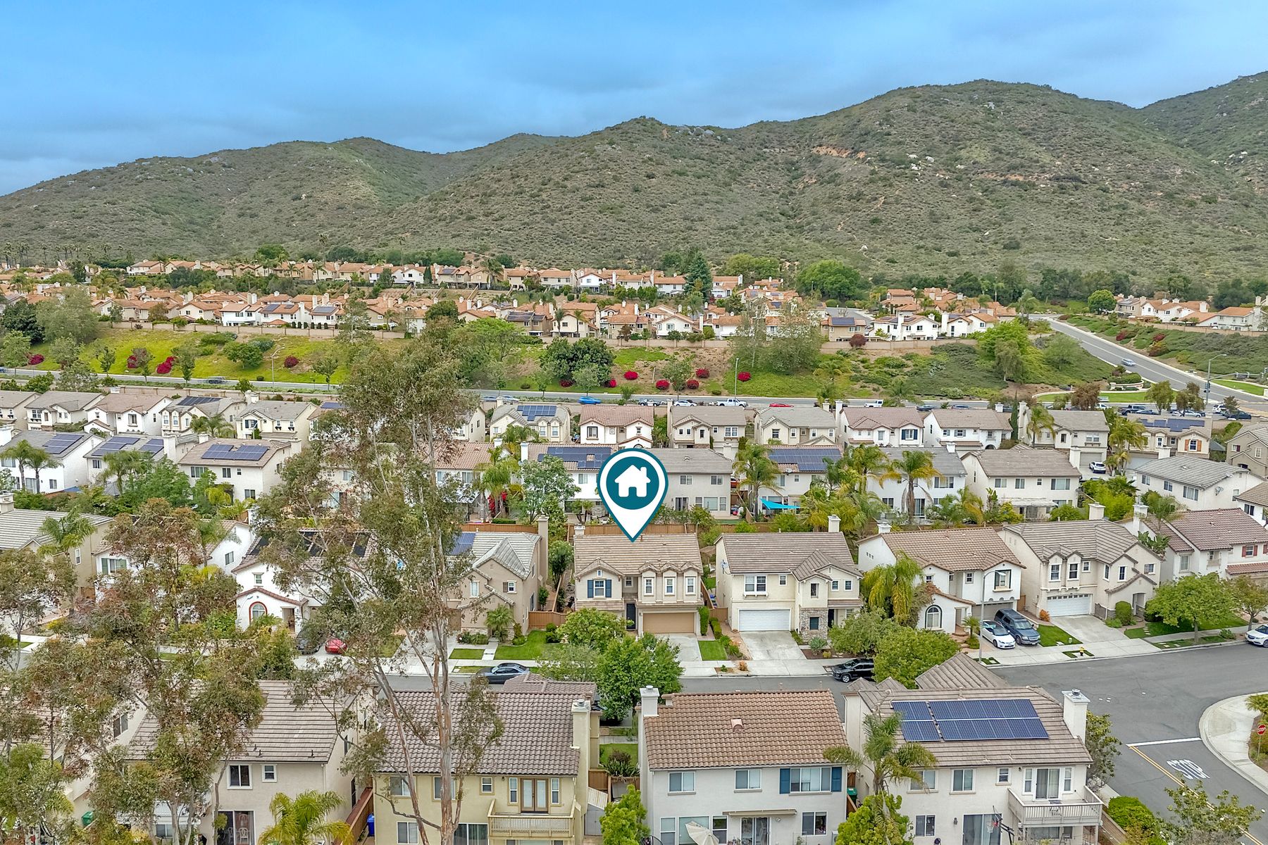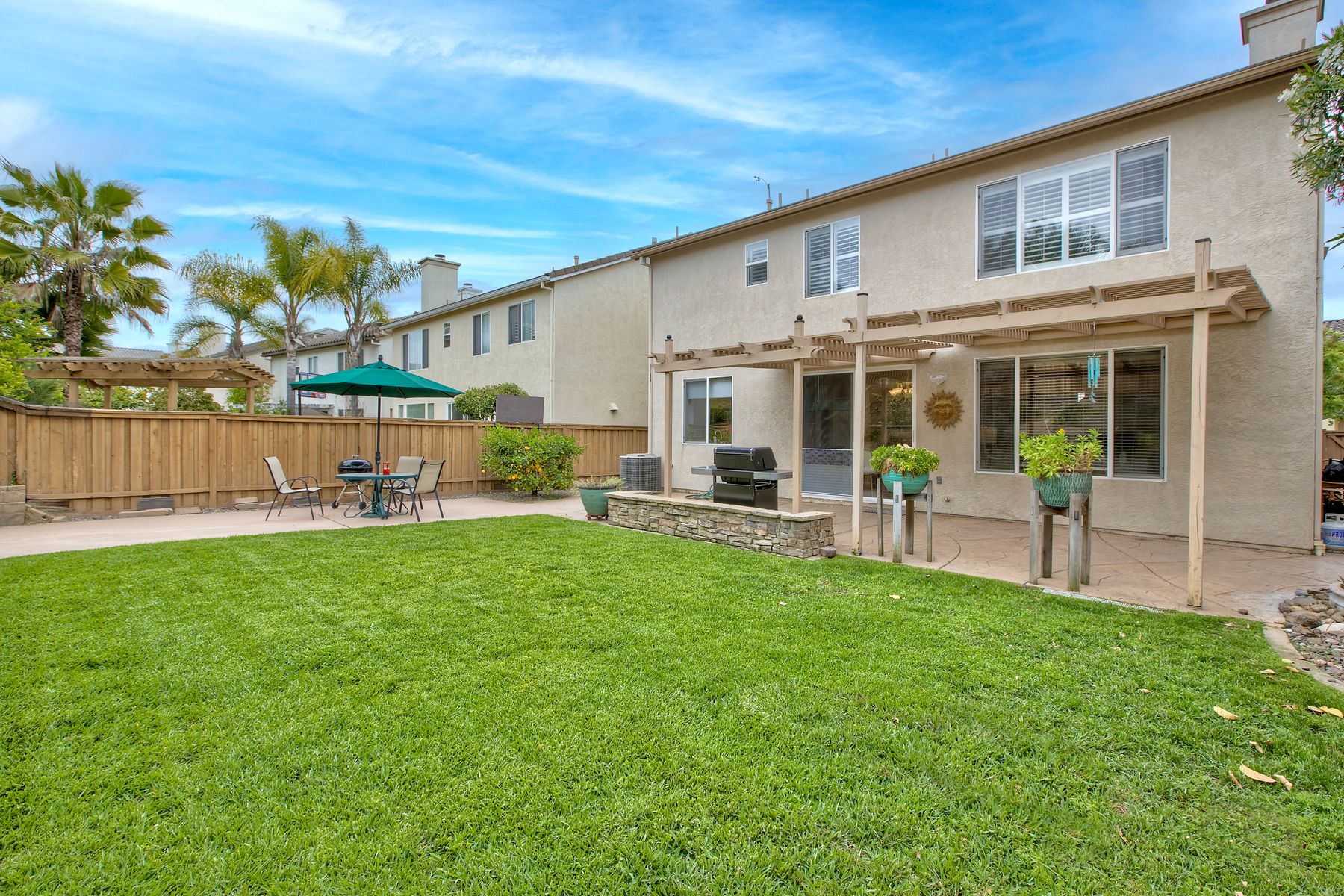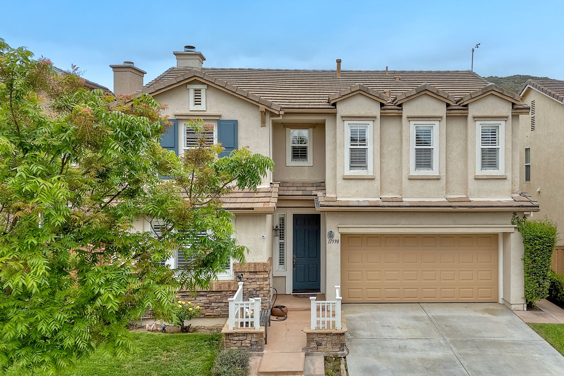 Welcome to the beautiful Morningside subdivision in Sabre Springs! Just a short walk to Creekside Elementary and close to scenic biking and hiking trails, this lovely home features a desirable layout with a downstairs bedroom and full bathroom, plus three additional bedrooms upstairs. A spacious loft provides flexibility for an additional living area, home office, or gym. The remodeled kitchen is a chef’s delight, boasting granite countertops, stainless steel appliances including a Wolf gas cooktop, JennAir convection oven, Bosch dishwasher, and a new GE microwave. The expansive primary suite includes a luxurious bathroom with a separate soaking tub, frameless glass shower with custom tile surround, dual vanity sinks, and a walk-in closet with custom organizers. Additional highlights include a whole-house fan, convenient upstairs laundry room, remodeled guest bathroom, plantation shutters, travertine tile flooring in a diamond pattern, and a cozy fireplace in the family room. This well-maintained home features $11,500 in roof repairs completed in 2023, a newer garage door, and a new water heater. You’ll love the interior lot location and beautiful curb appeal. The large backyard is perfect for gardening, relaxing, or entertaining, with multiple sitting areas featuring stamped concrete, two pergolas, a spacious lawn, and a tiered slope with stacked-stone planters.