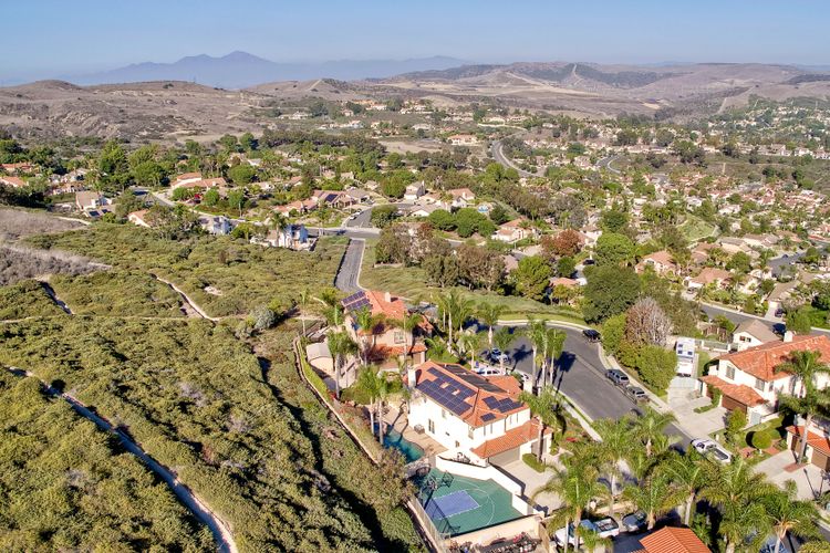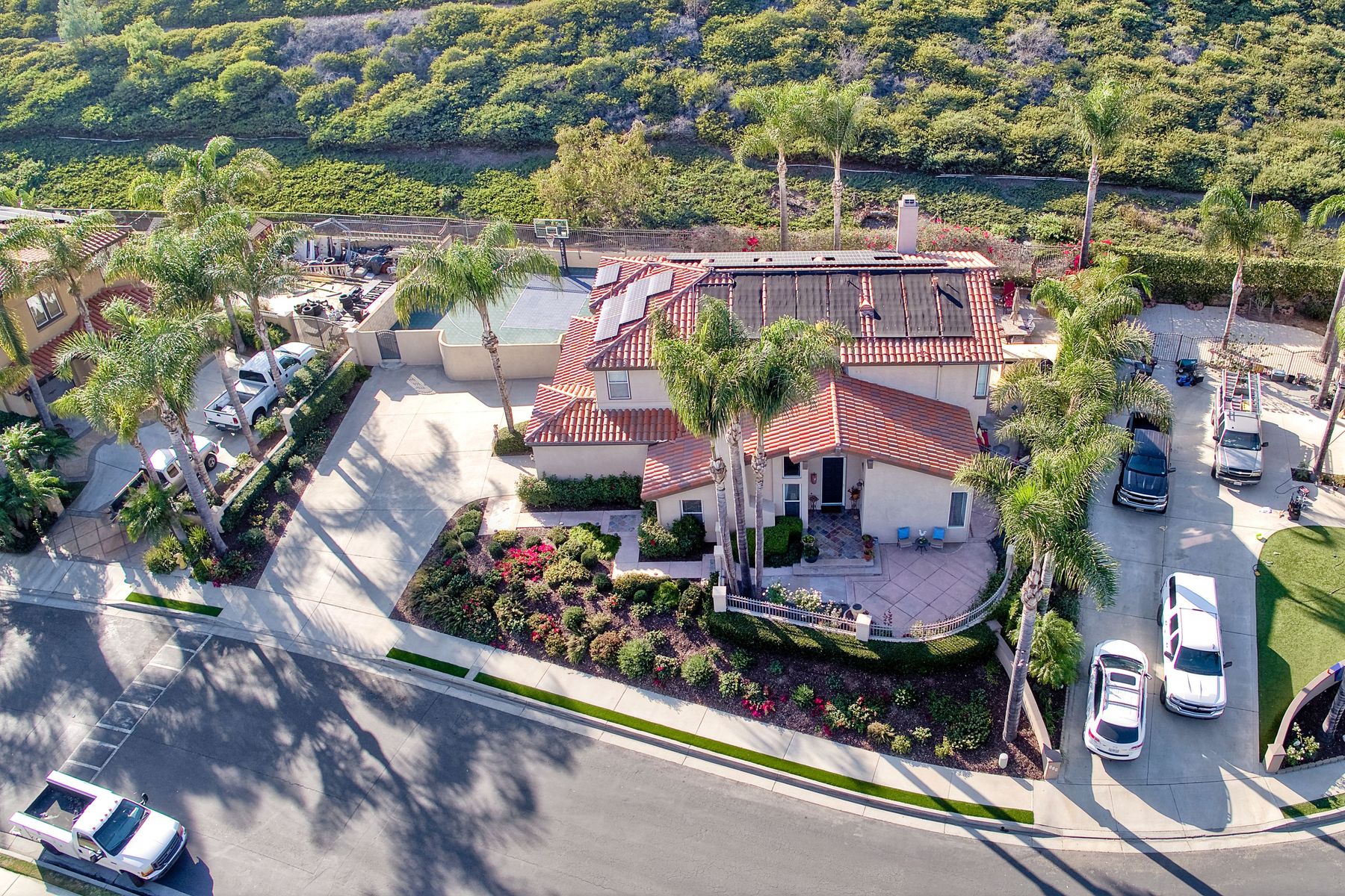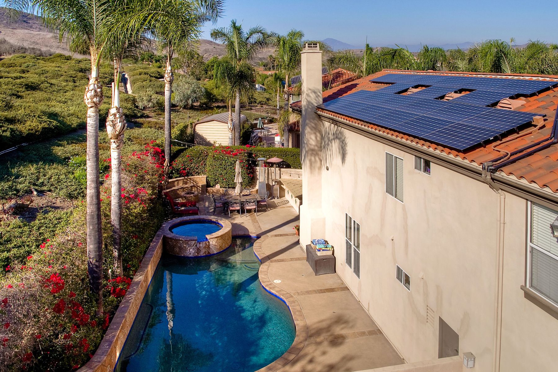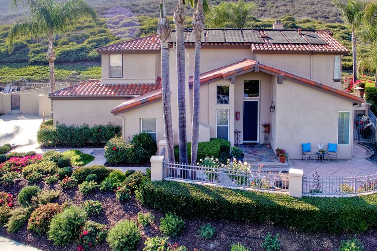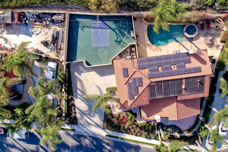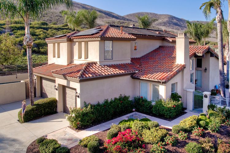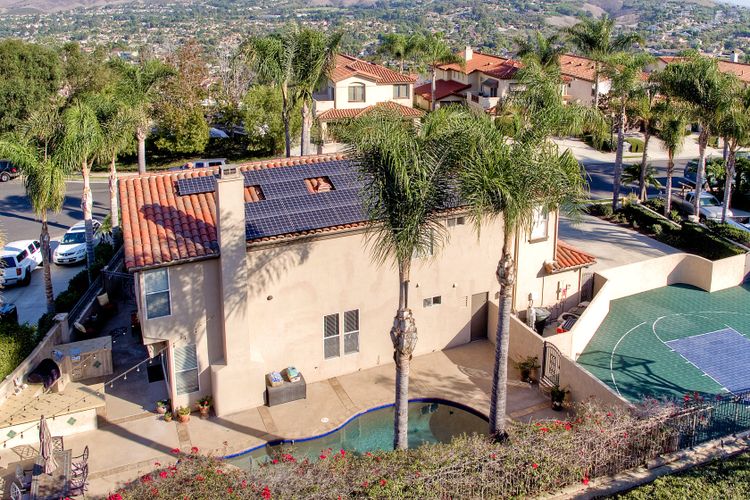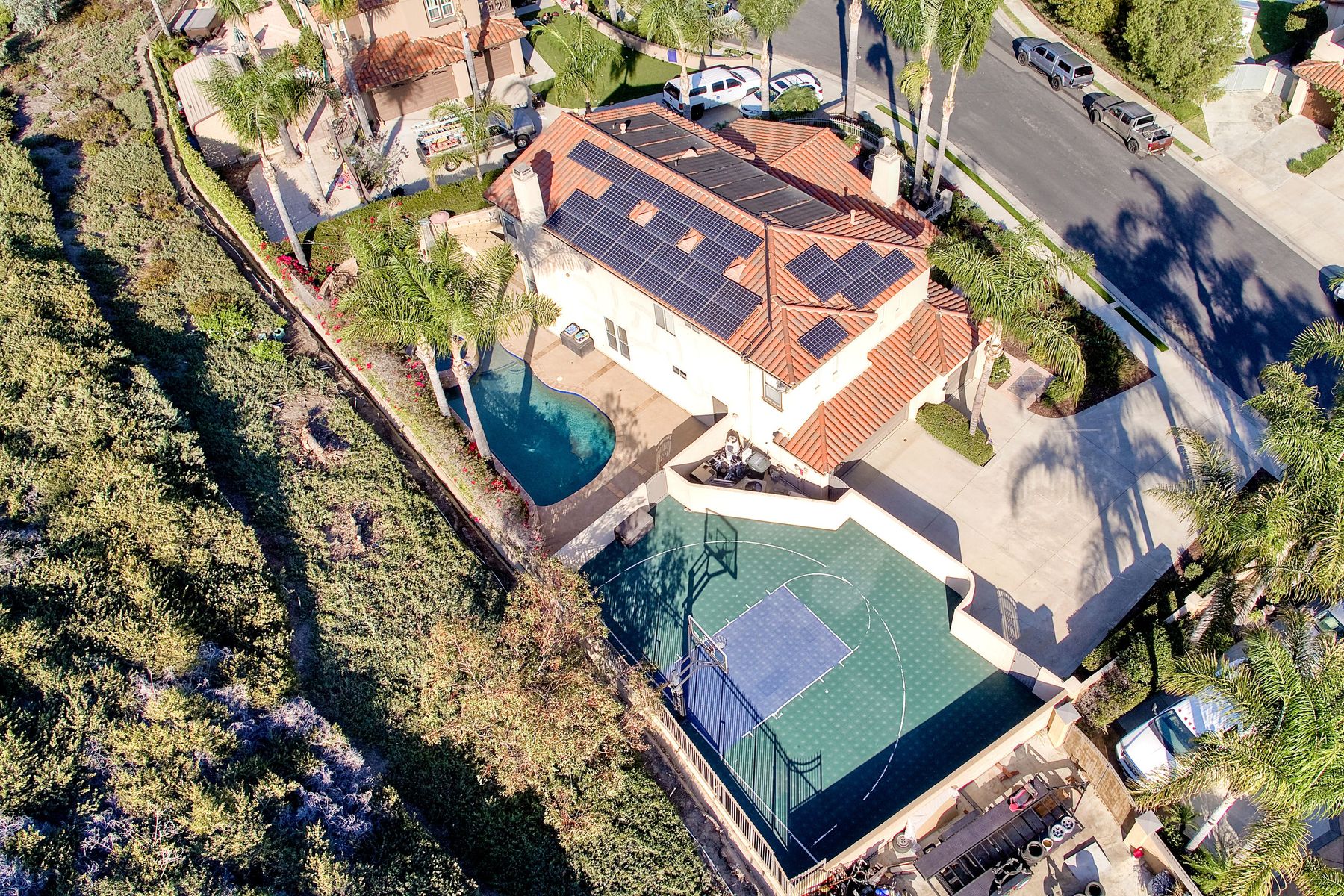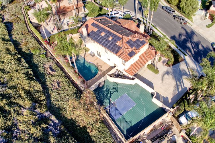 This wonderful home lives like a fully detached single family residence even though zoned condo, and resides on a lot that is over 10,000 SF~ The entry level bedroom- bonus room is currently set up as a home office with built- in desk. Upon entering the home you will notice the high ceilings and tremendous amount of natural light in addition to this property being beautifully maintained and lovingly updated. Additional features include custom closets, window blinds throughout, upgraded hardwood flooring, charming cooks kitchen with an added large center island and granite counter tops, 3 fireplace, air conditioning, OWNED SOLAR for both the pool and house, gorgeous views off of the formal dining room, spacious 3 car garage which includes a quick charge outlet for an electric vehicle, and ample storage. There is additional parking on the extra large drive way that could accommodate an RV. The extra large wrap around yard offers amazing entertaining options which include an outdoor kitchen, lounge area with fire pit, pool, spill over edge spa, water feature, and last but not least a versatile sports court! The gated community and cul de sac location offer tons of privacy. This house is a 10 out of 10 !