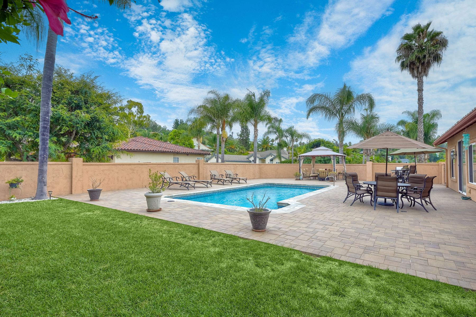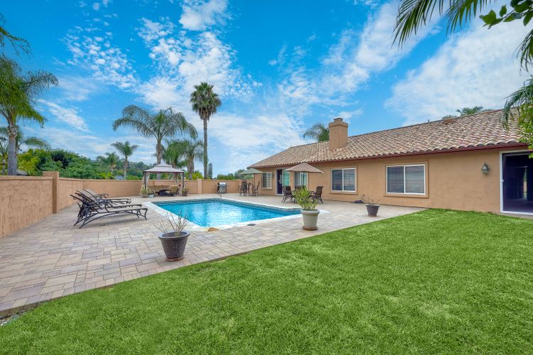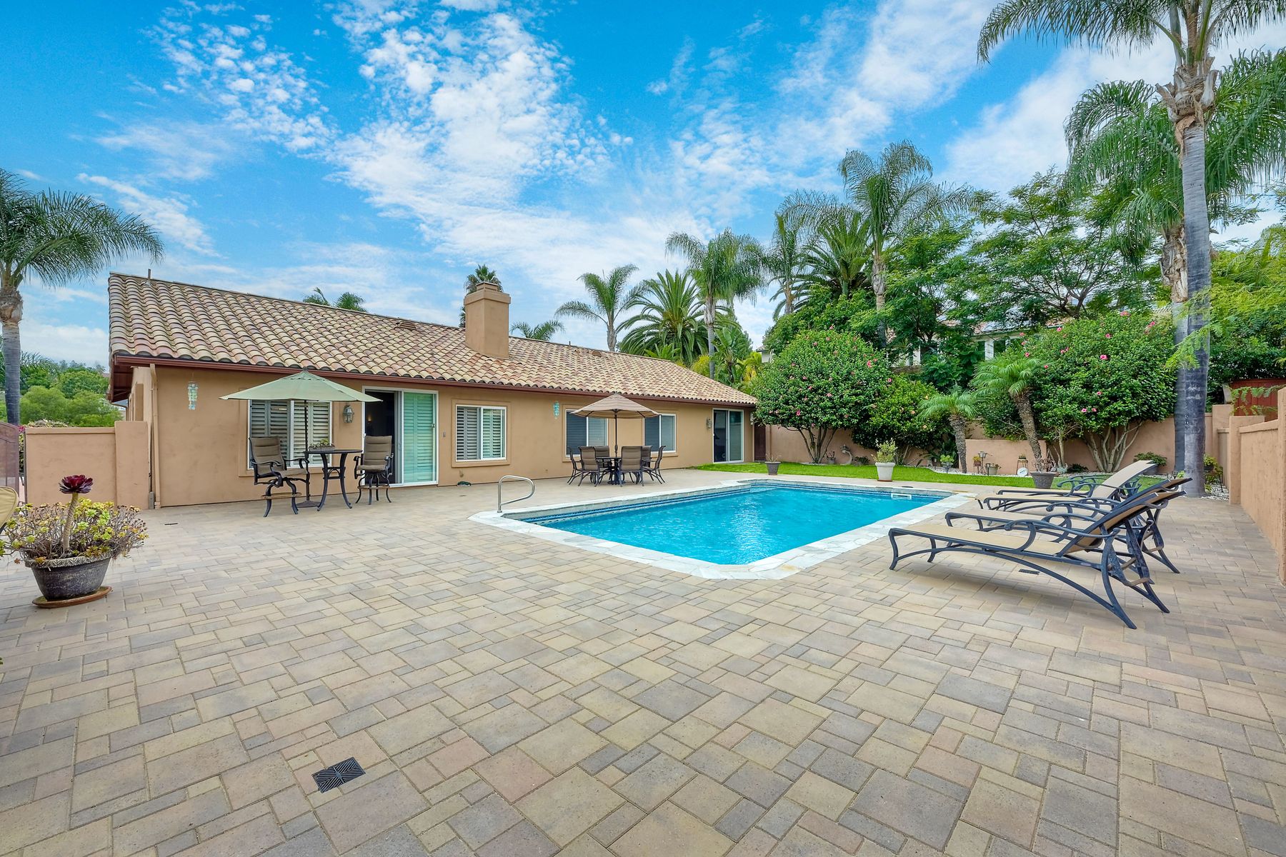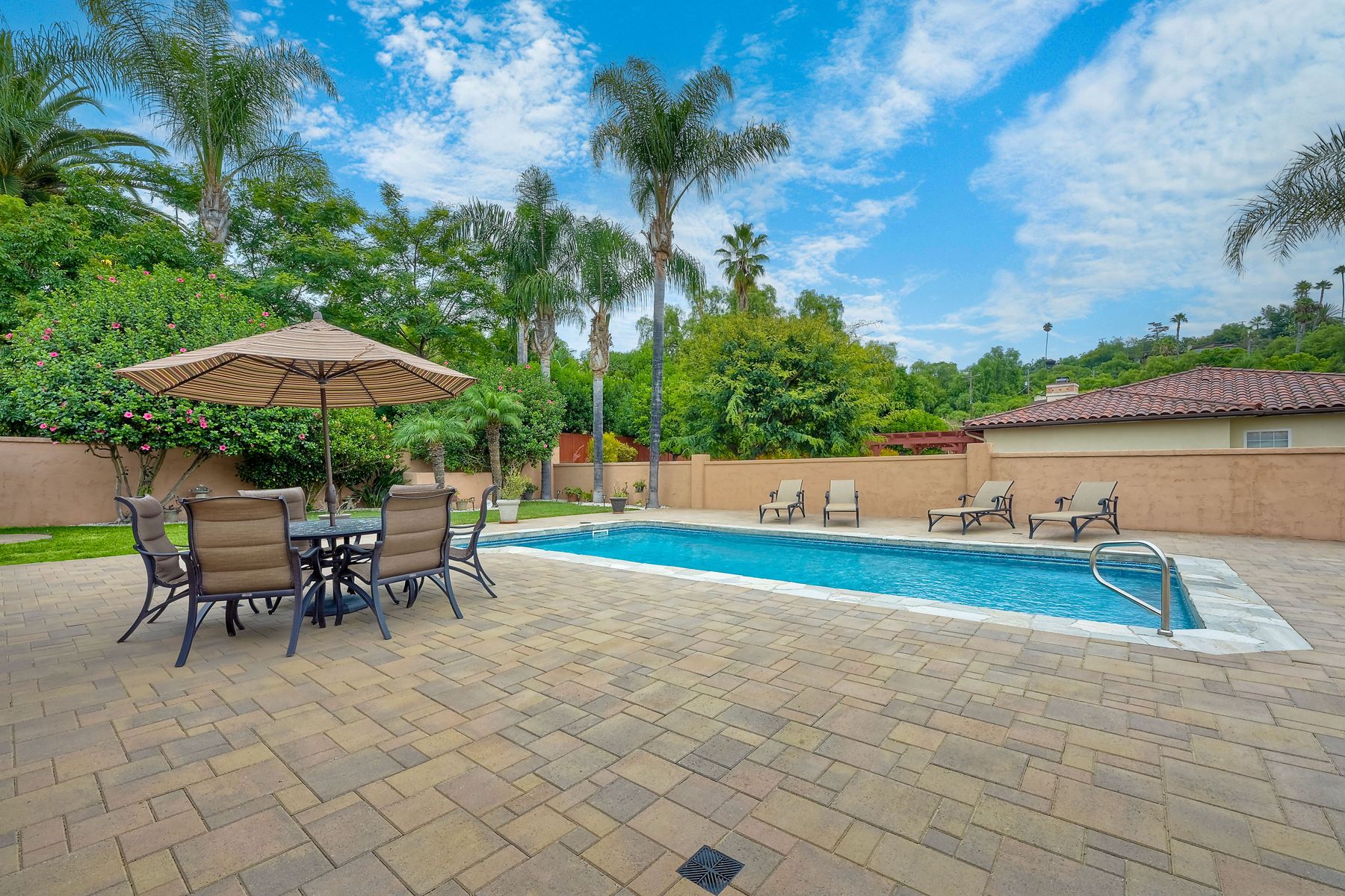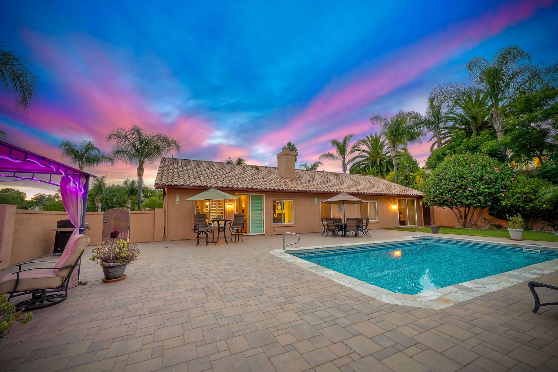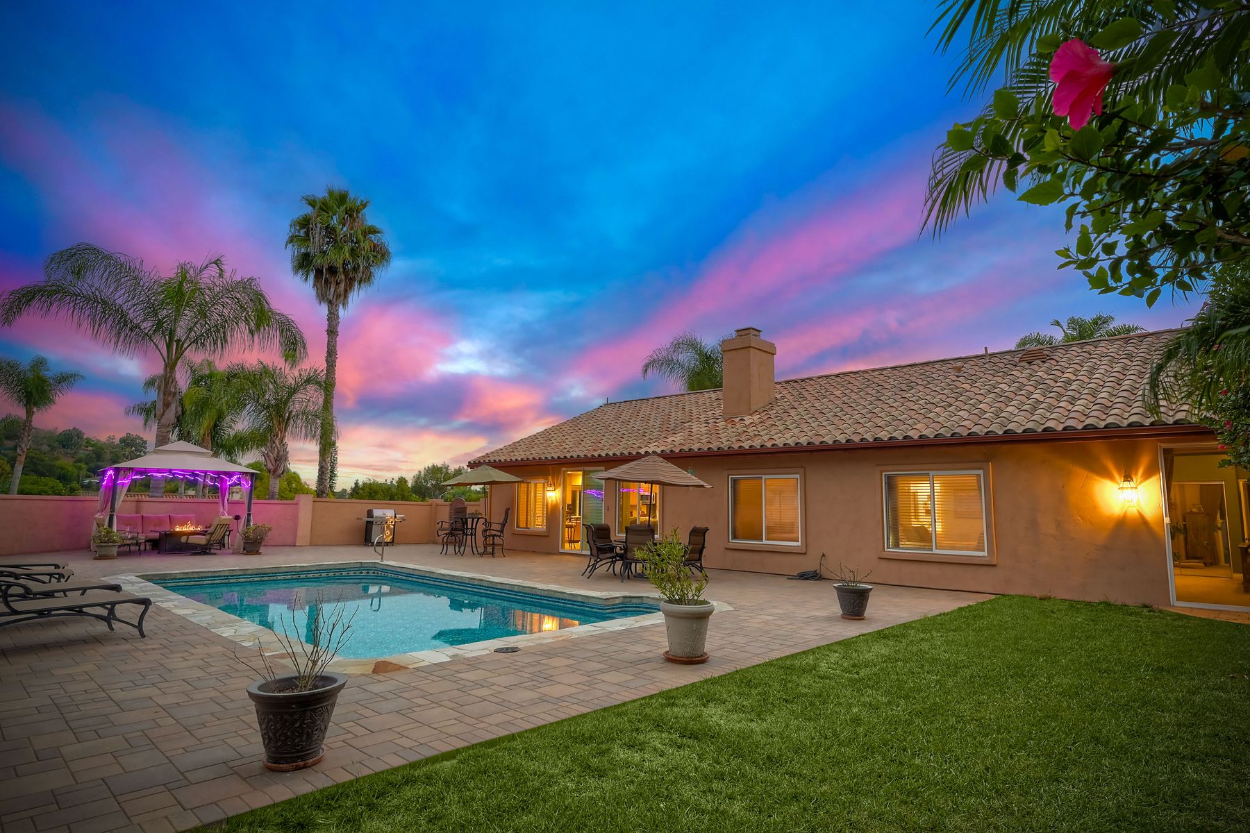 Perched on a thoughtfully landscaped 3/4 acre lot with Southwest views - this lovely single story home invites brilliant sun rises from your backyard and serene sunsets from your kitchen, dining room and living room. A turnkey 4 BR, 3 full bath, 2487 sf home nestled into a quiet neighborhood of just 14 families. Expansive backyard area w/ in-ground pool are perfect for all of the family to enjoy OR for those who love to entertain! In this neighborhood - you feel like you are in the country, yet you are moments from access to Frazier Farms, Sprouts, Cinepolis theater, Moonlight Amphitheater and all of the new shops and restaurants in downtown Vista. Just a ten-minute jaunt to the 78 and less than 9 miles from the coast and all of the amazing downtown Carlsbad shoppes and restaurants. A plethora of revisions over the last 19 years to include a 40k Tuscan Paver patio (2019) in the backyard, new 18' ceramic tile in all main living areas(2019), new carpet in BR's(2022) and all new Samsung stainless steels appliances (2022). In addition, driveway has been sealed with Sundek coating and exterior has been painted (2023). Entertainers kitchen w/ an abundance of storage! Merillat maple cabinetry, granite counters and center island open to family room and easy access to your backyard haven. Plantation shutters and silhouette blinds enable you to create a subdued ambiance or invite as much of the outdoors in as you would like. 3-car garage with abundant storage, 5-yrs old water heater, access to park an RV and the possibilities of a small ADU in the front yard area.