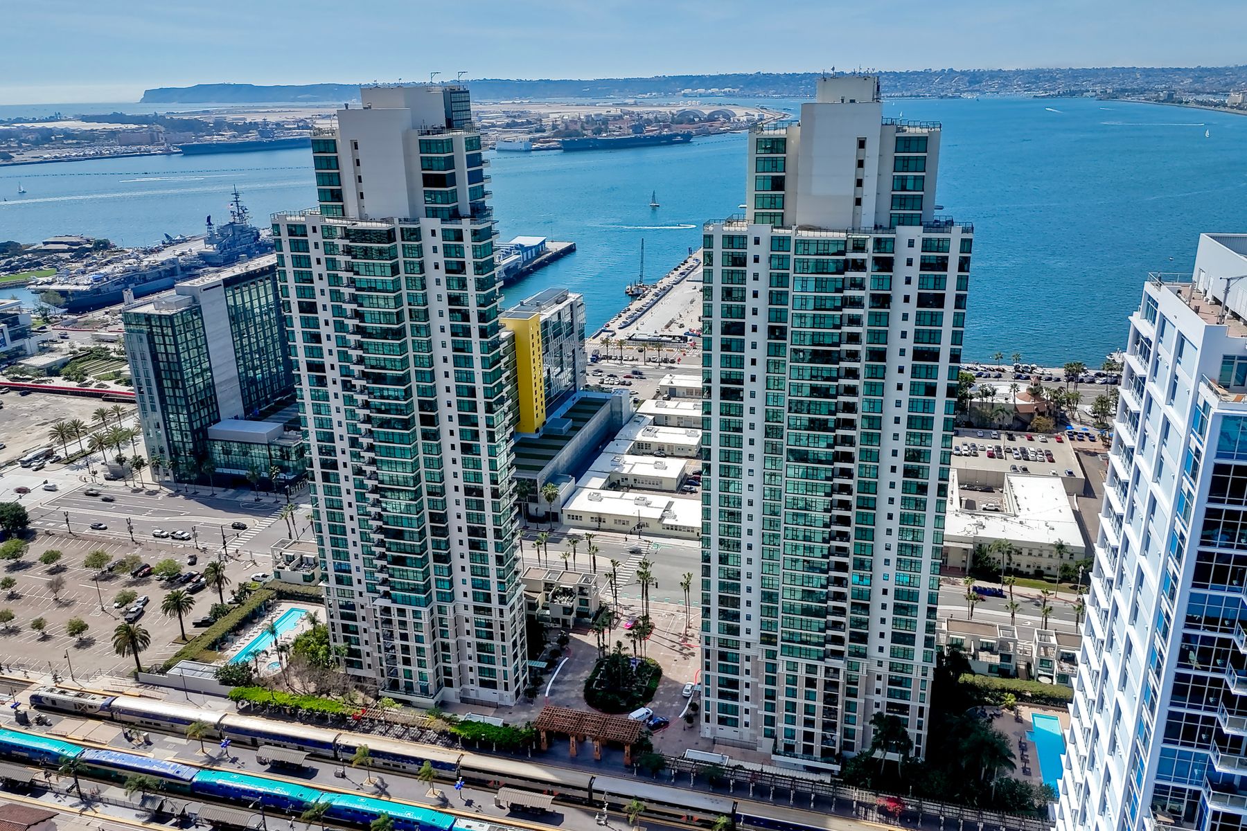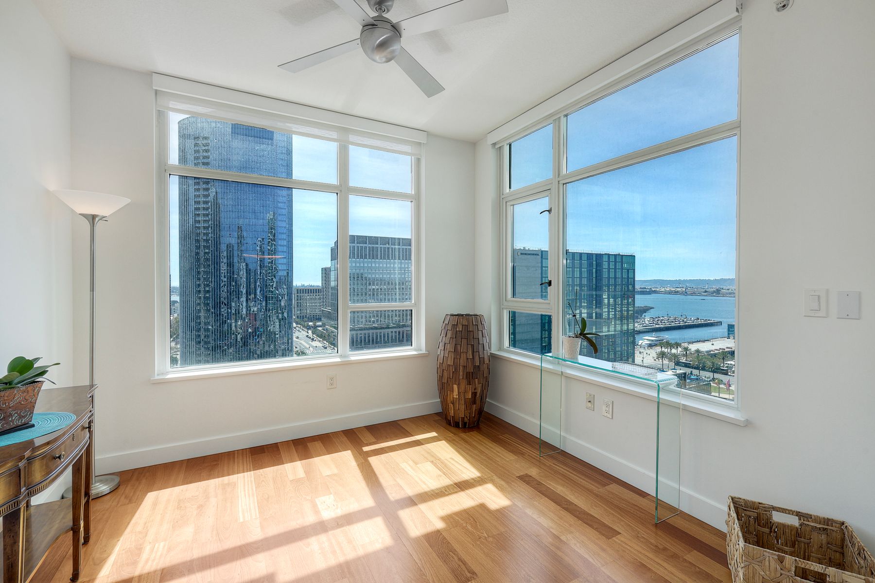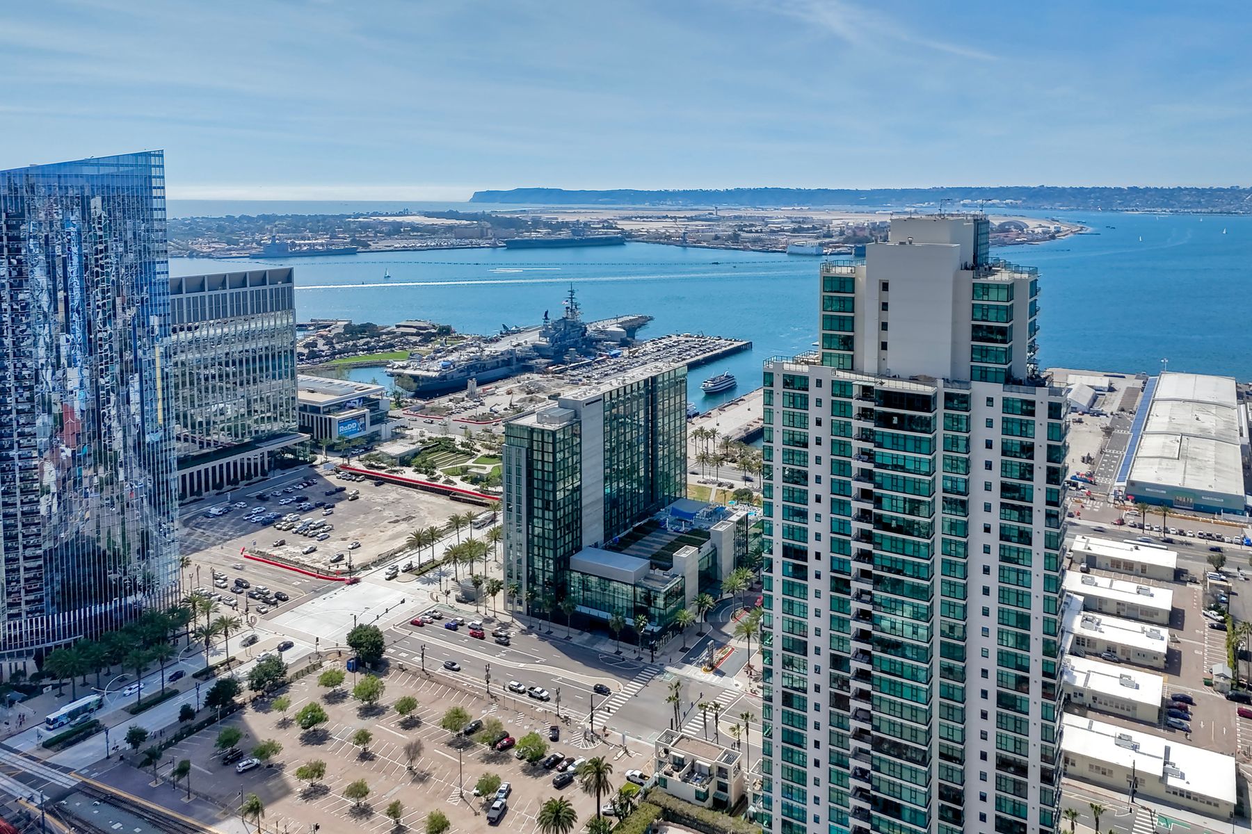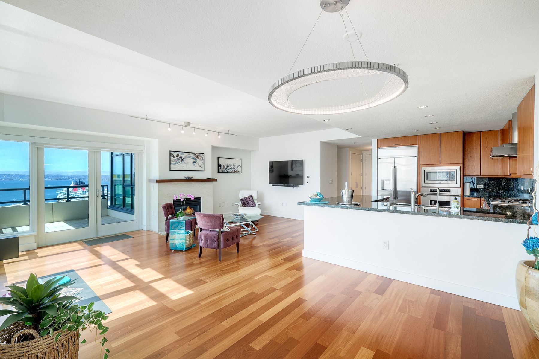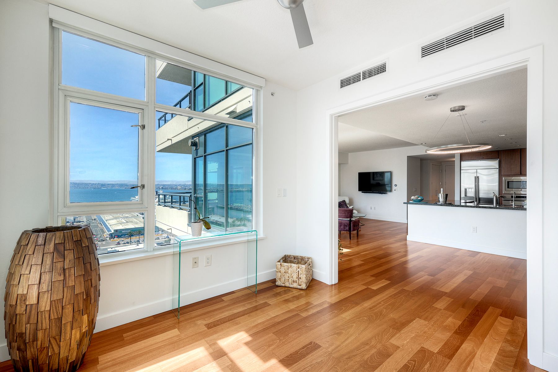 Elegant ocean and bay view residence in Grande South featuring the most desirable floorplan with two bedrooms plus a bonus room. Situated on the 18th floor, the home offers unobstructed southwest-facing views of San Diego Bay, the Pacific Ocean, and the city skyline. Refined interiors include a spacious primary suite, hardwood floors throughout, a cozy fireplace, Nest thermostats, battery-operated window shades, and a gourmet kitchen with a new GE Monogram refrigerator. The expansive balcony extends the living space and provides the perfect setting to enjoy panoramic views and sunsets. 2 side by side parking spaces. Grande South amenities include 24-hour concierge service, meeting room, party room and lounge with full kitchen and fireplace, visitor’s suite for guests, landscaped gardens, private tree-lined courtyards, individual storage lockers, bicycle storage, an 80-foot outdoor swimming pool, whirlpool spa, sauna and steam rooms, changing rooms with lockers, and a fully equipped exercise room. Floor plan is in associated documents. Seller will consider Seller Financing.