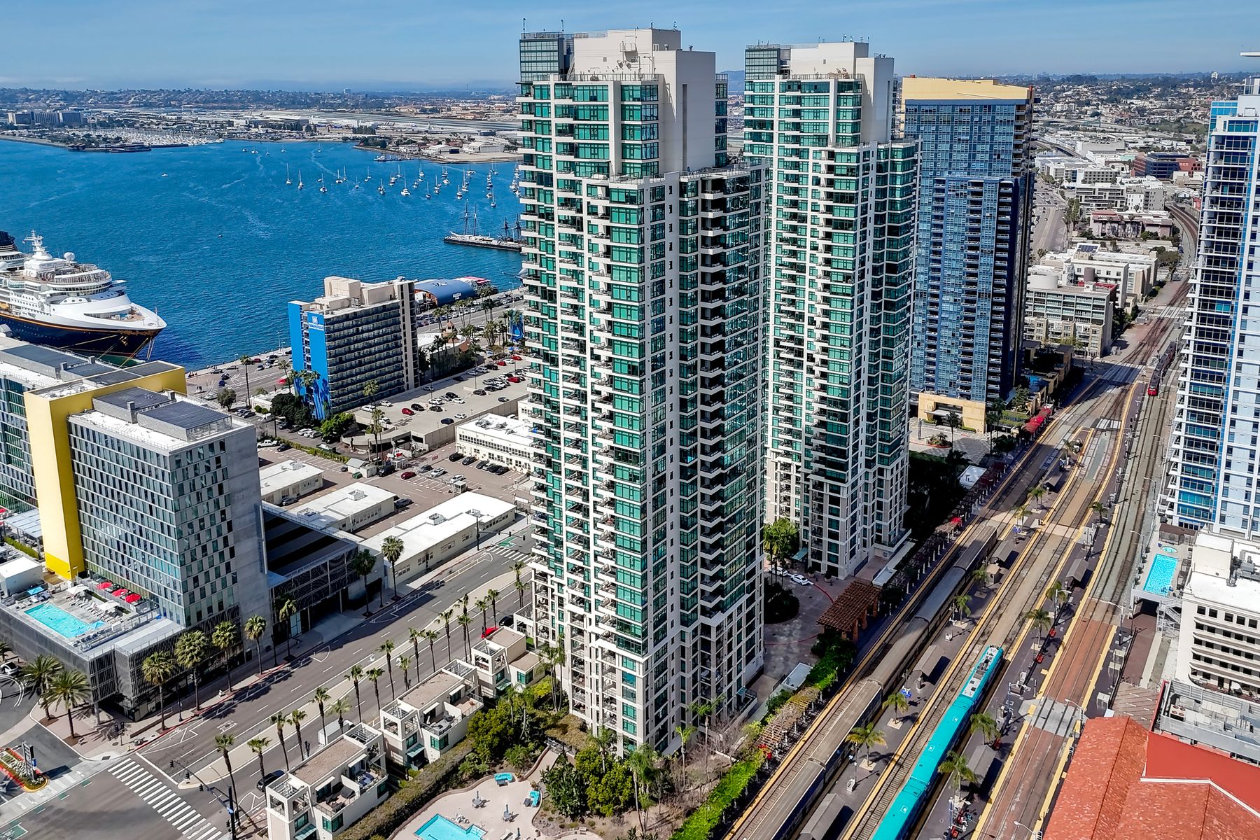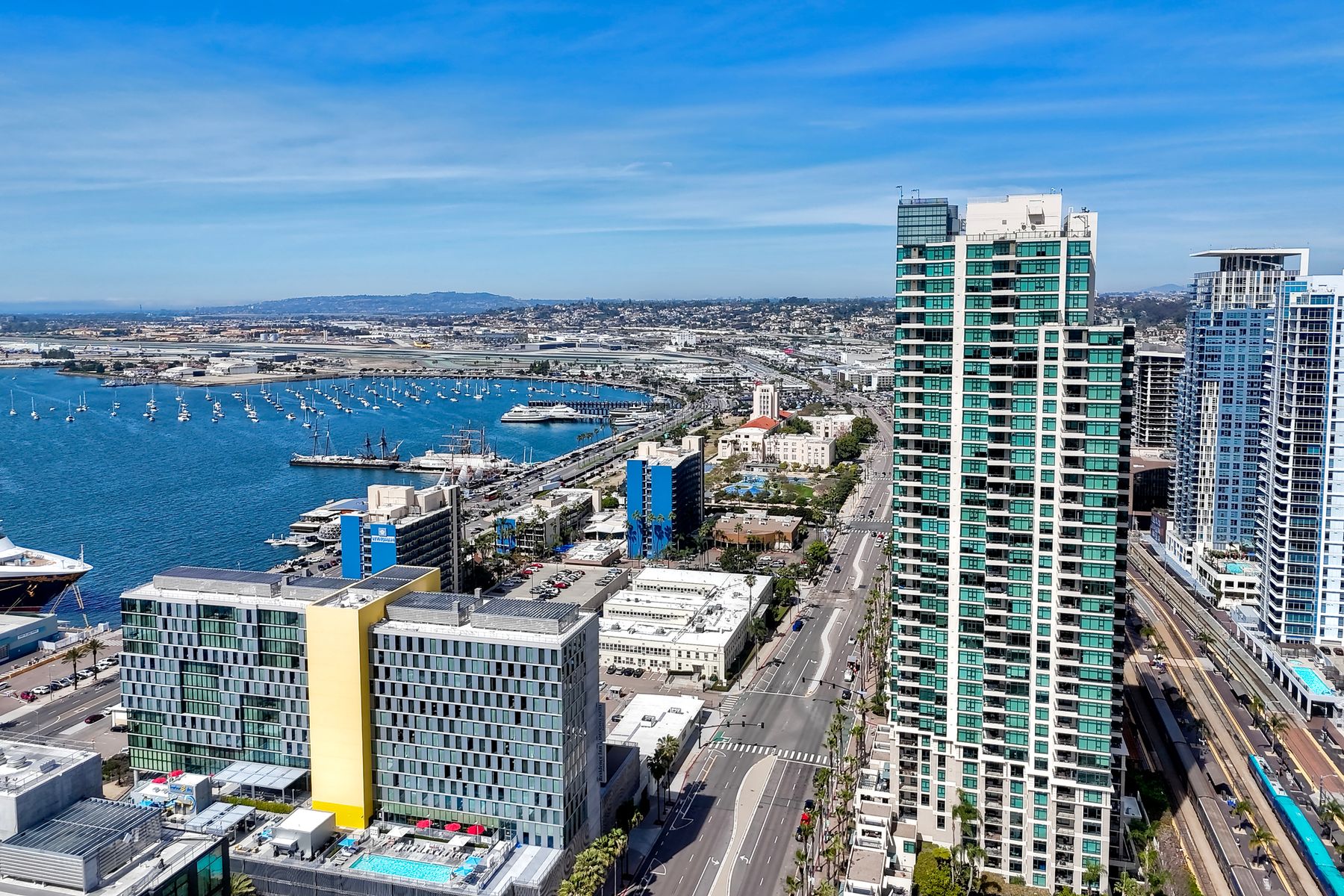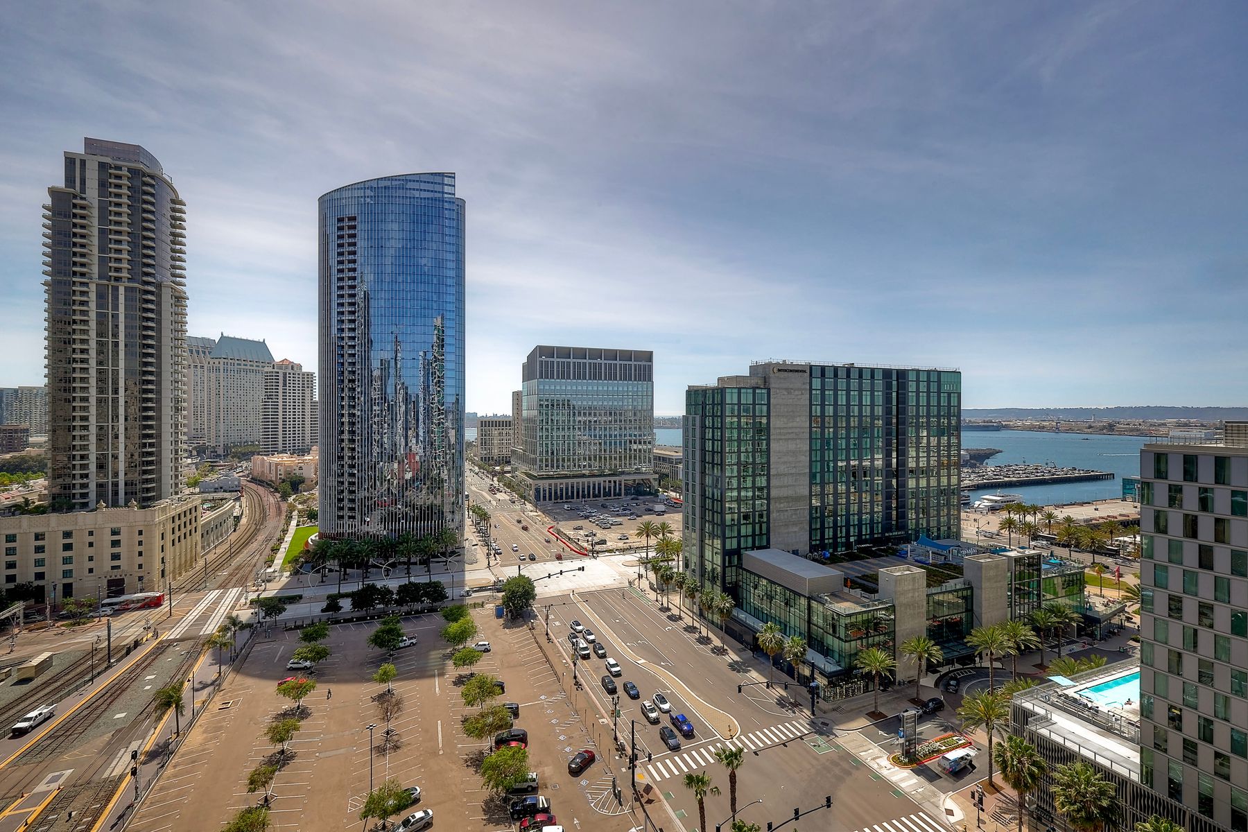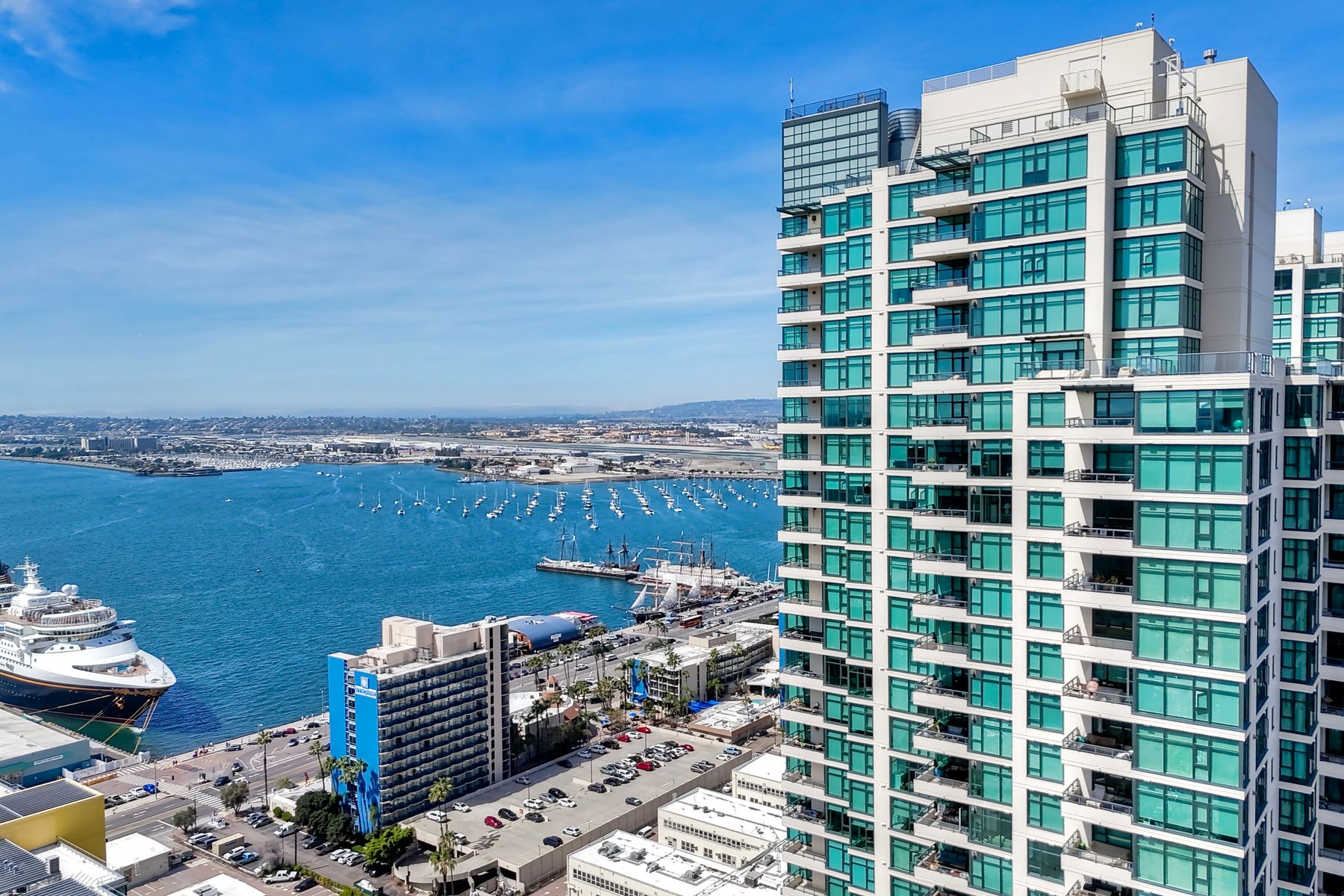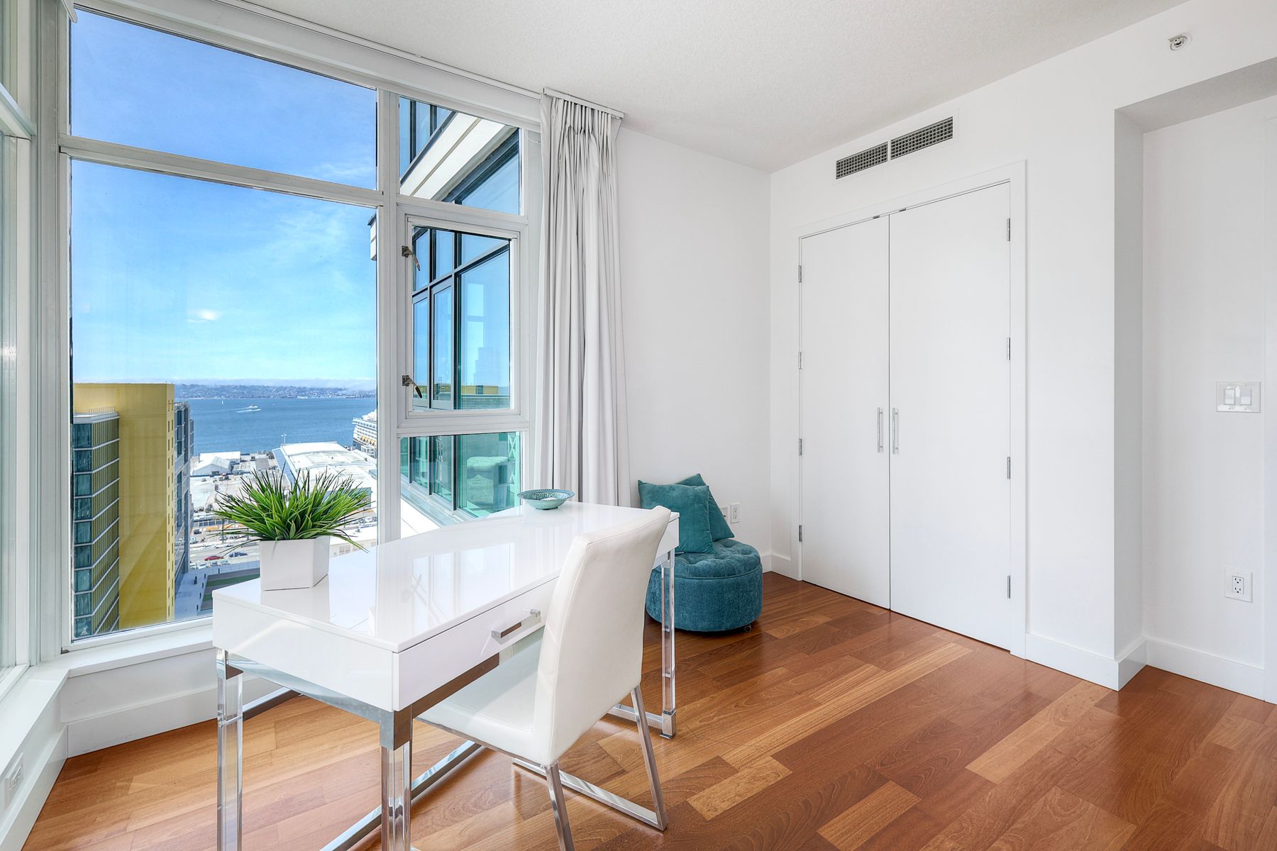 Elegant ocean and bay view residence in Grande South featuring the most desirable floorplan with two bedrooms plus a bonus room. Situated on the 18th floor, the home offers unobstructed southwest-facing views of San Diego Bay, the Pacific Ocean, and the city skyline. Refined interiors include a spacious primary suite, hardwood floors throughout, a cozy fireplace, Nest thermostats, battery-operated window shades, and a gourmet kitchen with a new GE Monogram refrigerator. The expansive balcony extends the living space and provides the perfect setting to enjoy panoramic views and sunsets. 2 side by side parking spaces. Grande South amenities include 24-hour concierge service, meeting room, party room and lounge with full kitchen and fireplace, visitor’s suite for guests, landscaped gardens, private tree-lined courtyards, individual storage lockers, bicycle storage, an 80-foot outdoor swimming pool, whirlpool spa, sauna and steam rooms, changing rooms with lockers, and a fully equipped exercise room. Floor plan is in associated documents. Seller will consider Seller Financing.