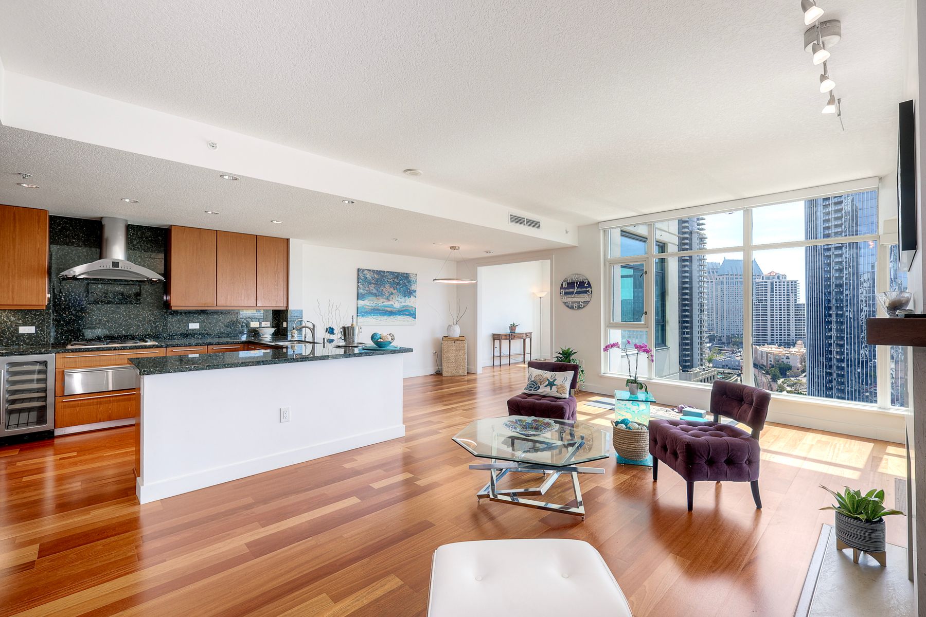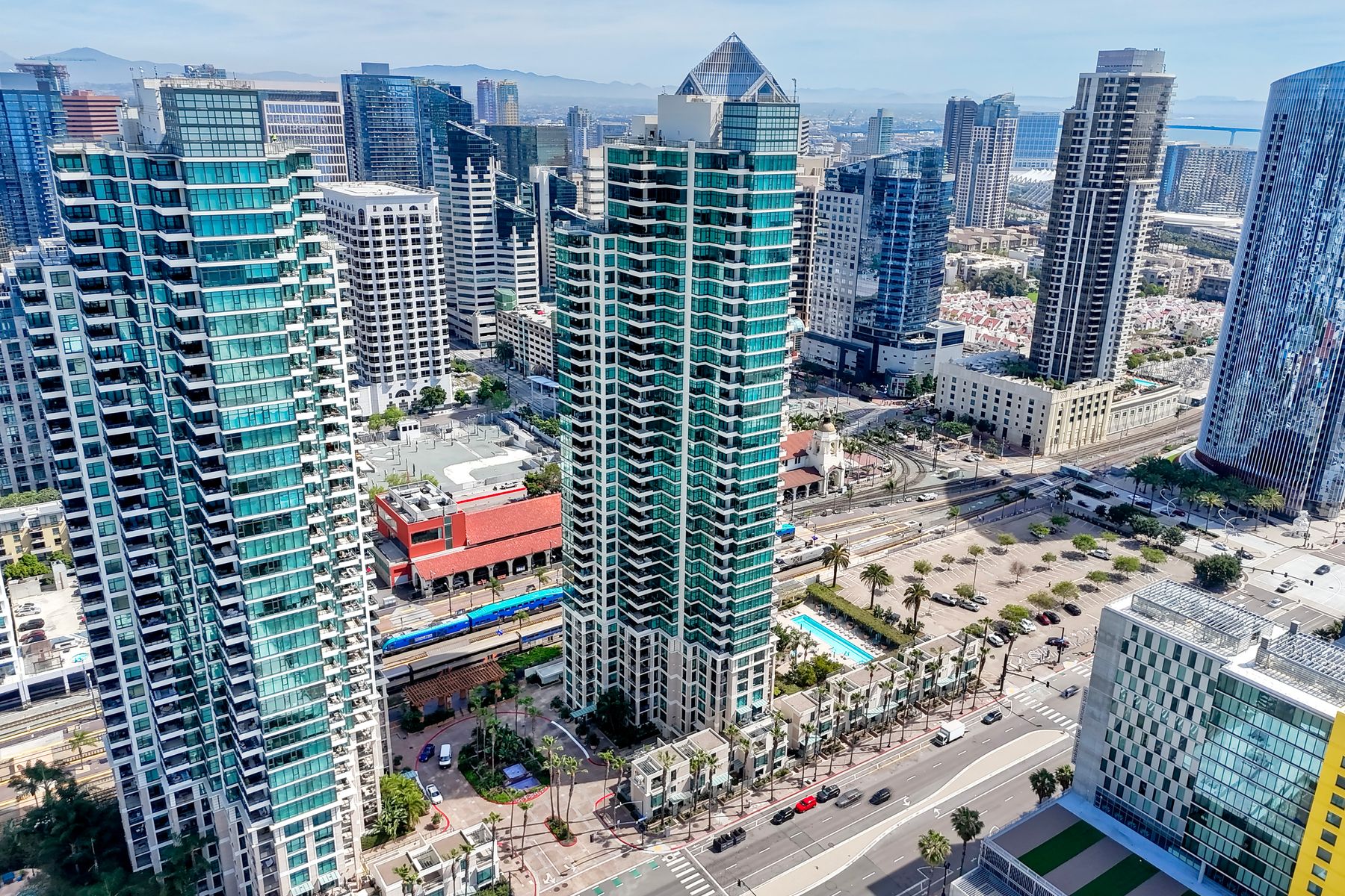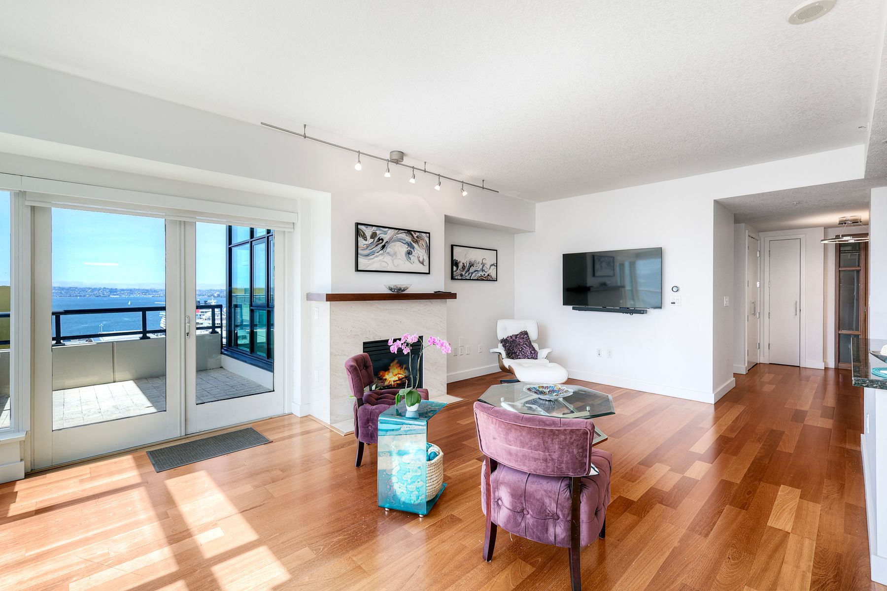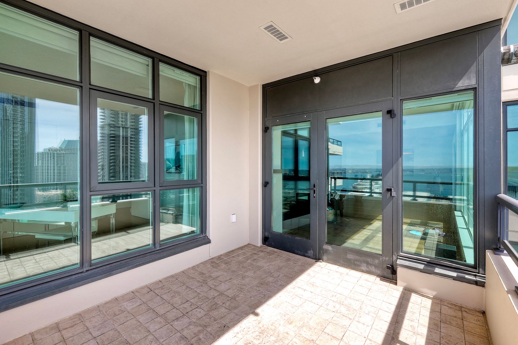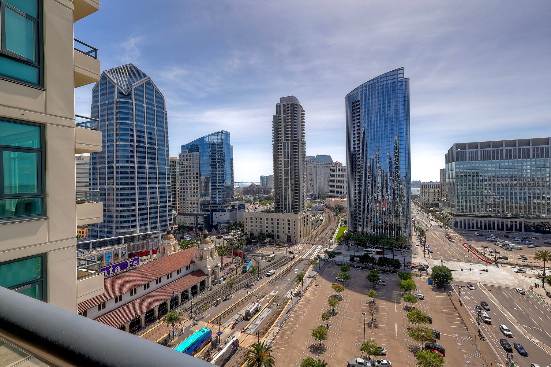 Elegant ocean and bay view residence in Grande South featuring the most desirable floorplan with two bedrooms plus a bonus room. Situated on the 18th floor, the home offers unobstructed southwest-facing views of San Diego Bay, the Pacific Ocean, and the city skyline. Refined interiors include a spacious primary suite, hardwood floors throughout, a cozy fireplace, Nest thermostats, battery-operated window shades, and a gourmet kitchen with a new GE Monogram refrigerator. The expansive balcony extends the living space and provides the perfect setting to enjoy panoramic views and sunsets. 2 side by side parking spaces. Grande South amenities include 24-hour concierge service, meeting room, party room and lounge with full kitchen and fireplace, visitor’s suite for guests, landscaped gardens, private tree-lined courtyards, individual storage lockers, bicycle storage, an 80-foot outdoor swimming pool, whirlpool spa, sauna and steam rooms, changing rooms with lockers, and a fully equipped exercise room. Floor plan is in associated documents. Seller will consider Seller Financing.