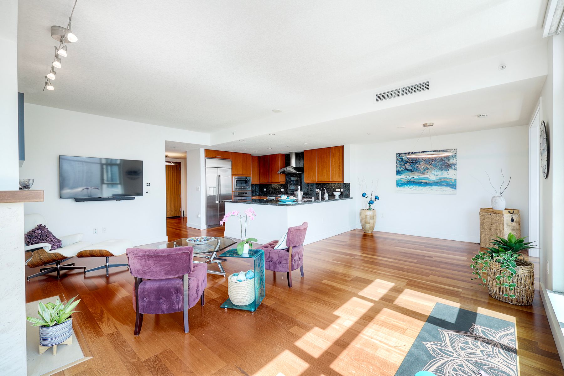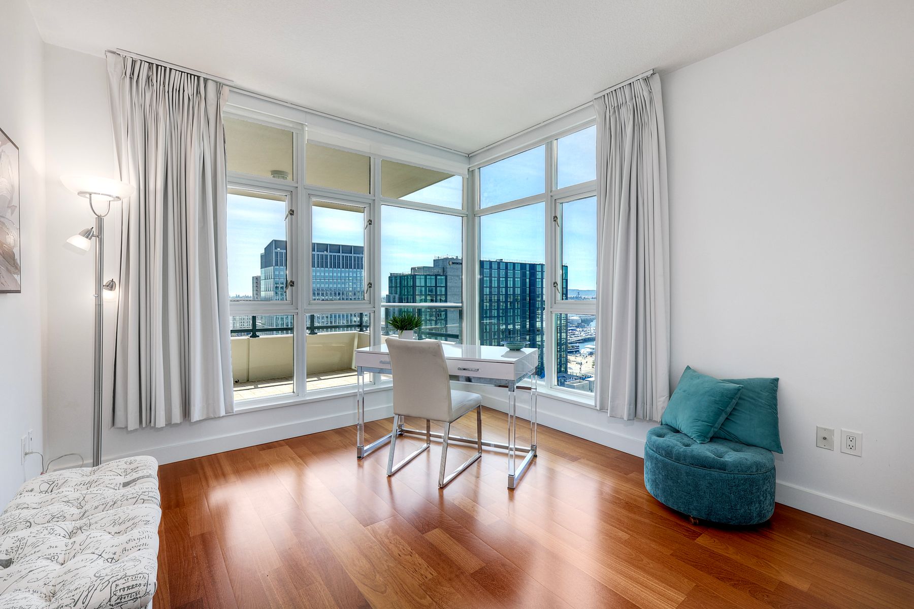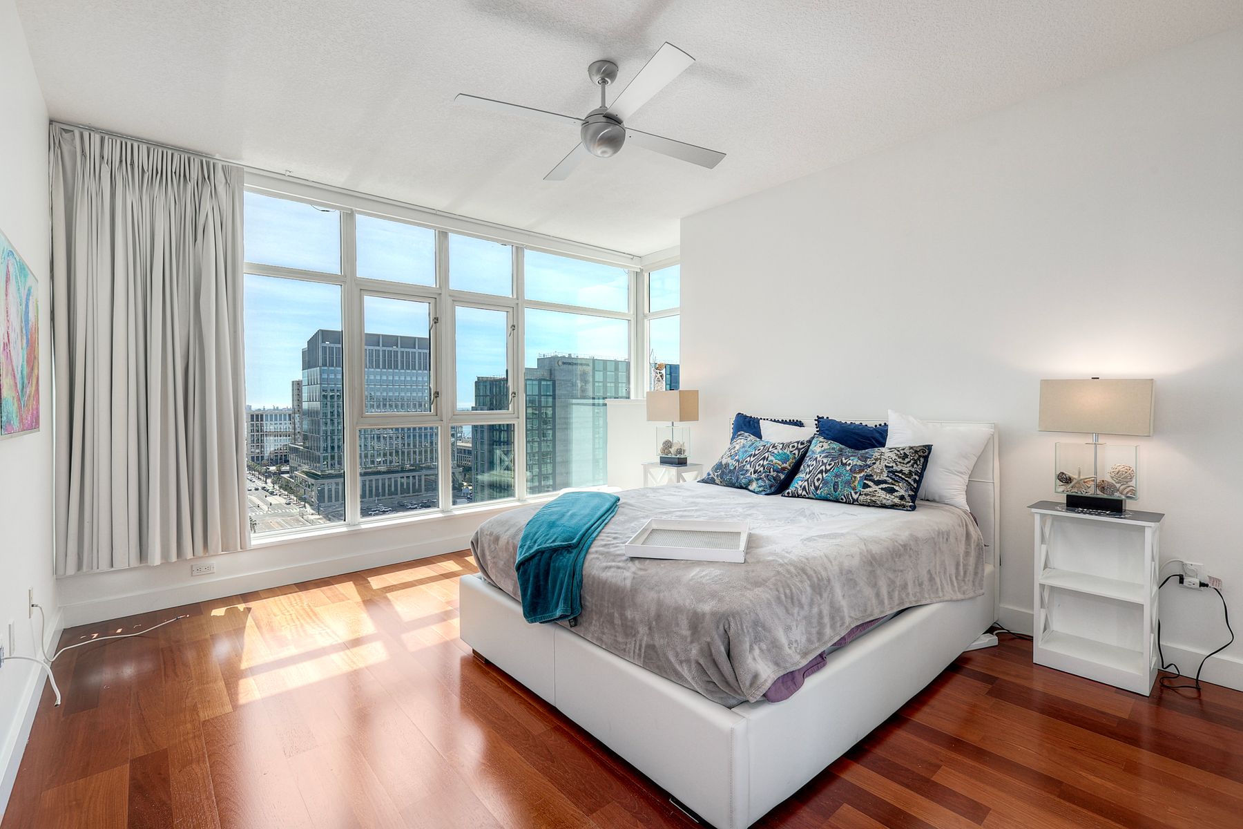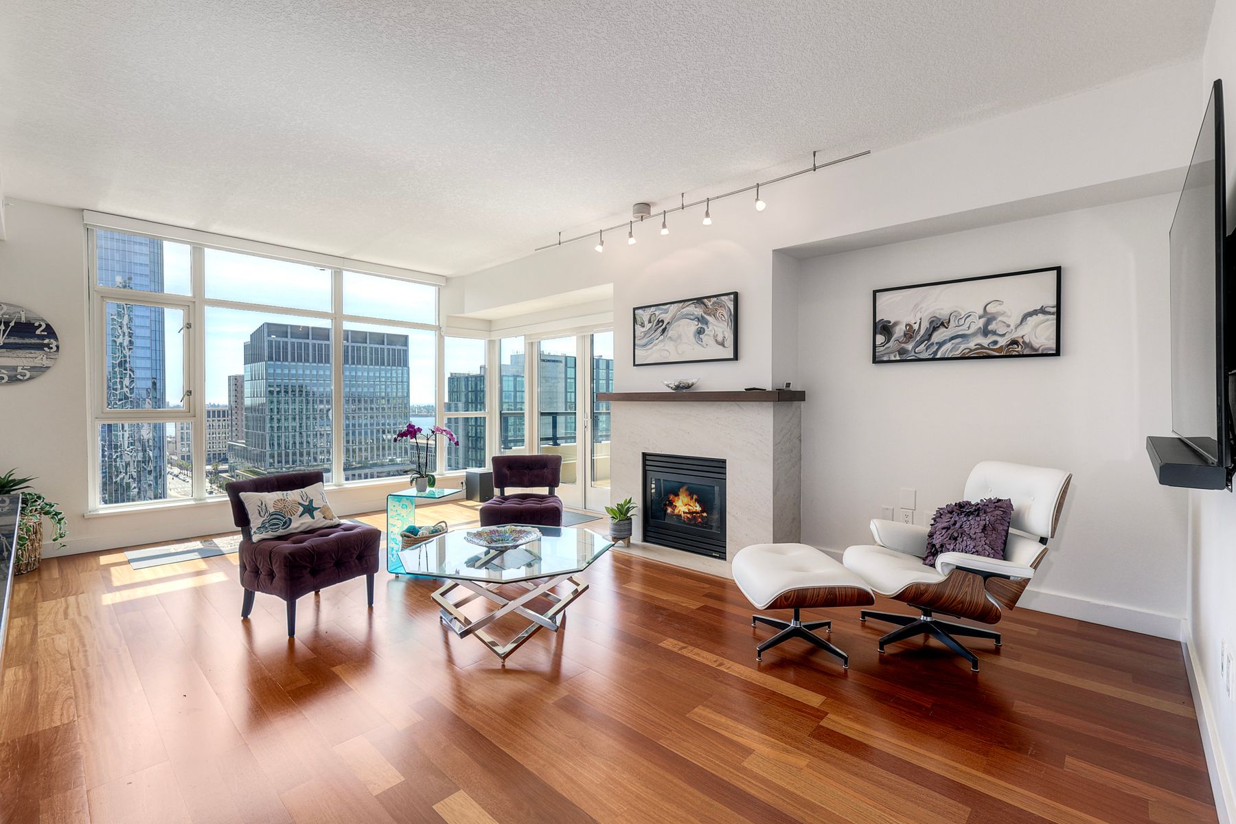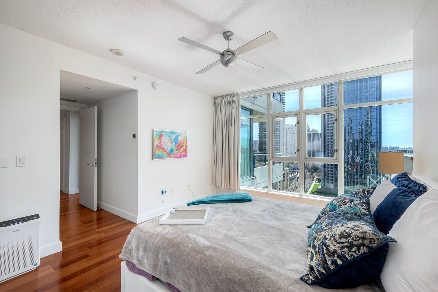 Elegant ocean and bay view residence in Grande South featuring the most desirable floorplan with two bedrooms plus a bonus room. Situated on the 18th floor, the home offers unobstructed southwest-facing views of San Diego Bay, the Pacific Ocean, and the city skyline. Refined interiors include a spacious primary suite, hardwood floors throughout, a cozy fireplace, Nest thermostats, battery-operated window shades, and a gourmet kitchen with a new GE Monogram refrigerator. The expansive balcony extends the living space and provides the perfect setting to enjoy panoramic views and sunsets. 2 side by side parking spaces. Grande South amenities include 24-hour concierge service, meeting room, party room and lounge with full kitchen and fireplace, visitor’s suite for guests, landscaped gardens, private tree-lined courtyards, individual storage lockers, bicycle storage, an 80-foot outdoor swimming pool, whirlpool spa, sauna and steam rooms, changing rooms with lockers, and a fully equipped exercise room. Floor plan is in associated documents. Seller will consider Seller Financing.