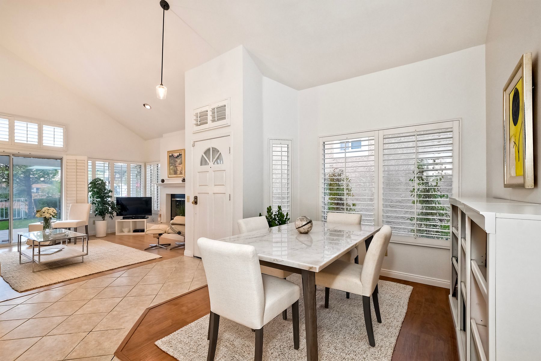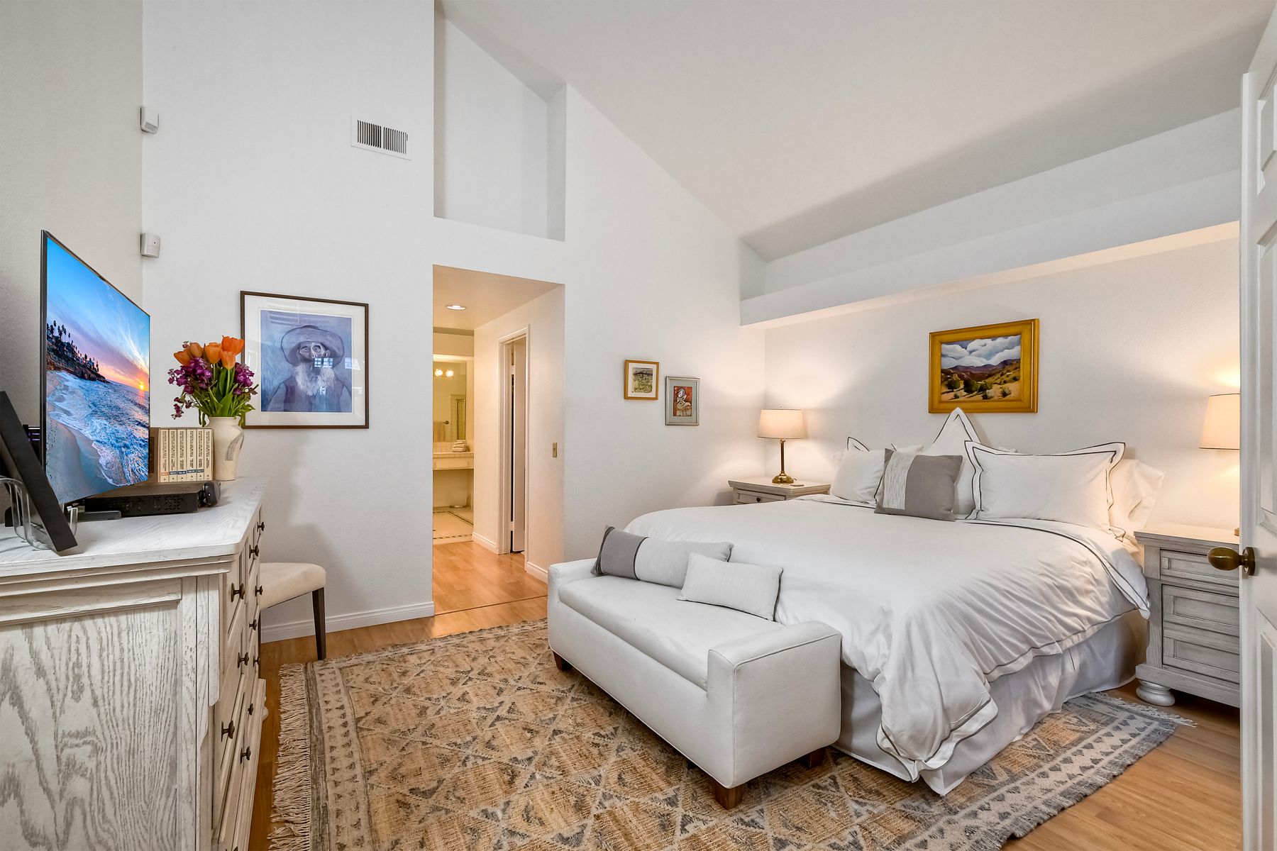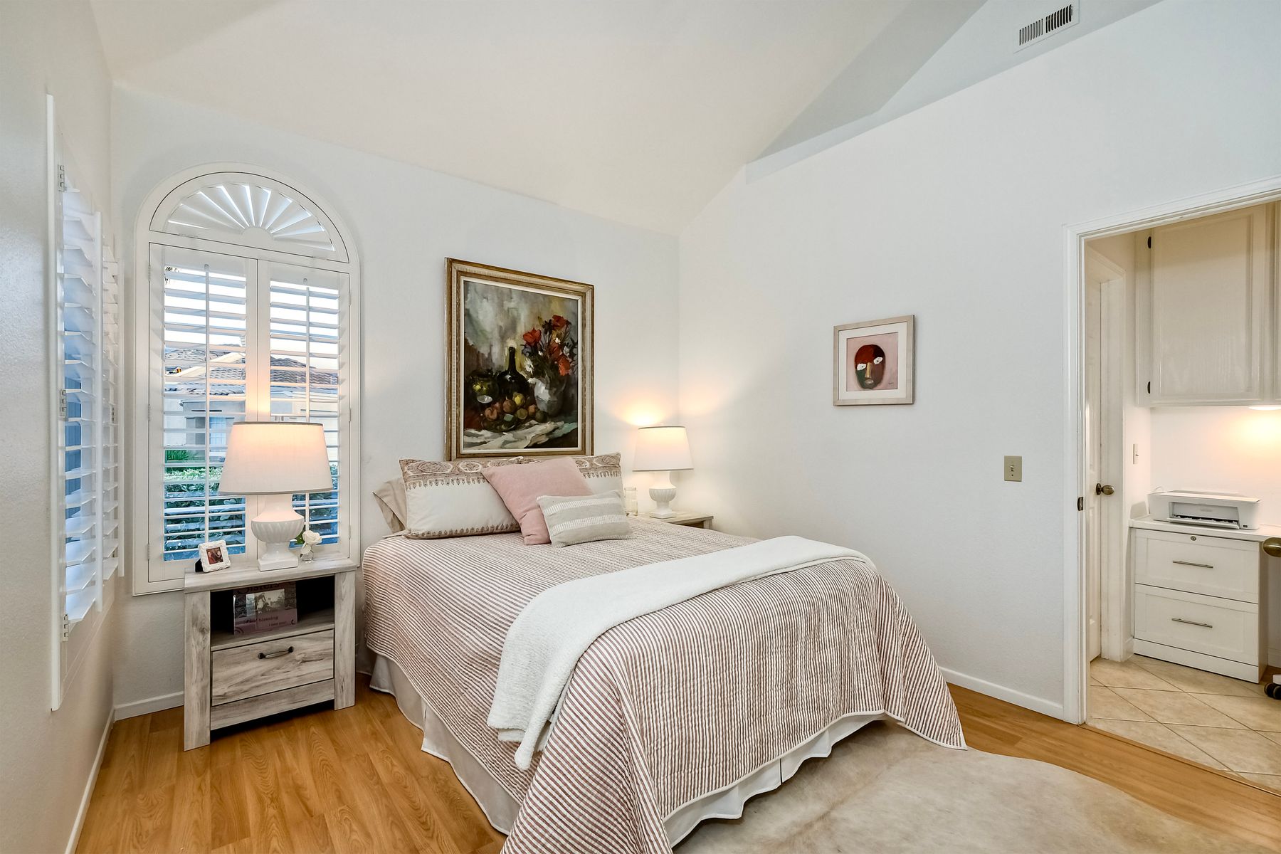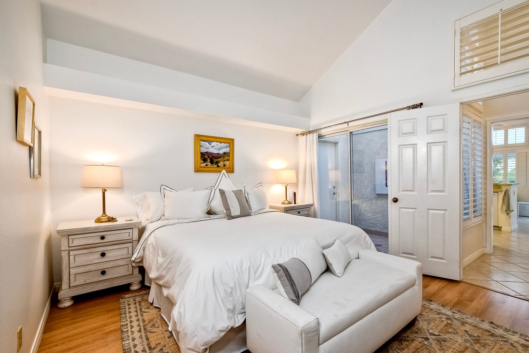 Welcome to the prestigious gated community of Masters Hill within Bernardo Heights. The private lot is nestled in a quiet cul-de-sac street within the community featuring plenty of guest parking. Upon entering the home, you are greeted by an open and bright living room space with vaulted ceilings, large windows, fireplace, and beautiful flooring throughout the main living areas. This single level model is rarely available. The 2-bedroom floorplan features a large primary suite, equipped with dual vanities, soaking tub, separate shower, and spacious walk-in closet. The gourmet kitchen is equipped with modern appliances, gas cooking, multi-level custom stone countertop, ample cabinet space, and an expansive eat-in nook to enjoy sunset views over the Golf Club. The low-maintenance backyard is an entertainer’s delight to enjoy views of the golf course, green belt, and surrounding hills. The outdoor space features custom tiles, covered patio area, lush landscaping, and peaceful surroundings of the community. Additional features include a two-car garage, a dedicated laundry room, plantation shutters, and access to resort like amenities such as playground, pools, spa, pickleball, tennis courts, and fitness center located at the Bernardo Heights Community Center. Walking distance to award winning schools, shopping, dining, parks and recreational areas, this home offers the perfect blend of luxury, comfort, and convenience. HOA Includes Internet, Cable TV, Pool/Spa, Tennis, Roof Maintenance, Exterior Building Maintenance, Gated Community, Landscaping, Trash, Bernardo Heights Center.