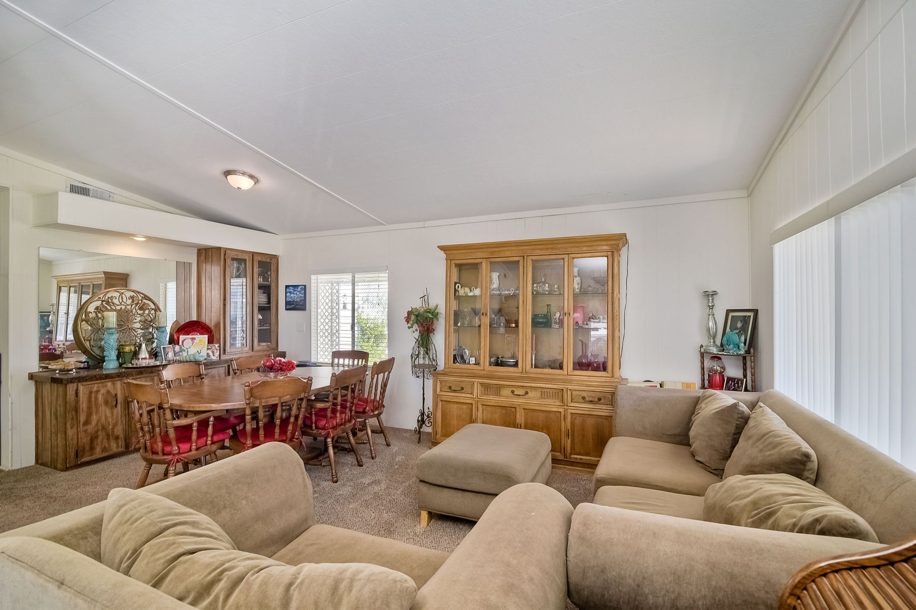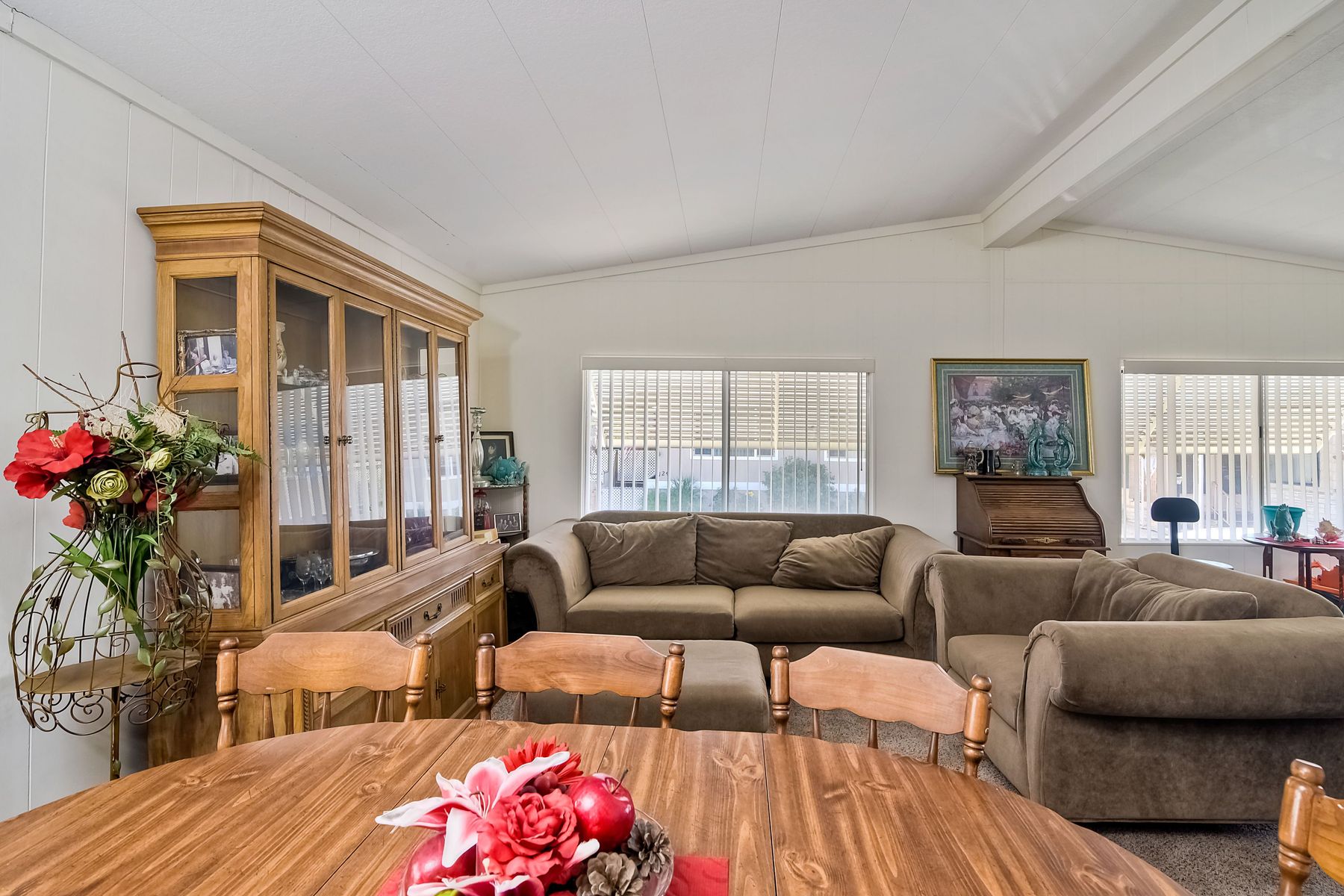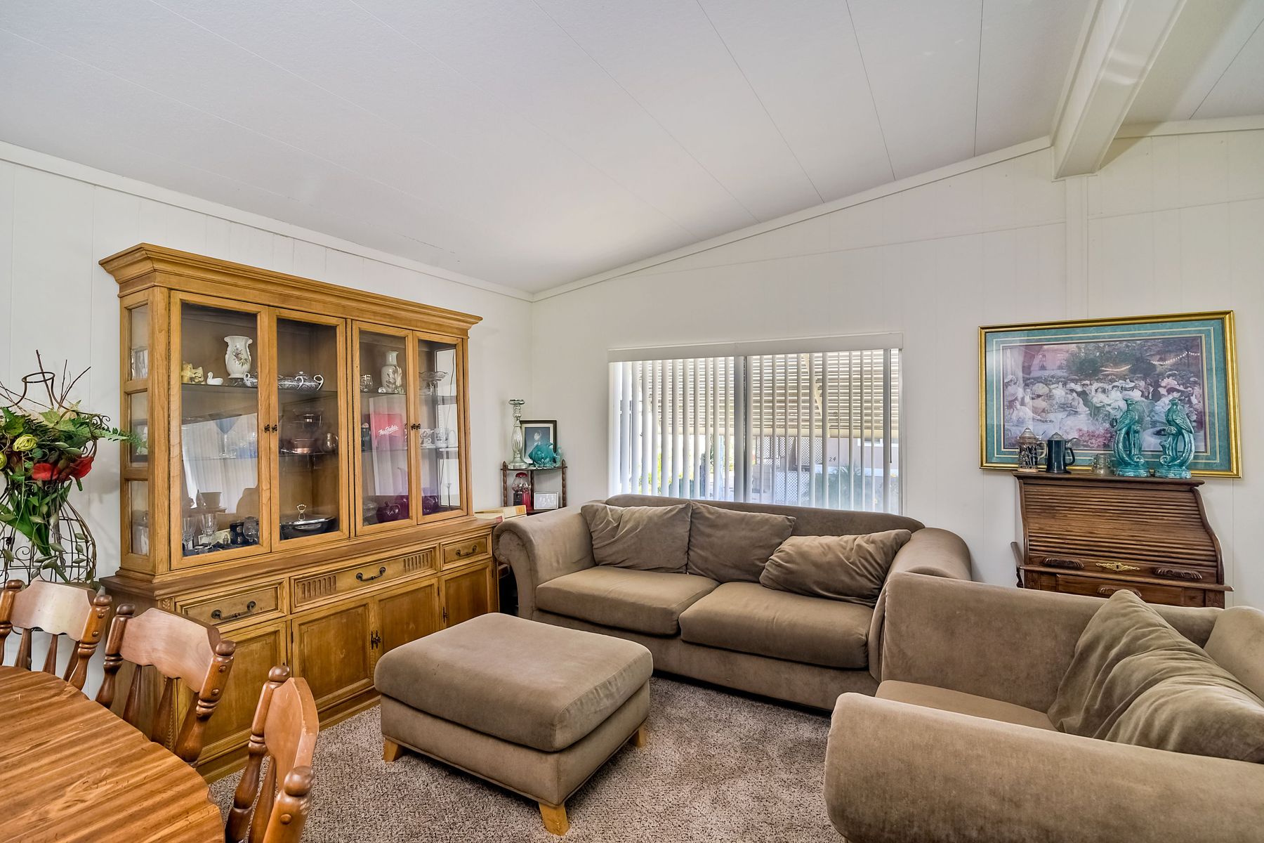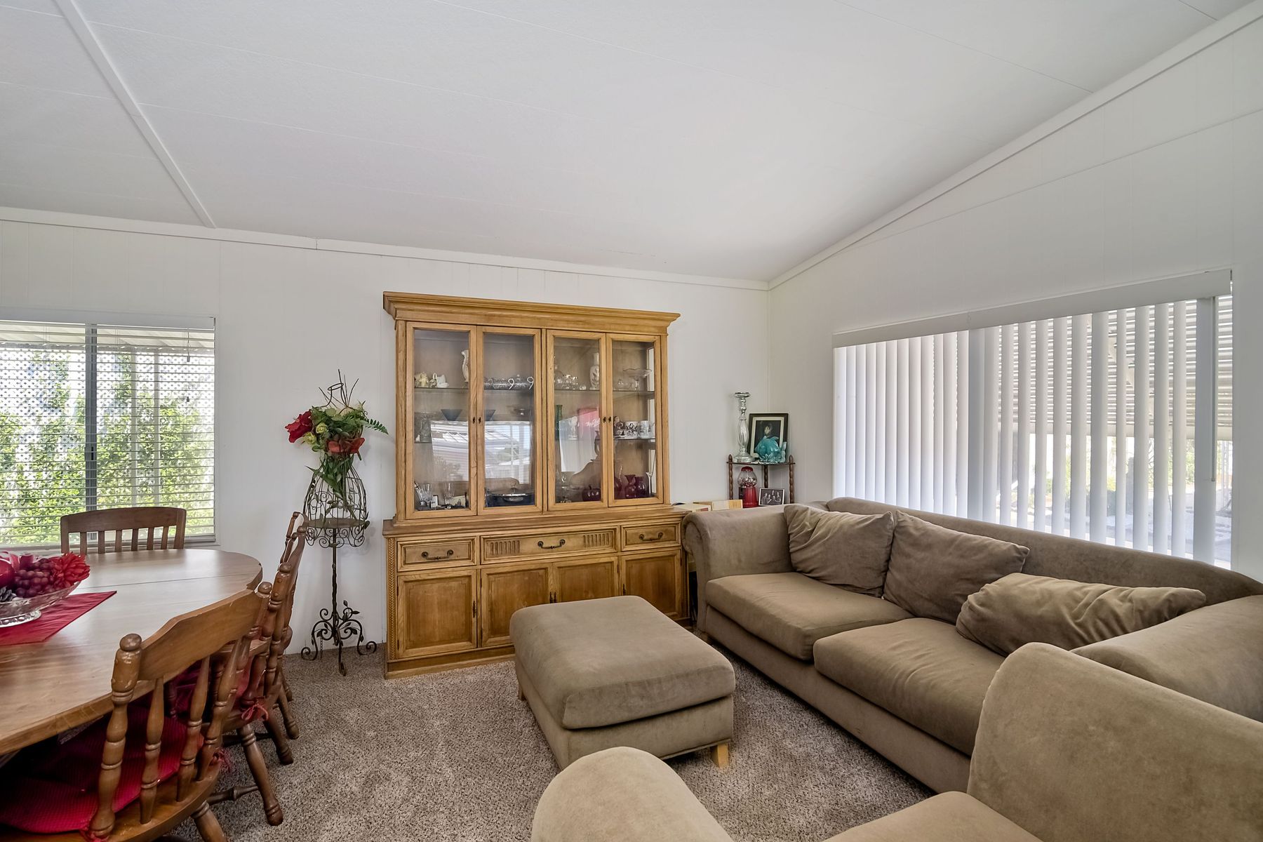 Spacious home, one of the larger homes in the estates. Large family room. Vaulted ceiling in living room and dining room. Built-in cabinets with counter space in dining room and family room. Kitchen bright and open with 4 burner stove and grill, double oven, and plenty of cabinets. Huge master bedroom with upgraded walk-in shower. Large laundry room with a lot of cabinets. Newer windows, carpet and laminate flooring. Enclosed patio and porch. Wood shed for storage. Covered carport with privacy lattice. Close to pool, spa, and clubhouse amenities. Near town and shopping. Beautifully maintained estates include pool, spa, sauna, billiard, dining room with daily activities.