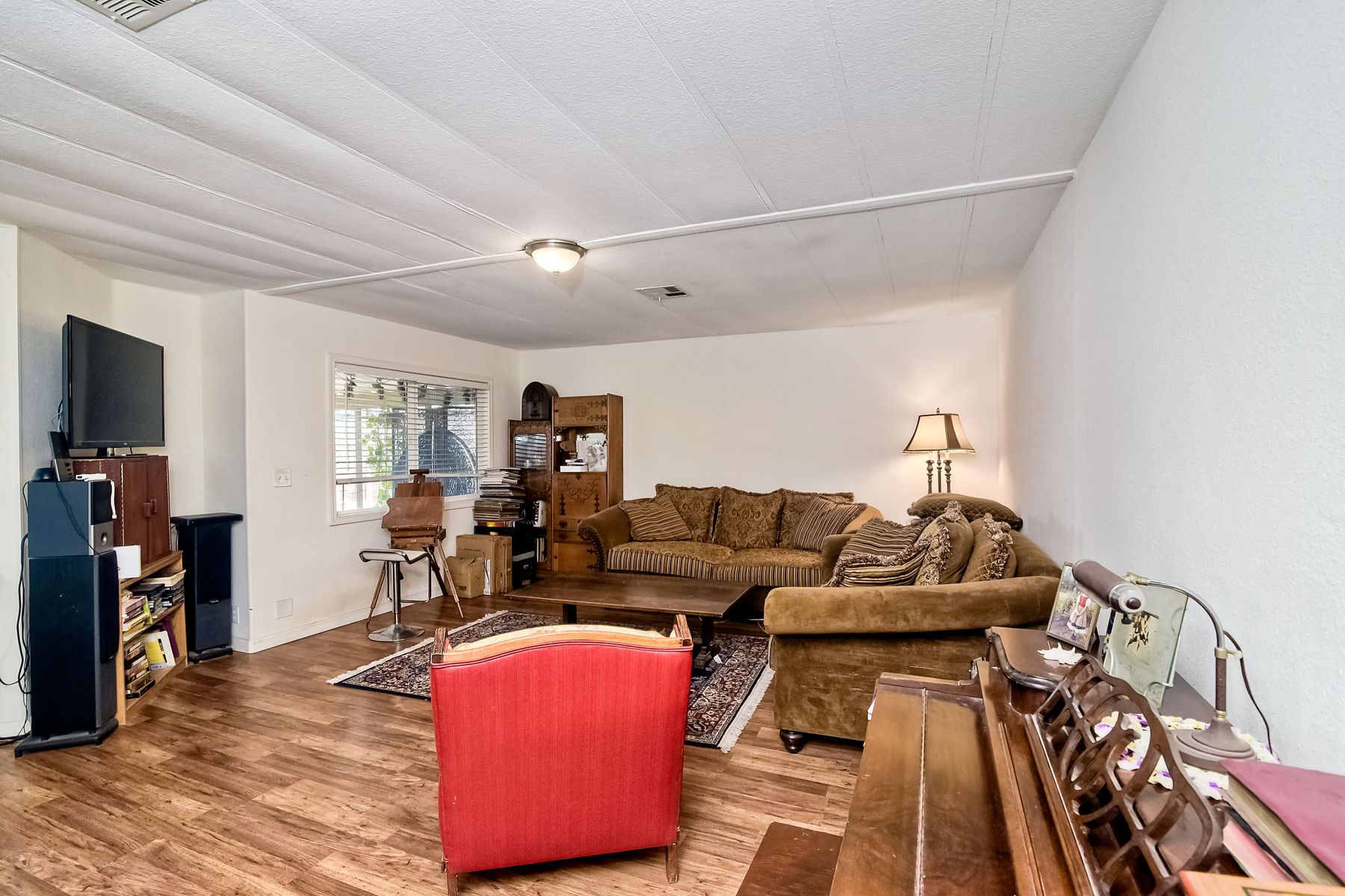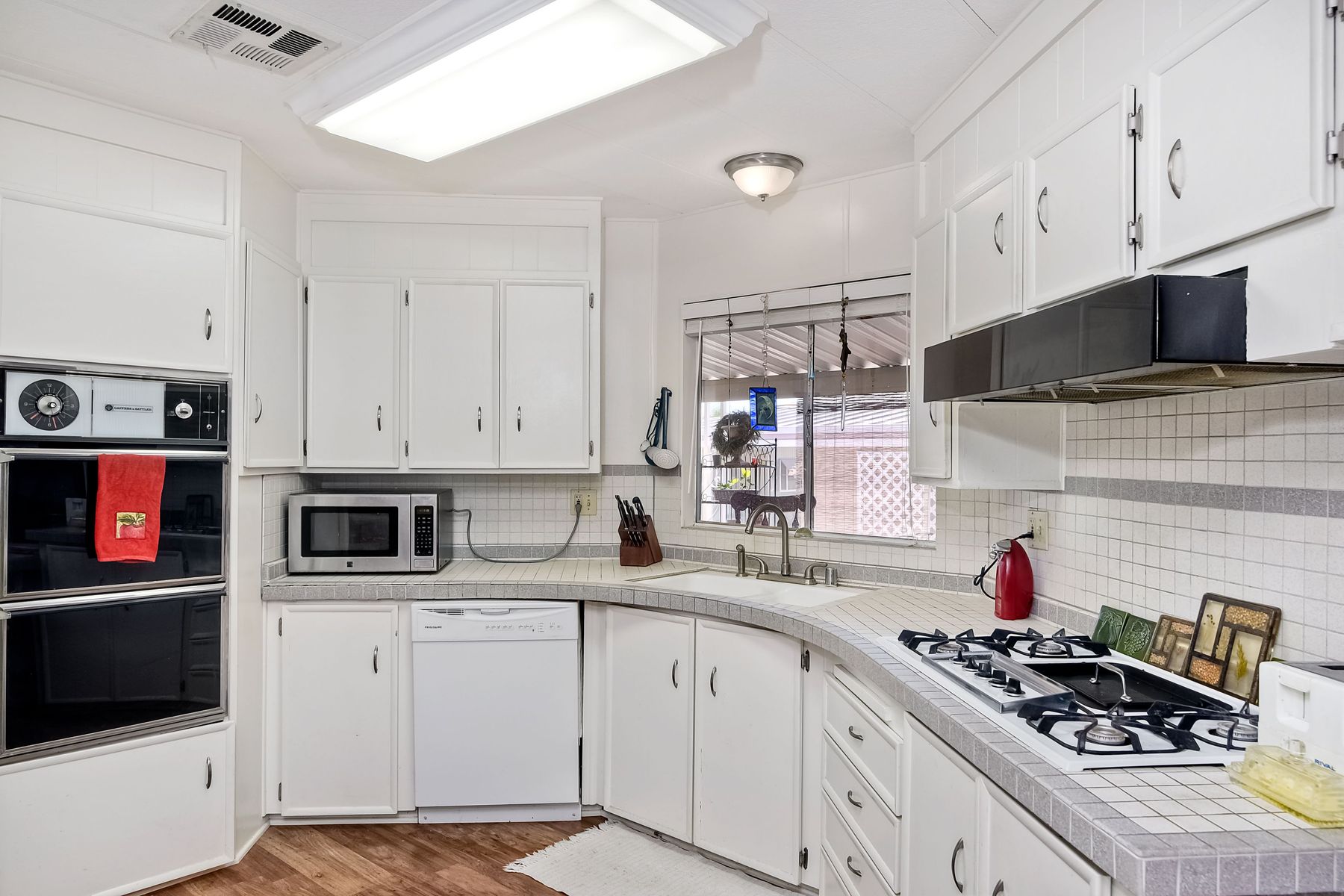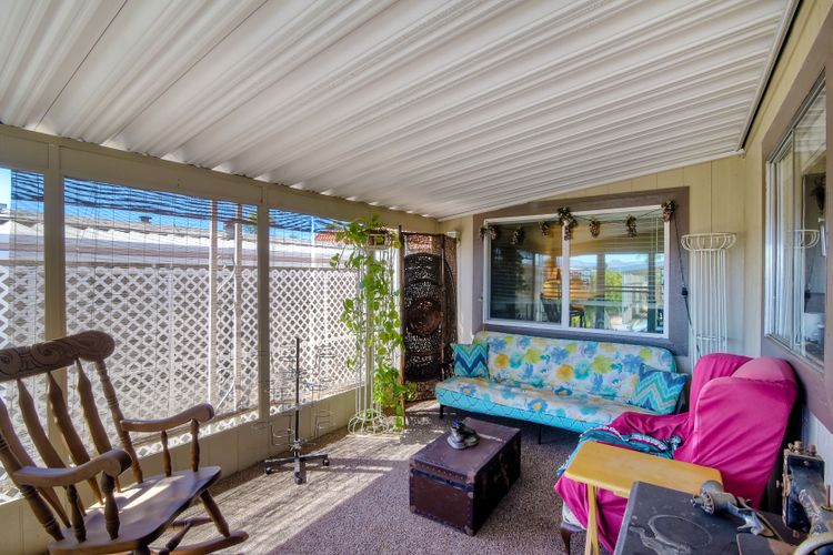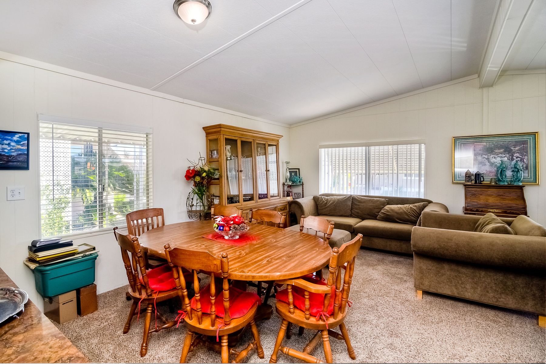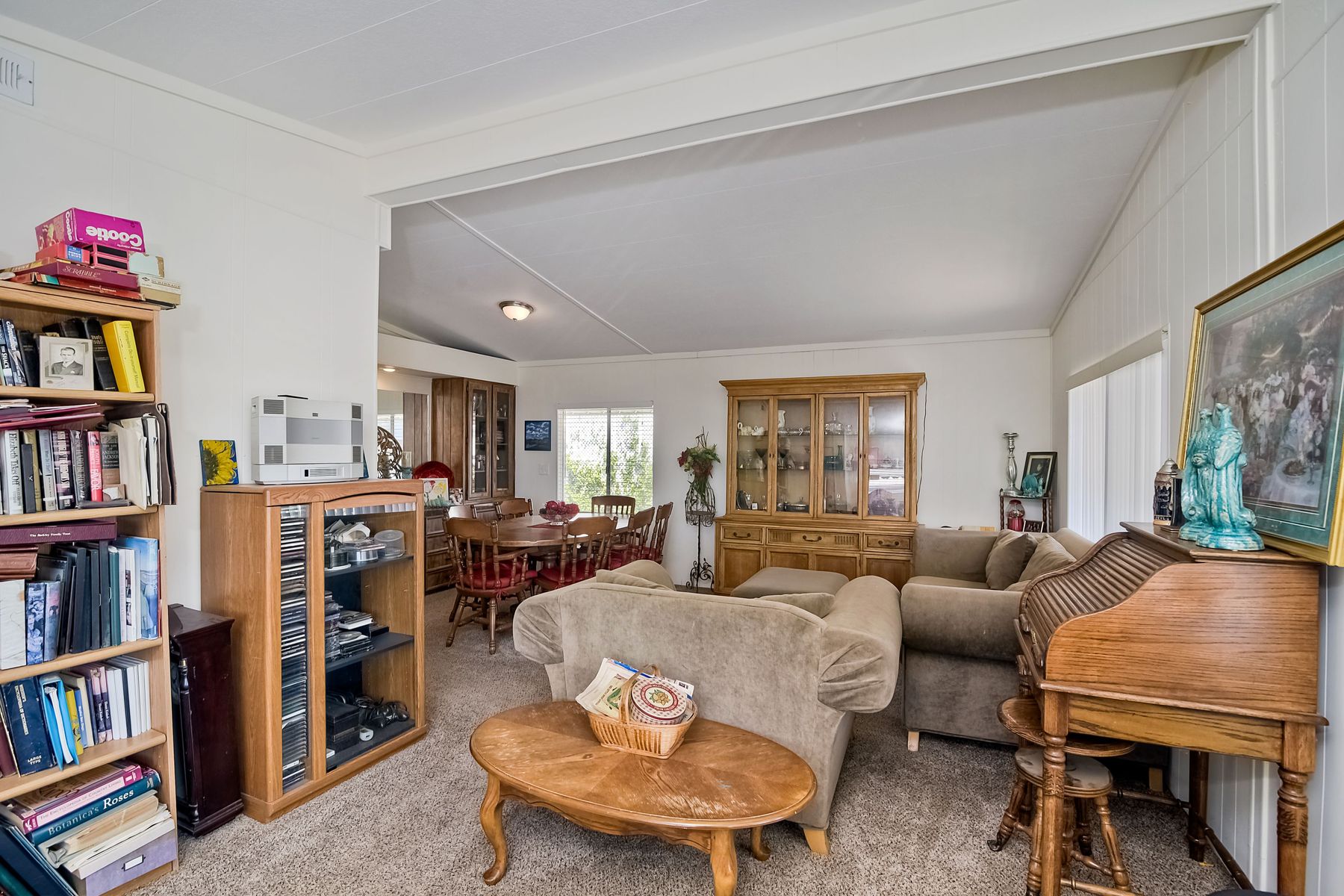 Spacious home, one of the larger homes in the estates. Large family room. Vaulted ceiling in living room and dining room. Built-in cabinets with counter space in dining room and family room. Kitchen bright and open with 4 burner stove and grill, double oven, and plenty of cabinets. Huge master bedroom with upgraded walk-in shower. Large laundry room with a lot of cabinets. Newer windows, carpet and laminate flooring. Enclosed patio and porch. Wood shed for storage. Covered carport with privacy lattice. Close to pool, spa, and clubhouse amenities. Near town and shopping. Beautifully maintained estates include pool, spa, sauna, billiard, dining room with daily activities.