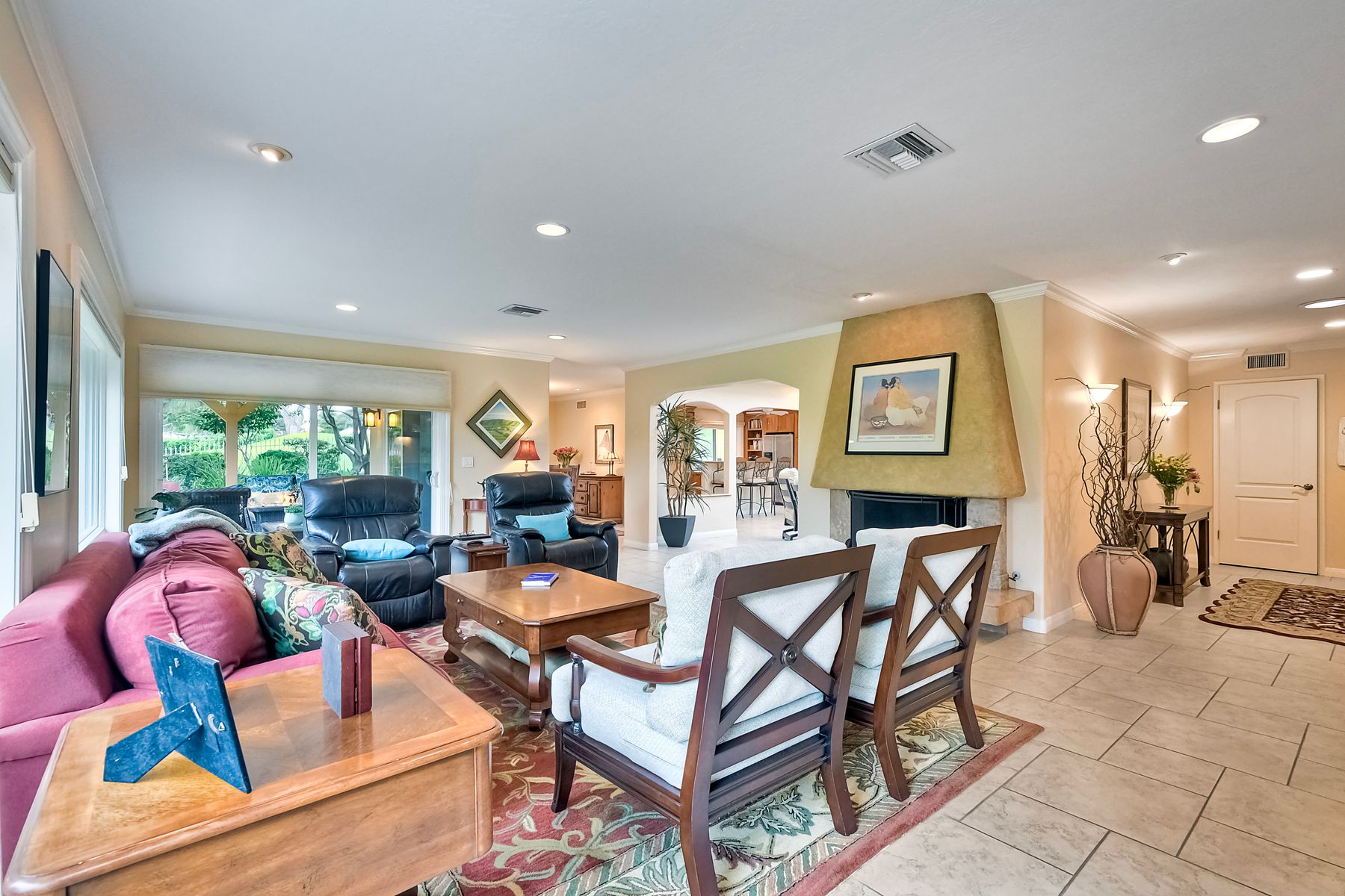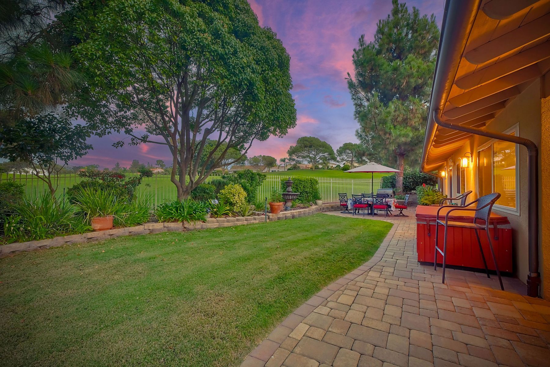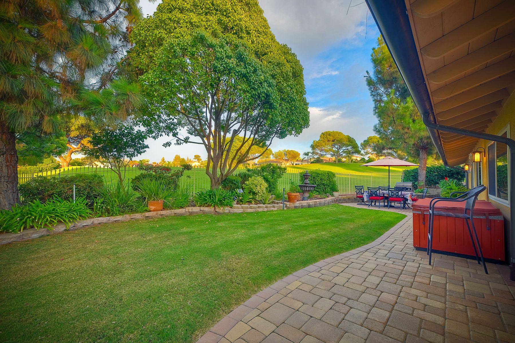Step into luxury living with this extraordinary ranch-style home, perfectly nestled in the prestigious Don Bernardo Estates, one of the most sought-after neighborhoods in Greens East. With breathtaking 270-degree views, this home overlooks the serene 13th and 17th holes at the Country Club of Rancho Bernardo, offering a truly unparalleled living experience.This meticulously maintained home boasts $390,000 in high-end upgrades, reflecting the pride of ownership at every corner. As you walk through the front door, you are immediately greeted by sweeping golf course views and an open, flowing floorplan. The natural light floods in through a stunning 350-square-foot glass covered atrium, illuminating the home with warmth and elegance.The chef's kitchen features custom cabinetry, gleaming granite countertops, a large island with bar seating, and stainless steel appliances, including a five-burner gas cooktop. Retreat to the expansive master suite, which offers a sanctuary of relaxation with two spacious walk-in closets and a beautifully remodeled en-suite bathroom. The bathroom features travertine flooring, dual vanity sinks, a jetted soaking tub, a walk-in shower with a frameless door, and custom tile surround, creating a spa-like atmosphere in your own home. The pie-shaped 11,800 sq. ft. lot is designed for both beauty and function. The fully fenced backyard, with private gate access to the golf course, is an entertainer's paradise. Enjoy multiple sitting areas, a covered pergola, an above-ground spa, raised planter beds, an elegant fountain, and fruit trees—all set within a lush, professionally landscaped yard. The wrap-around patio, with custom pavers installed in 2022, provides the perfect space for outdoor gatherings or quiet reflection. Additional Features: **New Windows Throughout**New Roof (2019)**New HVAC System (2021)**New Pavers Patio and Driveway (2022) **New Water Heater (2021)**New Garage Door (2022)**Oversized two-car garage with space for a golf cart**Adventure awaits just beyond your doorstep, with Rancho Bernardo Inn, CCRB, and the Rancho Bernardo Winery nearby. And that's not all – membership to the esteemed RB Swim & Tennis Club is covered by HOA fees, offering a plethora of amenities including pools, playgrounds, a gym, Pickleball and more! The property is within the highly rated Poway Unified School District.This home is not just a place to live; it's a lifestyle. With its prime location, impeccable upgrades, and captivating views, this property offers an exceptional opportunity to own a piece of paradise in Rancho Bernardo.