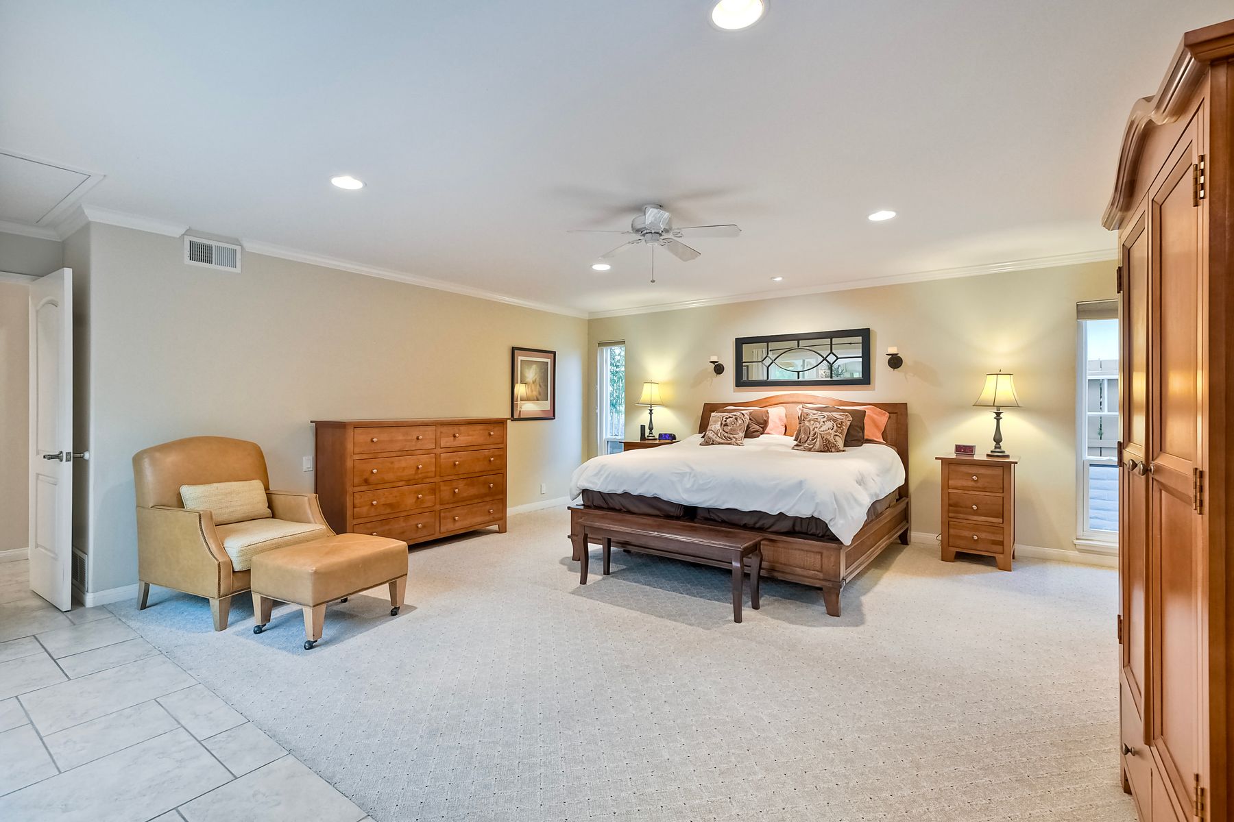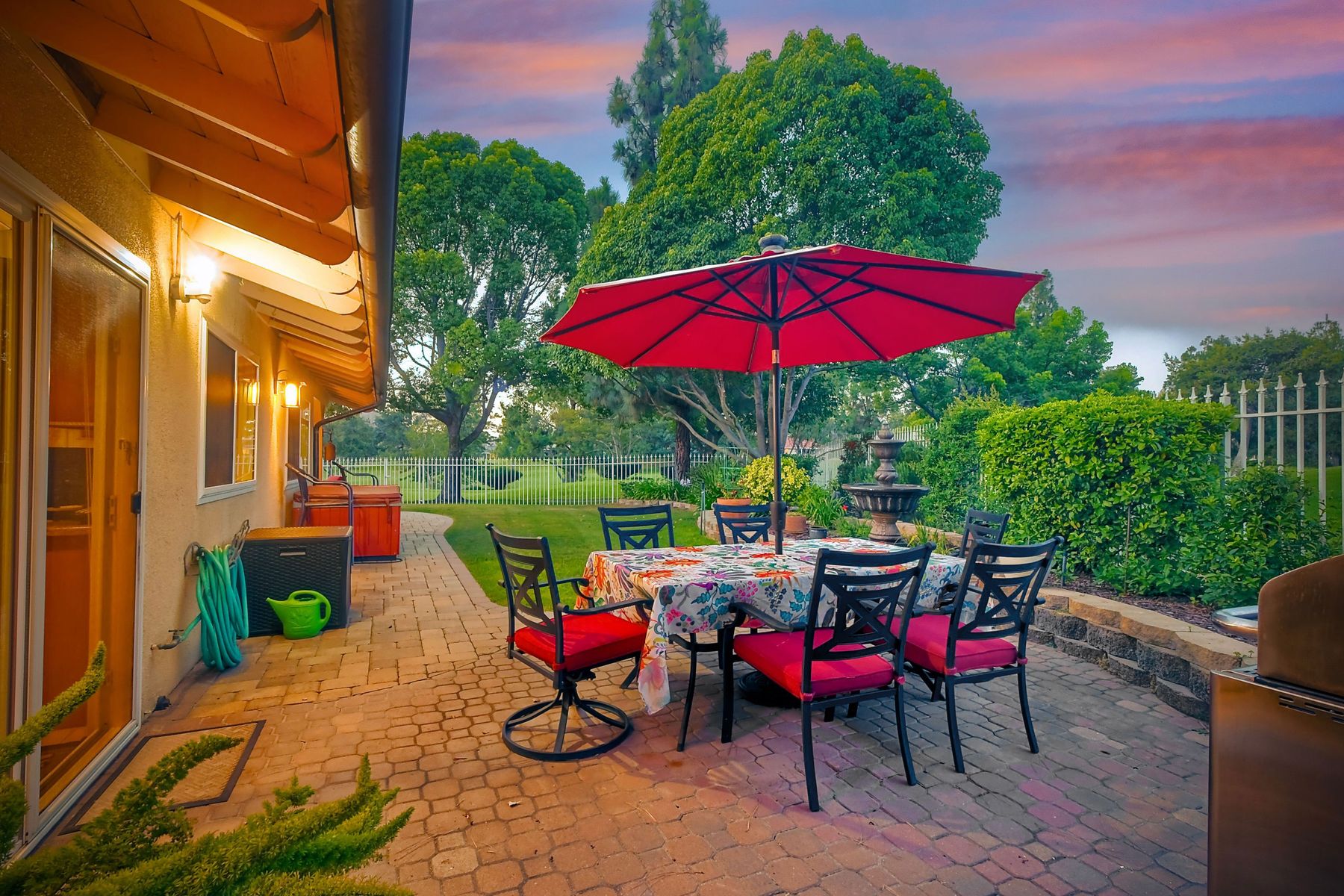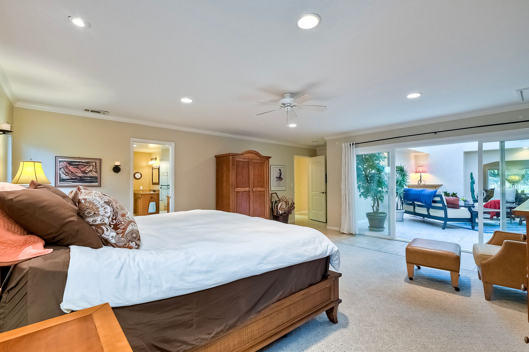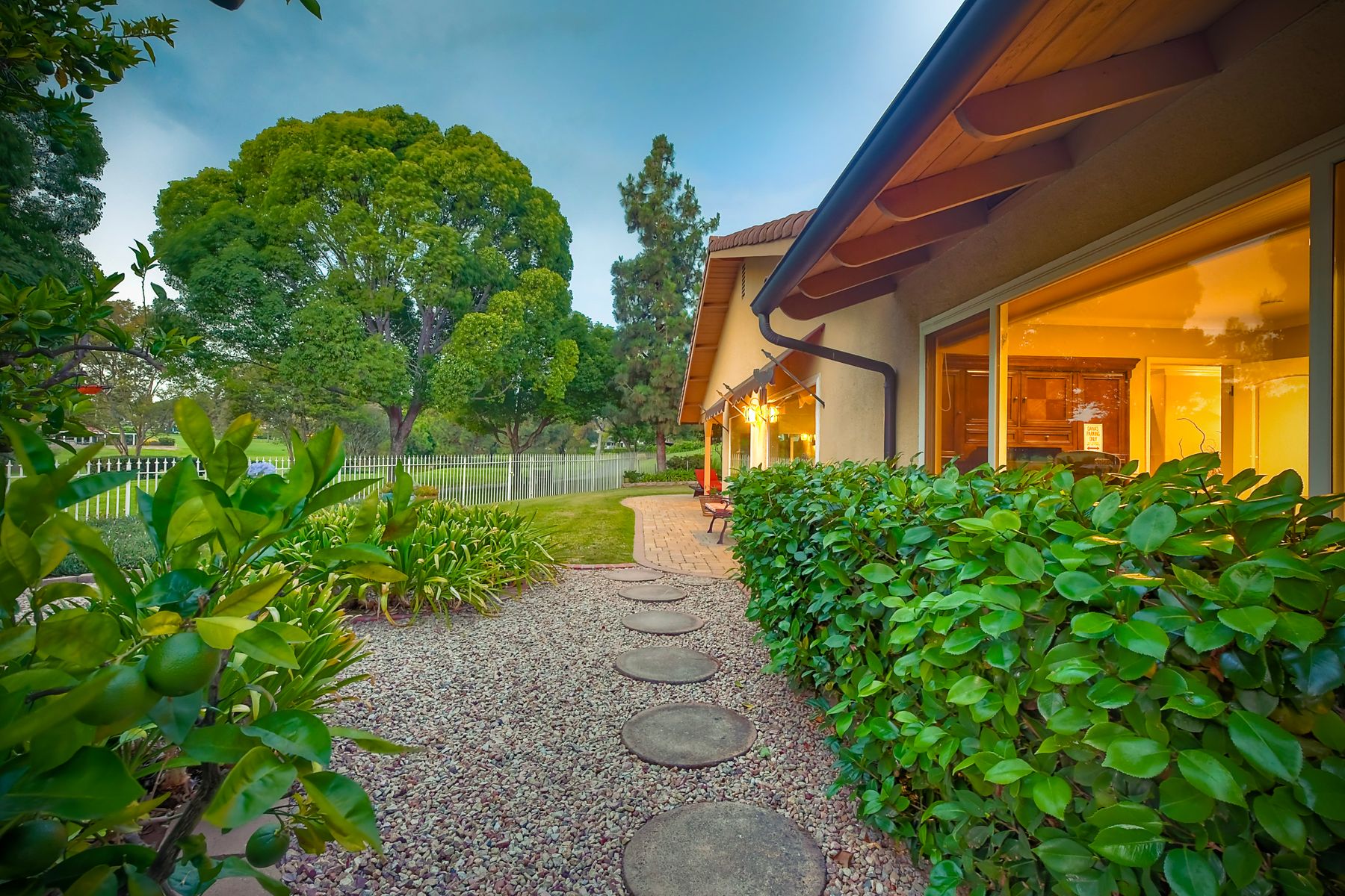 Step into luxury living with this extraordinary ranch-style home, perfectly nestled in the prestigious Don Bernardo Estates, one of the most sought-after neighborhoods in Greens East. With breathtaking 270-degree views, this home overlooks the serene 13th and 17th holes at the Country Club of Rancho Bernardo, offering a truly unparalleled living experience.This meticulously maintained home boasts $390,000 in high-end upgrades, reflecting the pride of ownership at every corner. As you walk through the front door, you are immediately greeted by sweeping golf course views and an open, flowing floorplan. The natural light floods in through a stunning 350-square-foot glass covered atrium, illuminating the home with warmth and elegance.The chef's kitchen features custom cabinetry, gleaming granite countertops, a large island with bar seating, and stainless steel appliances, including a five-burner gas cooktop. Retreat to the expansive master suite, which offers a sanctuary of relaxation with two spacious walk-in closets and a beautifully remodeled en-suite bathroom. The bathroom features travertine flooring, dual vanity sinks, a jetted soaking tub, a walk-in shower with a frameless door, and custom tile surround, creating a spa-like atmosphere in your own home. The pie-shaped 11,800 sq. ft. lot is designed for both beauty and function. The fully fenced backyard, with private gate access to the golf course, is an entertainer's paradise. Enjoy multiple sitting areas, a covered pergola, an above-ground spa, raised planter beds, an elegant fountain, and fruit trees—all set within a lush, professionally landscaped yard. The wrap-around patio, with custom pavers installed in 2022, provides the perfect space for outdoor gatherings or quiet reflection. Additional Features: **New Windows Throughout**New Roof (2019)**New HVAC System (2021)**New Pavers Patio and Driveway (2022) **New Water Heater (2021)**New Garage Door (2022)**Oversized two-car garage with space for a golf cart**Adventure awaits just beyond your doorstep, with Rancho Bernardo Inn, CCRB, and the Rancho Bernardo Winery nearby. And that's not all – membership to the esteemed RB Swim & Tennis Club is covered by HOA fees, offering a plethora of amenities including pools, playgrounds, a gym, Pickleball and more! The property is within the highly rated Poway Unified School District.This home is not just a place to live; it's a lifestyle. With its prime location, impeccable upgrades, and captivating views, this property offers an exceptional opportunity to own a piece of paradise in Rancho Bernardo.