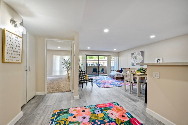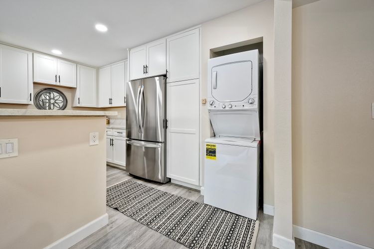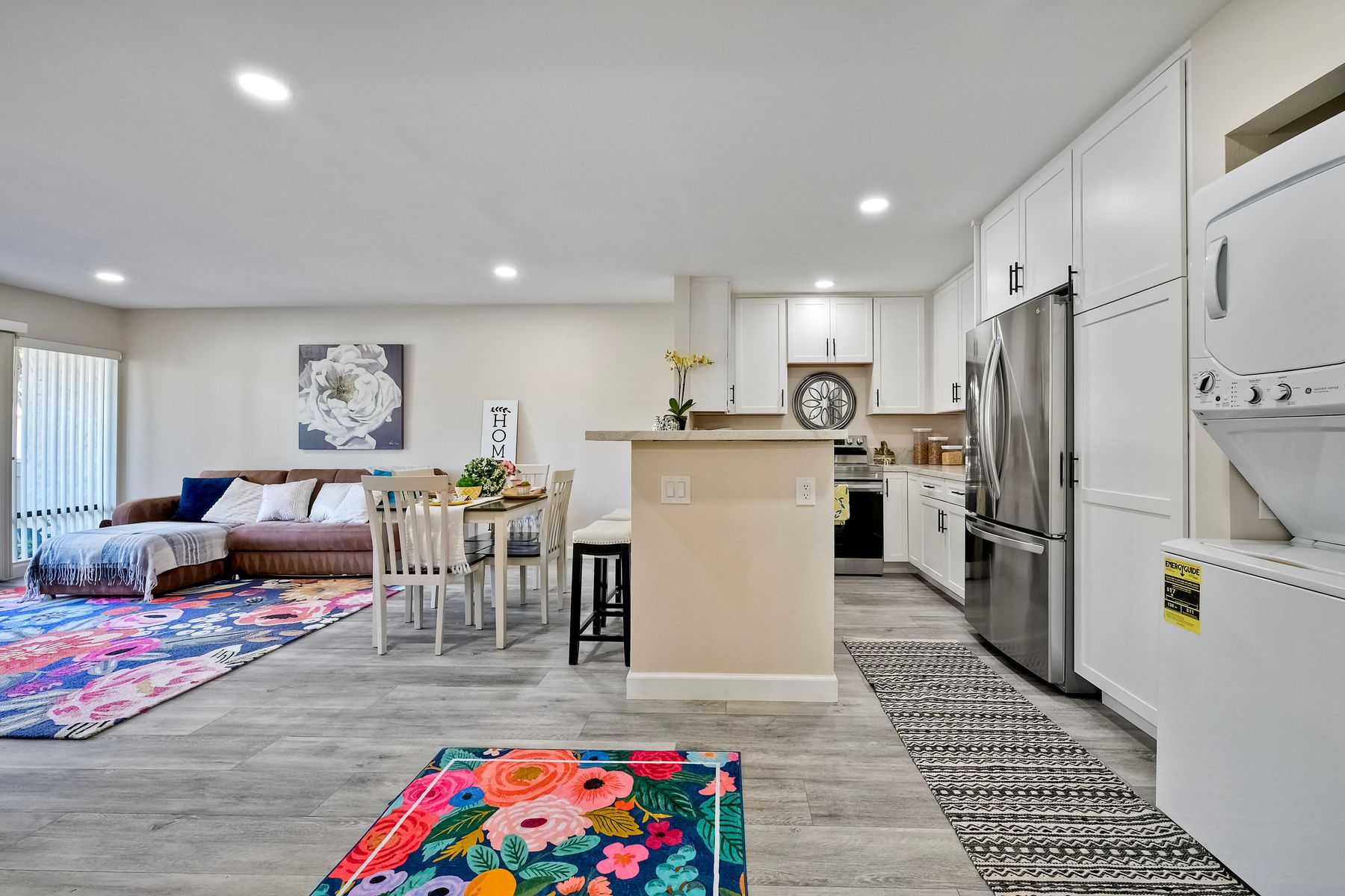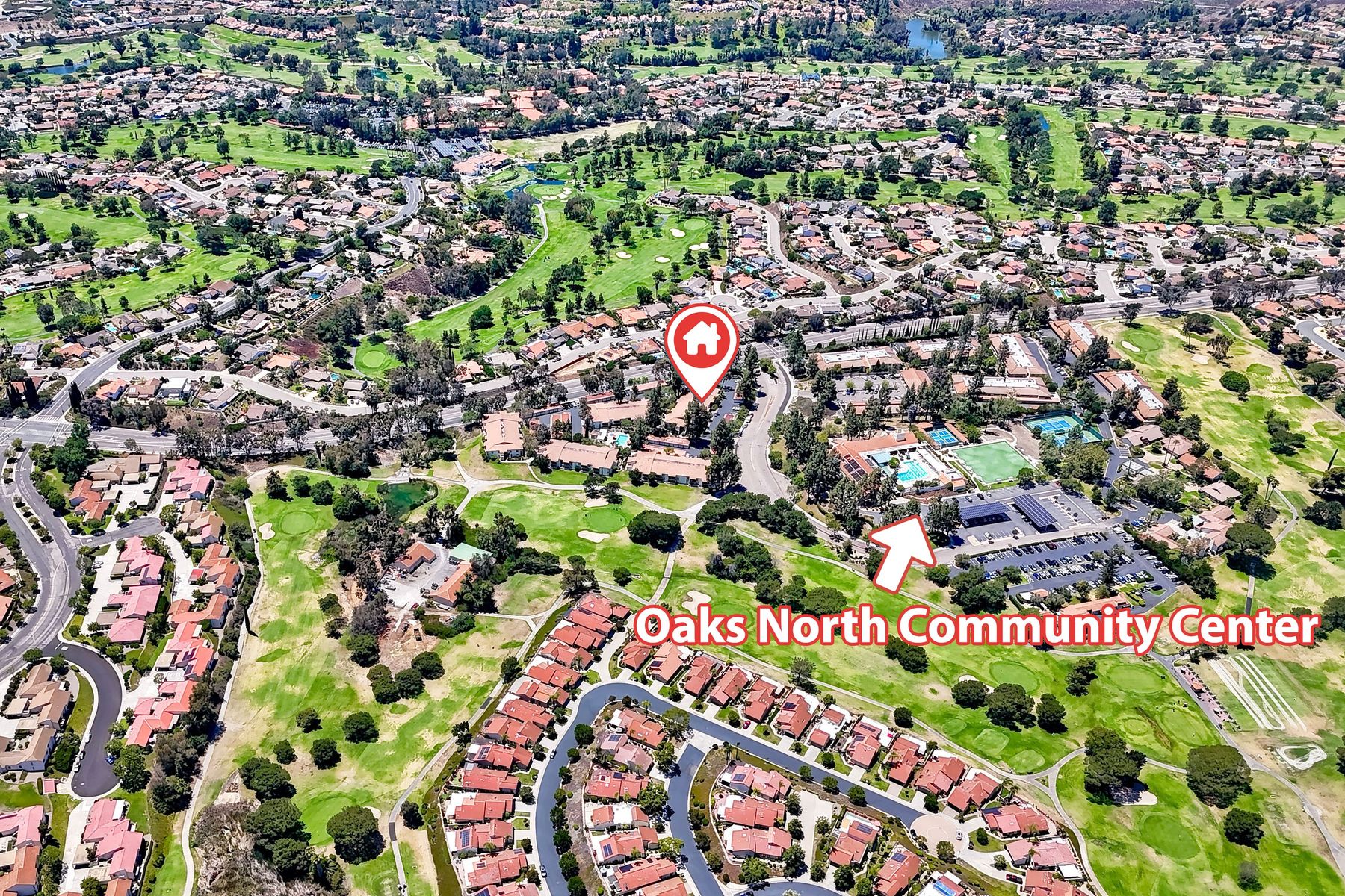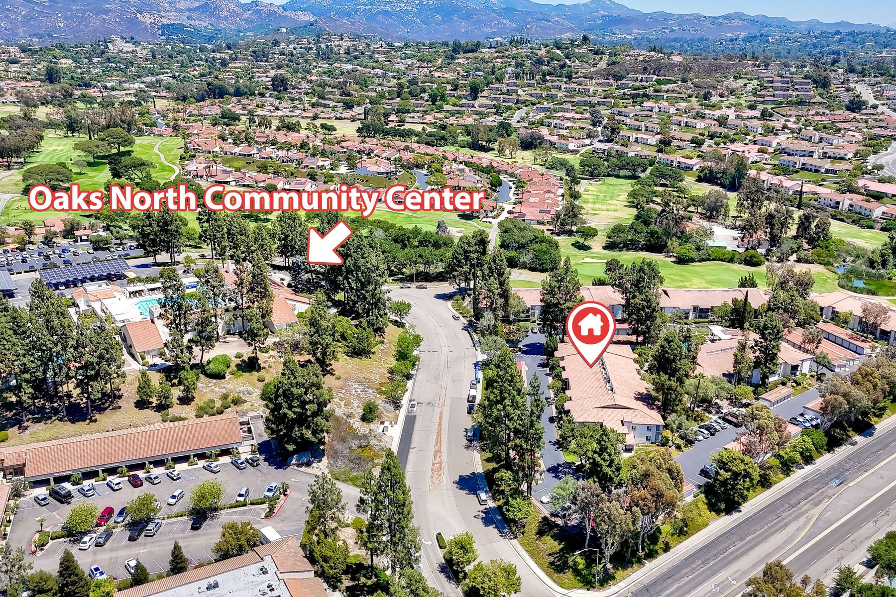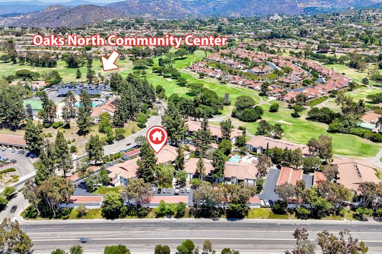Welcome to the highly sought-after Oaks North 55+ community! This charming single-level home is located on the first floor of a gated building and is within walking distance of the Oaks North Golf Course and community center. Enjoy a wide range of amenities including pickleball, tennis, a heated pool, spa, sauna, gym, exercise classes, a library, woodshop, and ceramics room. The home has been tastefully remodeled with newer cabinetry, stainless steel appliances, quartz countertops, updated flooring, stackable indoor laundry, an upgraded bathroom, and fresh interior paint. The spacious living room opens to a private patio, perfect for gardening or barbecuing. The large primary suite features two generously sized closets with mirrored doors. This home also includes a one-car garage, perfect for your vehicle, golf cart, or additional storage. Conveniently located near the Rancho Bernardo Inn, Bernardo Winery, shopping centers, and just minutes from the I-15 freeway.