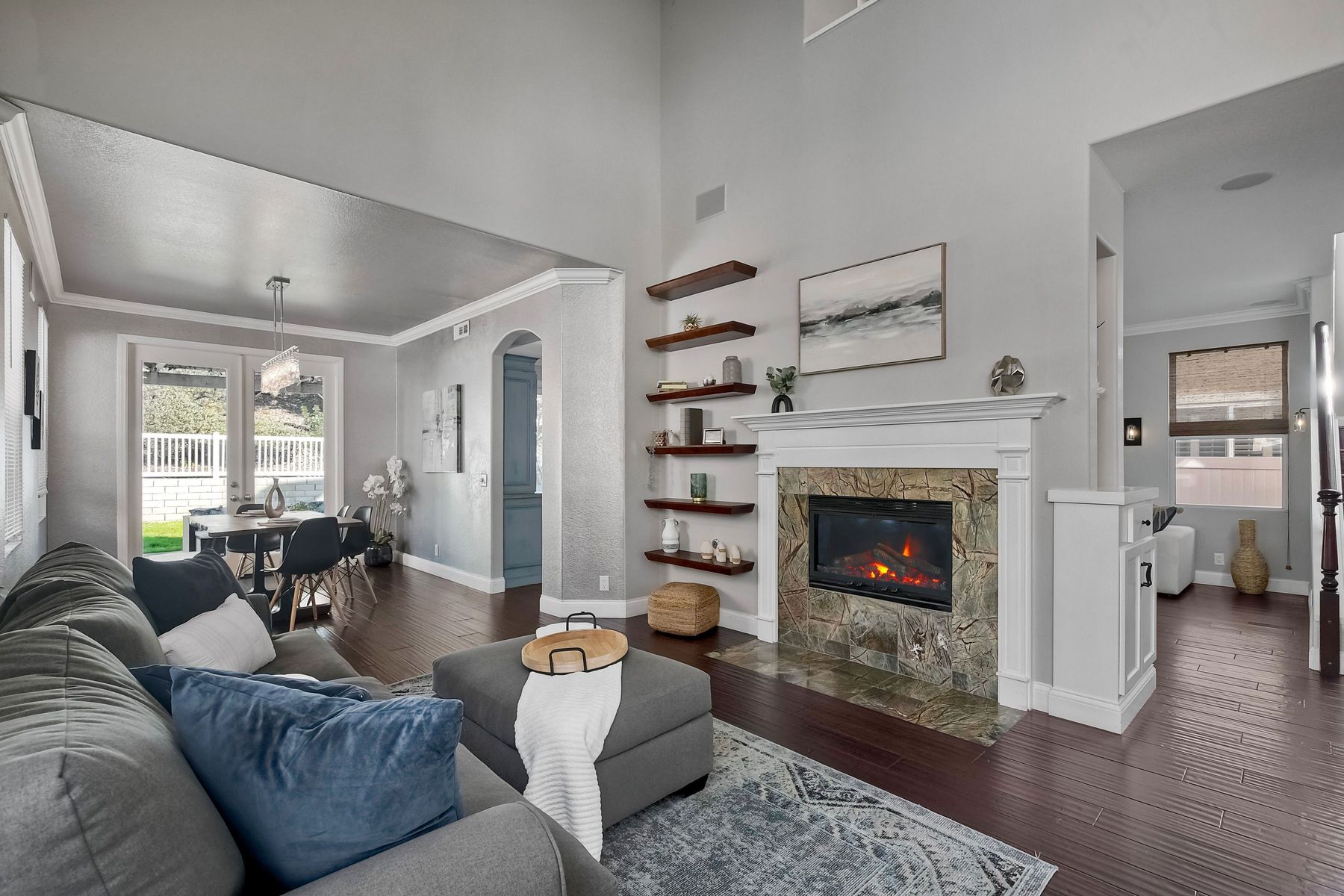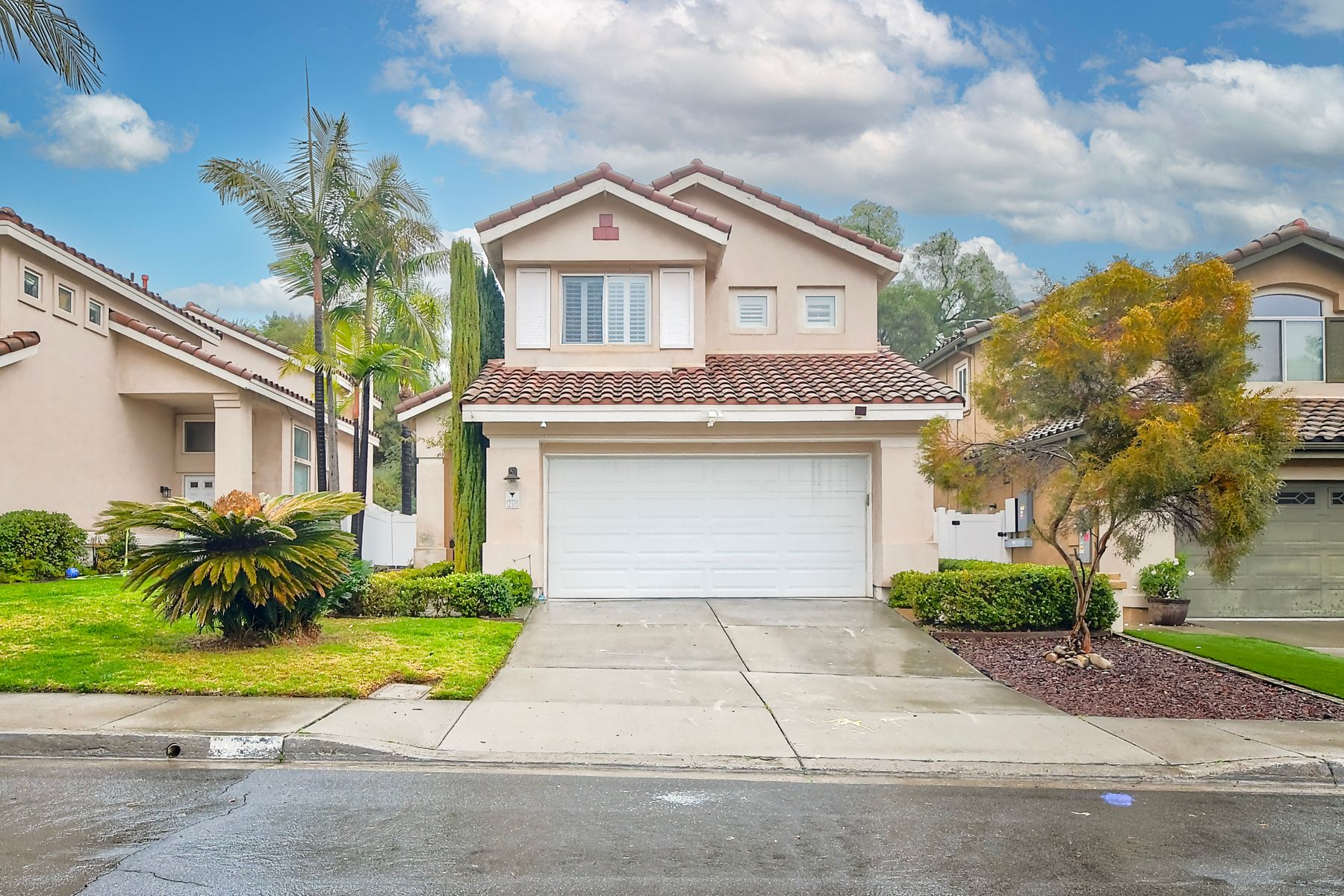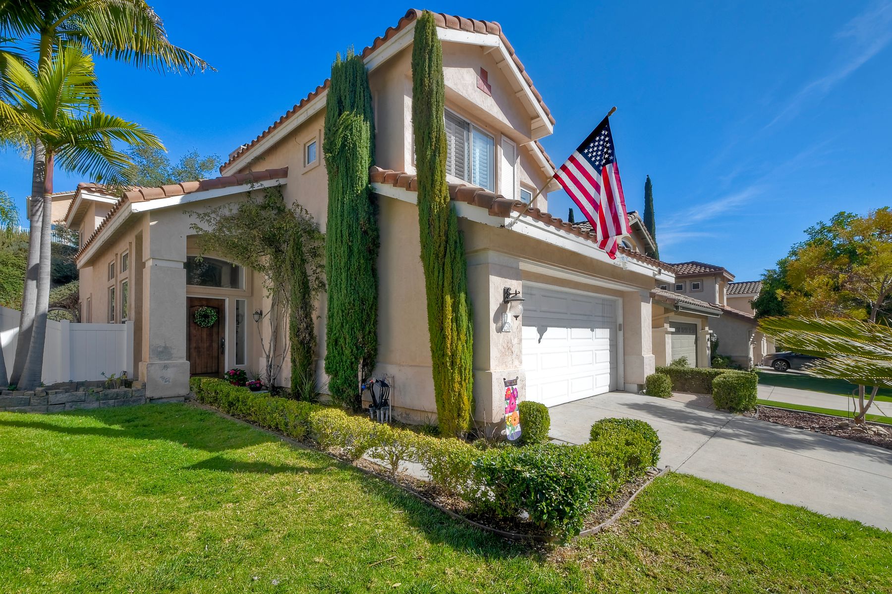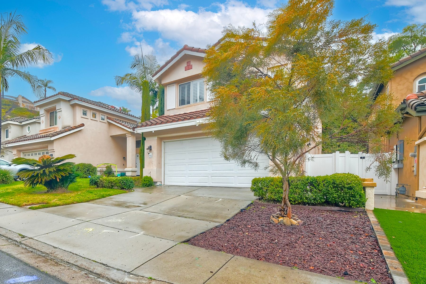 Freshly painted and beautifully staged - Legacy Plan 2 floorplan is one of the most popular home styles with great natural light and superb flow. Exceptional choice of upgrades. Entry and first floor rooms feature engineered bamboo flooring and soaring cathedral ceilings. Stylishly upgraded Kitchen with distinctive leathered granite, warming drawer, pantry sink, globe pendant lights over the breakfast bar, built-in custom buffet with a distressed metal countertop and abundant storage. Built-in wine cabinet is a bonus as well. Dining Room features a custom light and French doors to the rear patio. Patio is covered with a producing grapevine and makes a wonderful gathering space. Newer Vinyl fences and gate, newer water heater, newer stove/oven combo with a gas cooktop. Primary bathroom and powder room were beautifully remodeled. Primary bath features a soaking tub, separate shower, a walk-in closet and dual vanity. Powder room features a custom vessel sink. It's stunning! Garage door replaced 4/3/25. Brand new water supply line to the home also added 4/3/2025. Low HOA covers private pickleball/tennis courts and common area maintenance. Open and spacious with flexible areas indoors and out. Private lot near the end of a cul-de-sac with open space behind the back yard. Swan Canyon Place is tucked in to a canyon setting with lots of manicured shrubbery and open spaces to explore. The Legacy neighborhood features a a private tennis/pickleball court and lots of hiking areas. It is very central and super convenient to get to local parks, to Lake Miramar, to shopping and to the freeway. Scripps Ranch offers top-rated schools (EB. Scripps, Dingeman, Marshall Middle and Scripps Ranch High), plus nearby gyms, great shopping and restaurants Starbucks.