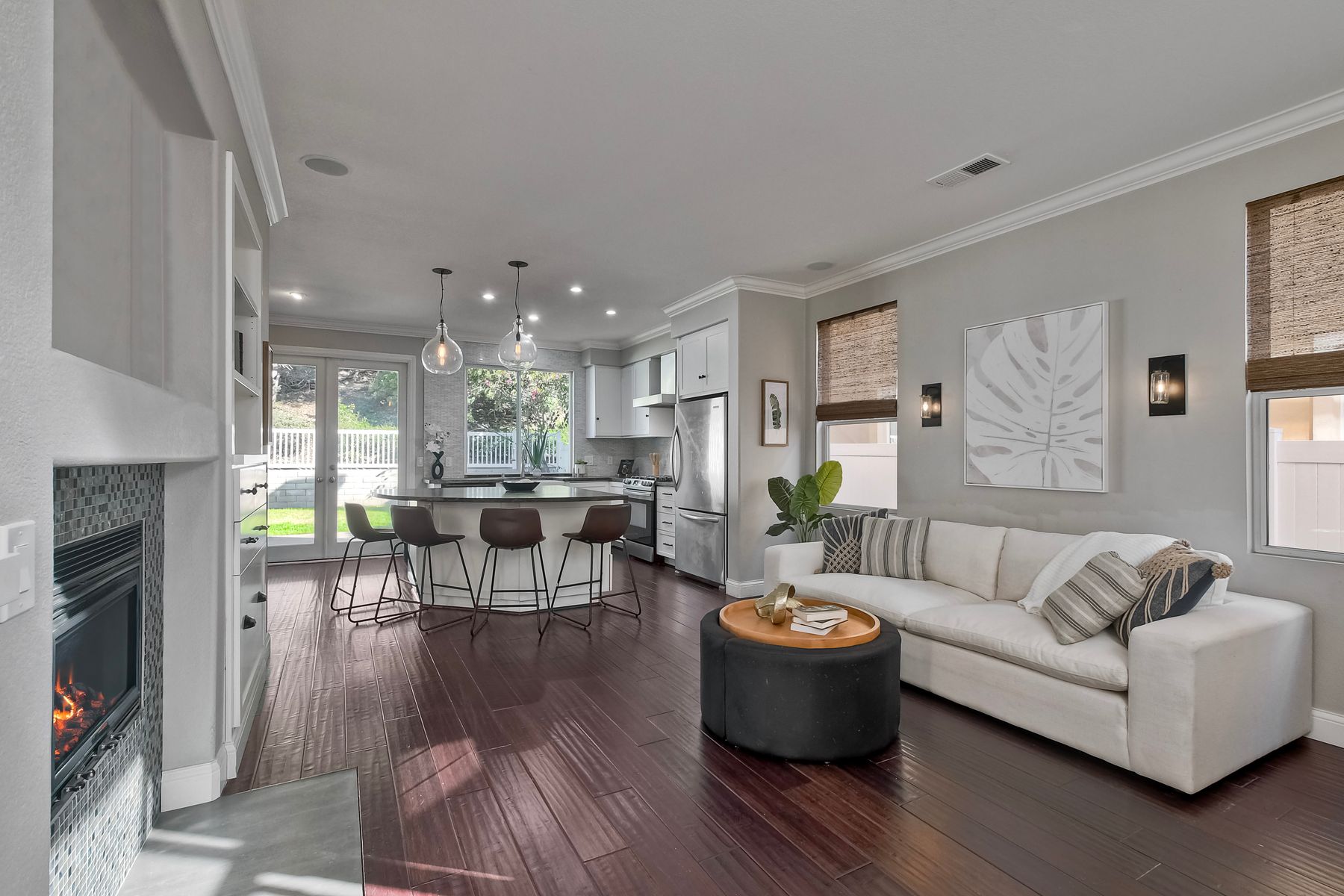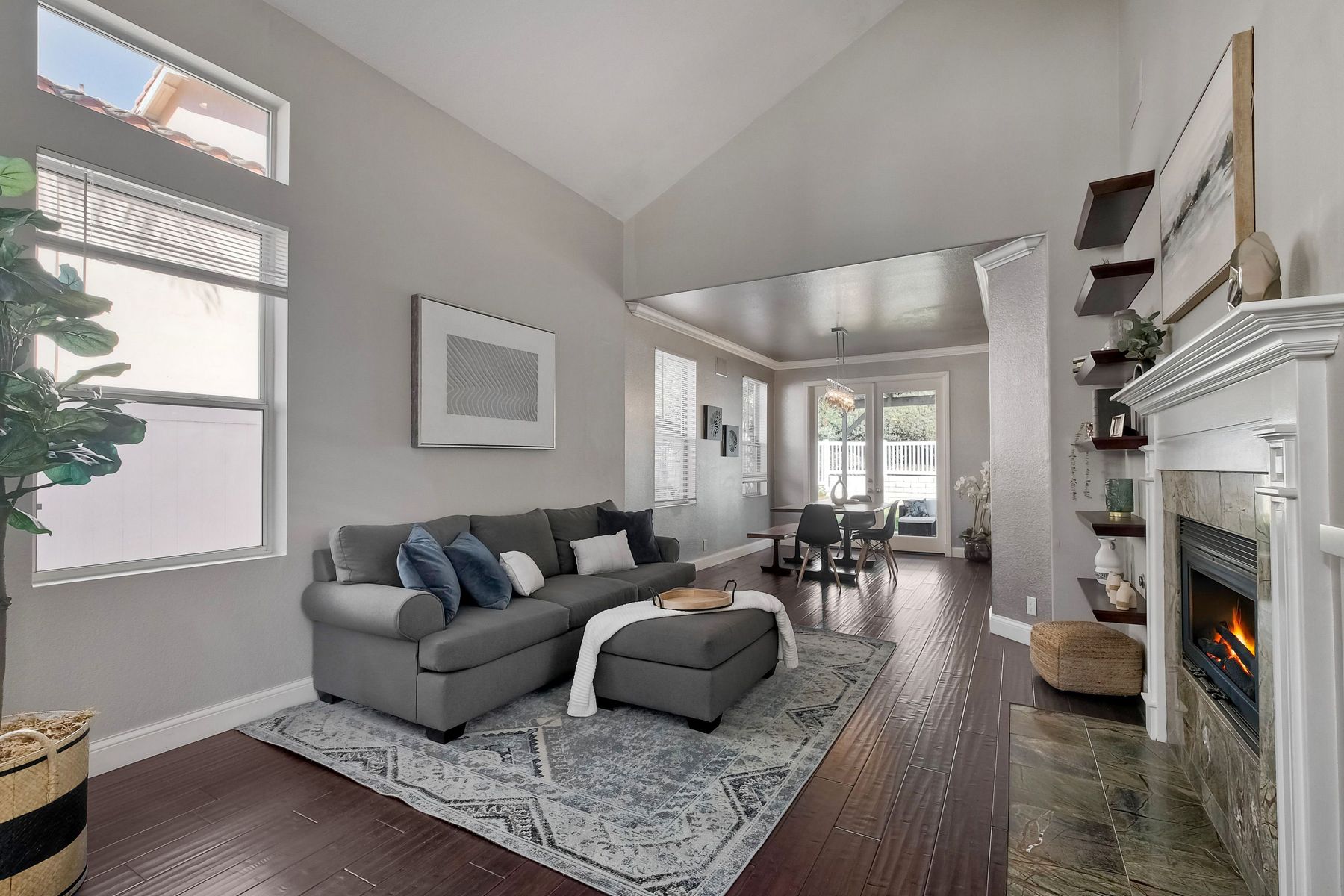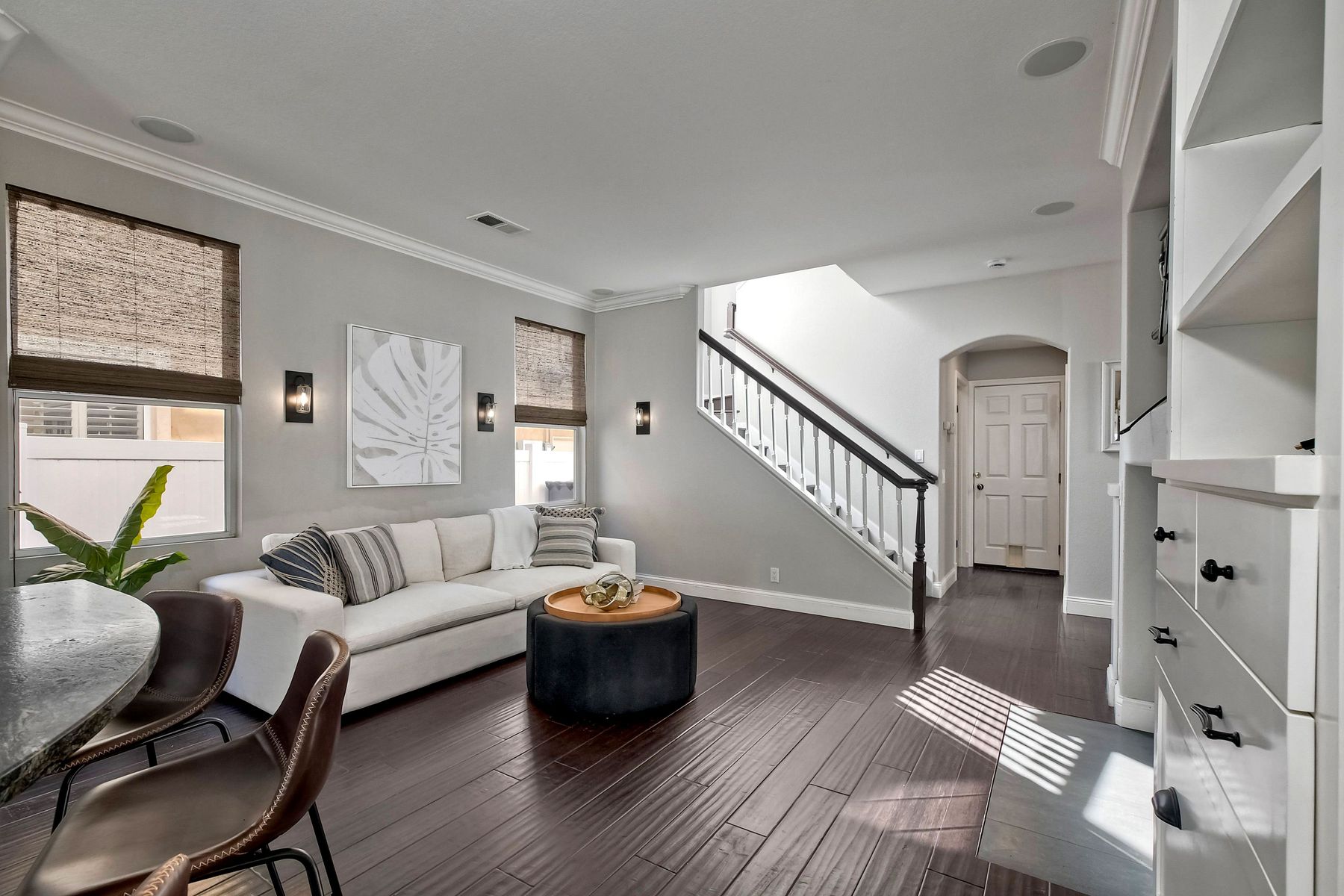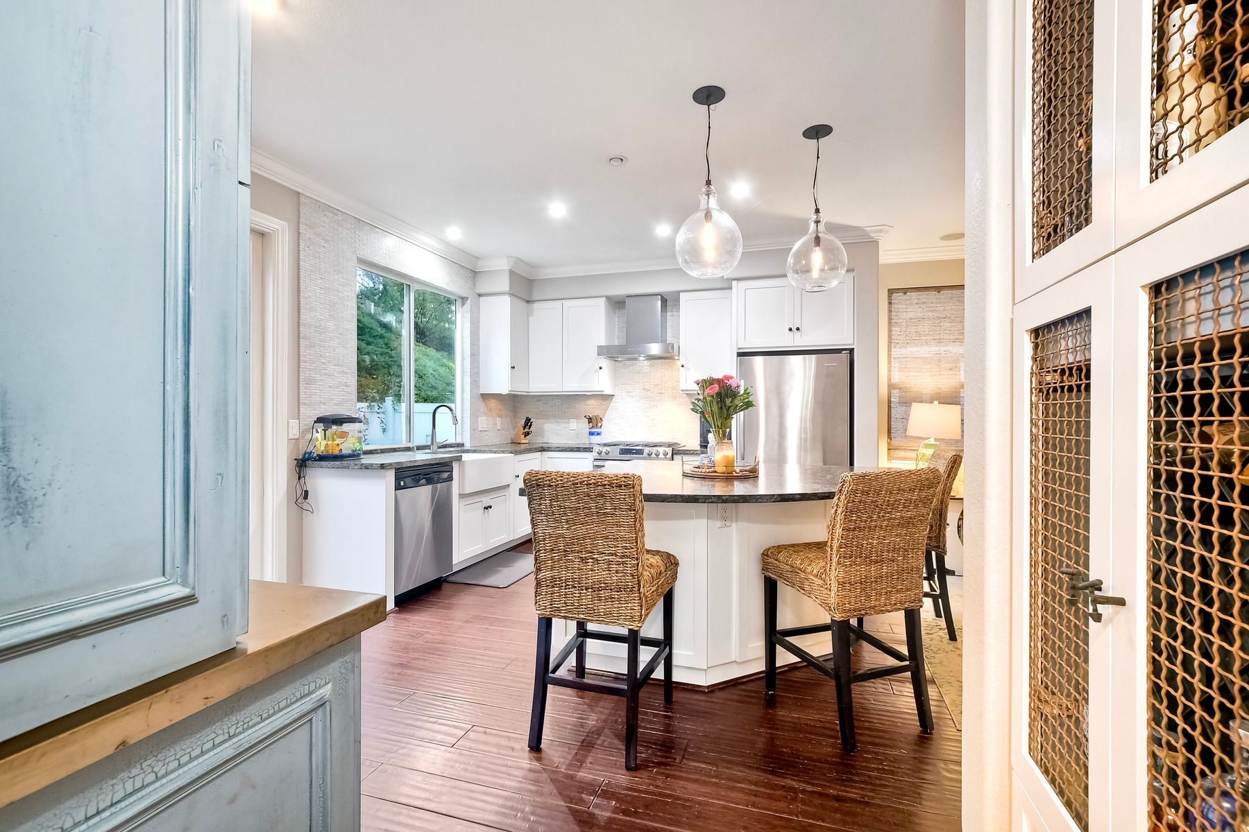 Freshly painted and beautifully staged - Legacy Plan 2 floorplan is one of the most popular home styles with great natural light and superb flow. Exceptional choice of upgrades. Entry and first floor rooms feature engineered bamboo flooring and soaring cathedral ceilings. Stylishly upgraded Kitchen with distinctive leathered granite, warming drawer, pantry sink, globe pendant lights over the breakfast bar, built-in custom buffet with a distressed metal countertop and abundant storage. Built-in wine cabinet is a bonus as well. Dining Room features a custom light and French doors to the rear patio. Patio is covered with a producing grapevine and makes a wonderful gathering space. Newer Vinyl fences and gate, newer water heater, newer stove/oven combo with a gas cooktop. Primary bathroom and powder room were beautifully remodeled. Primary bath features a soaking tub, separate shower, a walk-in closet and dual vanity. Powder room features a custom vessel sink. It's stunning! Garage door replaced 4/3/25. Brand new water supply line to the home also added 4/3/2025. Low HOA covers private pickleball/tennis courts and common area maintenance. Open and spacious with flexible areas indoors and out. Private lot near the end of a cul-de-sac with open space behind the back yard. Swan Canyon Place is tucked in to a canyon setting with lots of manicured shrubbery and open spaces to explore. The Legacy neighborhood features a a private tennis/pickleball court and lots of hiking areas. It is very central and super convenient to get to local parks, to Lake Miramar, to shopping and to the freeway. Scripps Ranch offers top-rated schools (EB. Scripps, Dingeman, Marshall Middle and Scripps Ranch High), plus nearby gyms, great shopping and restaurants Starbucks.