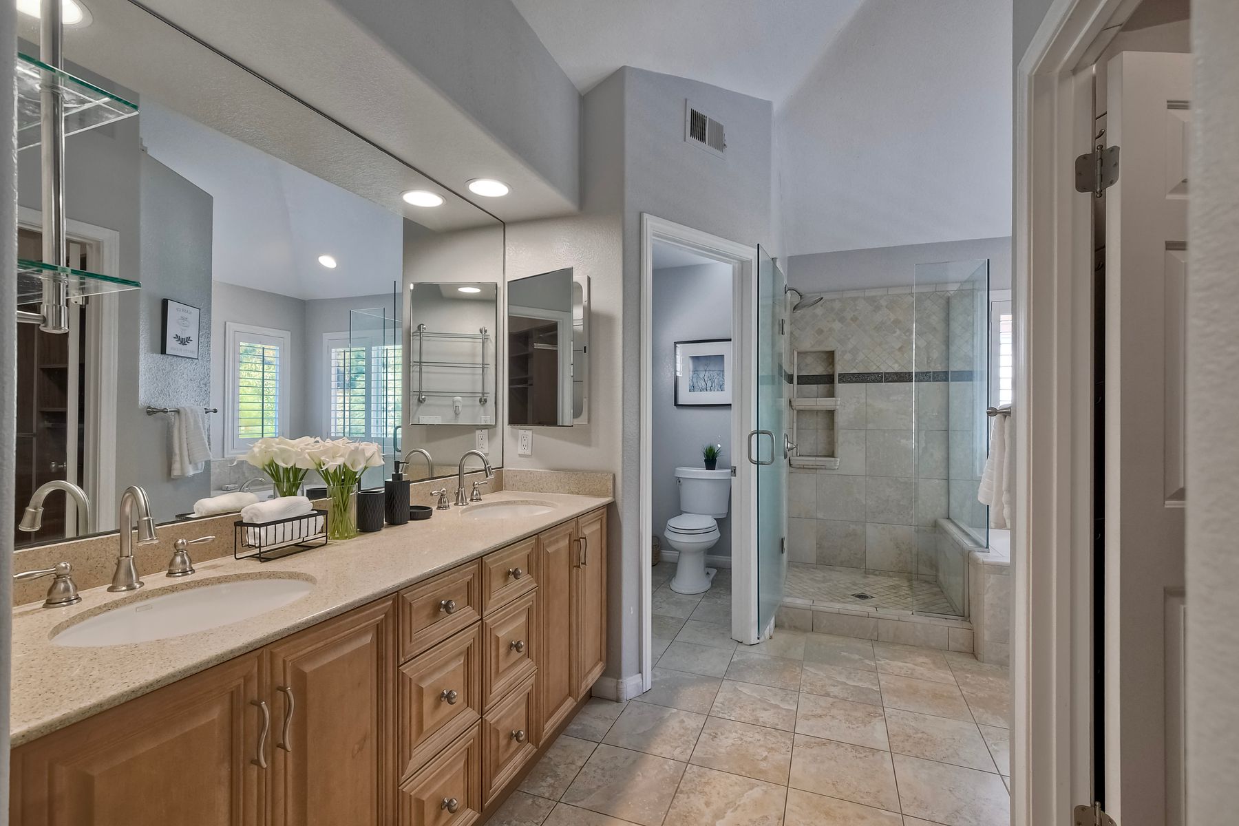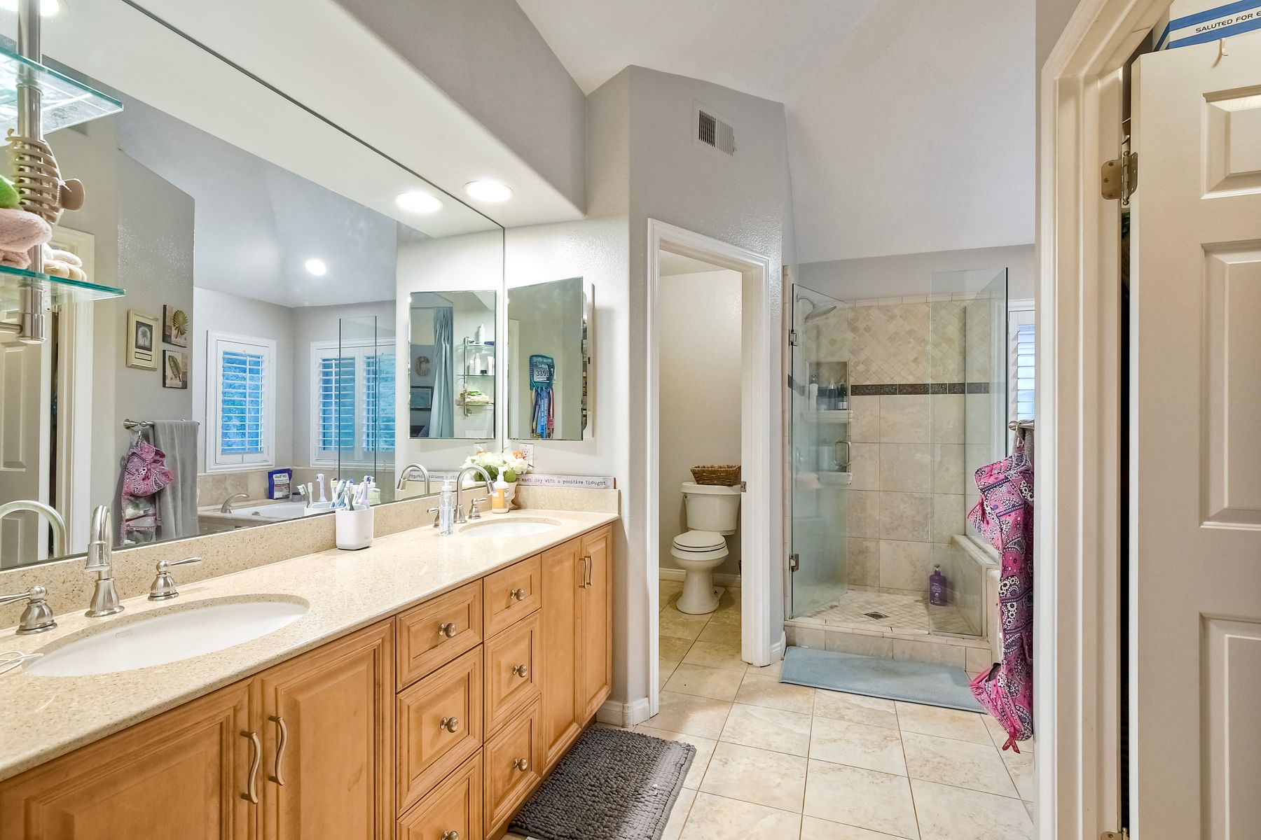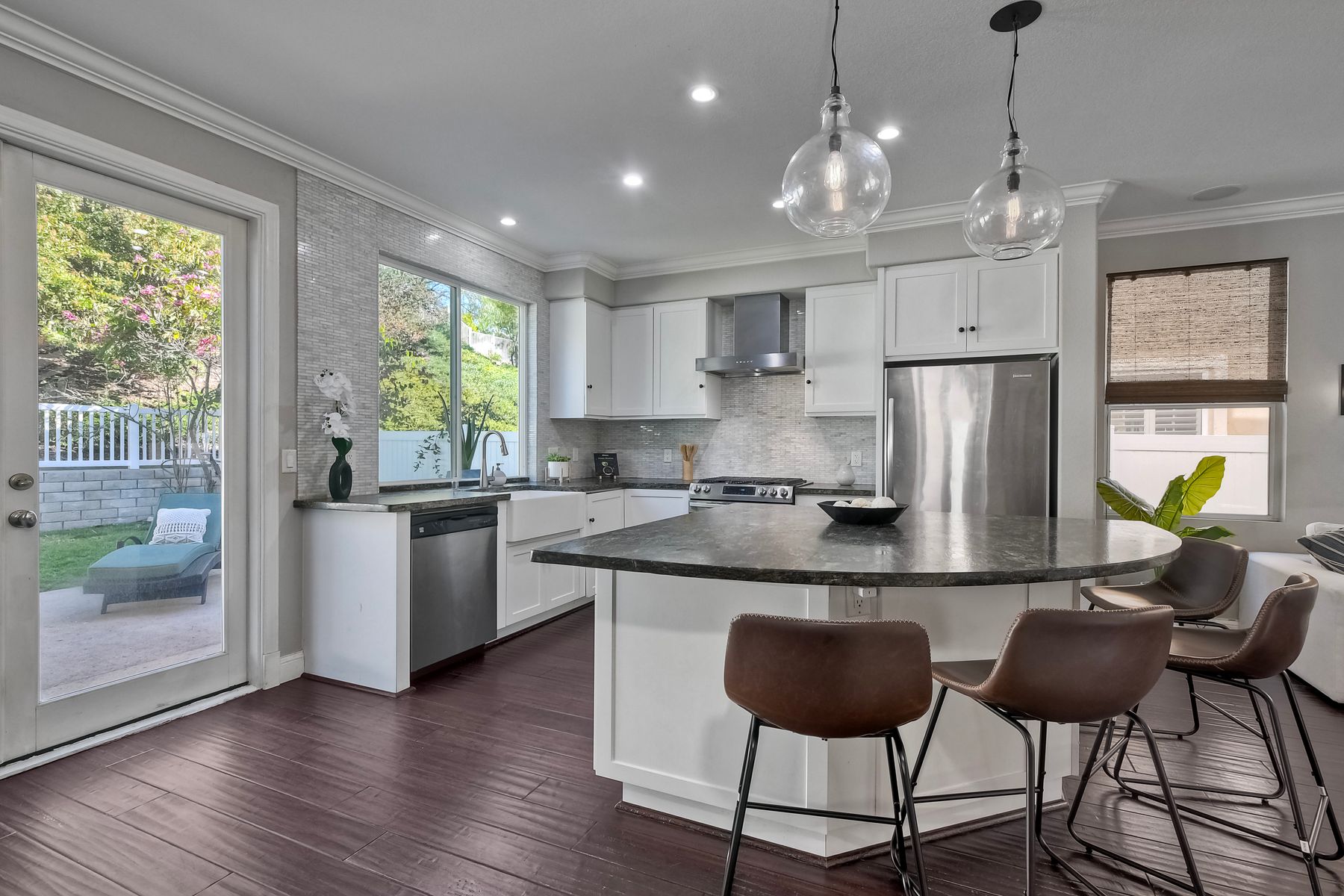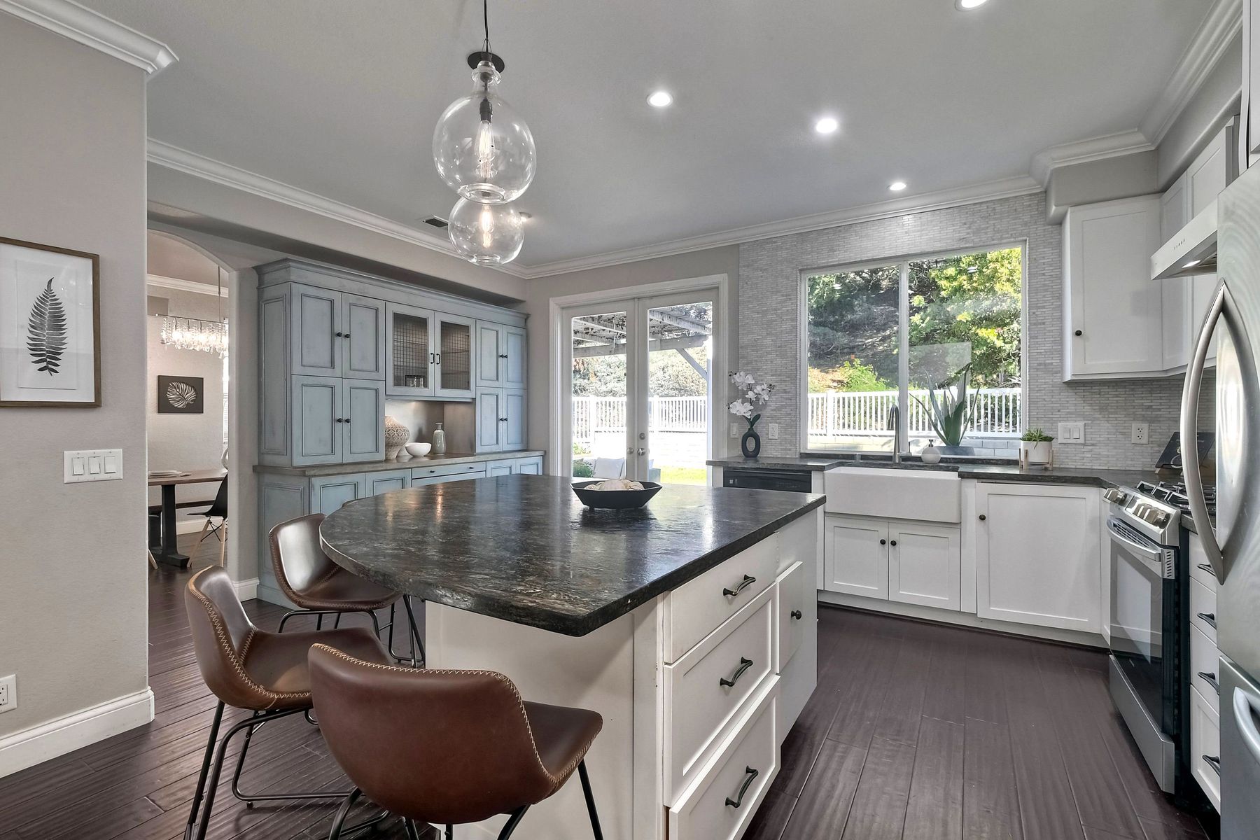 Freshly painted and beautifully staged - Legacy Plan 2 floorplan is one of the most popular home styles with great natural light and superb flow. Exceptional choice of upgrades. Entry and first floor rooms feature engineered bamboo flooring and soaring cathedral ceilings. Stylishly upgraded Kitchen with distinctive leathered granite, warming drawer, pantry sink, globe pendant lights over the breakfast bar, built-in custom buffet with a distressed metal countertop and abundant storage. Built-in wine cabinet is a bonus as well. Dining Room features a custom light and French doors to the rear patio. Patio is covered with a producing grapevine and makes a wonderful gathering space. Newer Vinyl fences and gate, newer water heater, newer stove/oven combo with a gas cooktop. Primary bathroom and powder room were beautifully remodeled. Primary bath features a soaking tub, separate shower, a walk-in closet and dual vanity. Powder room features a custom vessel sink. It's stunning! Garage door replaced 4/3/25. Brand new water supply line to the home also added 4/3/2025. Low HOA covers private pickleball/tennis courts and common area maintenance. Open and spacious with flexible areas indoors and out. Private lot near the end of a cul-de-sac with open space behind the back yard. Swan Canyon Place is tucked in to a canyon setting with lots of manicured shrubbery and open spaces to explore. The Legacy neighborhood features a a private tennis/pickleball court and lots of hiking areas. It is very central and super convenient to get to local parks, to Lake Miramar, to shopping and to the freeway. Scripps Ranch offers top-rated schools (EB. Scripps, Dingeman, Marshall Middle and Scripps Ranch High), plus nearby gyms, great shopping and restaurants Starbucks.