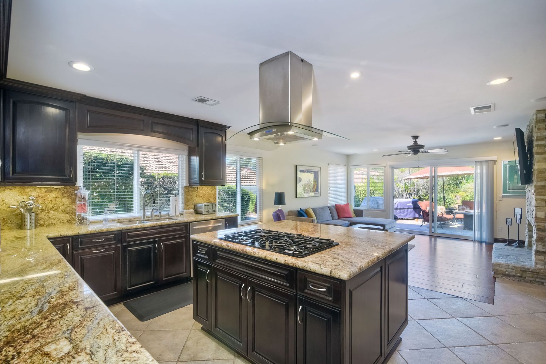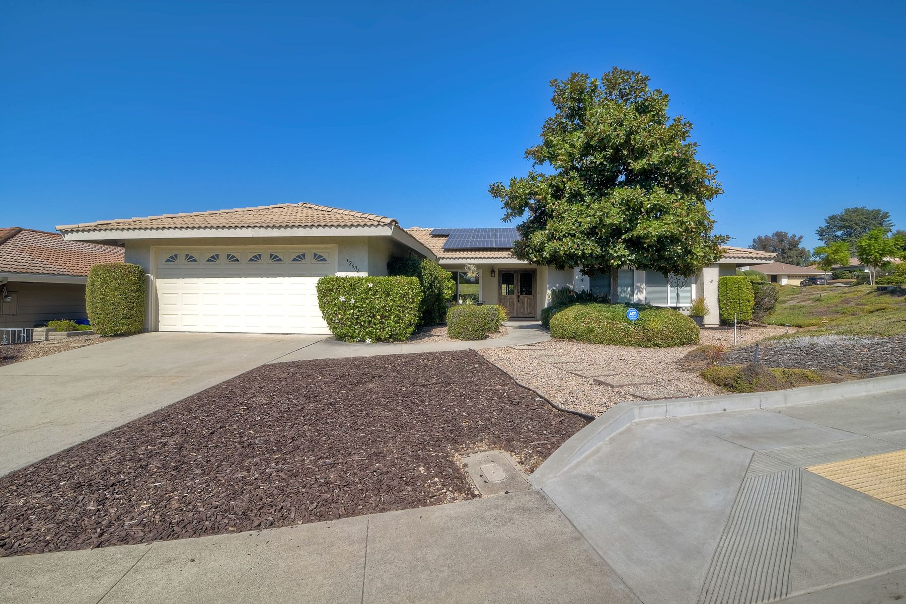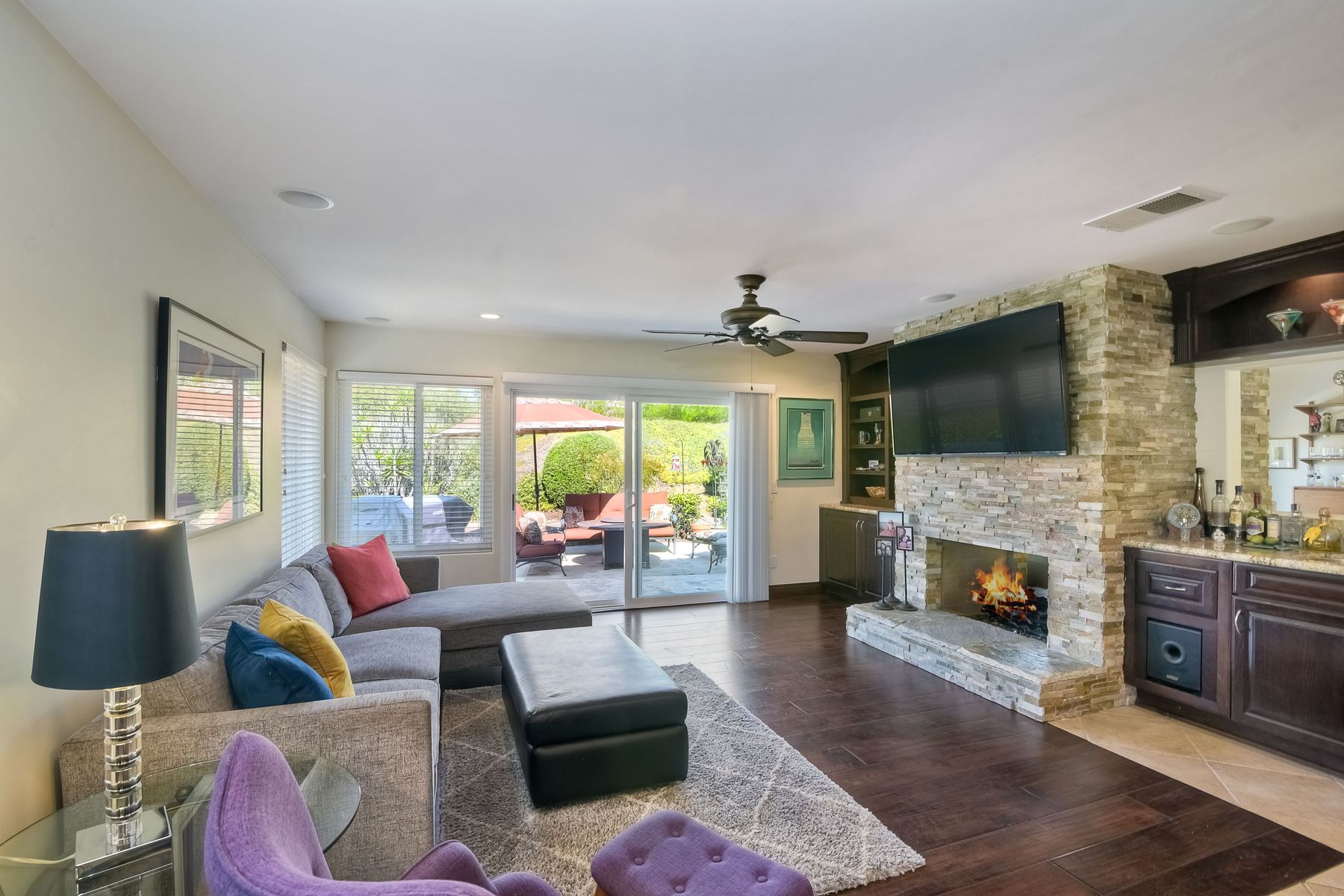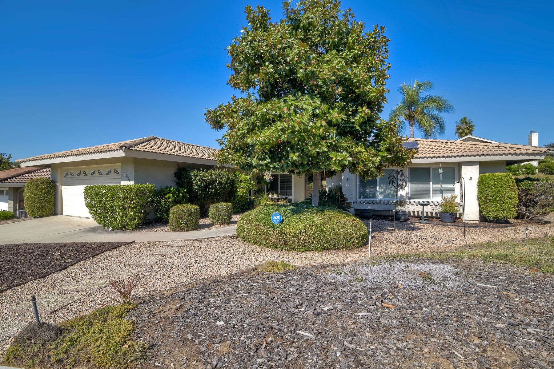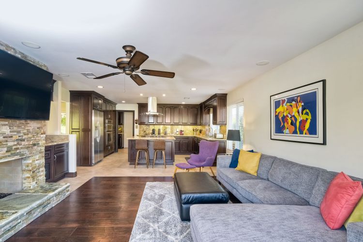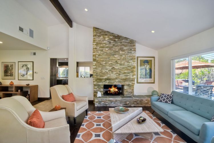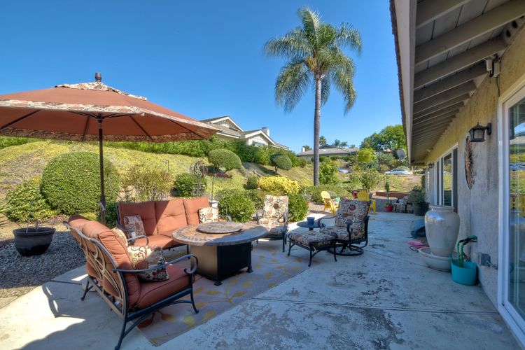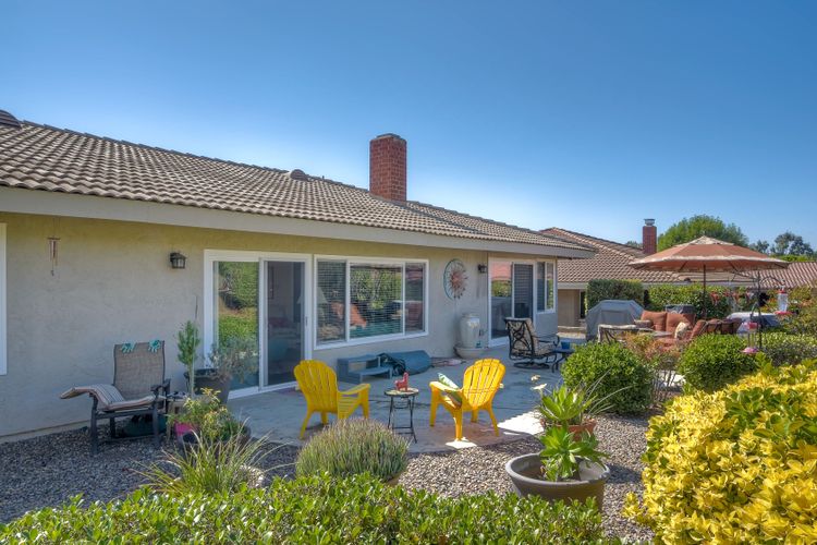 Beautiful 3 bedroom, 2 bath home in the 55+ Oaks North community of Rancho Bernardo. Owned solar! Walking through the custom door into the stunning open living room/dining room, your eyes are drawn to the vaulted ceiling, hardwood floors, dual fireplace with stacked stone to the ceiling and tons of light through the oversized picture window and sliding glass door to the back patio. The adjacent kitchen revolves around a large island with a gas stove and seating for 2-3. See Supplement . . . . Rich dark cabinets, granite countertops, stainless steel appliances, travertine floor and a butler's pantry/laundry room combine to create a beautiful and functional workspace. The kitchen opens to the family room with the dual stacked stone fireplace, built-ins on each side, cooling fan, wood floors and sliding glass door to the back patio. Enter the master suite through double doors into a spacious bedroom with an expansive window, cooling fan, cozy carpet and large double closet. The master bath has a vanity with lots of counter space, dark cabinets and an oversized tile shower. The 2nd and 3rd bedrooms both have large windows, generous closets, ceiling fans and soft carpet. The shared hall bath has a soaker tub/shower with beautiful tile work. The serene backyard has a patio large enough for dining and a sitting area. The surrounding landscape includes mature, low maintenance plants, two fruit trees and two raised vegetable beds. Owned Solar! Access to the Oaks North Community Center with its tennis courts, swimming pool, spa, sauna, clubs, classes and more! Great location close to shopping, restaurants and easy freeway access.