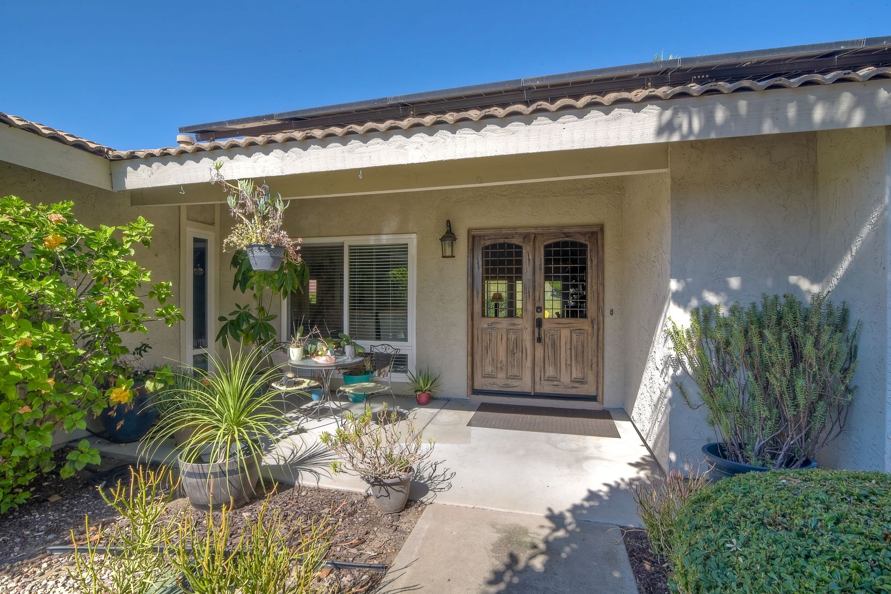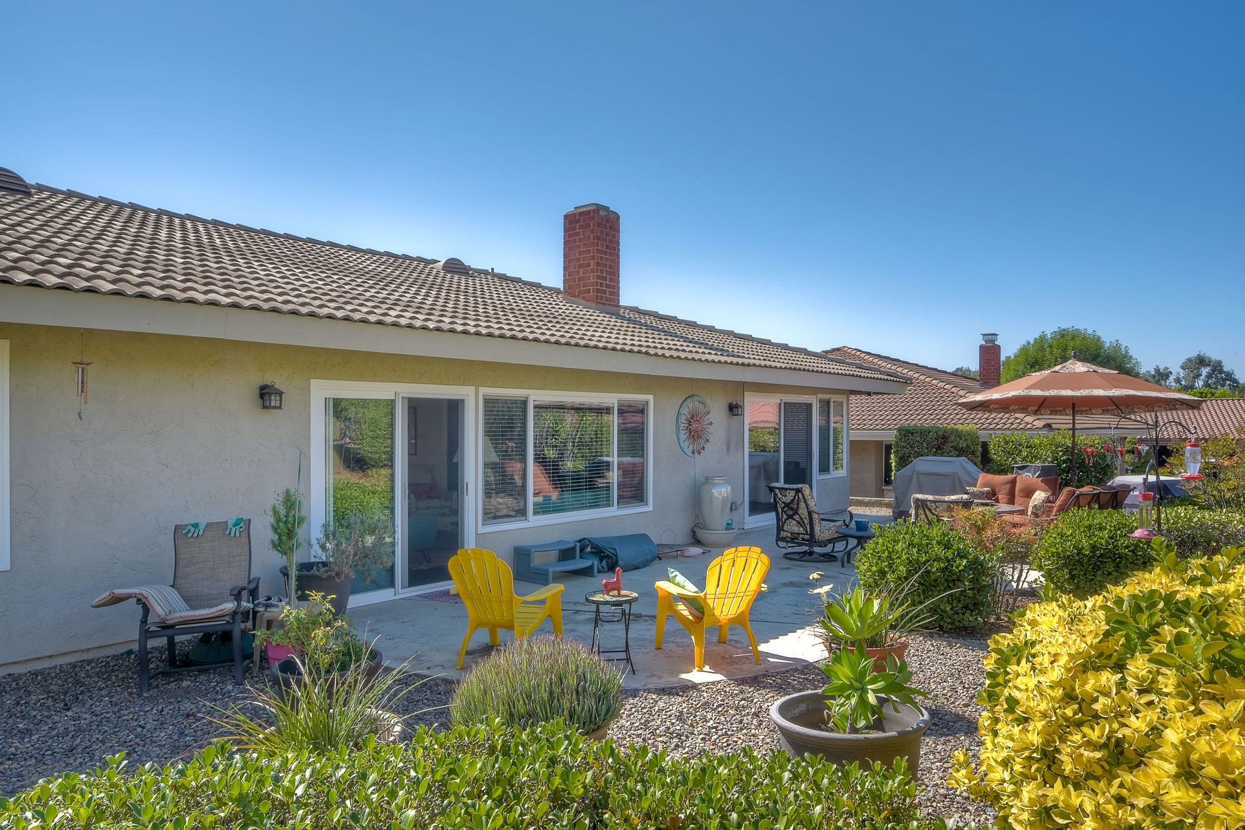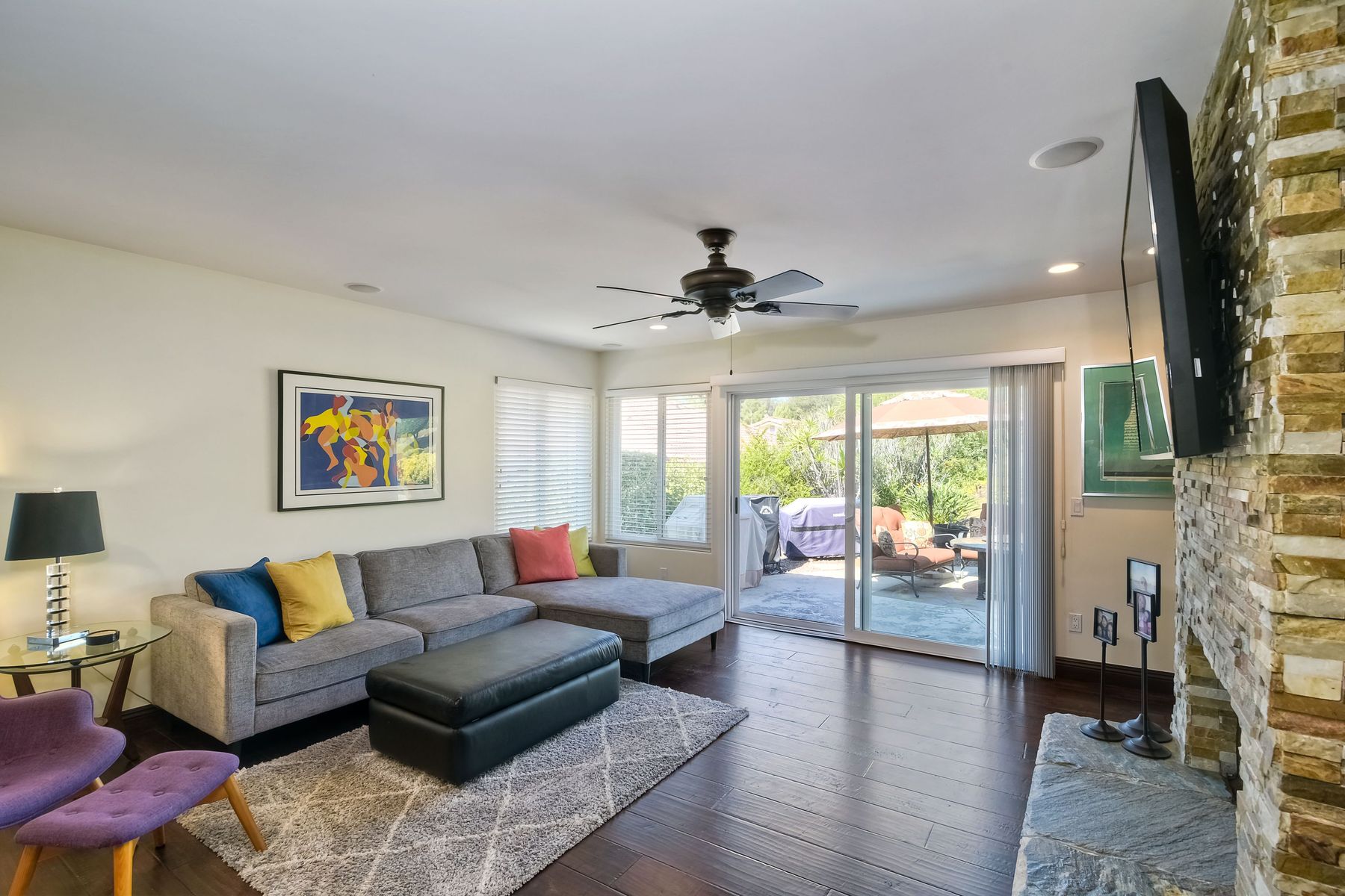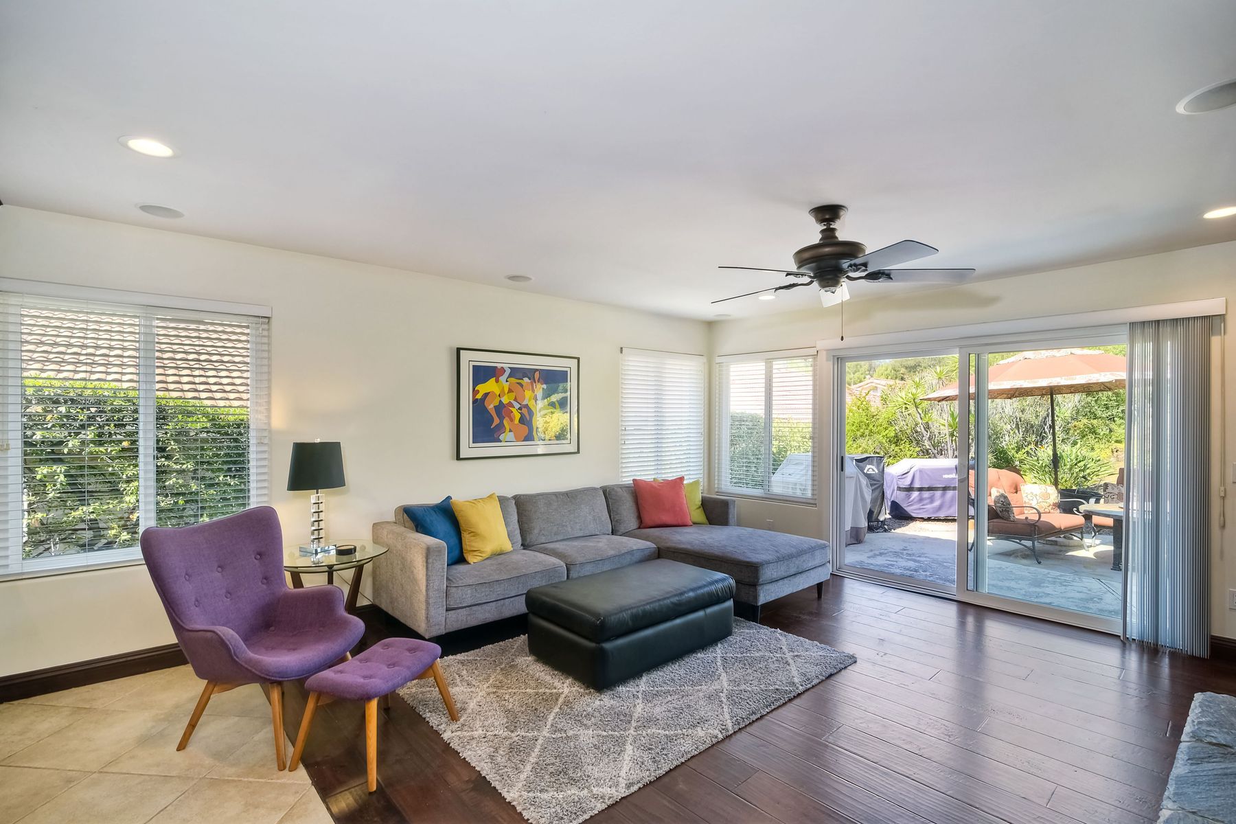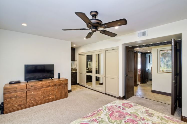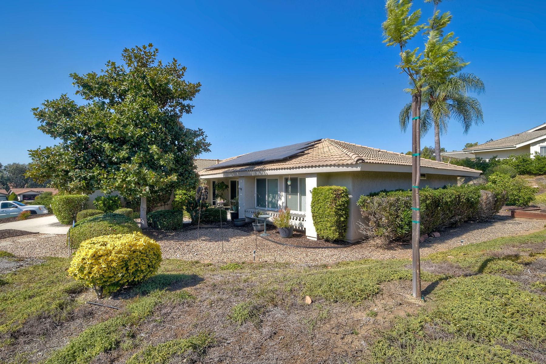 Beautiful 3 bedroom, 2 bath home in the 55+ Oaks North community of Rancho Bernardo. Owned solar! Walking through the custom door into the stunning open living room/dining room, your eyes are drawn to the vaulted ceiling, hardwood floors, dual fireplace with stacked stone to the ceiling and tons of light through the oversized picture window and sliding glass door to the back patio. The adjacent kitchen revolves around a large island with a gas stove and seating for 2-3. See Supplement . . . . Rich dark cabinets, granite countertops, stainless steel appliances, travertine floor and a butler's pantry/laundry room combine to create a beautiful and functional workspace. The kitchen opens to the family room with the dual stacked stone fireplace, built-ins on each side, cooling fan, wood floors and sliding glass door to the back patio. Enter the master suite through double doors into a spacious bedroom with an expansive window, cooling fan, cozy carpet and large double closet. The master bath has a vanity with lots of counter space, dark cabinets and an oversized tile shower. The 2nd and 3rd bedrooms both have large windows, generous closets, ceiling fans and soft carpet. The shared hall bath has a soaker tub/shower with beautiful tile work. The serene backyard has a patio large enough for dining and a sitting area. The surrounding landscape includes mature, low maintenance plants, two fruit trees and two raised vegetable beds. Owned Solar! Access to the Oaks North Community Center with its tennis courts, swimming pool, spa, sauna, clubs, classes and more! Great location close to shopping, restaurants and easy freeway access.