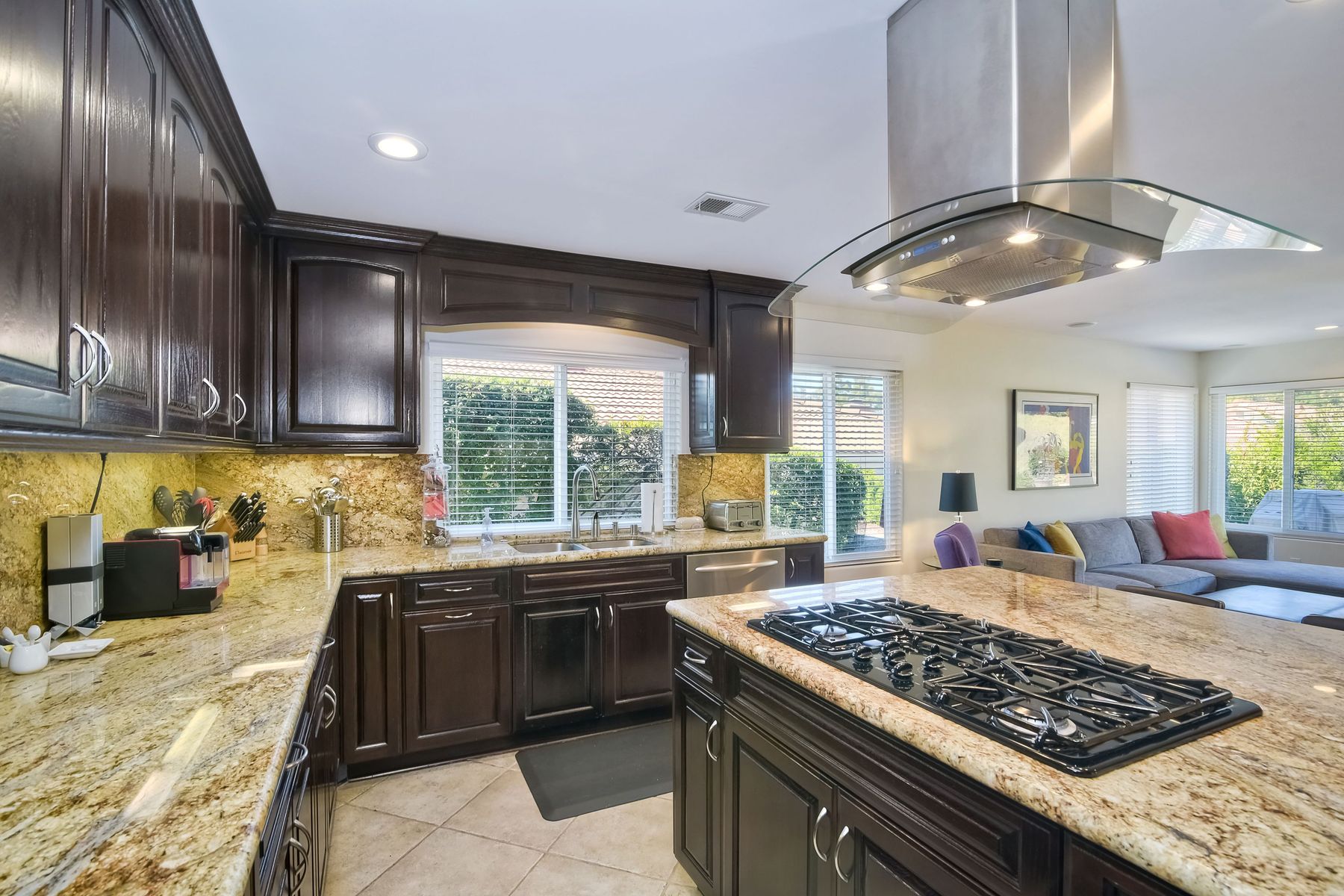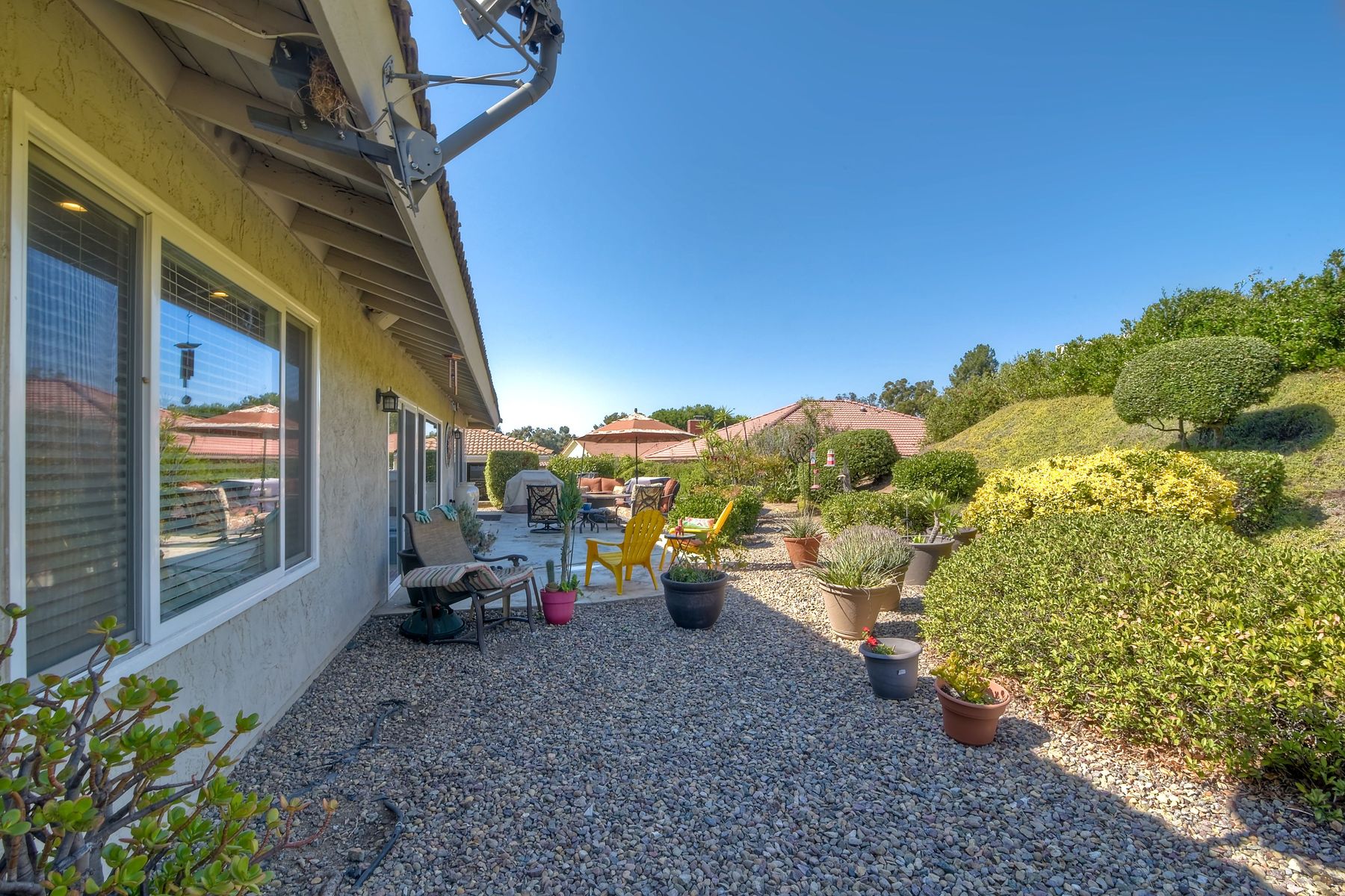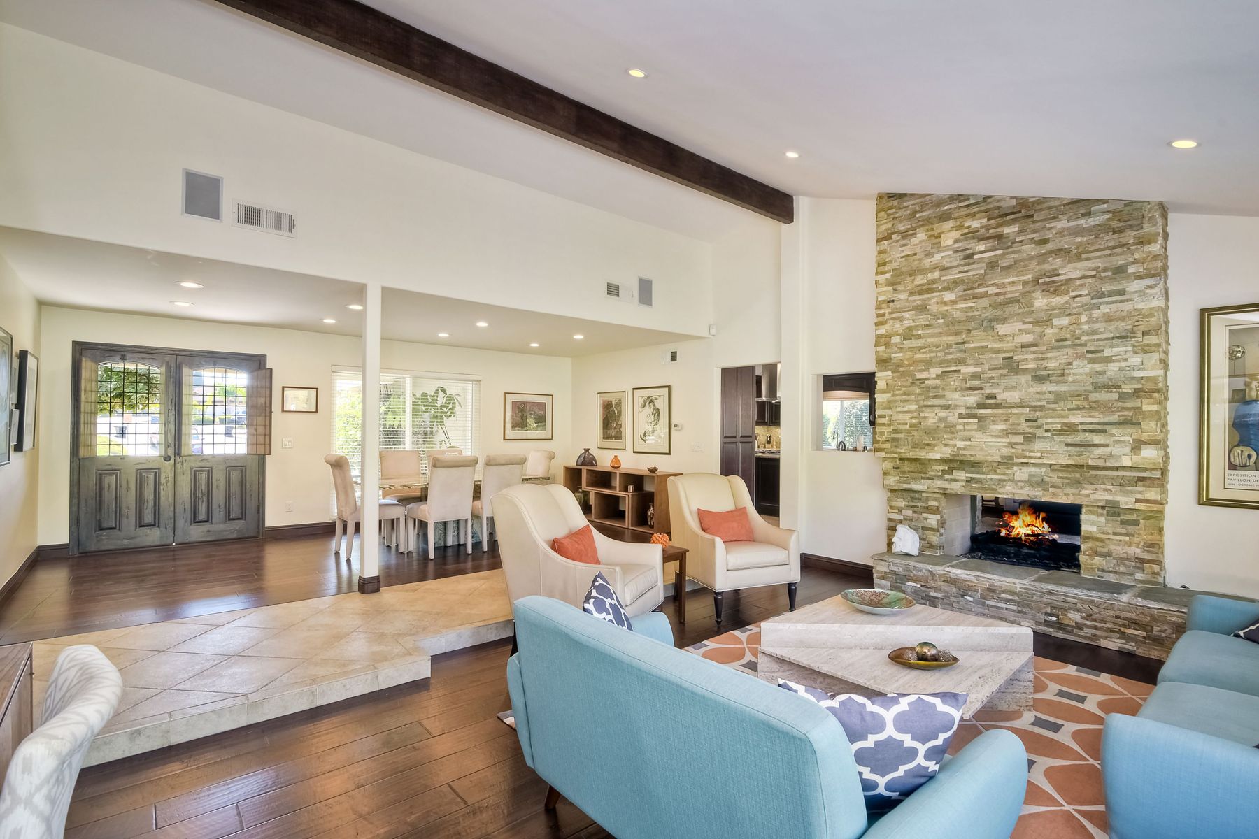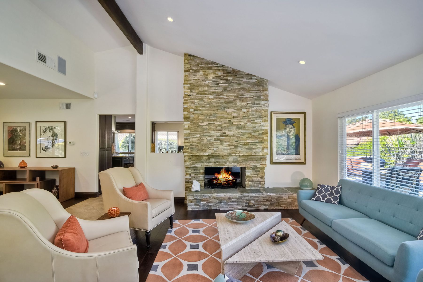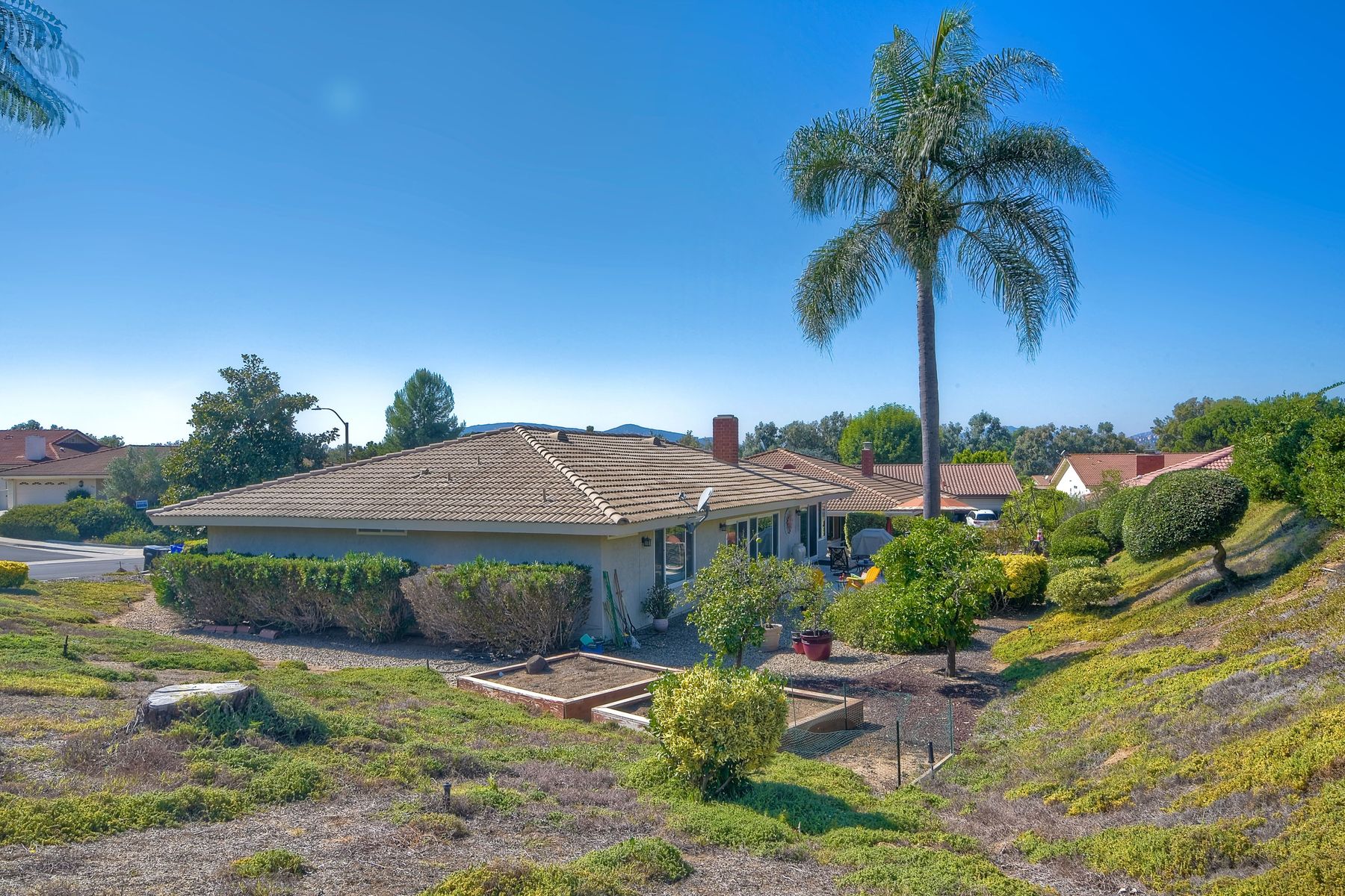 Beautiful 3 bedroom, 2 bath home in the 55+ Oaks North community of Rancho Bernardo. Owned solar! Walking through the custom door into the stunning open living room/dining room, your eyes are drawn to the vaulted ceiling, hardwood floors, dual fireplace with stacked stone to the ceiling and tons of light through the oversized picture window and sliding glass door to the back patio. The adjacent kitchen revolves around a large island with a gas stove and seating for 2-3. See Supplement . . . . Rich dark cabinets, granite countertops, stainless steel appliances, travertine floor and a butler's pantry/laundry room combine to create a beautiful and functional workspace. The kitchen opens to the family room with the dual stacked stone fireplace, built-ins on each side, cooling fan, wood floors and sliding glass door to the back patio. Enter the master suite through double doors into a spacious bedroom with an expansive window, cooling fan, cozy carpet and large double closet. The master bath has a vanity with lots of counter space, dark cabinets and an oversized tile shower. The 2nd and 3rd bedrooms both have large windows, generous closets, ceiling fans and soft carpet. The shared hall bath has a soaker tub/shower with beautiful tile work. The serene backyard has a patio large enough for dining and a sitting area. The surrounding landscape includes mature, low maintenance plants, two fruit trees and two raised vegetable beds. Owned Solar! Access to the Oaks North Community Center with its tennis courts, swimming pool, spa, sauna, clubs, classes and more! Great location close to shopping, restaurants and easy freeway access.