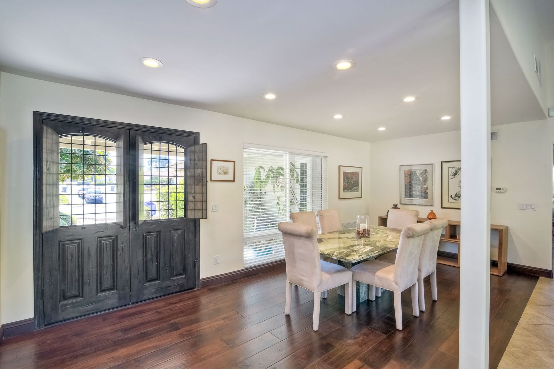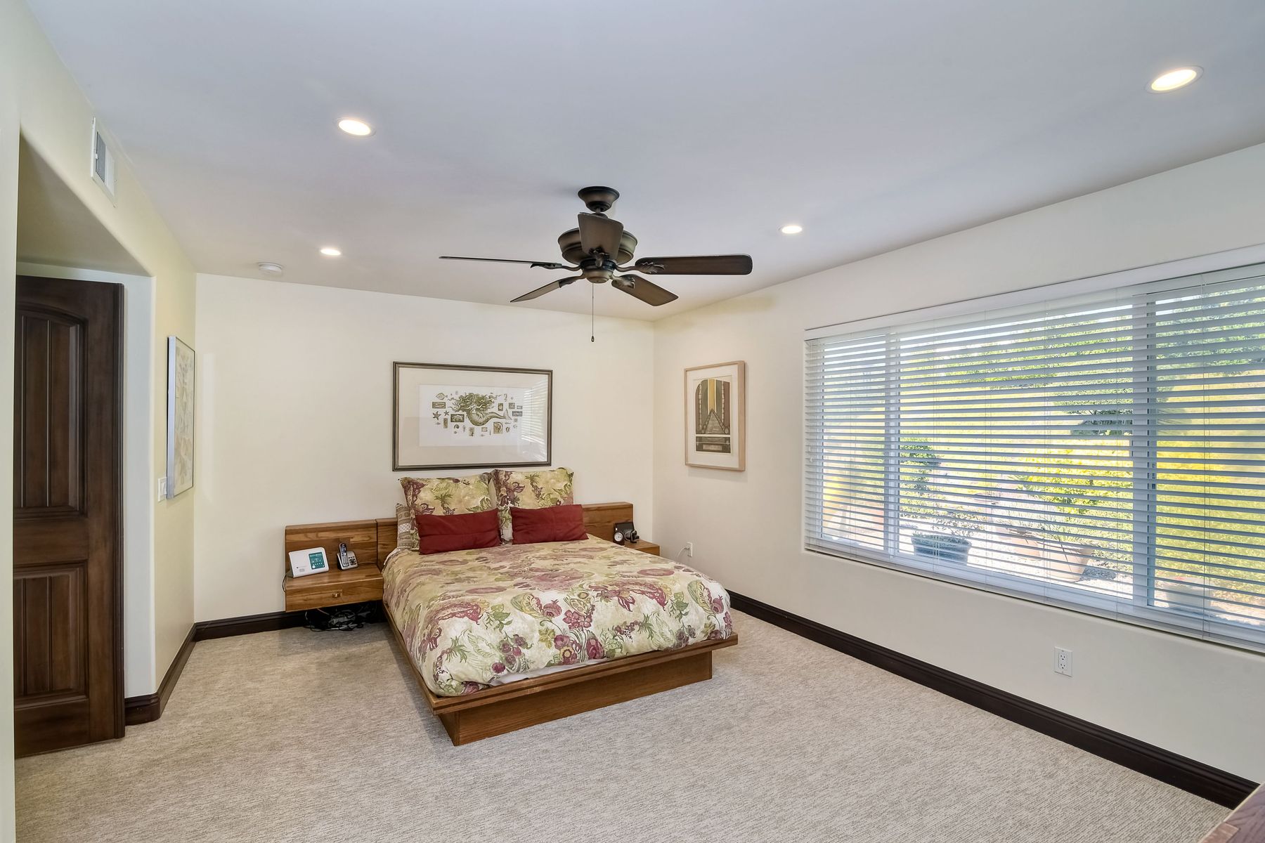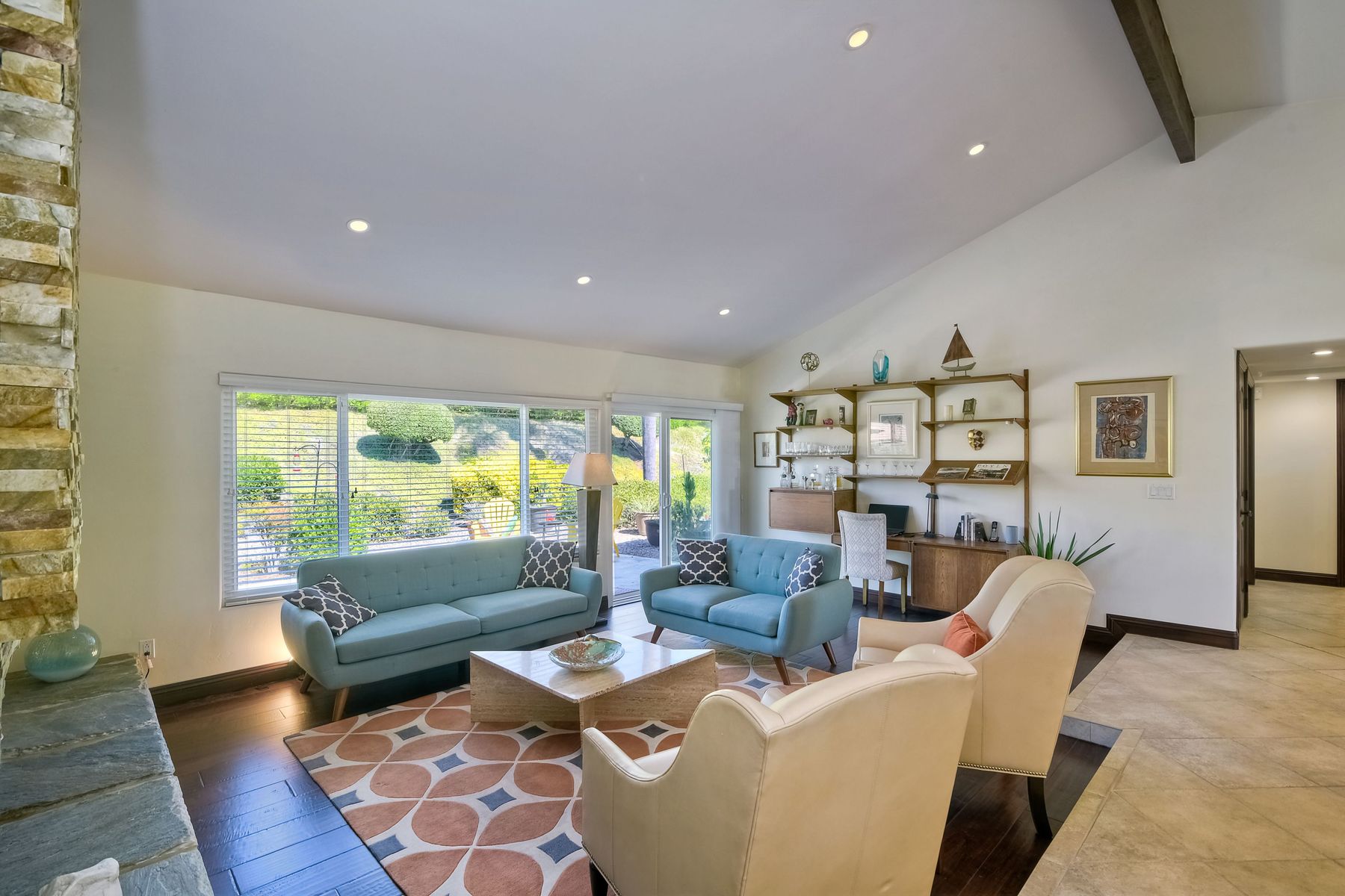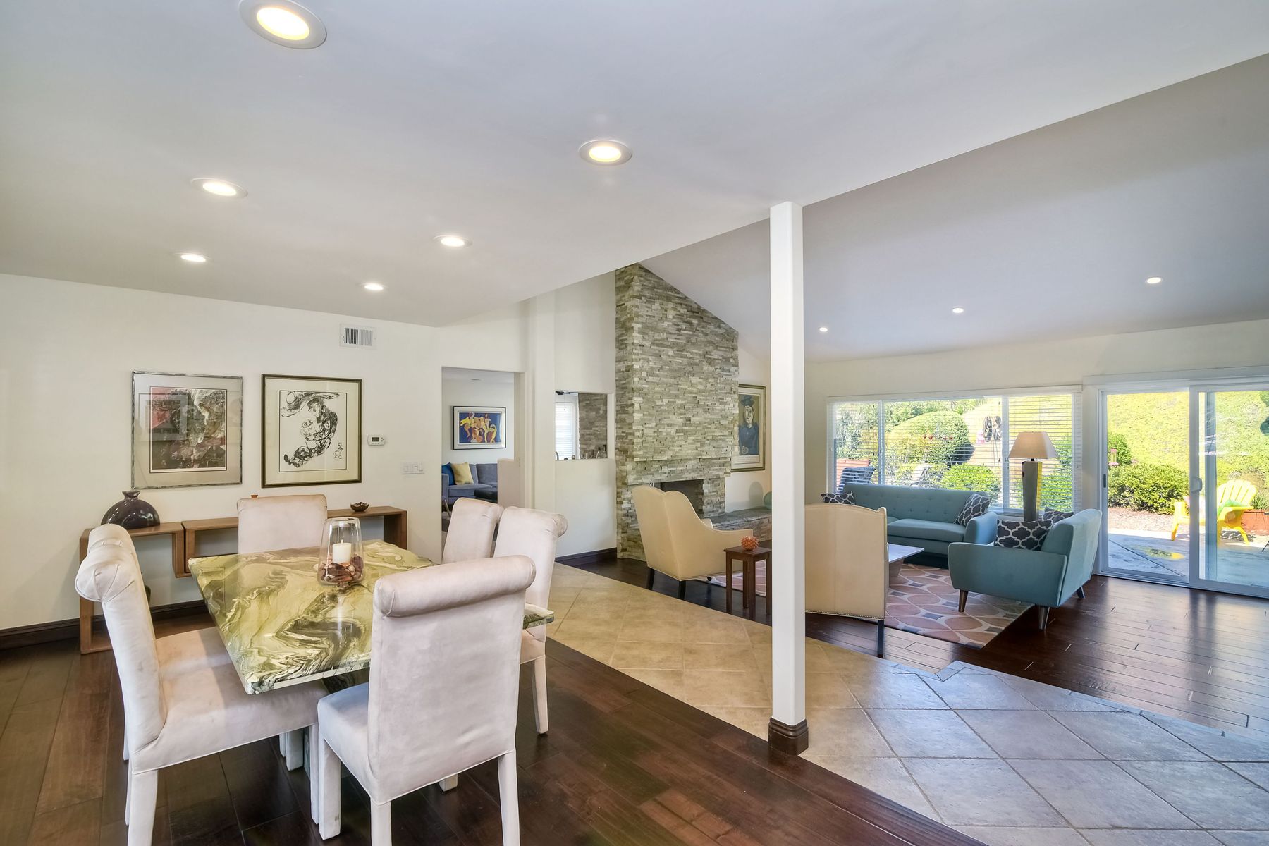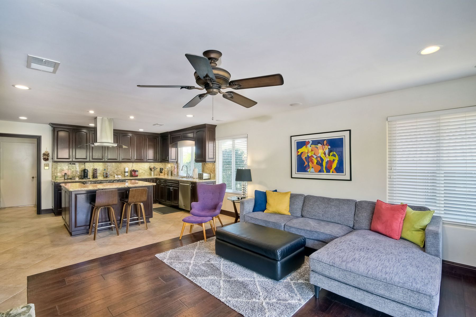 Beautiful 3 bedroom, 2 bath home in the 55+ Oaks North community of Rancho Bernardo. Owned solar! Walking through the custom door into the stunning open living room/dining room, your eyes are drawn to the vaulted ceiling, hardwood floors, dual fireplace with stacked stone to the ceiling and tons of light through the oversized picture window and sliding glass door to the back patio. The adjacent kitchen revolves around a large island with a gas stove and seating for 2-3. See Supplement . . . . Rich dark cabinets, granite countertops, stainless steel appliances, travertine floor and a butler's pantry/laundry room combine to create a beautiful and functional workspace. The kitchen opens to the family room with the dual stacked stone fireplace, built-ins on each side, cooling fan, wood floors and sliding glass door to the back patio. Enter the master suite through double doors into a spacious bedroom with an expansive window, cooling fan, cozy carpet and large double closet. The master bath has a vanity with lots of counter space, dark cabinets and an oversized tile shower. The 2nd and 3rd bedrooms both have large windows, generous closets, ceiling fans and soft carpet. The shared hall bath has a soaker tub/shower with beautiful tile work. The serene backyard has a patio large enough for dining and a sitting area. The surrounding landscape includes mature, low maintenance plants, two fruit trees and two raised vegetable beds. Owned Solar! Access to the Oaks North Community Center with its tennis courts, swimming pool, spa, sauna, clubs, classes and more! Great location close to shopping, restaurants and easy freeway access.