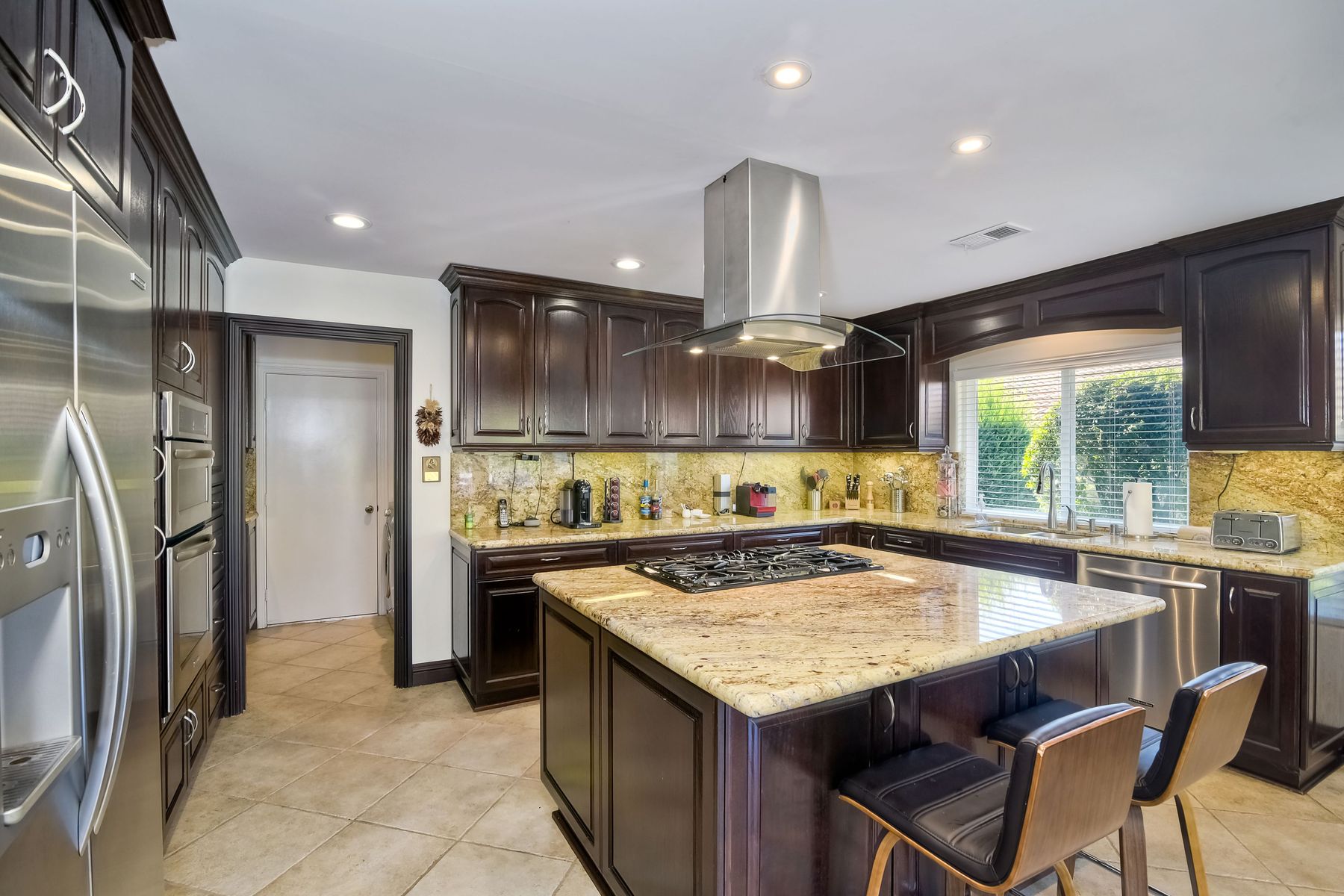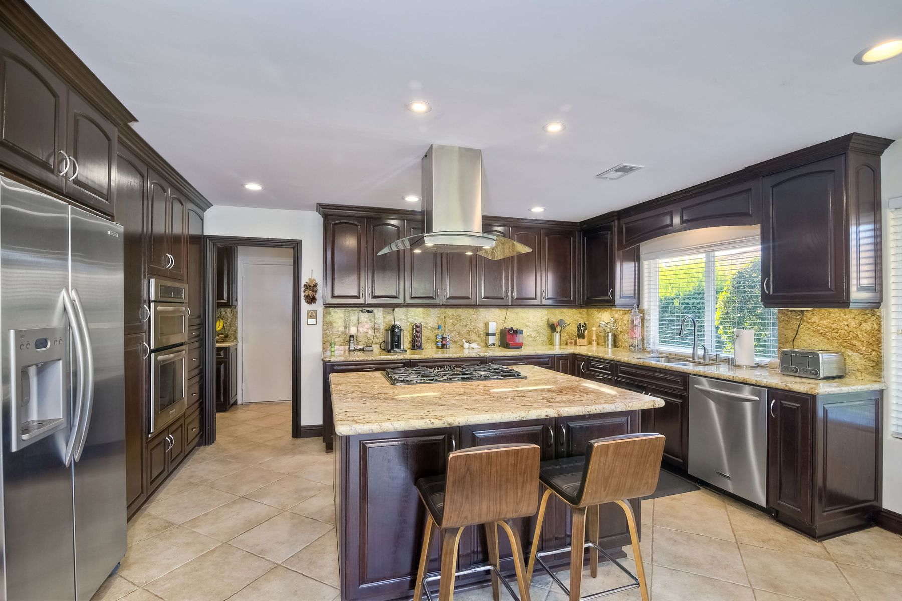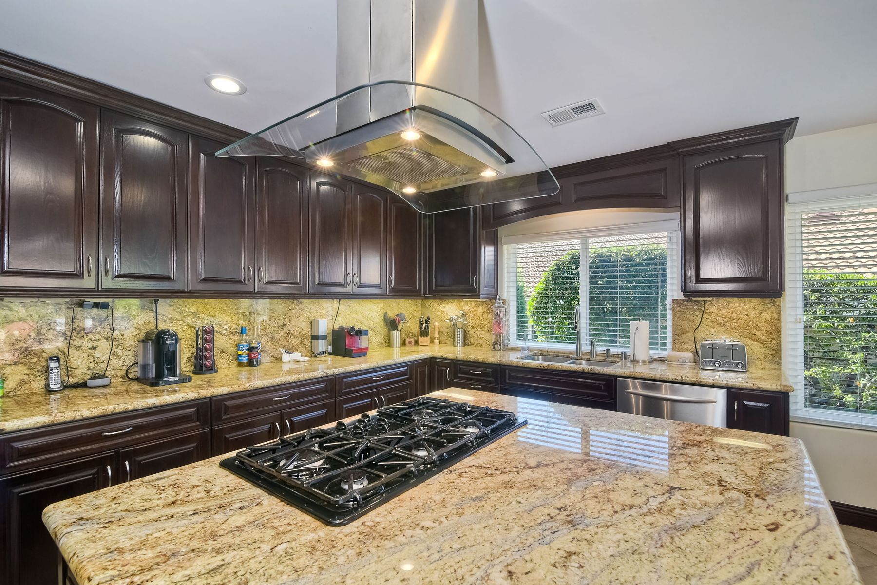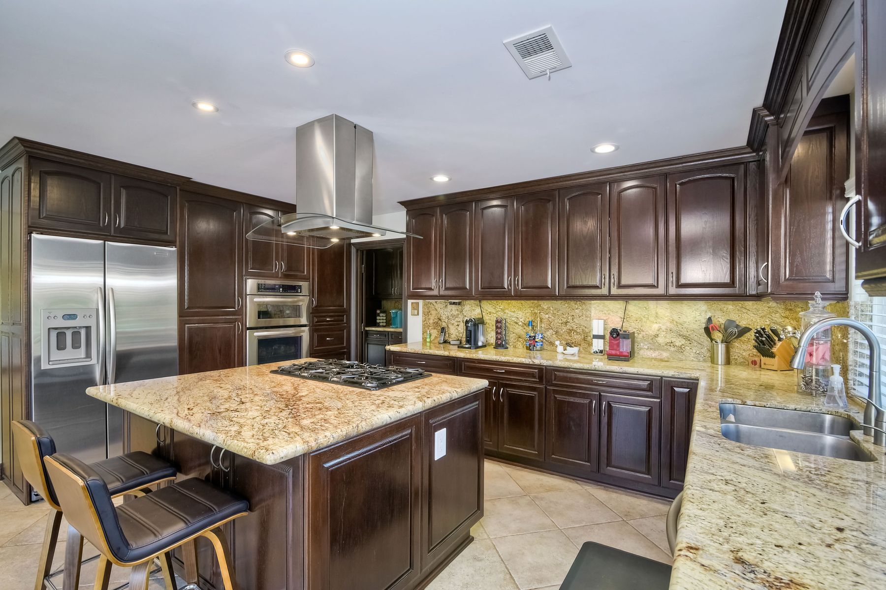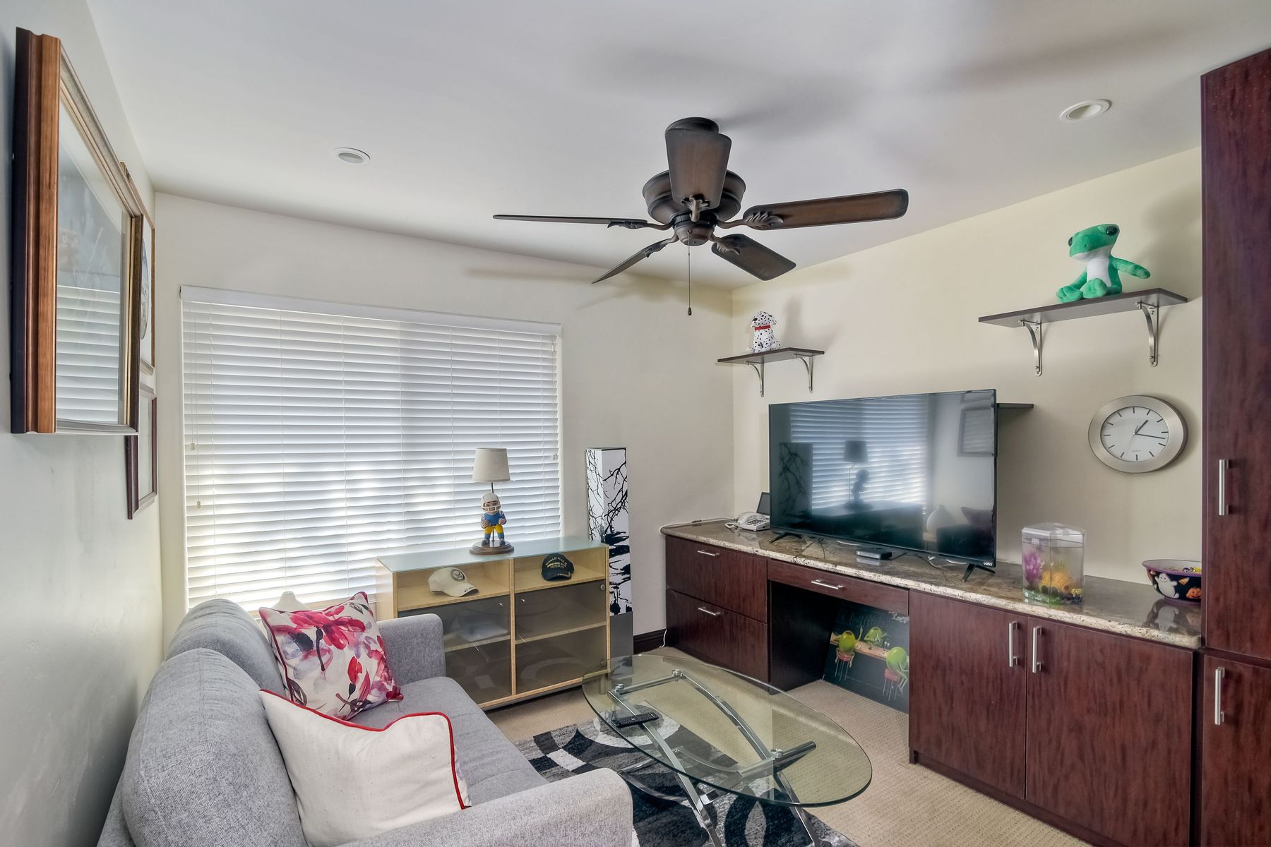 Beautiful 3 bedroom, 2 bath home in the 55+ Oaks North community of Rancho Bernardo. Owned solar! Walking through the custom door into the stunning open living room/dining room, your eyes are drawn to the vaulted ceiling, hardwood floors, dual fireplace with stacked stone to the ceiling and tons of light through the oversized picture window and sliding glass door to the back patio. The adjacent kitchen revolves around a large island with a gas stove and seating for 2-3. See Supplement . . . . Rich dark cabinets, granite countertops, stainless steel appliances, travertine floor and a butler's pantry/laundry room combine to create a beautiful and functional workspace. The kitchen opens to the family room with the dual stacked stone fireplace, built-ins on each side, cooling fan, wood floors and sliding glass door to the back patio. Enter the master suite through double doors into a spacious bedroom with an expansive window, cooling fan, cozy carpet and large double closet. The master bath has a vanity with lots of counter space, dark cabinets and an oversized tile shower. The 2nd and 3rd bedrooms both have large windows, generous closets, ceiling fans and soft carpet. The shared hall bath has a soaker tub/shower with beautiful tile work. The serene backyard has a patio large enough for dining and a sitting area. The surrounding landscape includes mature, low maintenance plants, two fruit trees and two raised vegetable beds. Owned Solar! Access to the Oaks North Community Center with its tennis courts, swimming pool, spa, sauna, clubs, classes and more! Great location close to shopping, restaurants and easy freeway access.