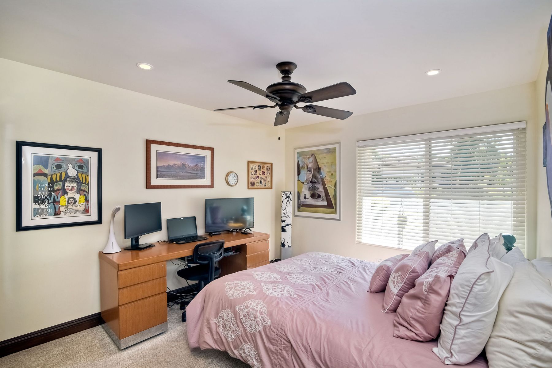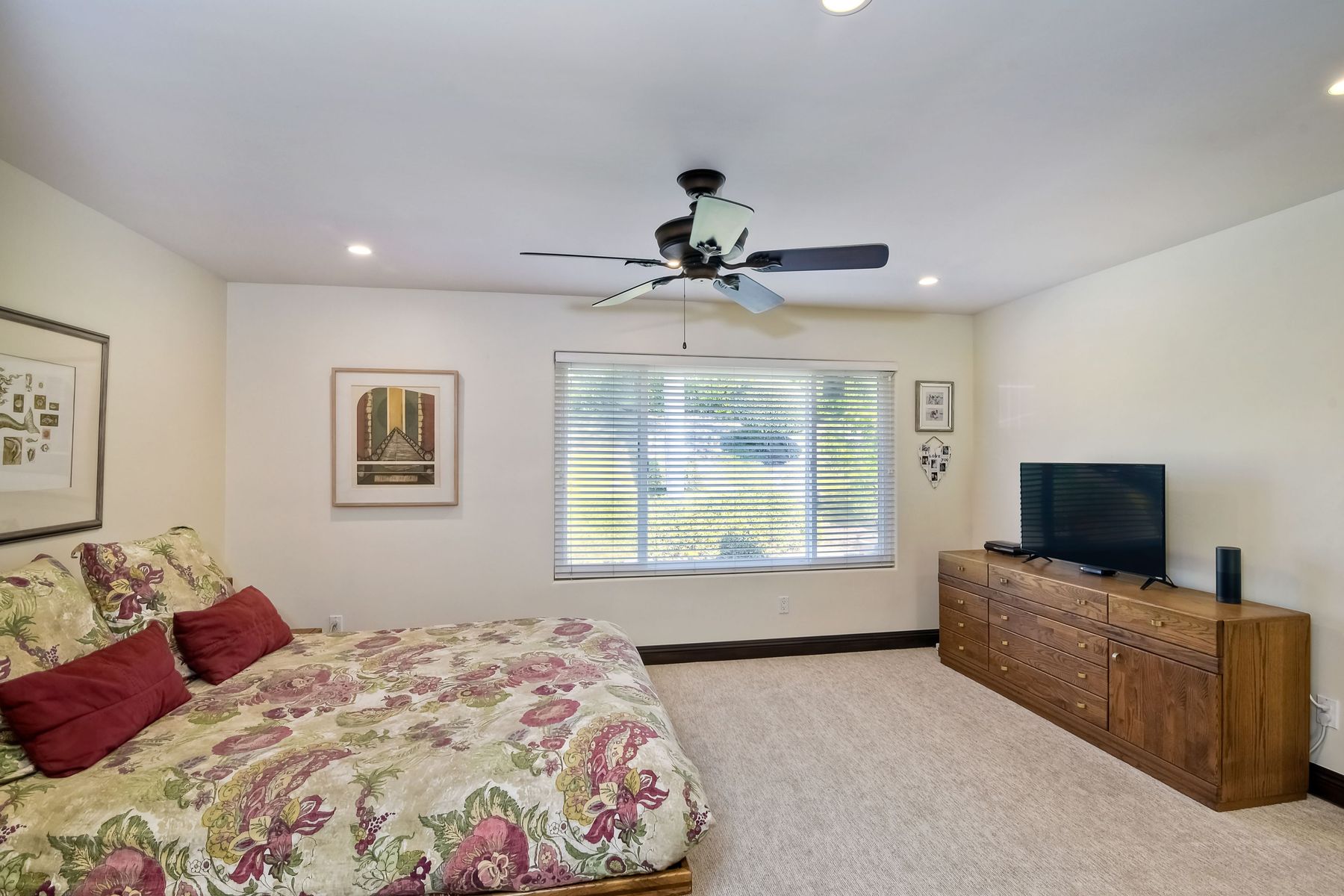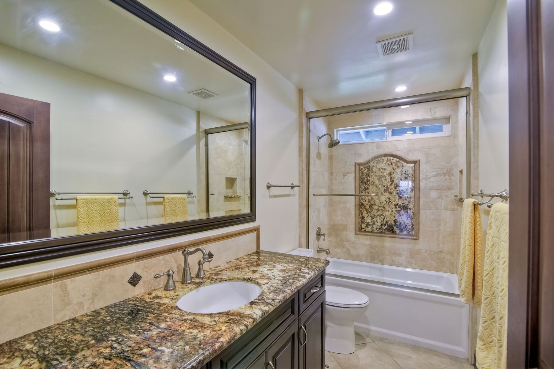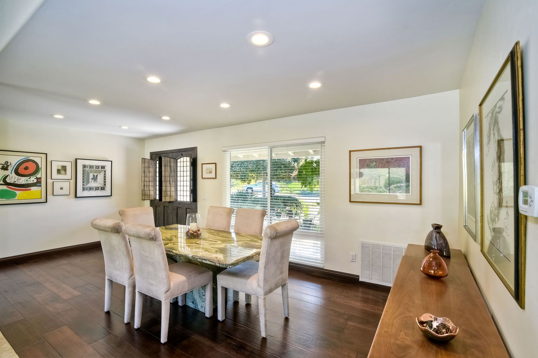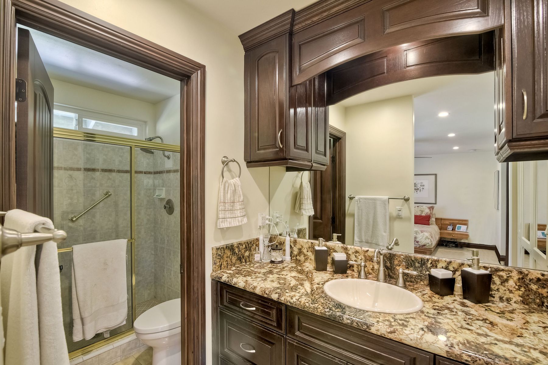 Beautiful 3 bedroom, 2 bath home in the 55+ Oaks North community of Rancho Bernardo. Owned solar! Walking through the custom door into the stunning open living room/dining room, your eyes are drawn to the vaulted ceiling, hardwood floors, dual fireplace with stacked stone to the ceiling and tons of light through the oversized picture window and sliding glass door to the back patio. The adjacent kitchen revolves around a large island with a gas stove and seating for 2-3. See Supplement . . . . Rich dark cabinets, granite countertops, stainless steel appliances, travertine floor and a butler's pantry/laundry room combine to create a beautiful and functional workspace. The kitchen opens to the family room with the dual stacked stone fireplace, built-ins on each side, cooling fan, wood floors and sliding glass door to the back patio. Enter the master suite through double doors into a spacious bedroom with an expansive window, cooling fan, cozy carpet and large double closet. The master bath has a vanity with lots of counter space, dark cabinets and an oversized tile shower. The 2nd and 3rd bedrooms both have large windows, generous closets, ceiling fans and soft carpet. The shared hall bath has a soaker tub/shower with beautiful tile work. The serene backyard has a patio large enough for dining and a sitting area. The surrounding landscape includes mature, low maintenance plants, two fruit trees and two raised vegetable beds. Owned Solar! Access to the Oaks North Community Center with its tennis courts, swimming pool, spa, sauna, clubs, classes and more! Great location close to shopping, restaurants and easy freeway access.